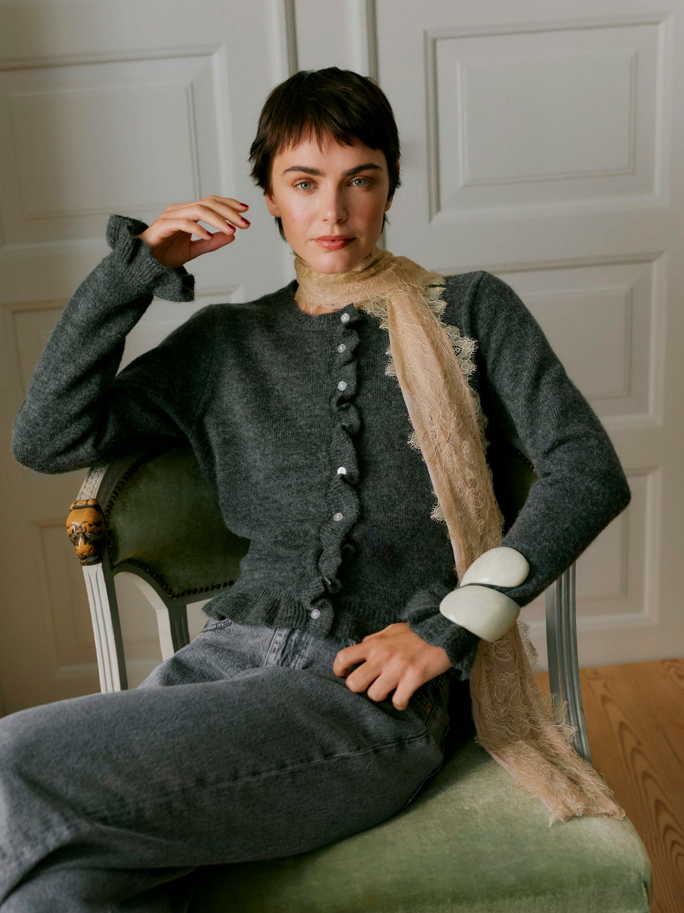 Oatmeal Alpaca Mix Frill Sleeve Cardigan