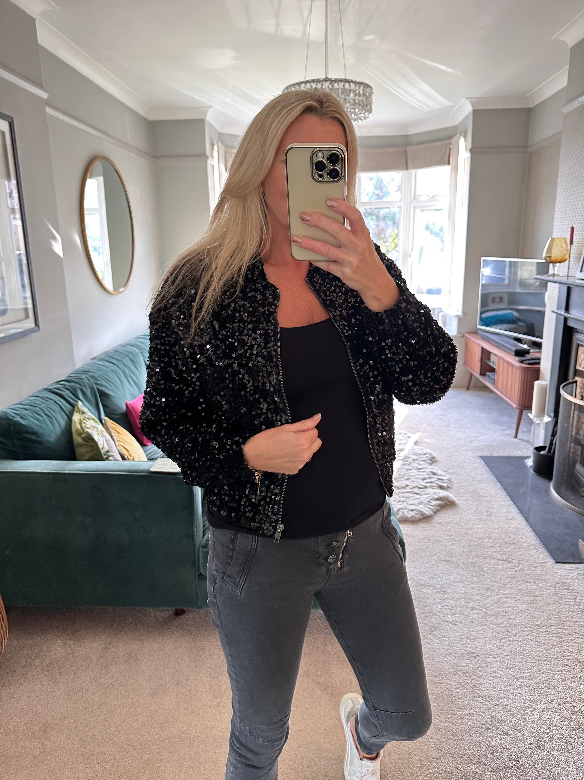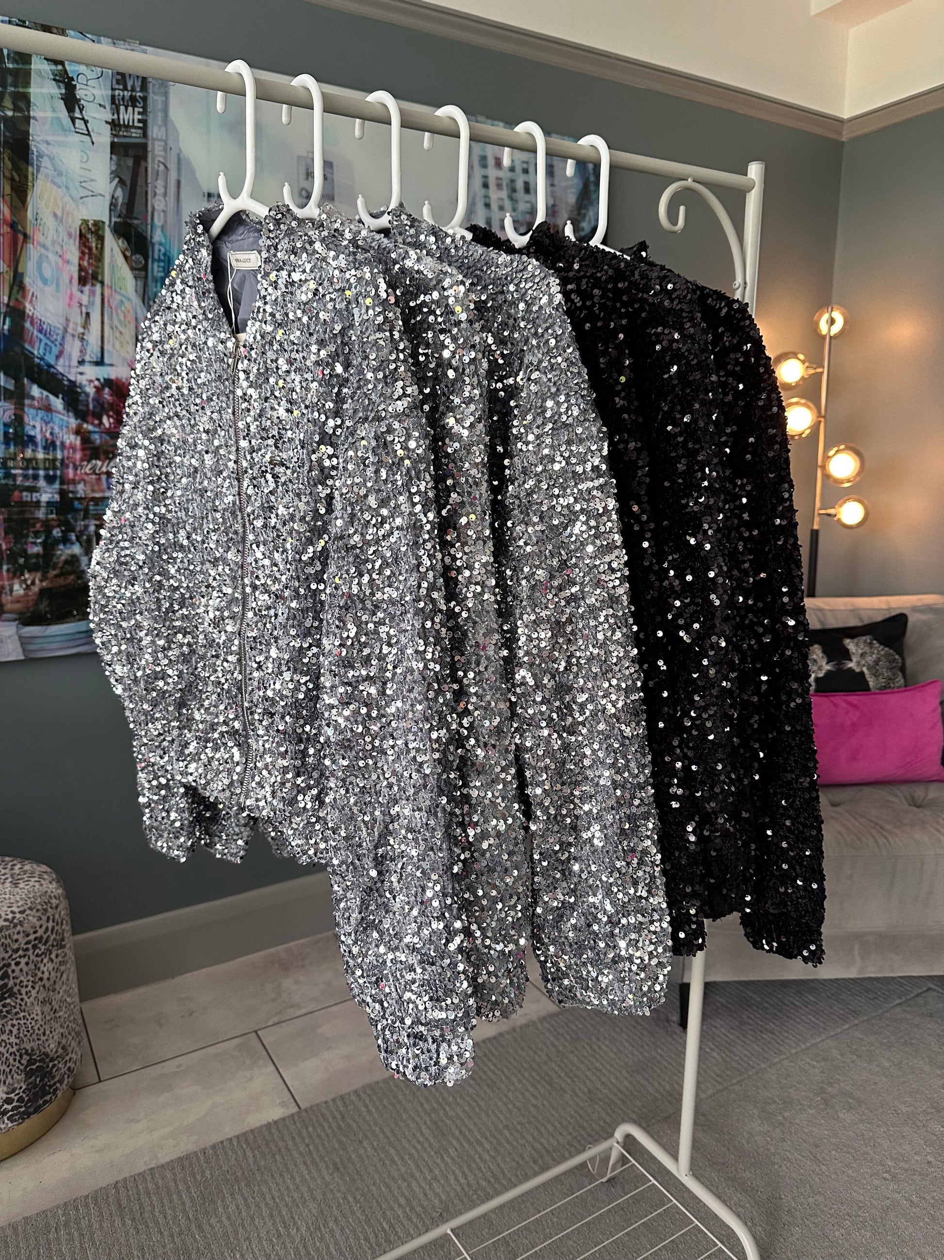 Absolutely STUNNING sequin bomber jacket that you'll want to wear with everything this season!