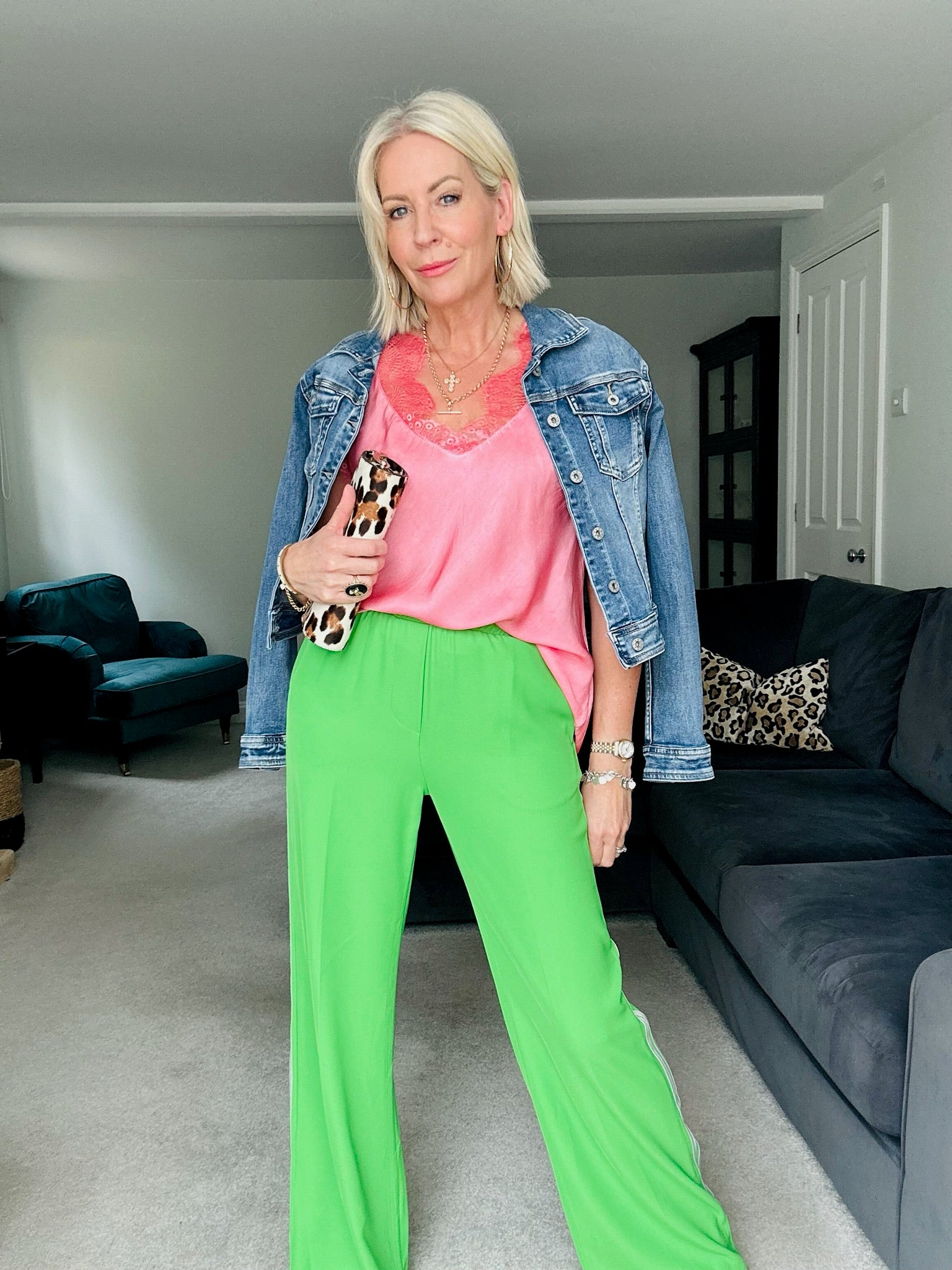 For a sports luxe look style with a t shirt, biker jacket and trainers.