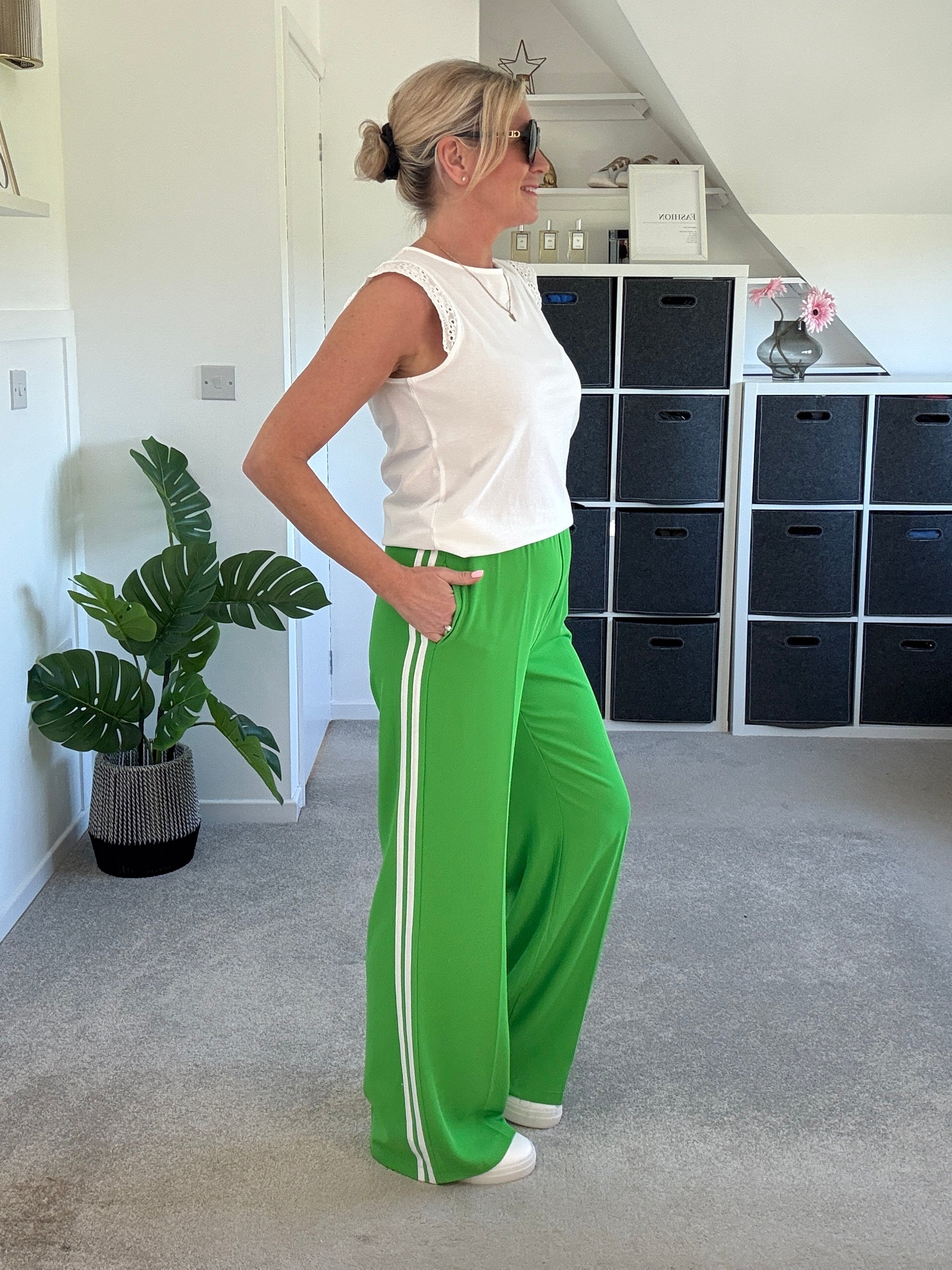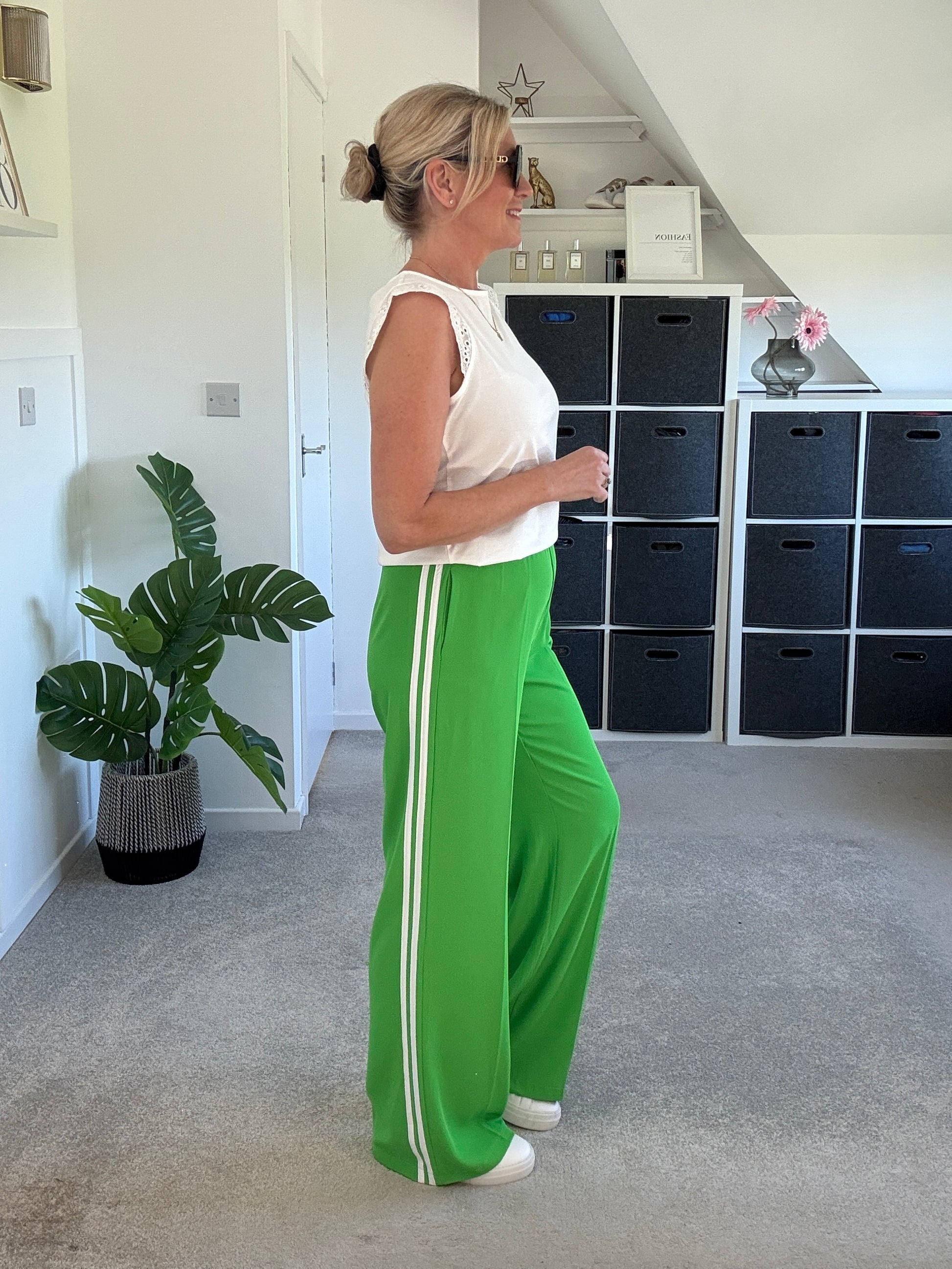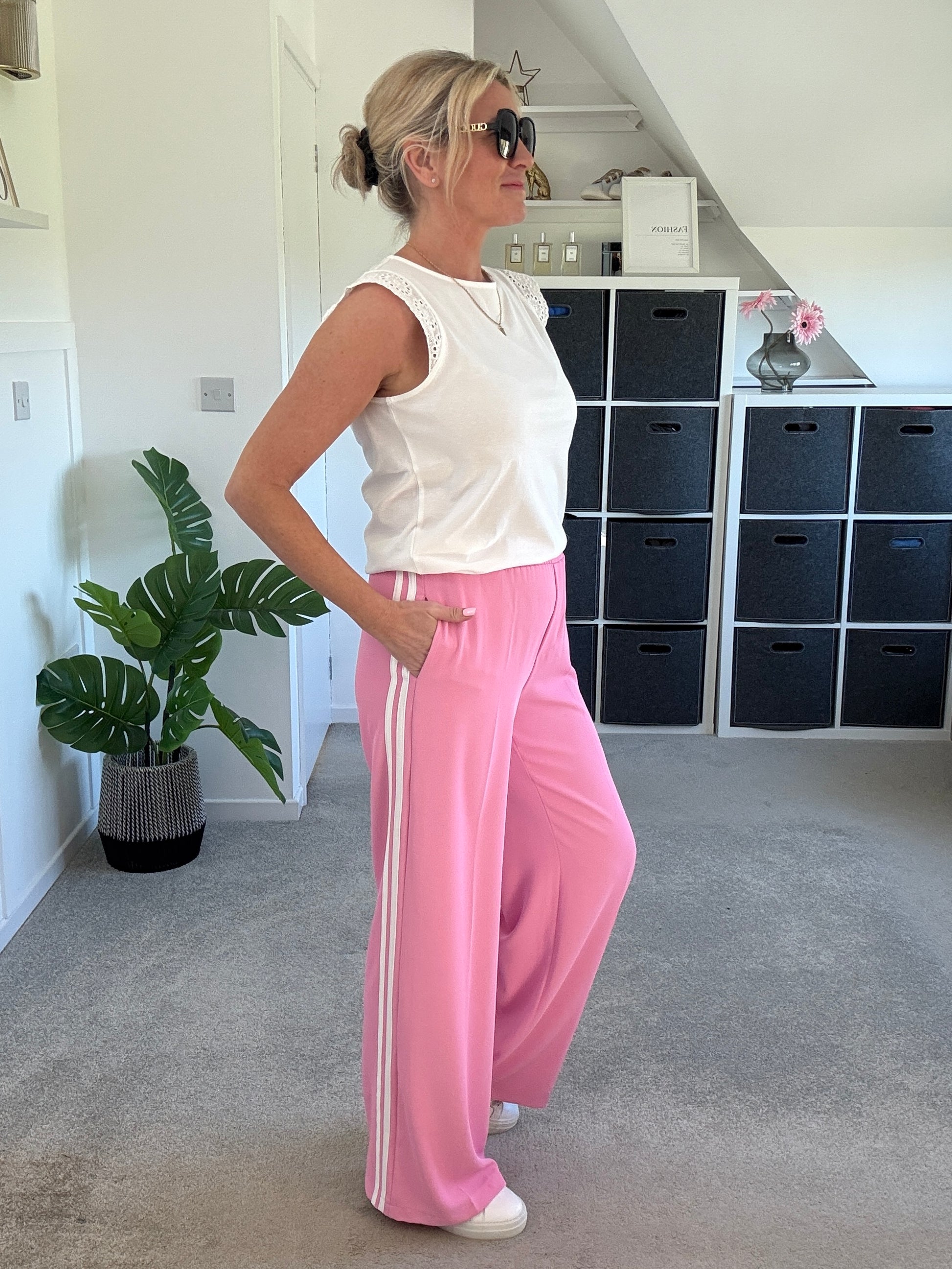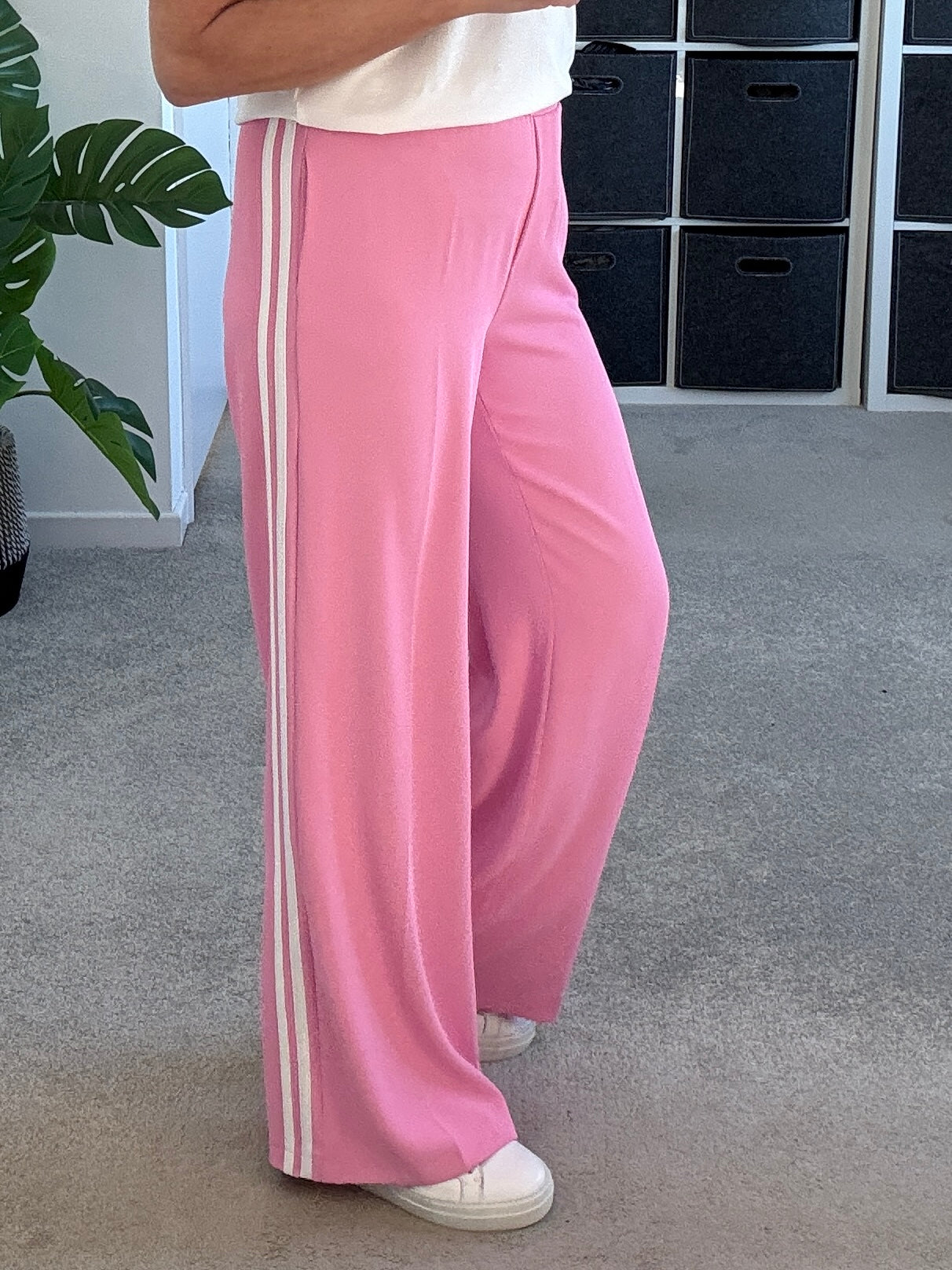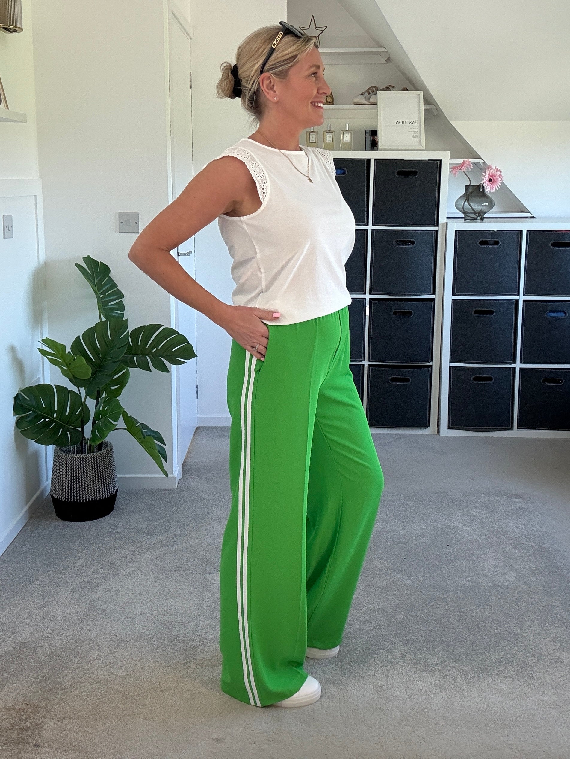 Stunning loose fit wide leg trousers, with comfy pull on elasticated waist, faux fly front, front and back pleat and side pockets. With two satin side stripe creating a flattering silhouette and they hang beautifully. They are such a great cut and amazing quality....