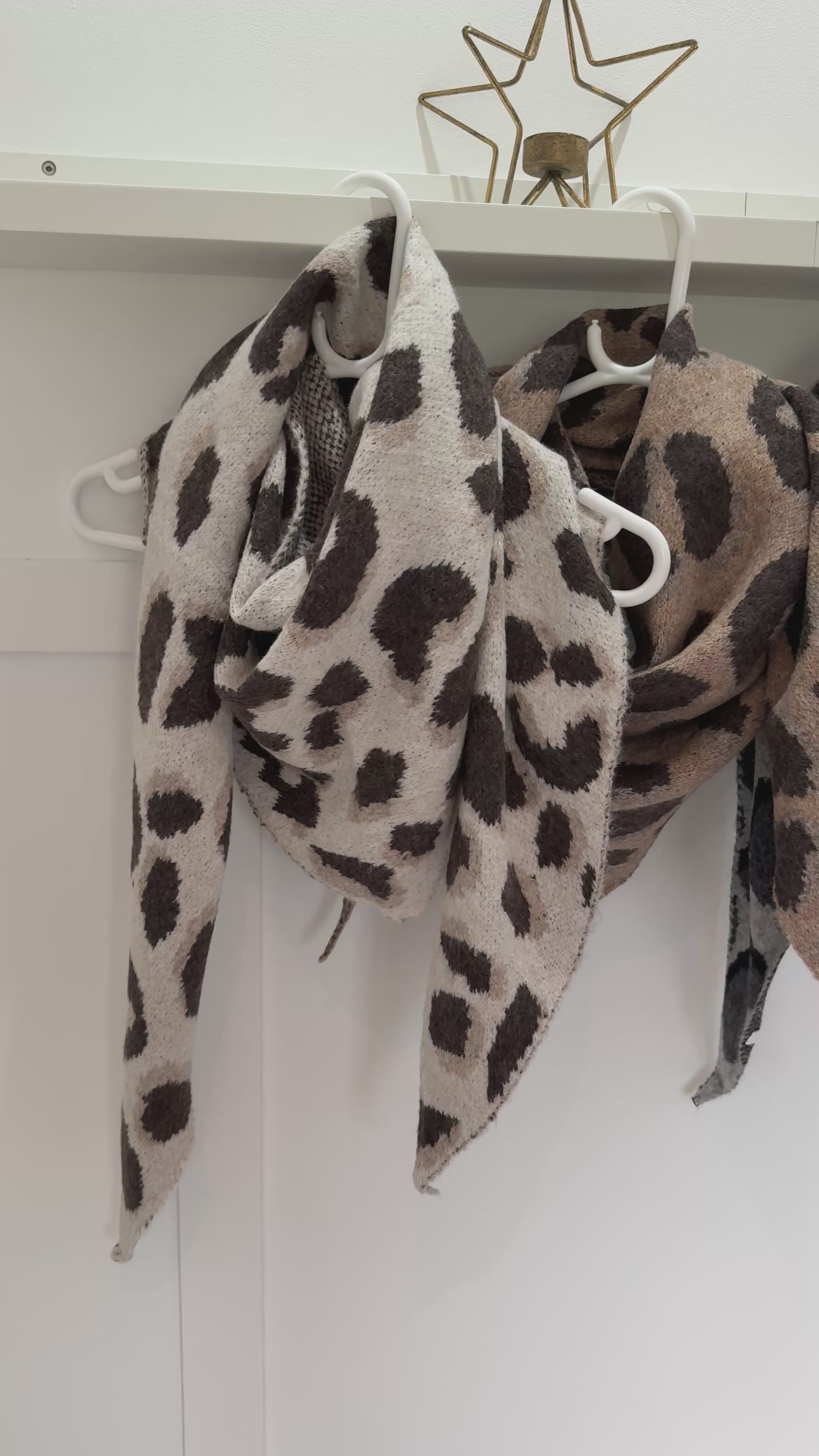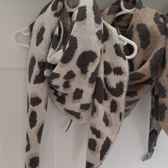 Stay cosy and effortlessly stylish with this soft wool-mix triangular scarf, featuring a bold animal print.