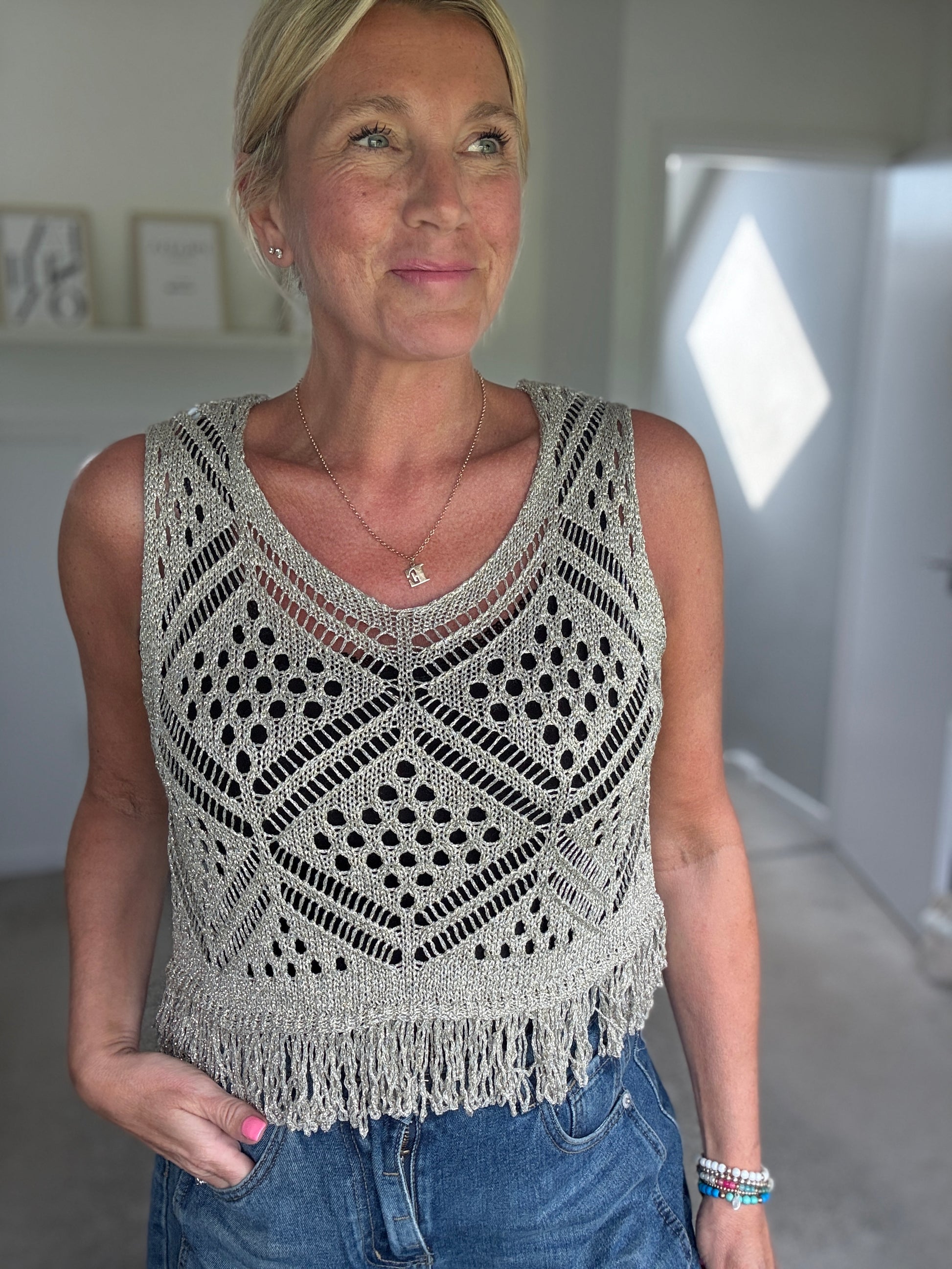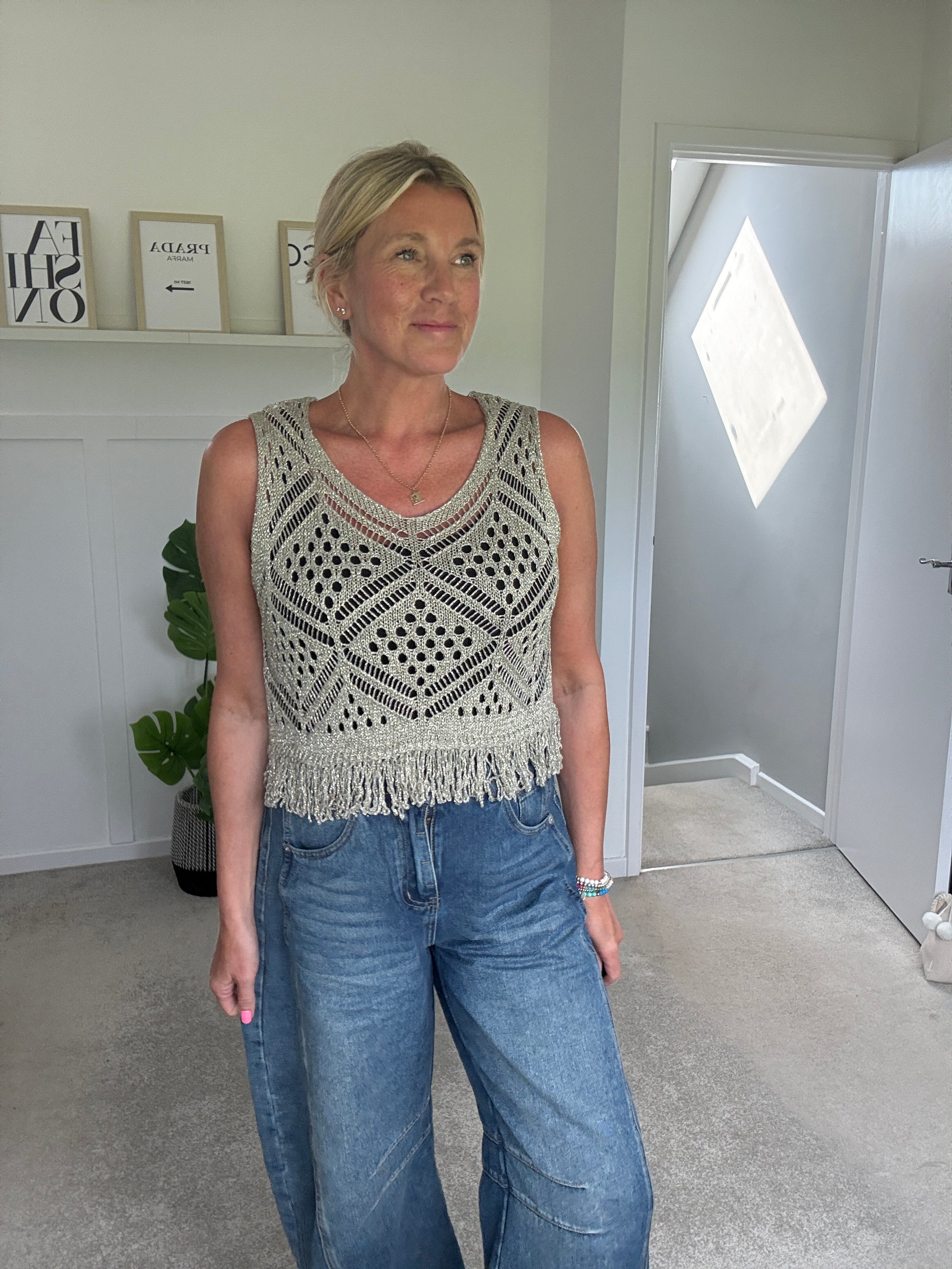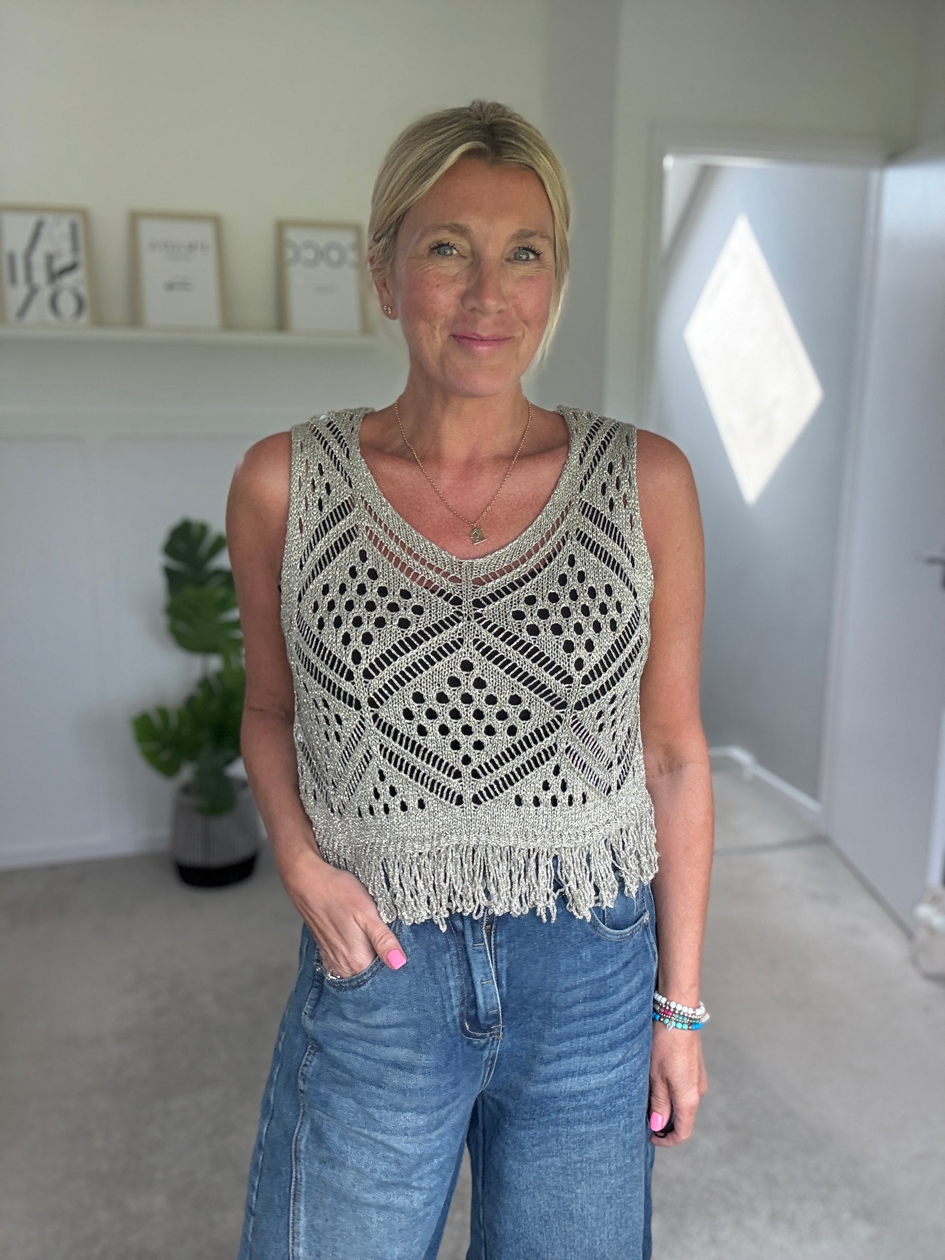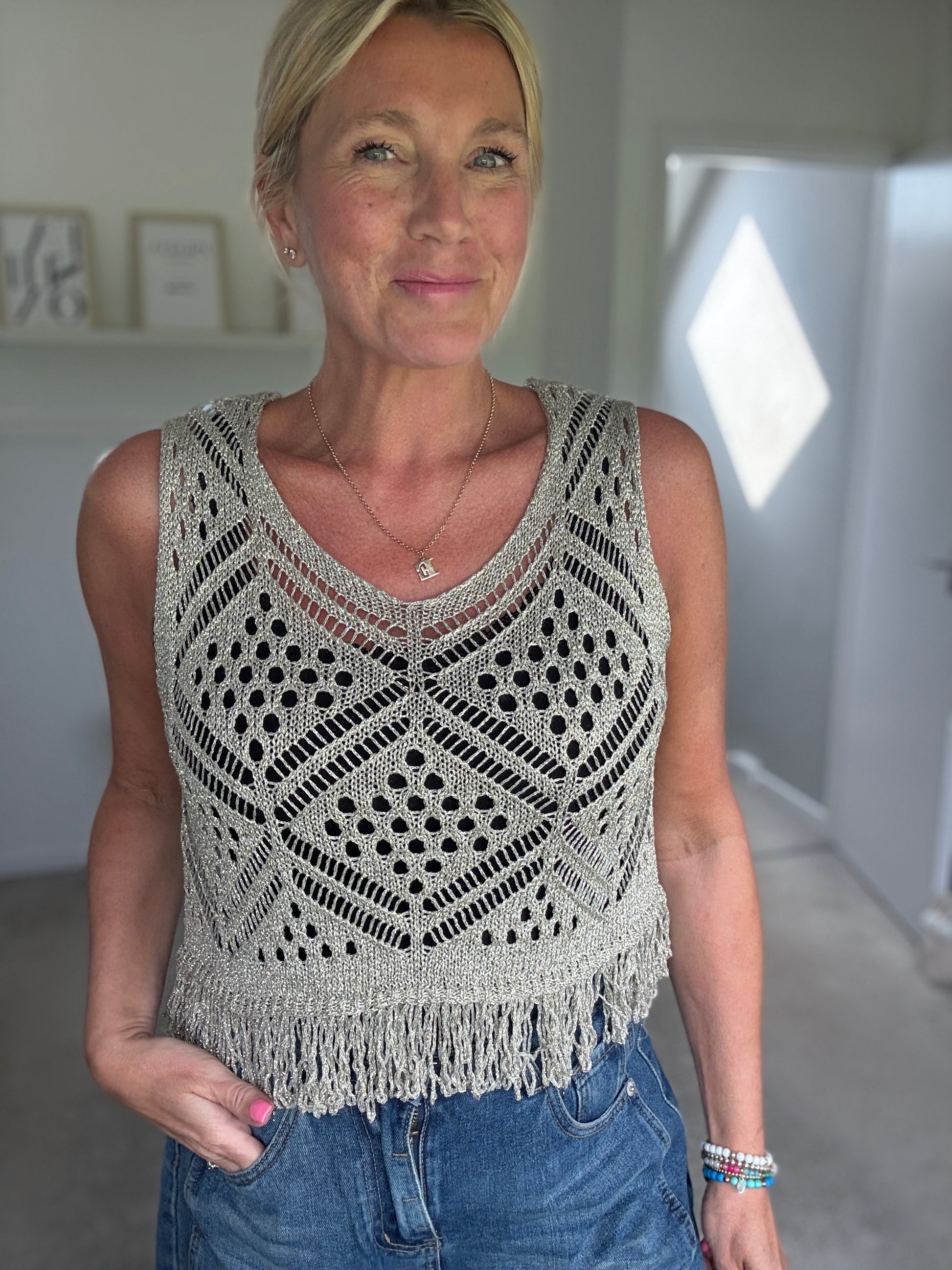This stunning open weave metallic thread crochet top with fringe detailing will be a stunning glam addition to any summer or holiday wardrobe. Wear over vest tops, dresses and with jeans or shorts for a laid back vibe, or dress up with satin trousers or slip skirts!