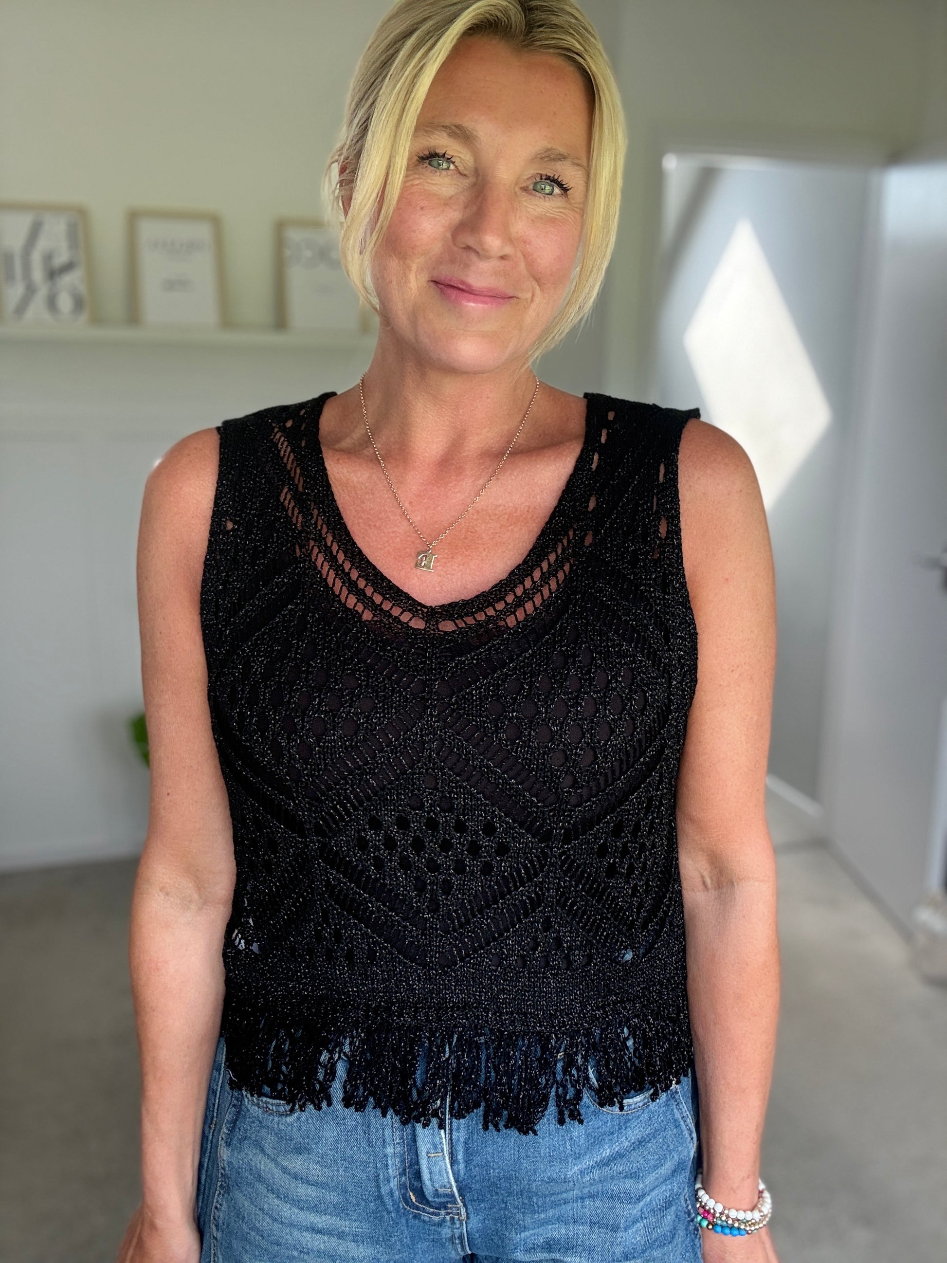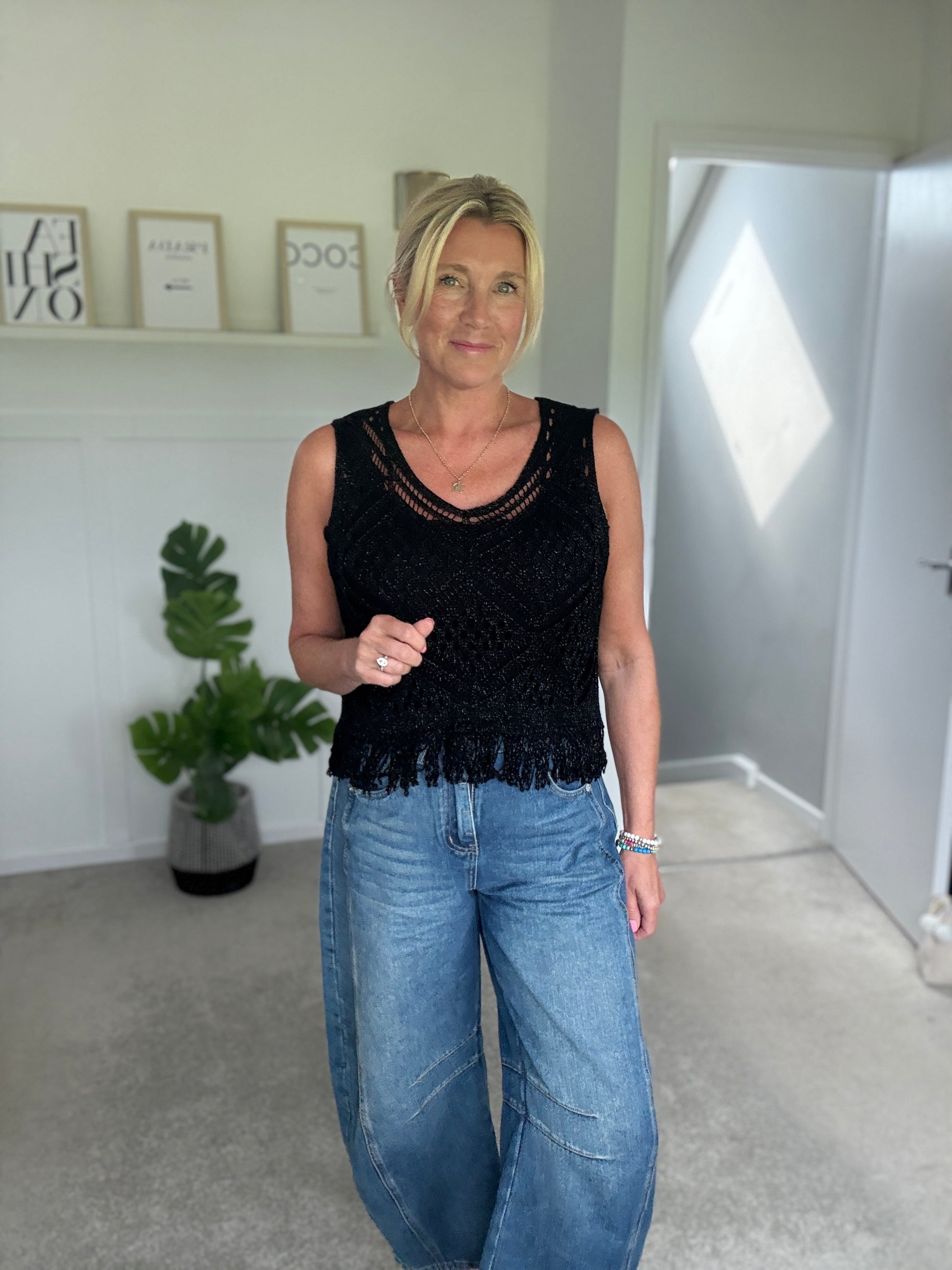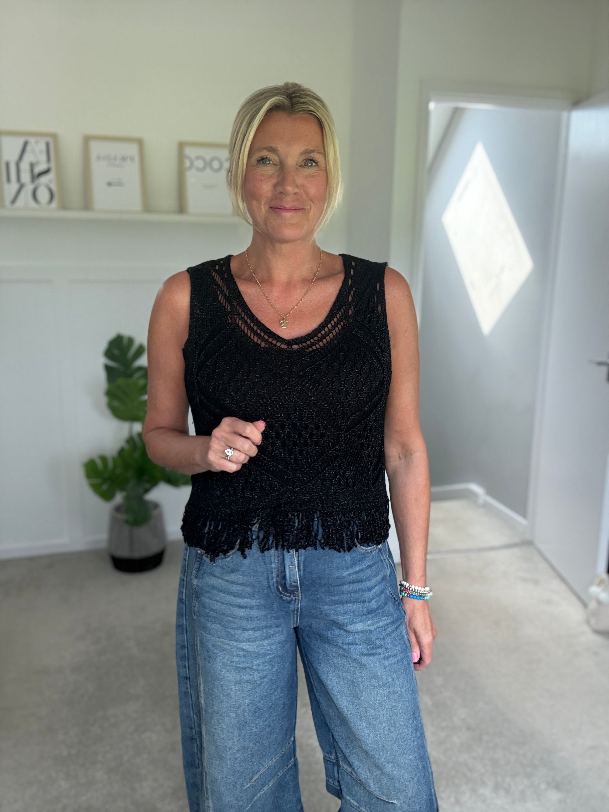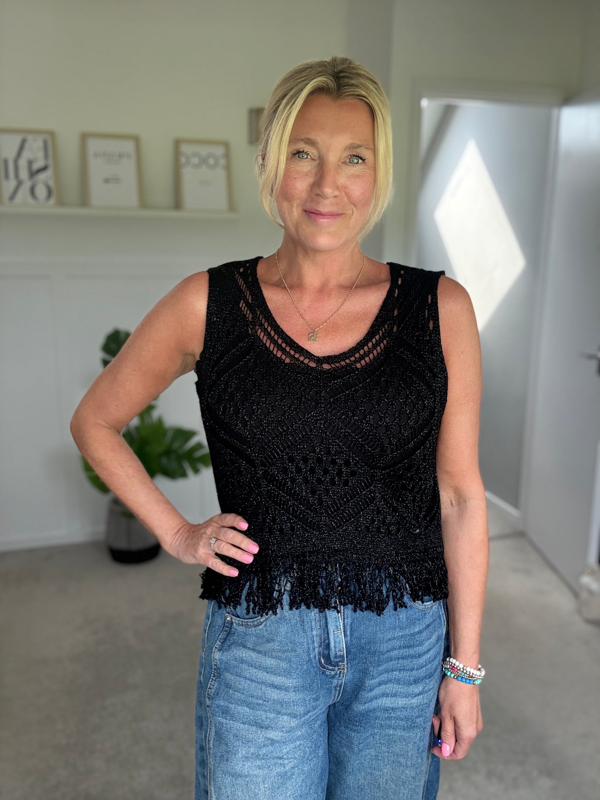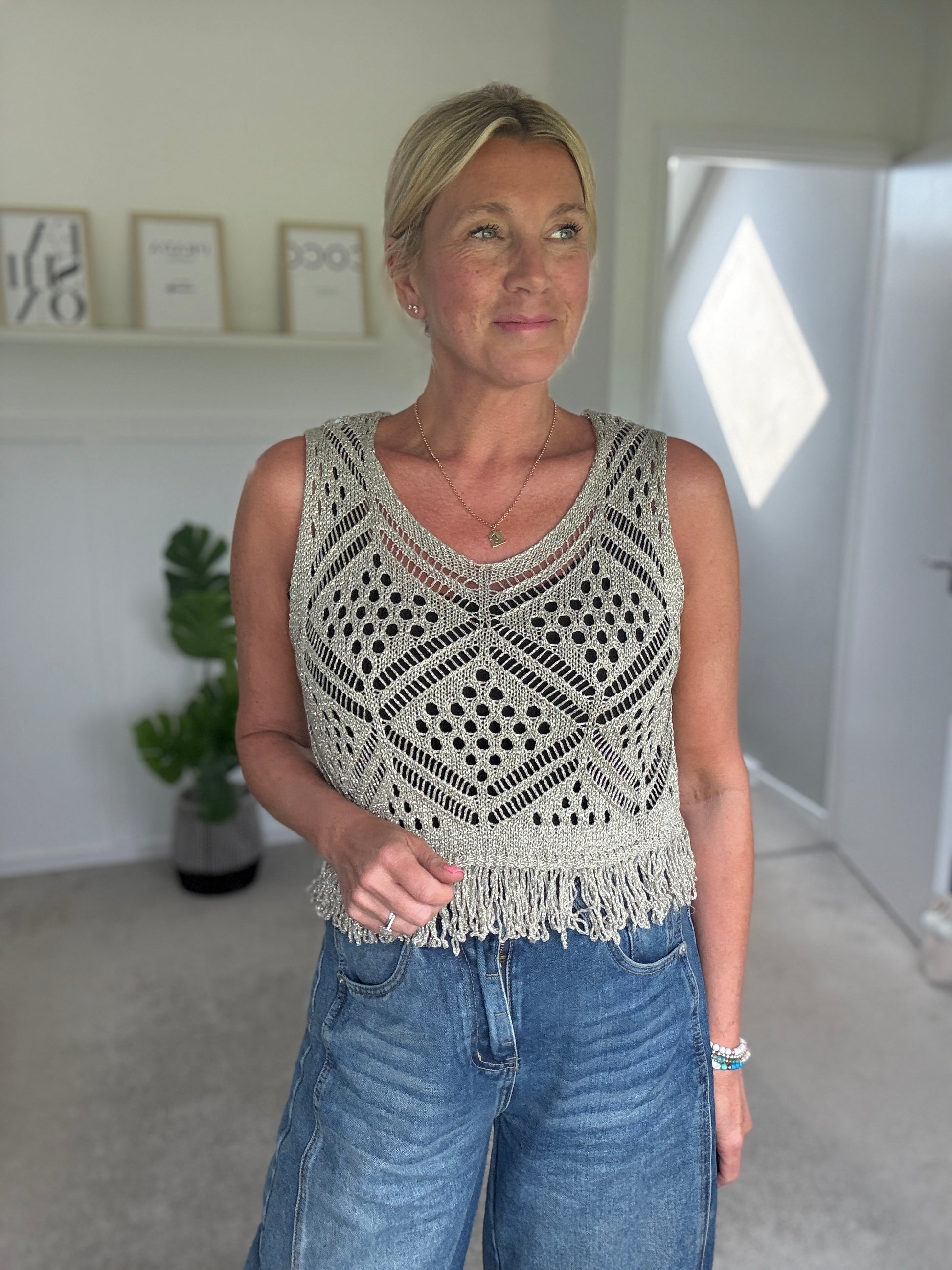 This stunning open weave metallic thread crochet top with fringe detailing will be a stunning glam addition to any summer or holiday wardrobe. Wear over vest tops, dresses and with jeans or shorts for a laid back vibe, or dress up with satin trousers or slip skirts!