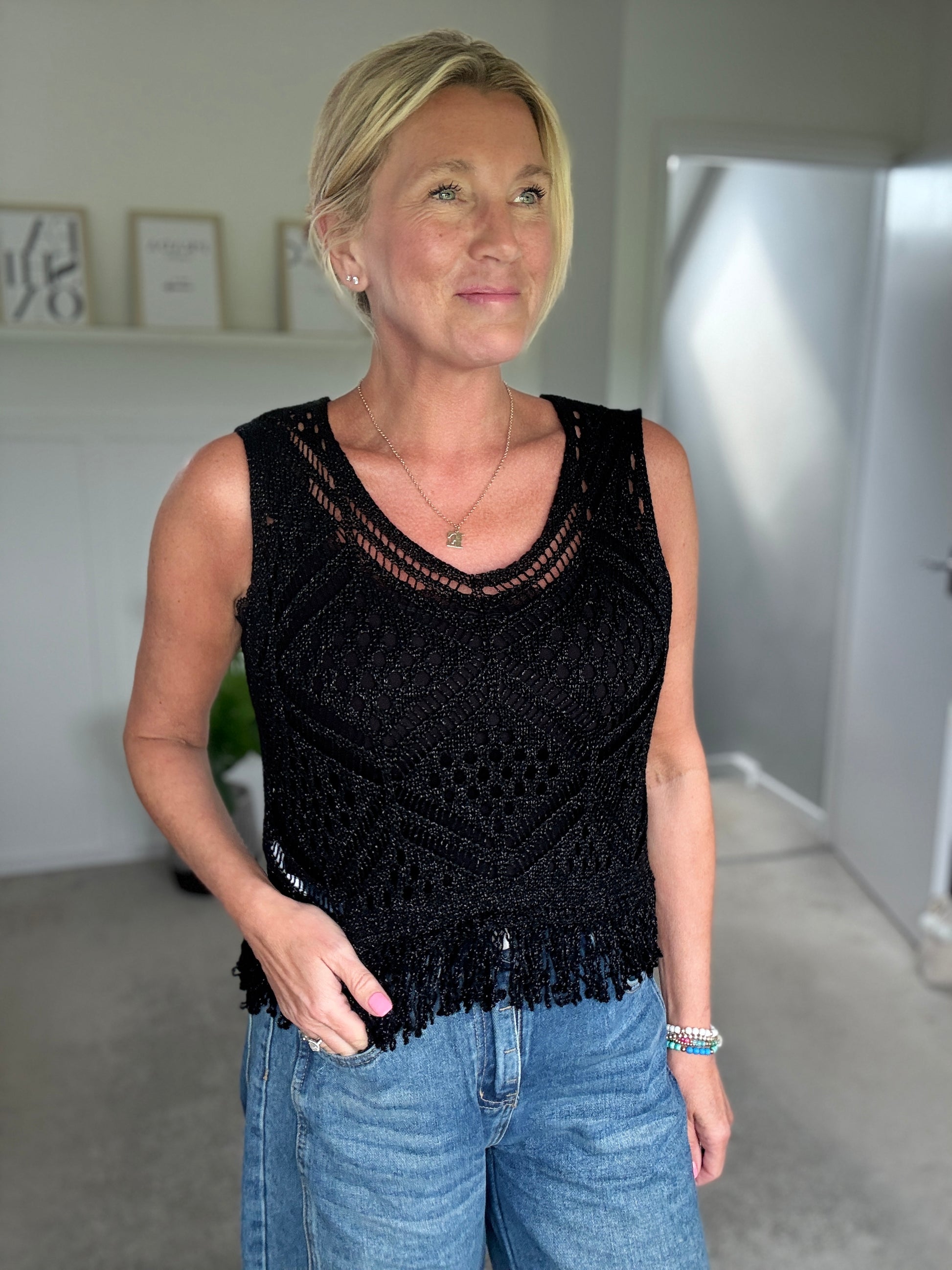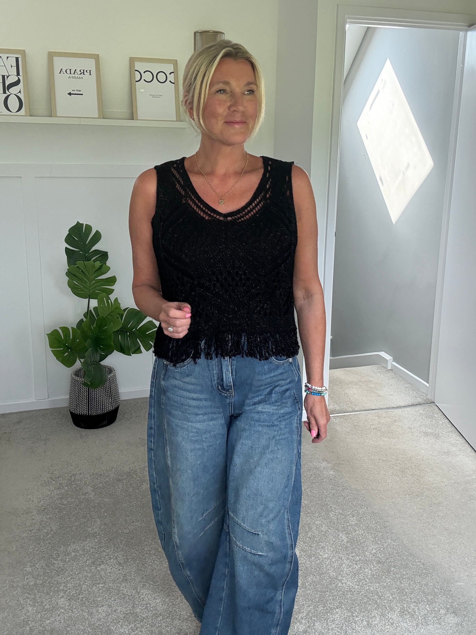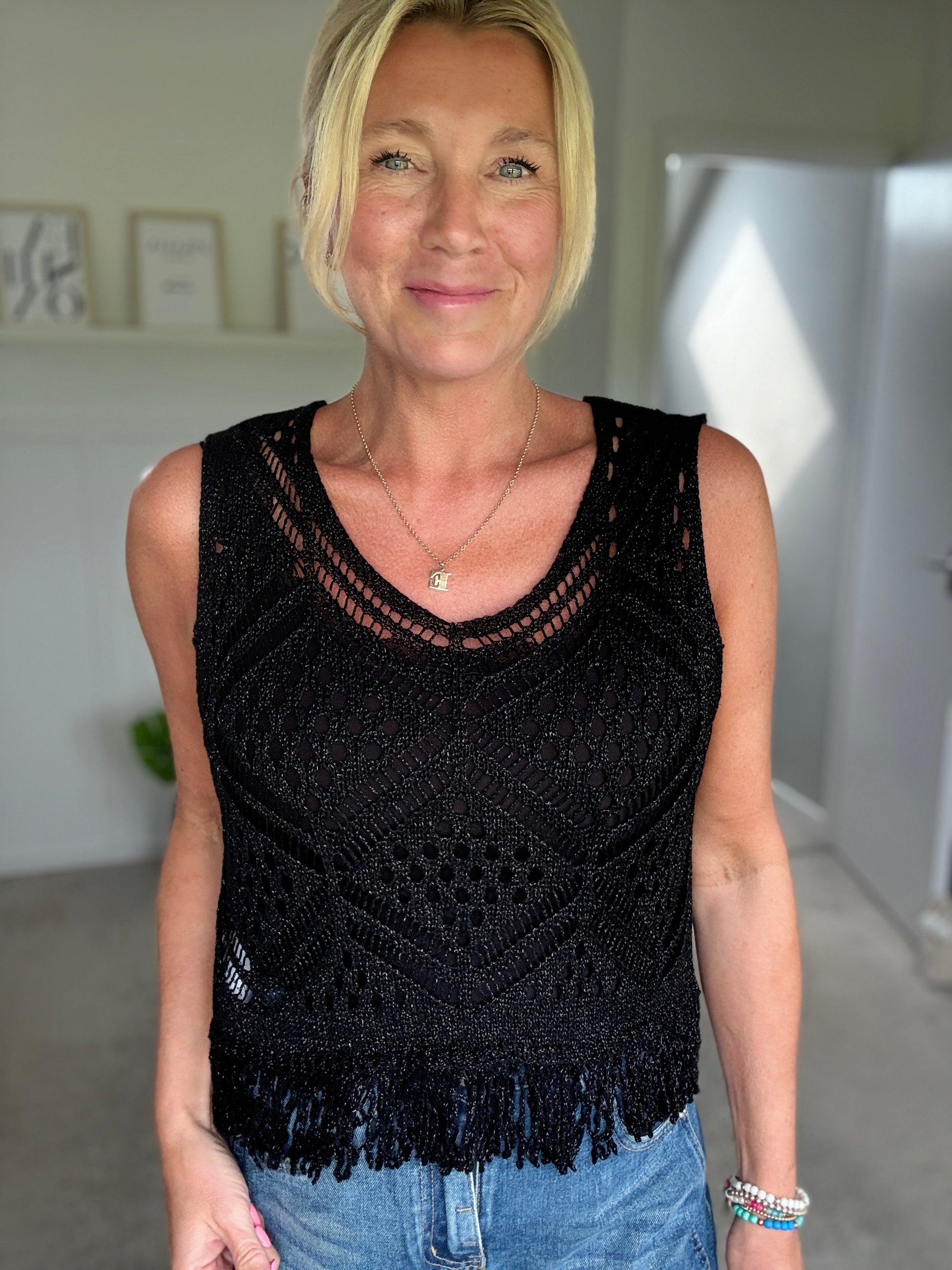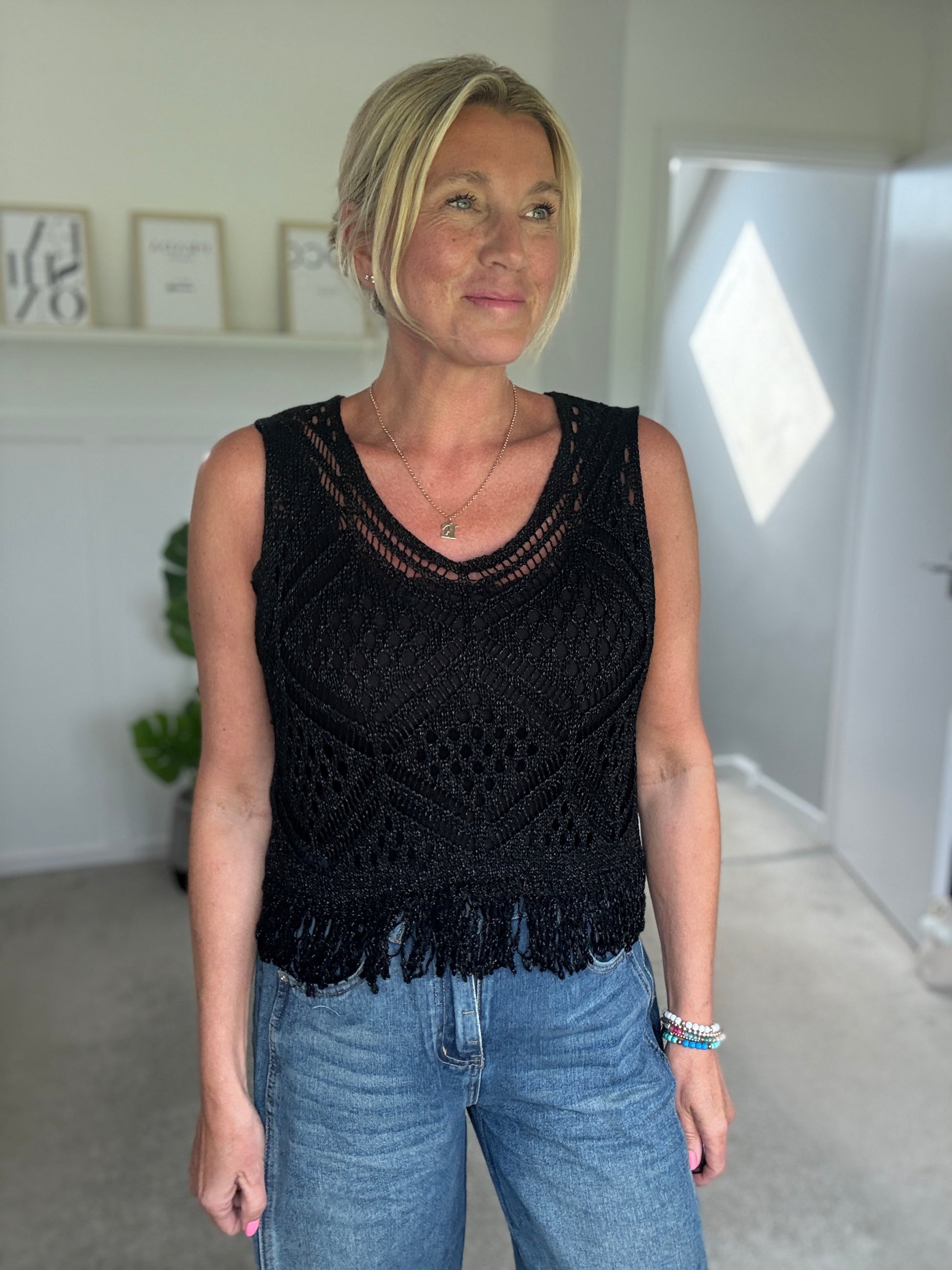 This stunning open weave metallic thread crochet top with fringe detailing will be a stunning glam addition to any summer or holiday wardrobe. Wear over vest tops, dresses and with jeans or shorts for a laid back vibe, or dress up with satin trousers or slip skirts!