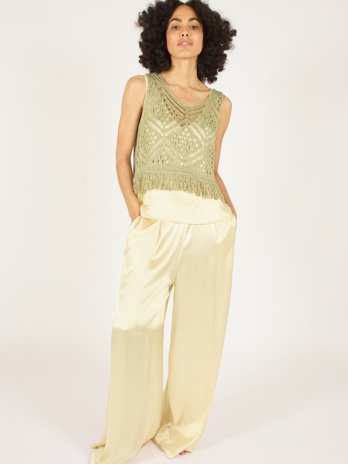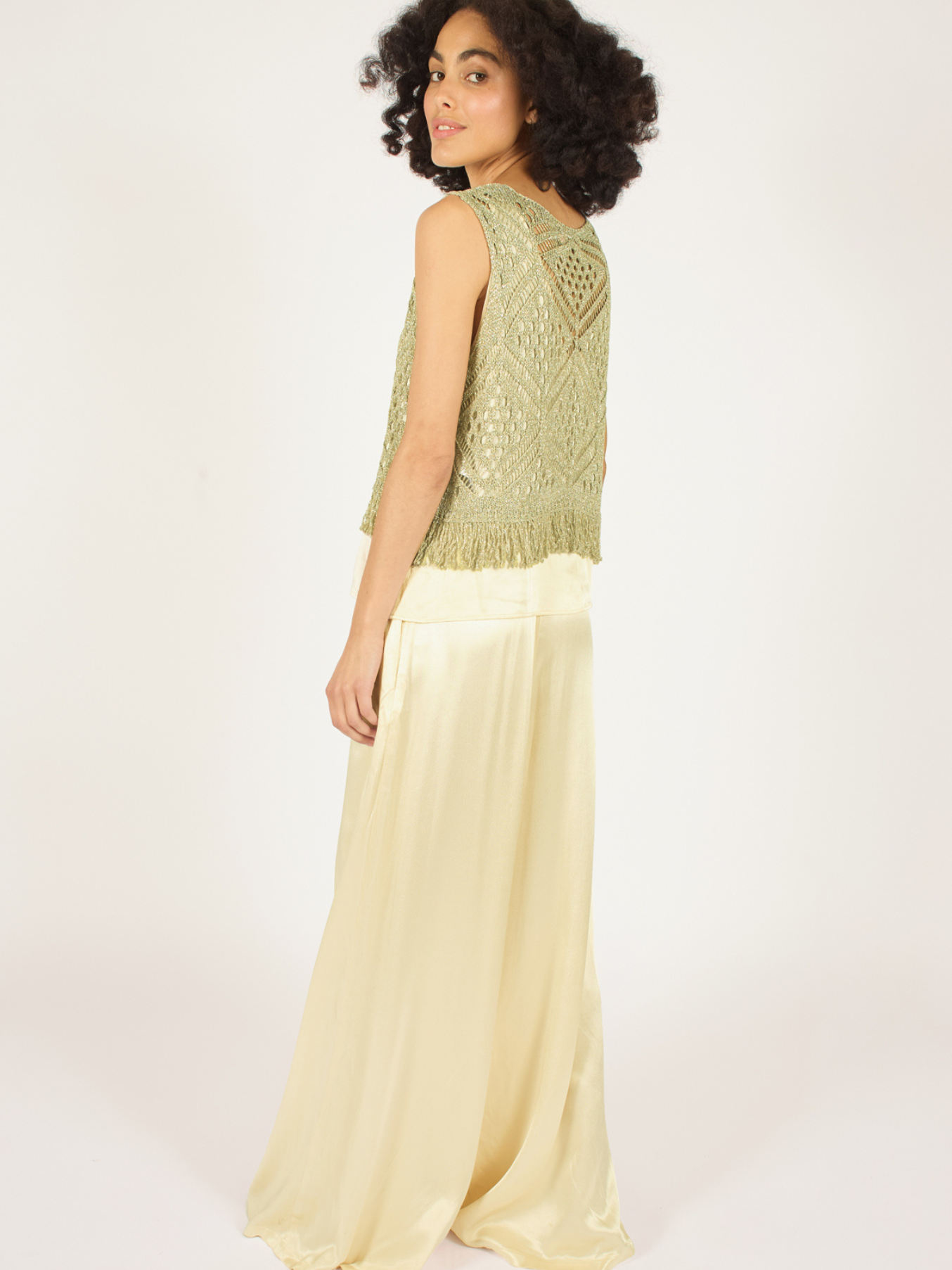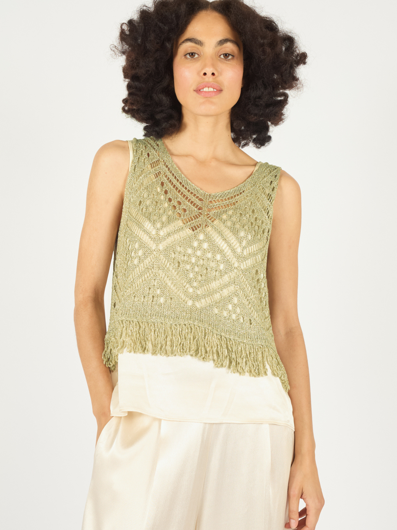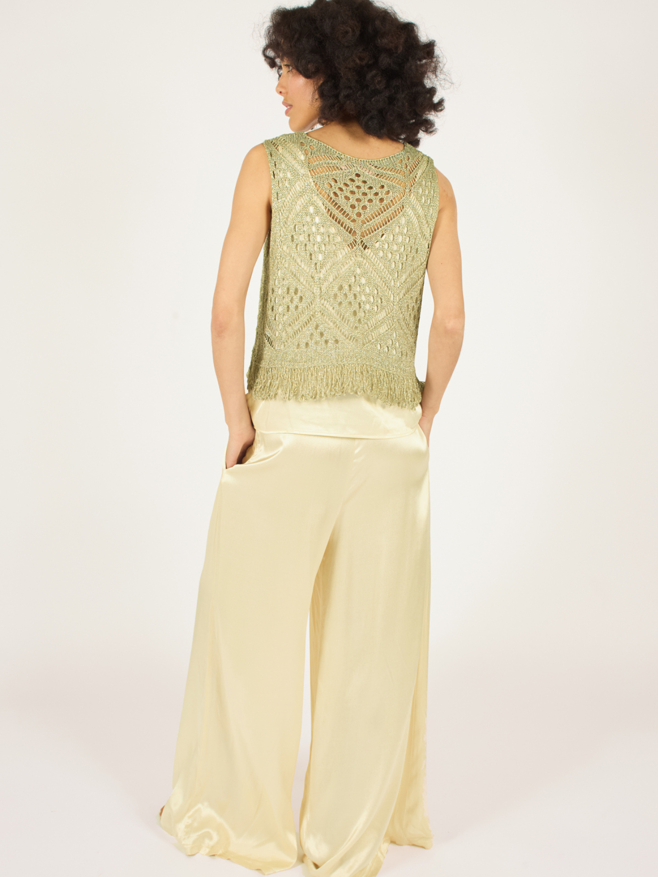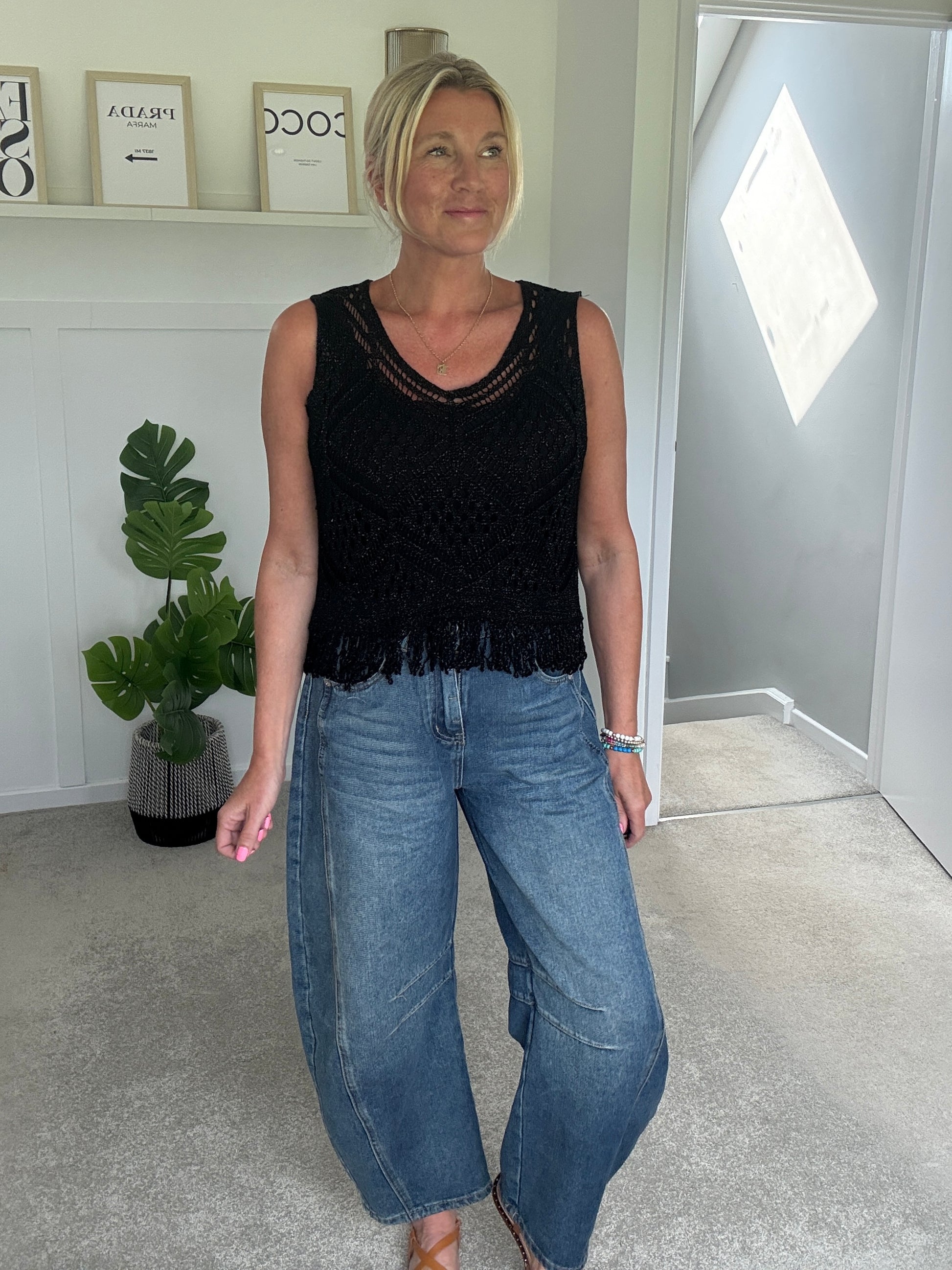 This stunning open weave metallic thread crochet top with fringe detailing will be a stunning glam addition to any summer or holiday wardrobe. Wear over vest tops, dresses and with jeans or shorts for a laid back vibe, or dress up with satin trousers or slip skirts!