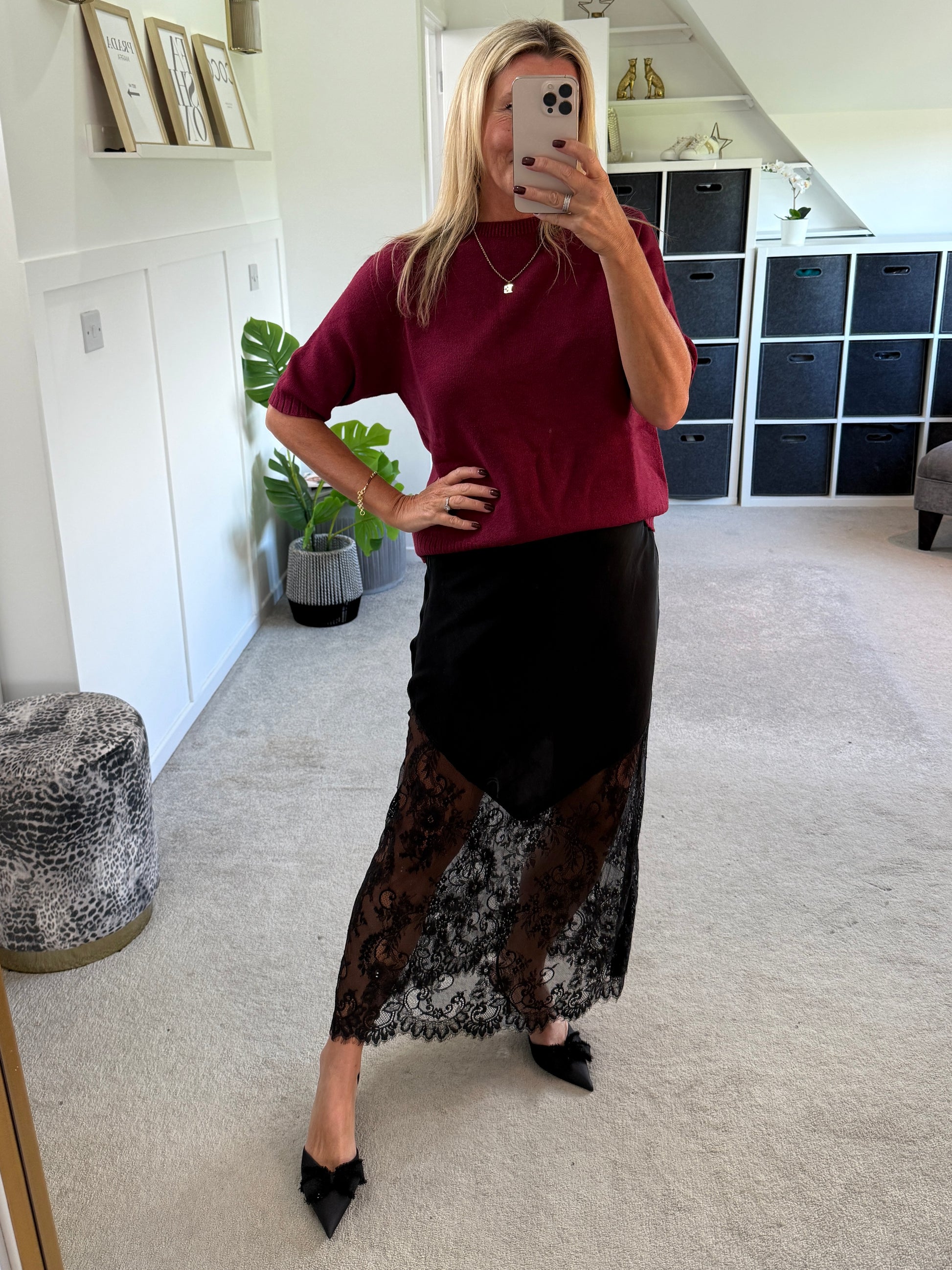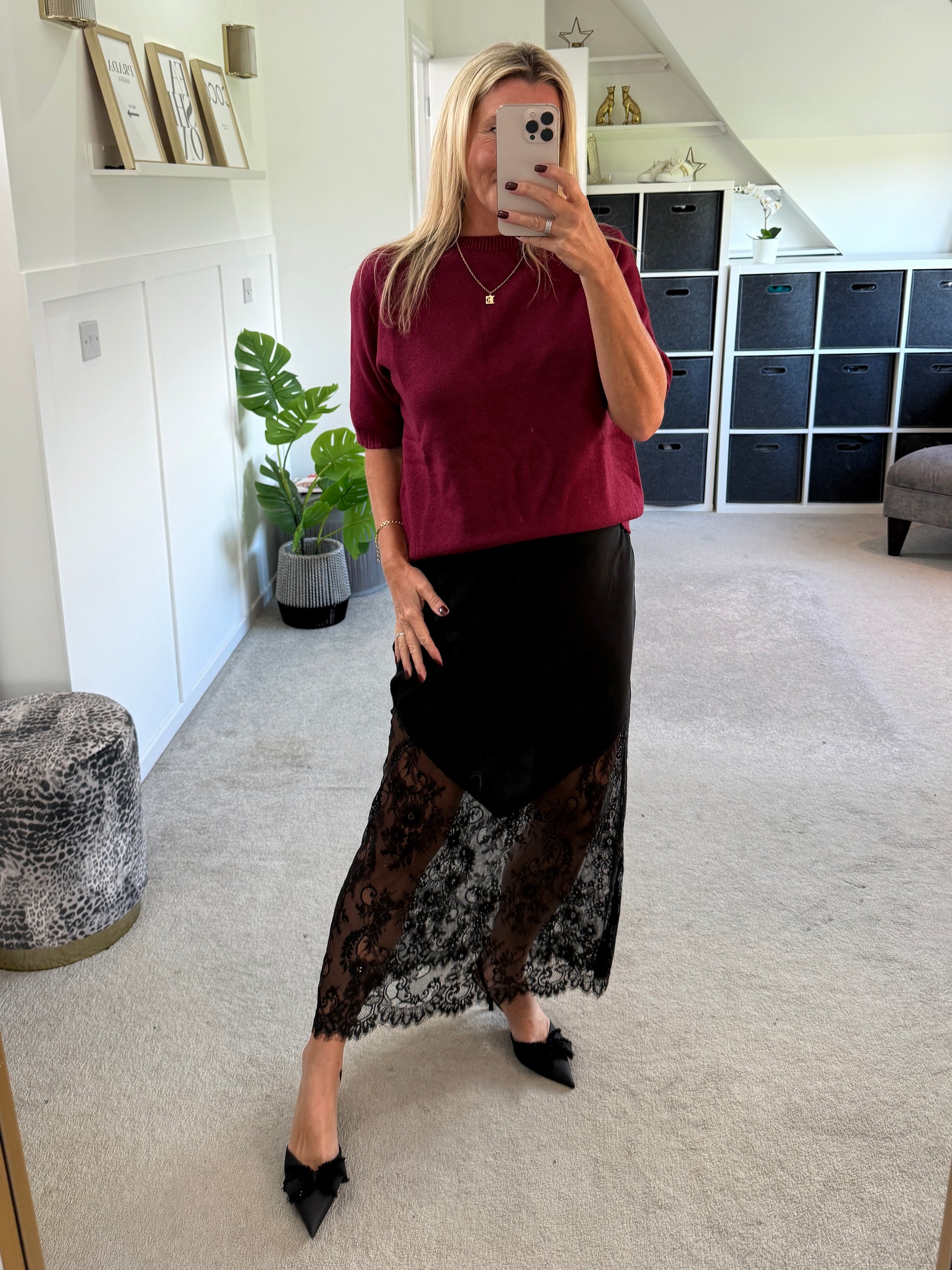 Elegant with a touch of edge, this maxi slip skirt is the perfect statement piece. Designed with a silky satin finish and delicate lace hem, it drapes beautifully for a flattering silhouette.