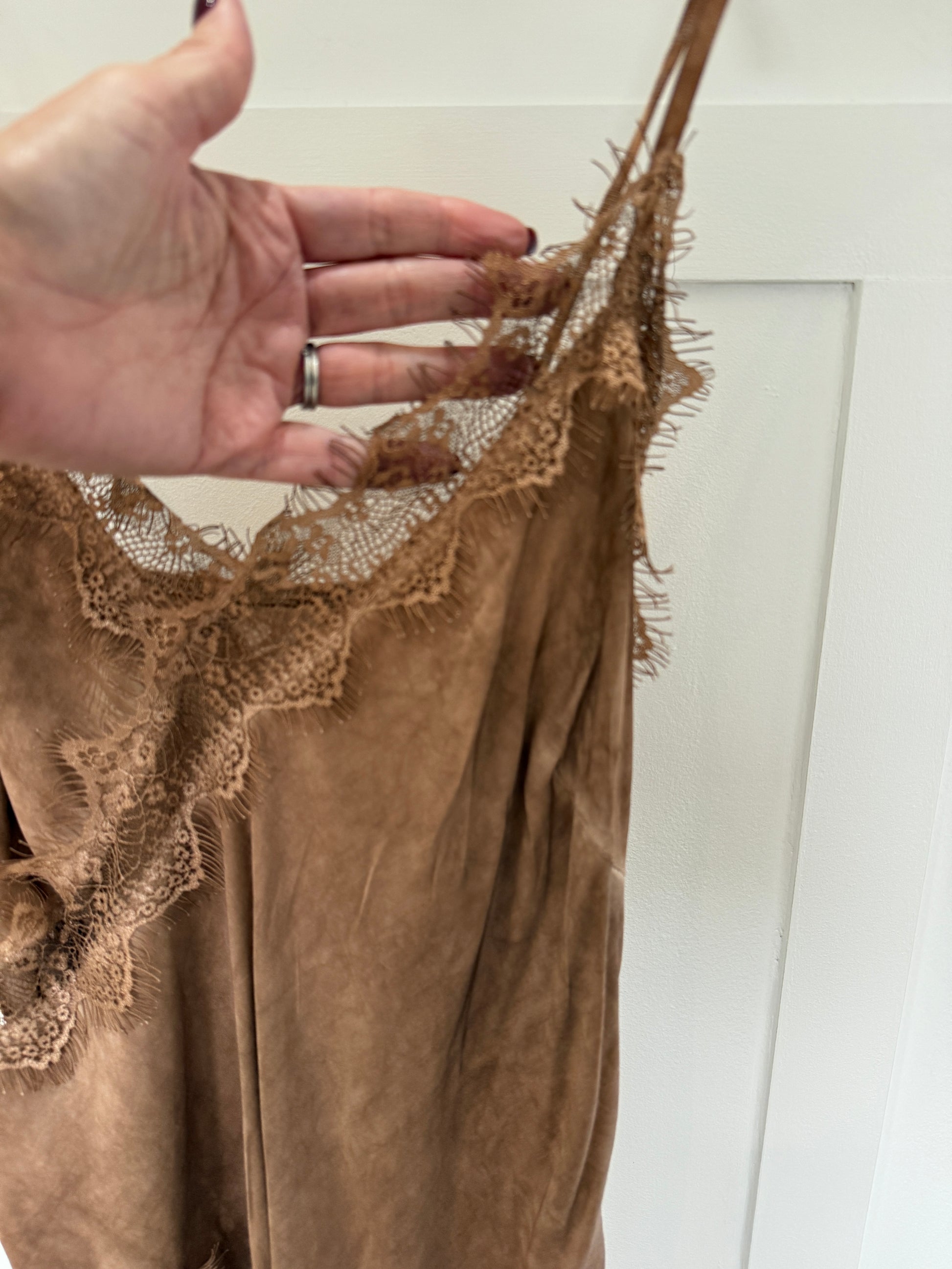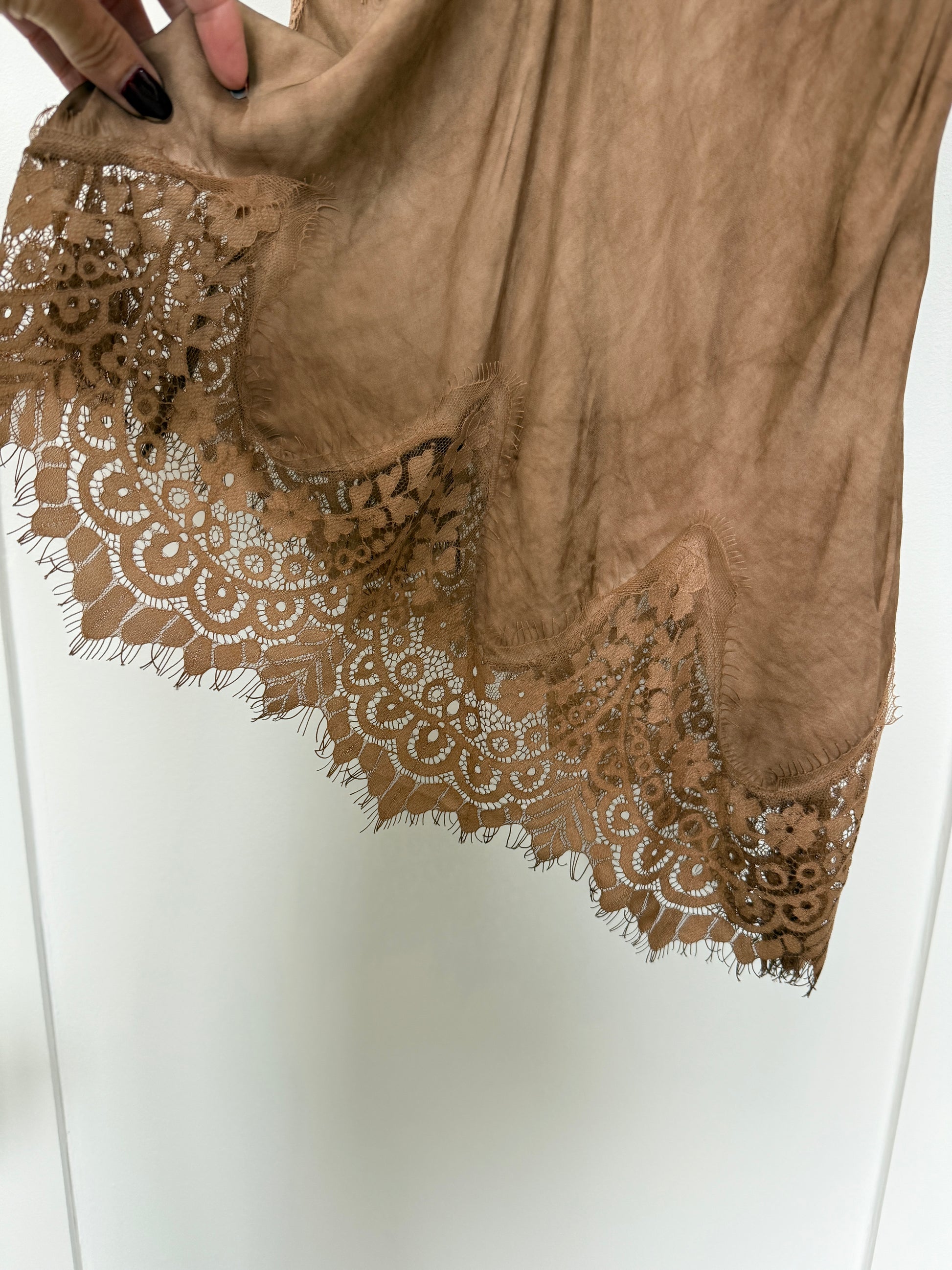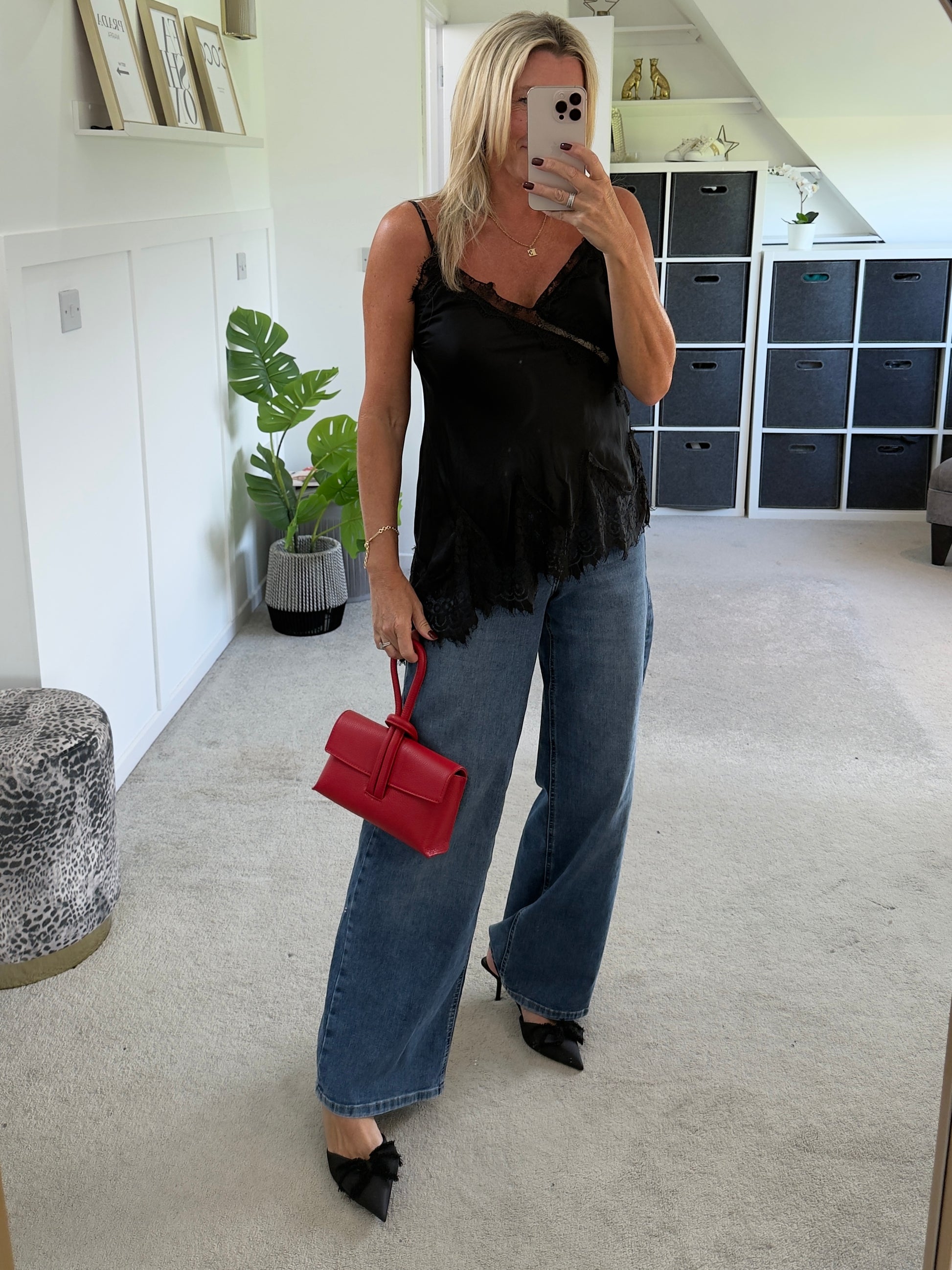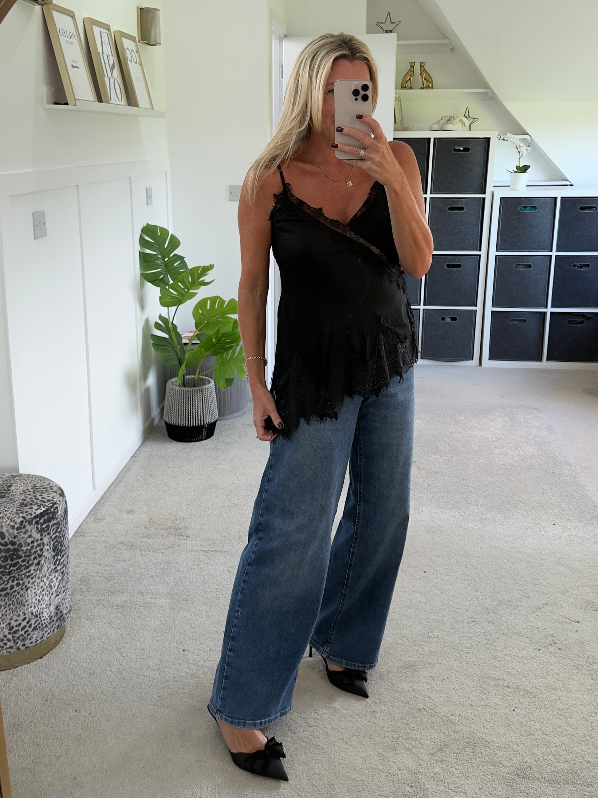 Chic and feminine, this viscose satin cami features a pretty delicate lace trim, a fluid and very trendy asymmetrical drape and lightweight feel make it perfect for layering under blazers, cardigans, or denim jackets. Also wear with wide leg jeans for a true fashion forward look.
