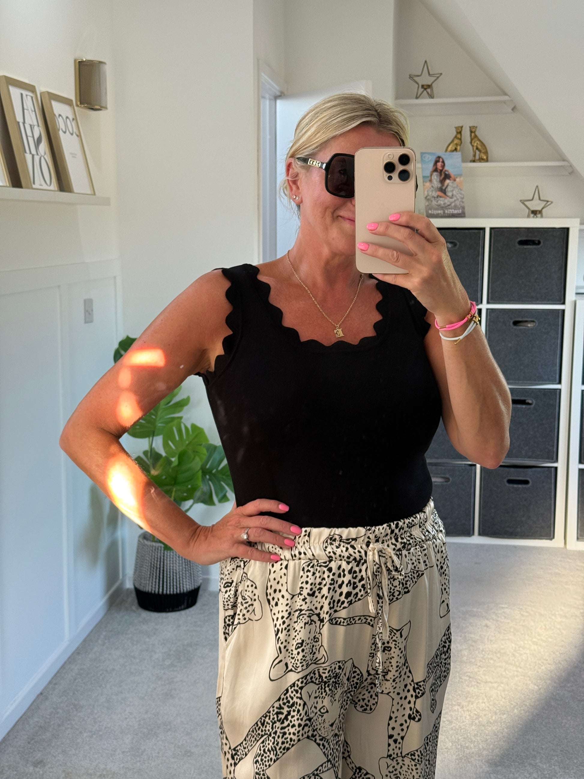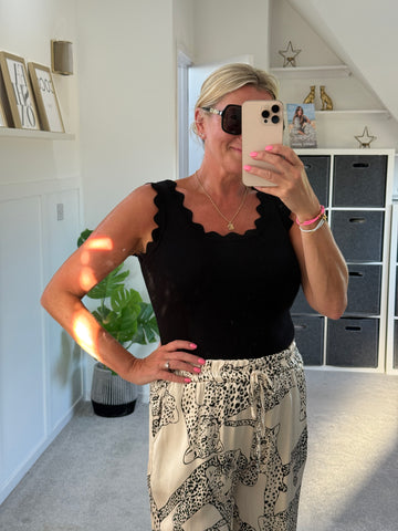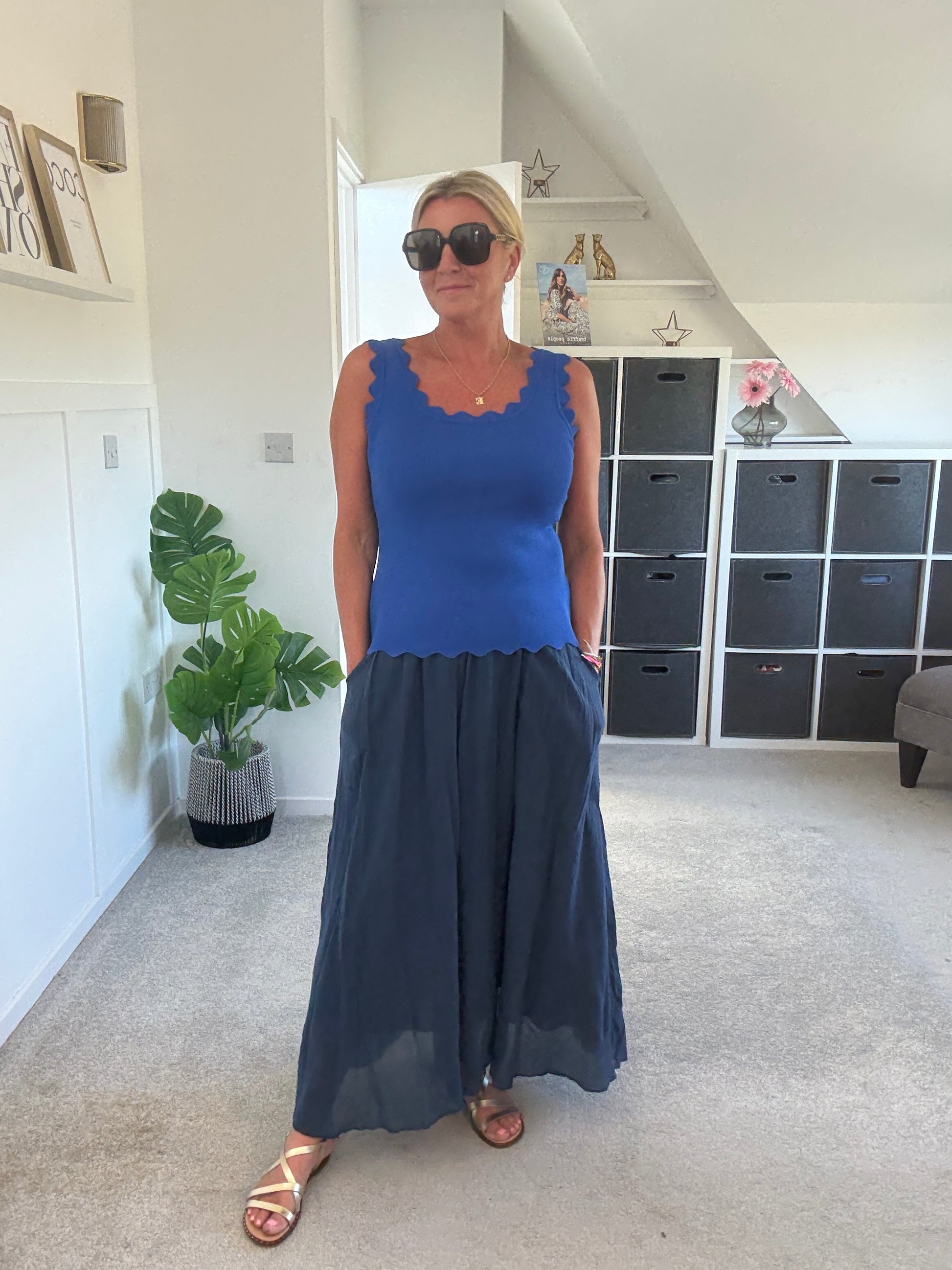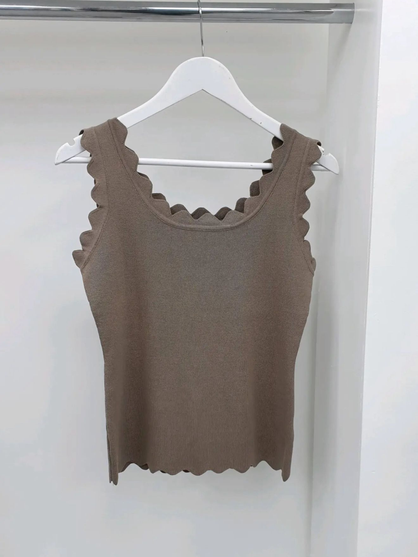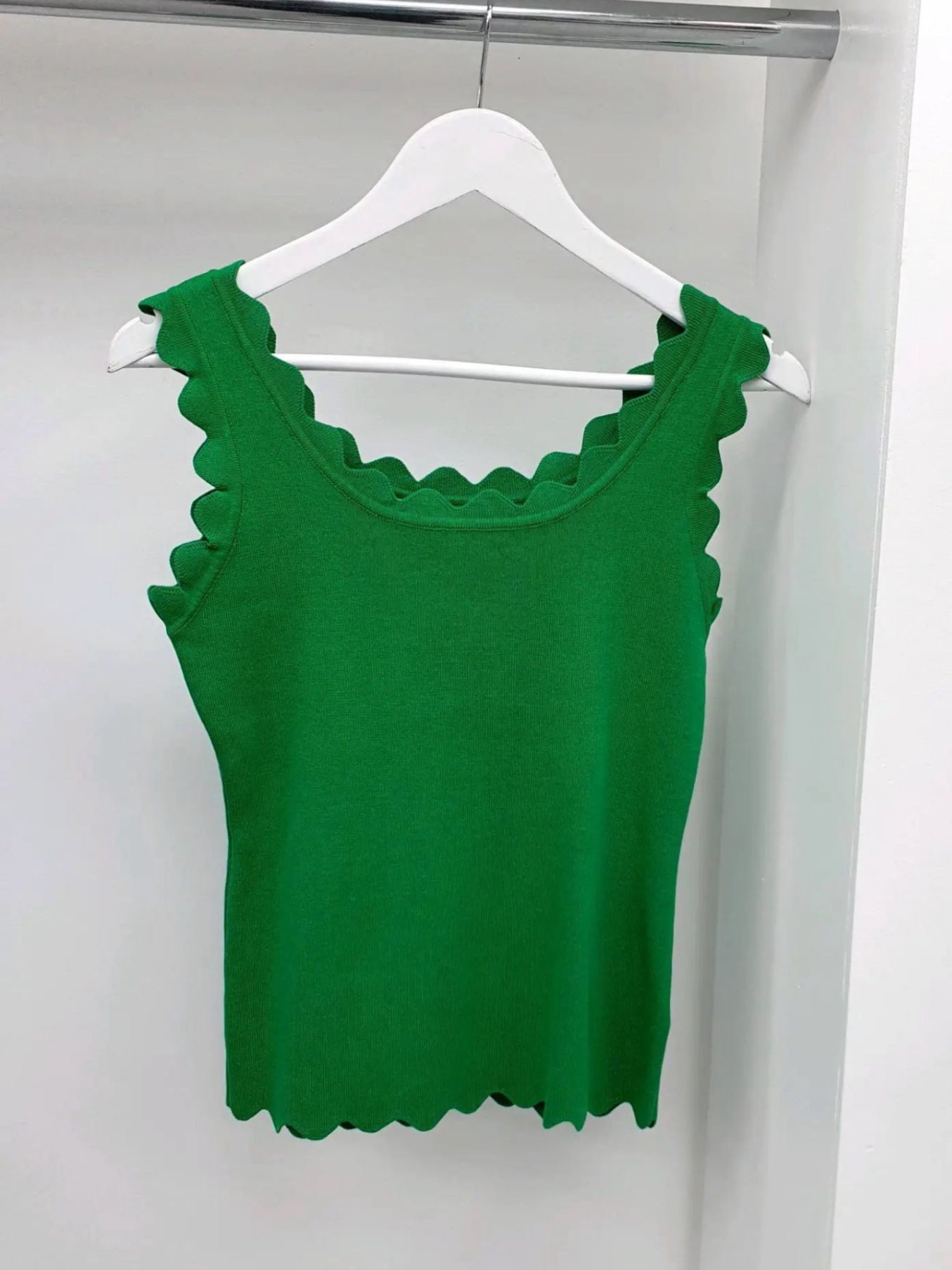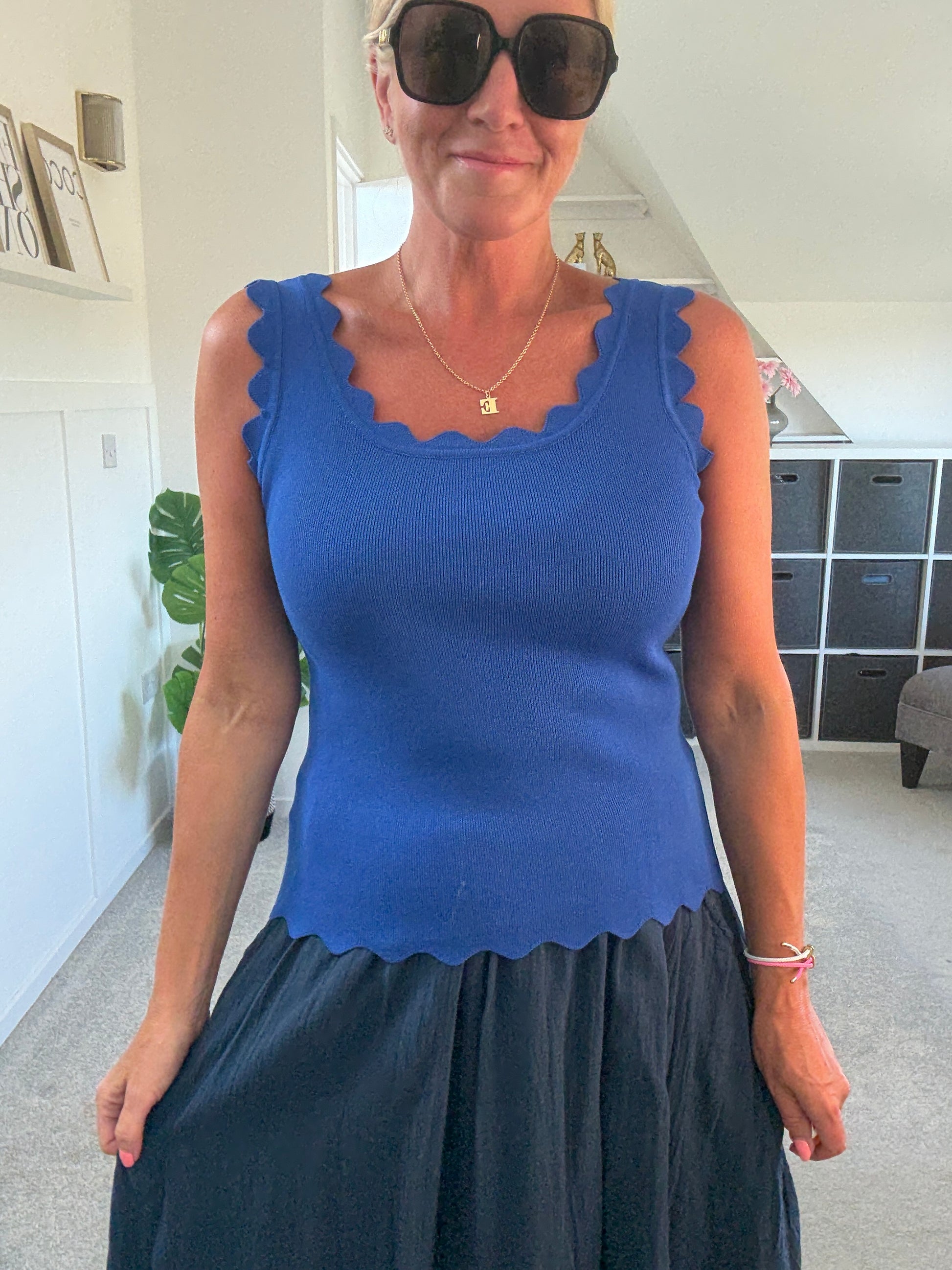 A wardrobe staple with a twist. This lightweight knitted vest top features delicate scallop edging along the neckline and hem. The soft stretch knit hugs the body for a flattering, comfortable fit. A perfect top for mixing and matching with maxi skirts and floaty trousers. Sizes: S/M (UK 8–12), M/L (UK 12–16)