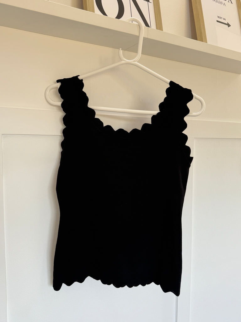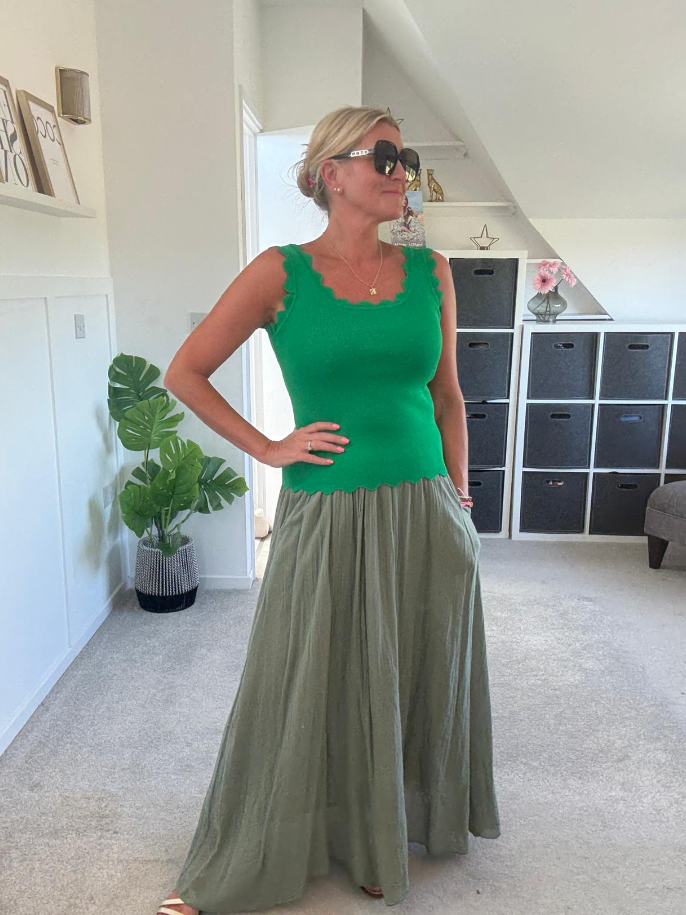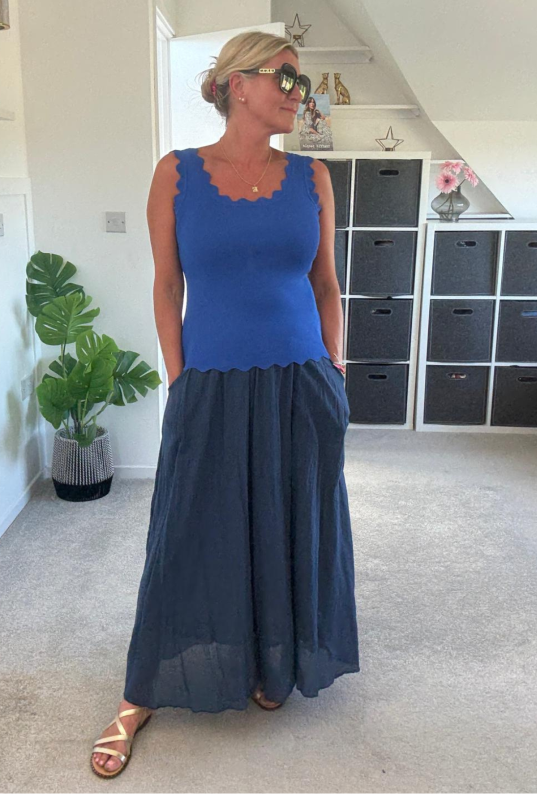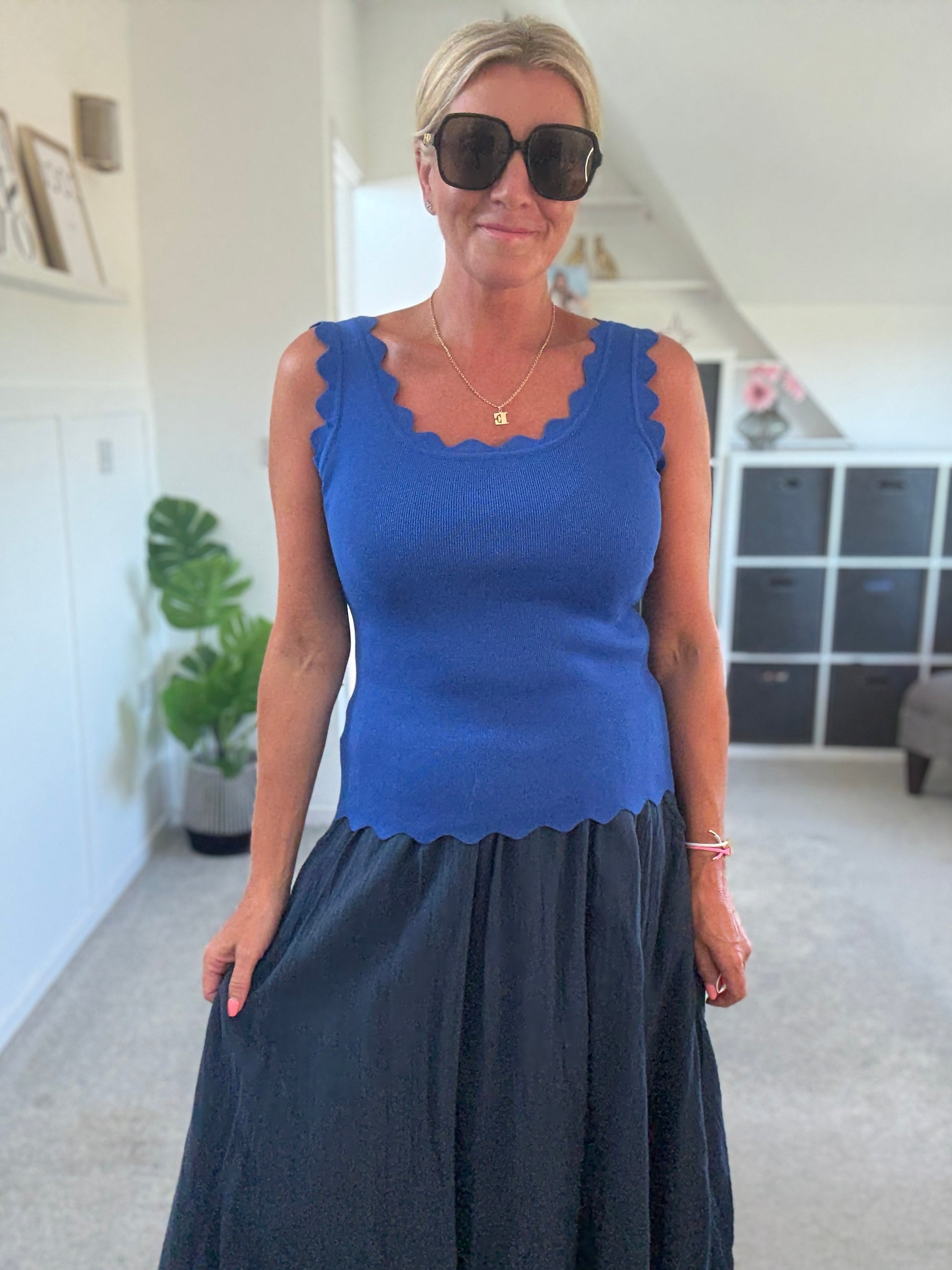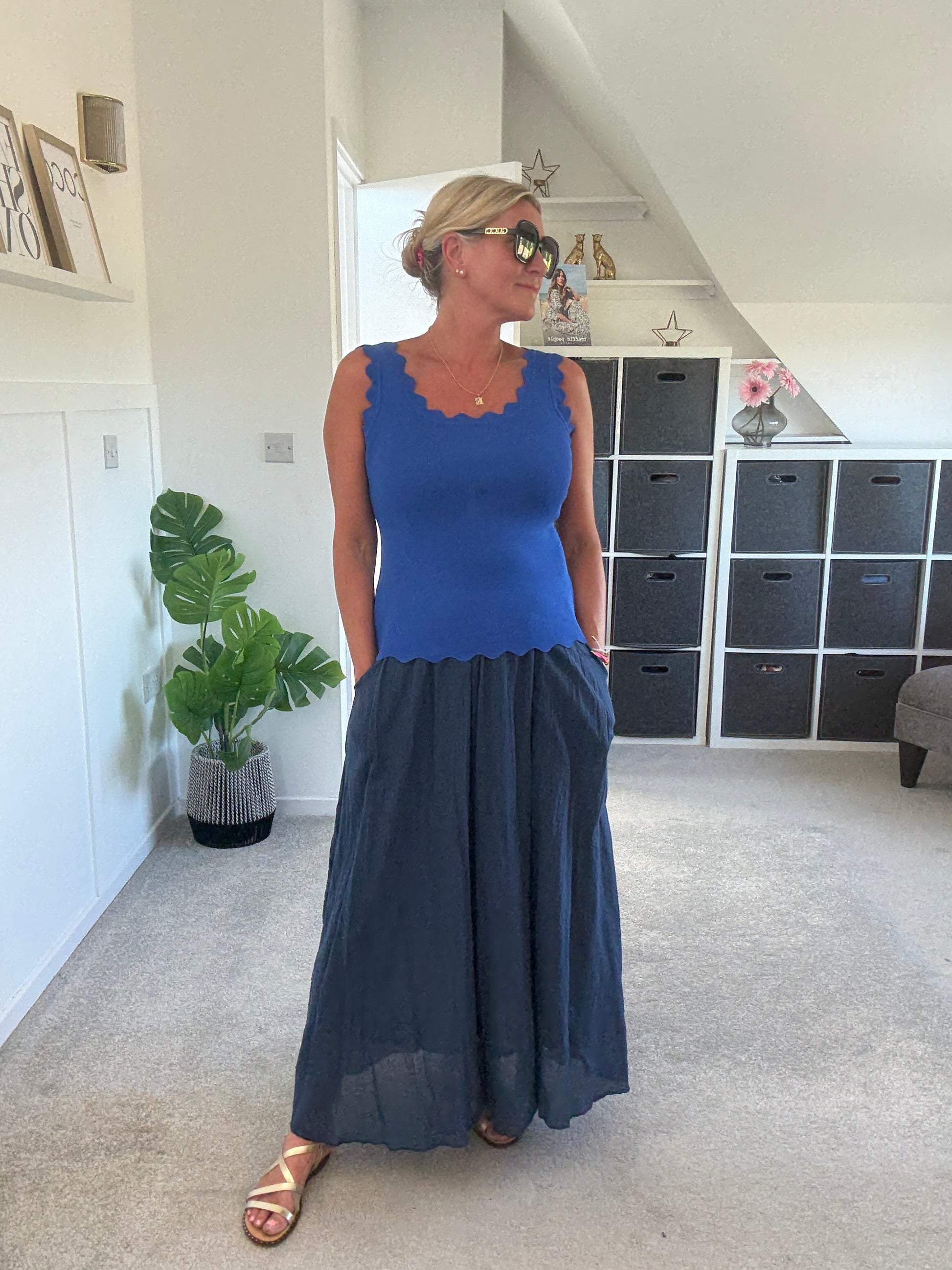 A wardrobe staple with a twist. This lightweight knitted vest top features delicate scallop edging along the neckline and hem. The soft stretch knit hugs the body for a flattering, comfortable fit. A perfect top for mixing and matching with maxi skirts and floaty trousers. Sizes: S/M (UK 8–12), M/L (UK 12–16)