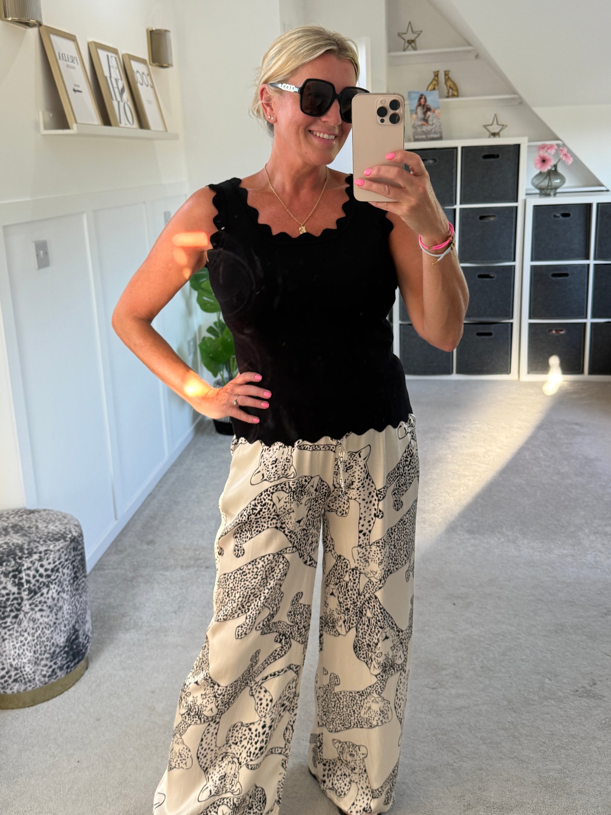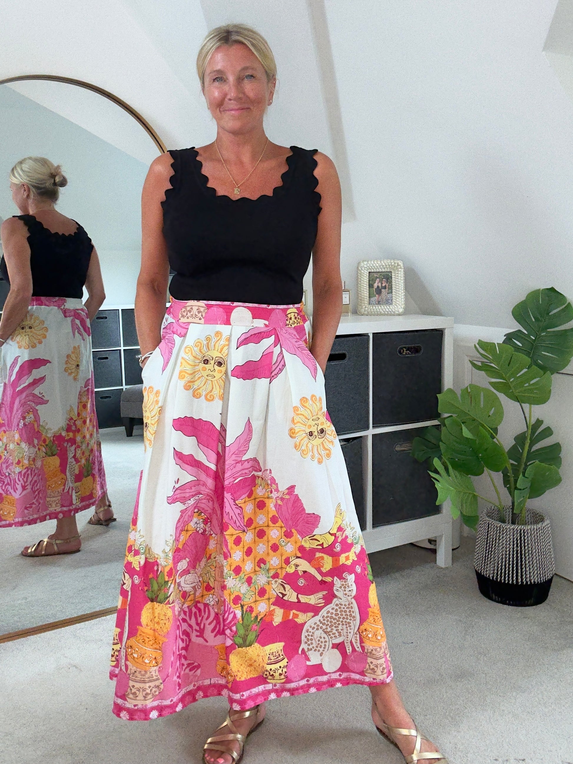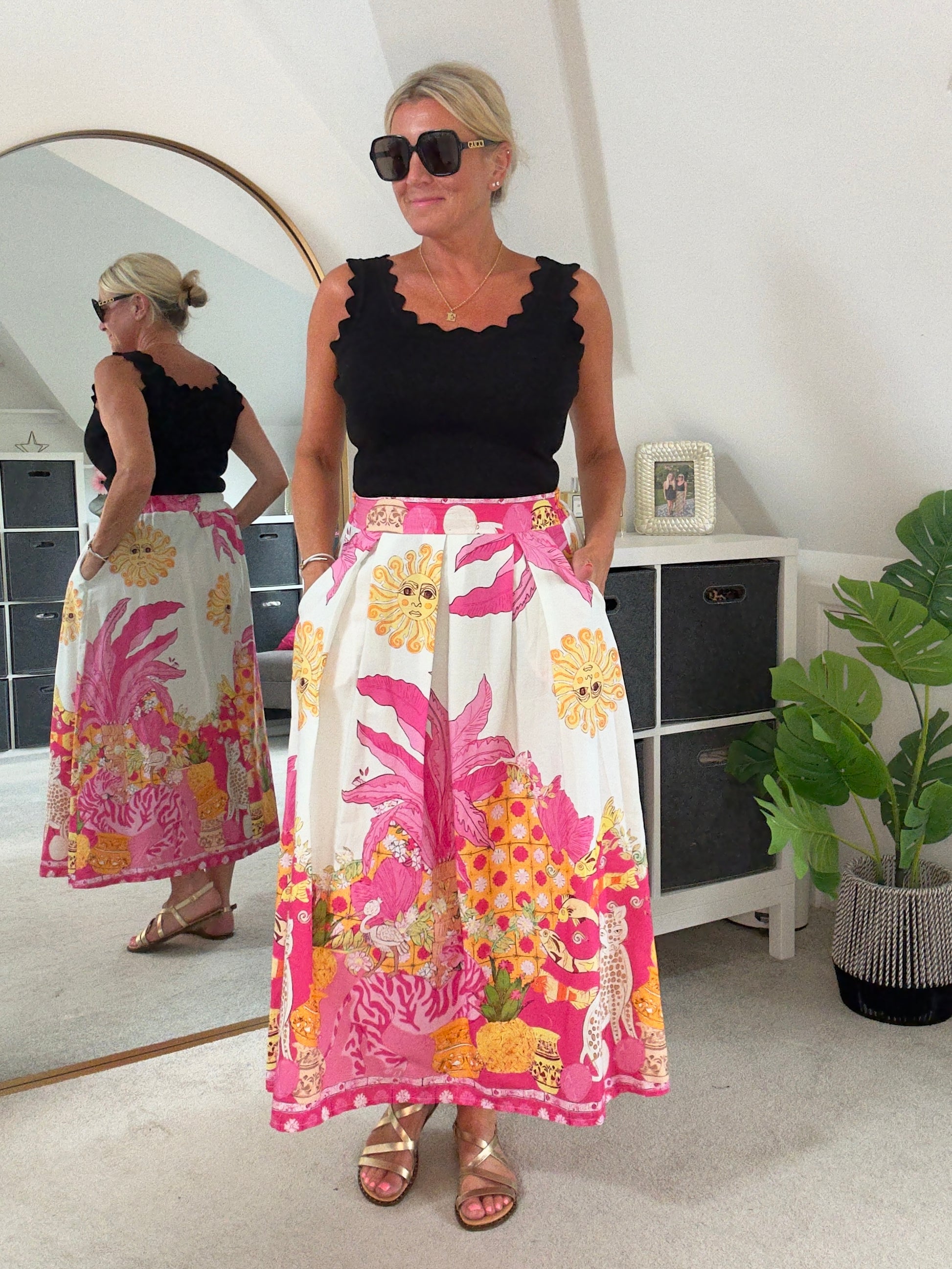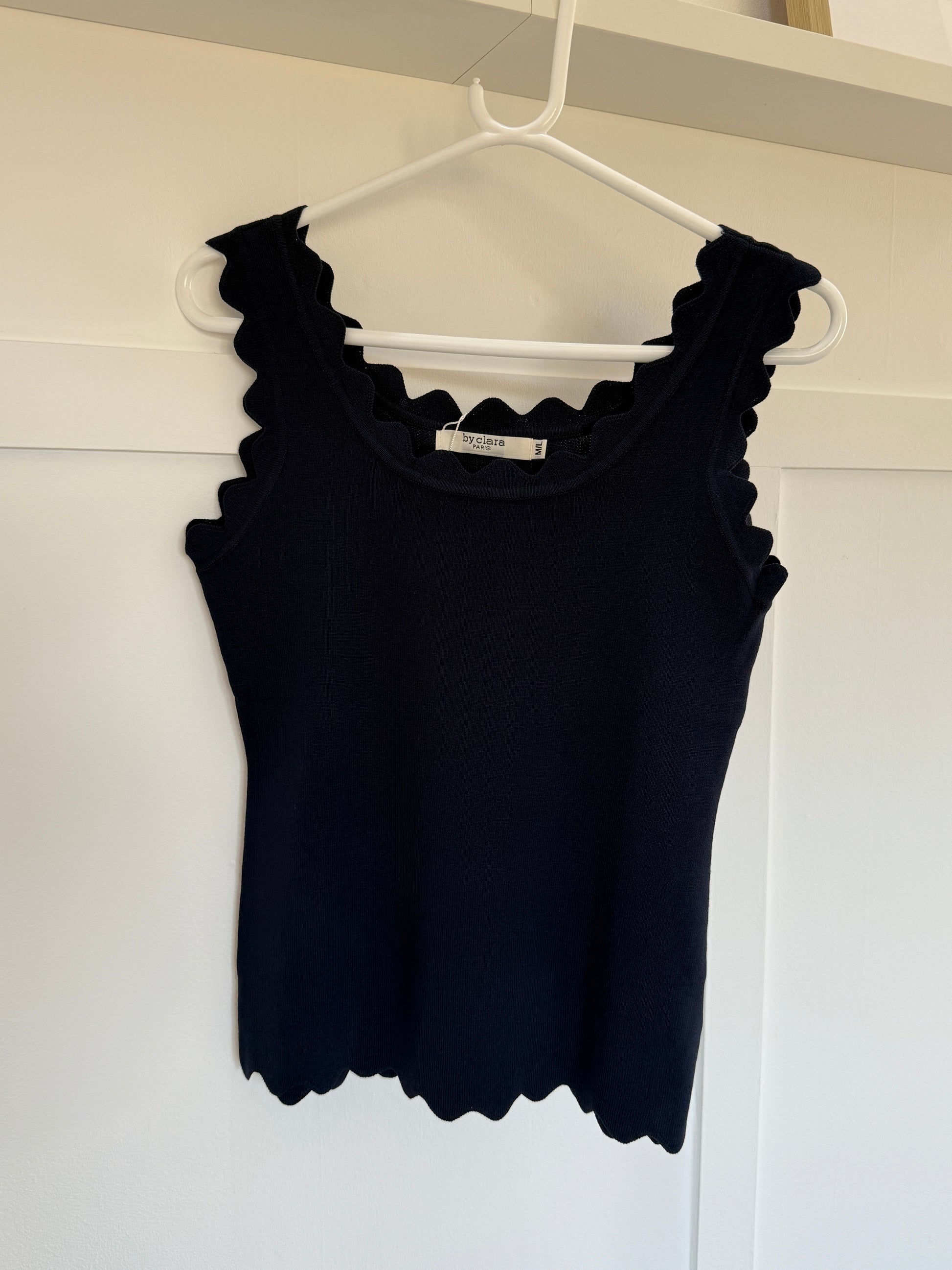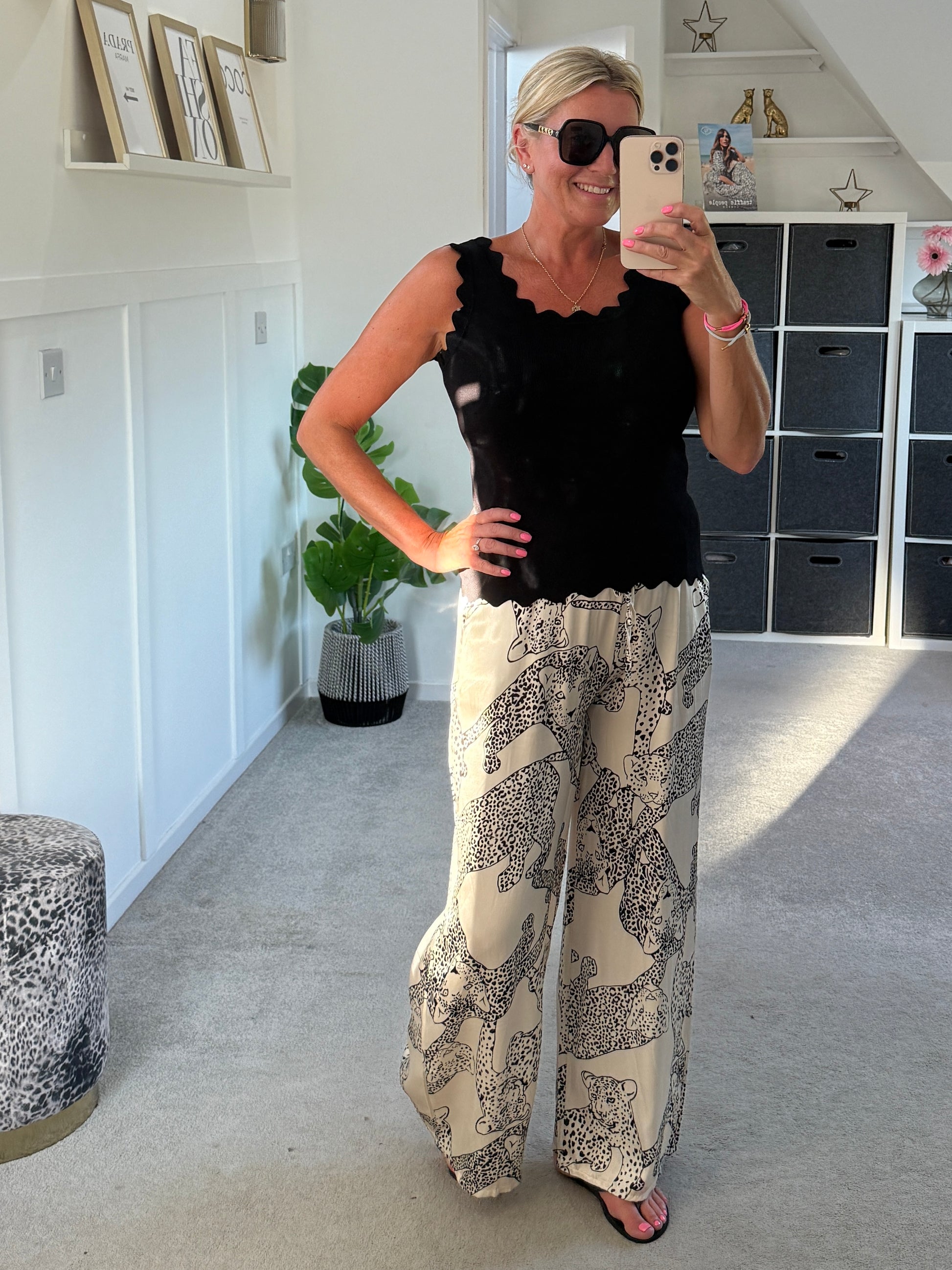 A wardrobe staple with a twist. This lightweight knitted vest top features delicate scallop edging along the neckline and hem. The soft stretch knit hugs the body for a flattering, comfortable fit. A perfect top for mixing and matching with maxi skirts and floaty trousers. Sizes: S/M (UK 8–12), M/L (UK 12–16)