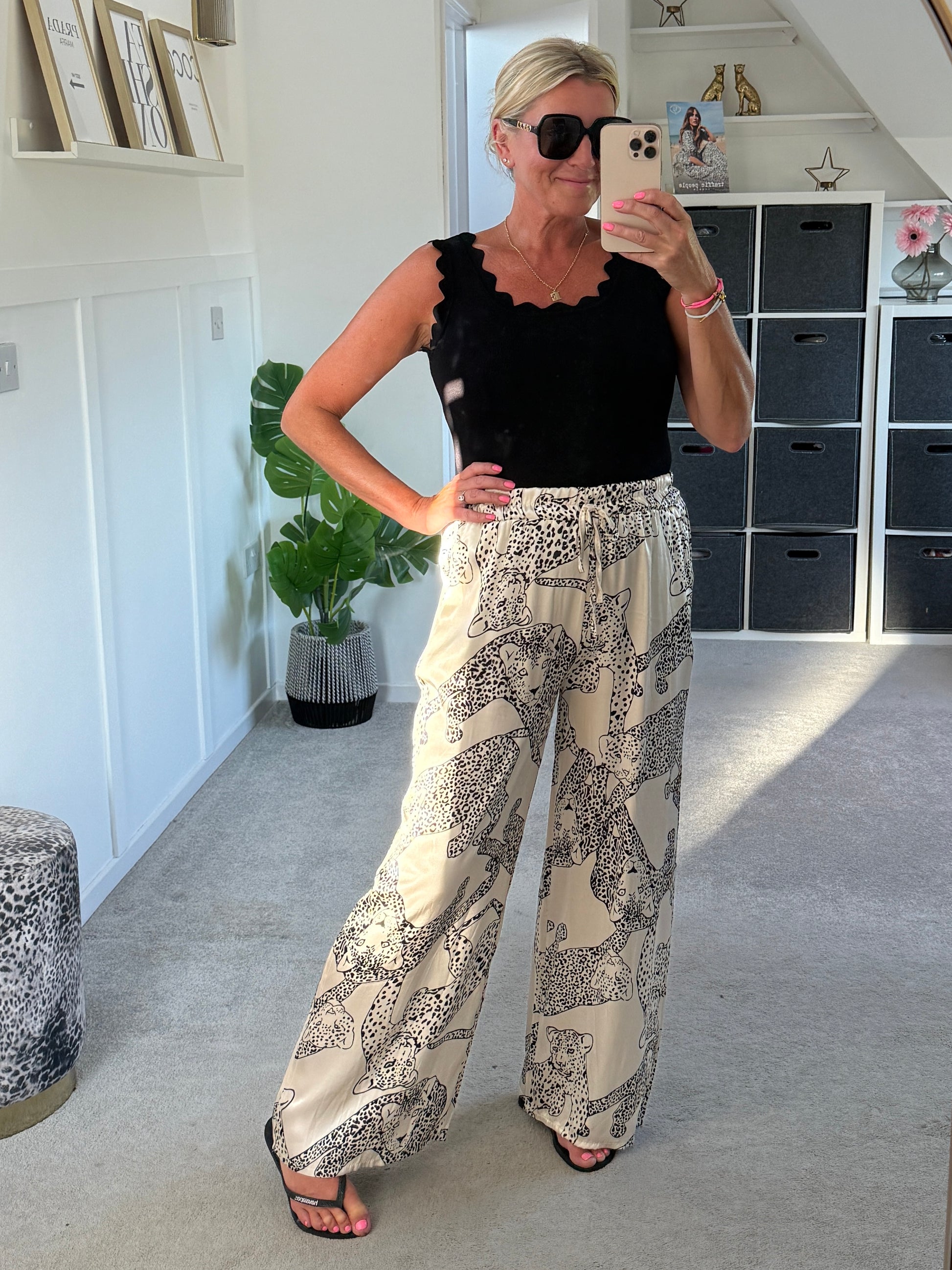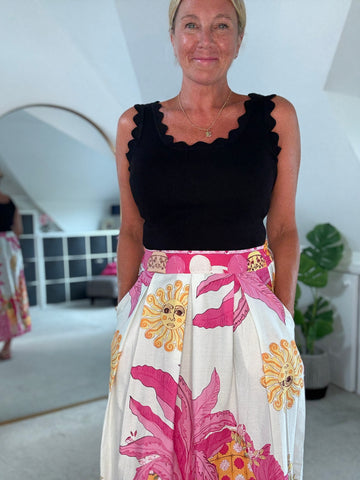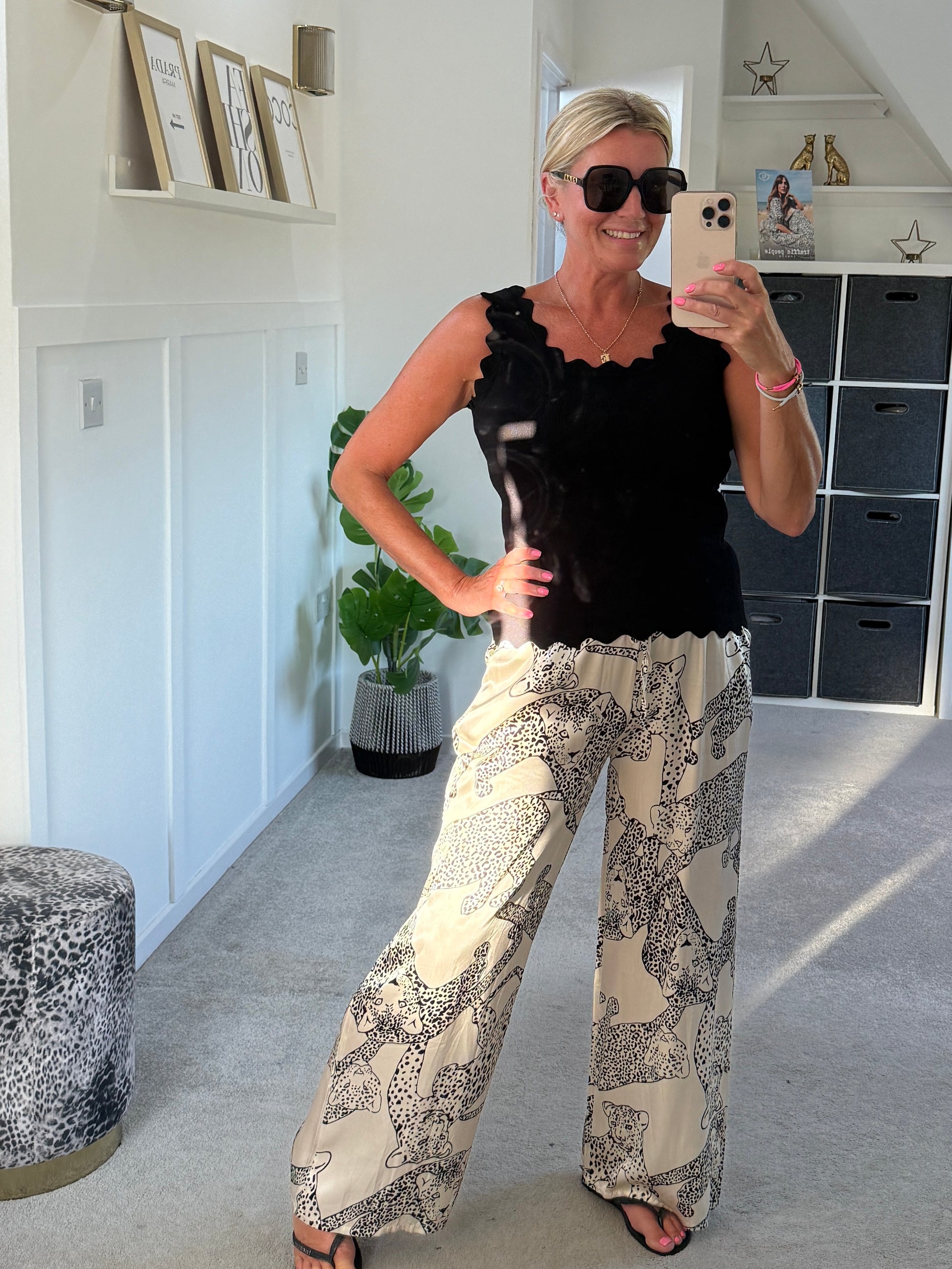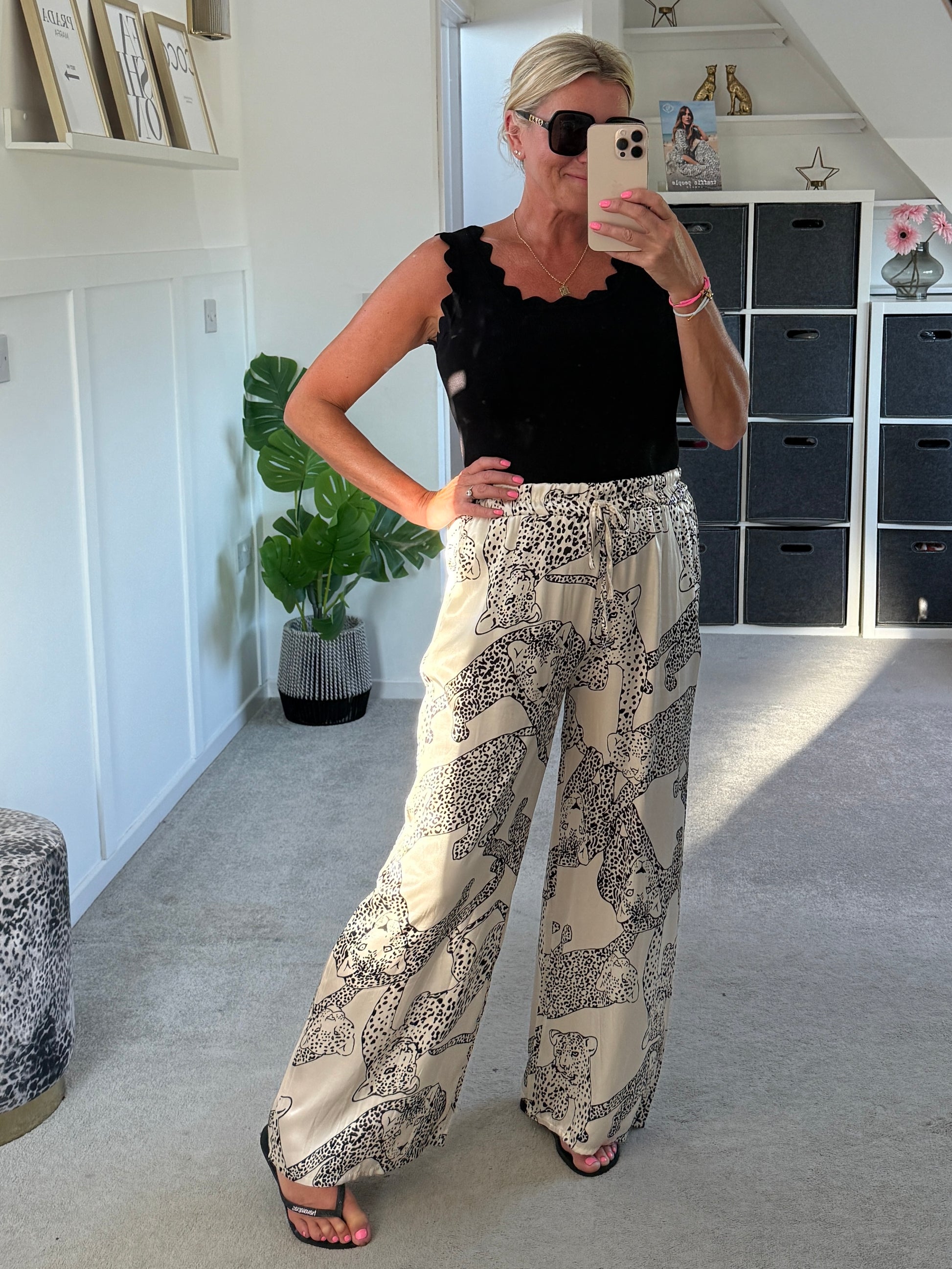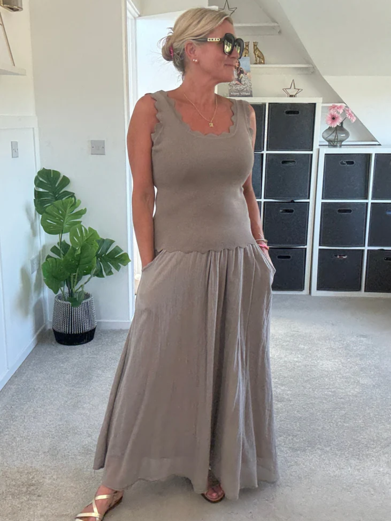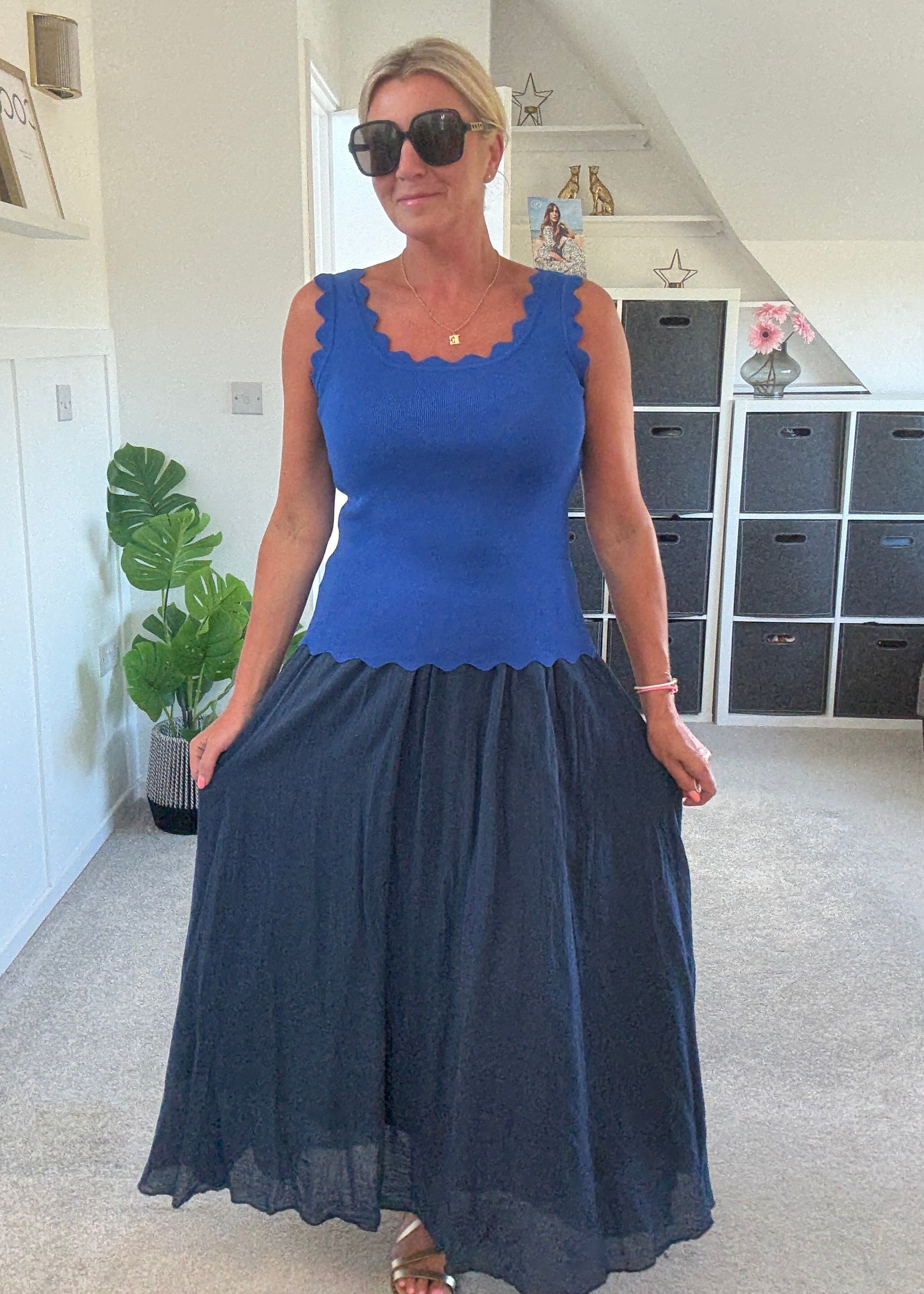 A wardrobe staple with a twist. This lightweight knitted vest top features delicate scallop edging along the neckline and hem. The soft stretch knit hugs the body for a flattering, comfortable fit. A perfect top for mixing and matching with maxi skirts and floaty trousers. Sizes: S/M (UK 8–12), M/L (UK 12–16)