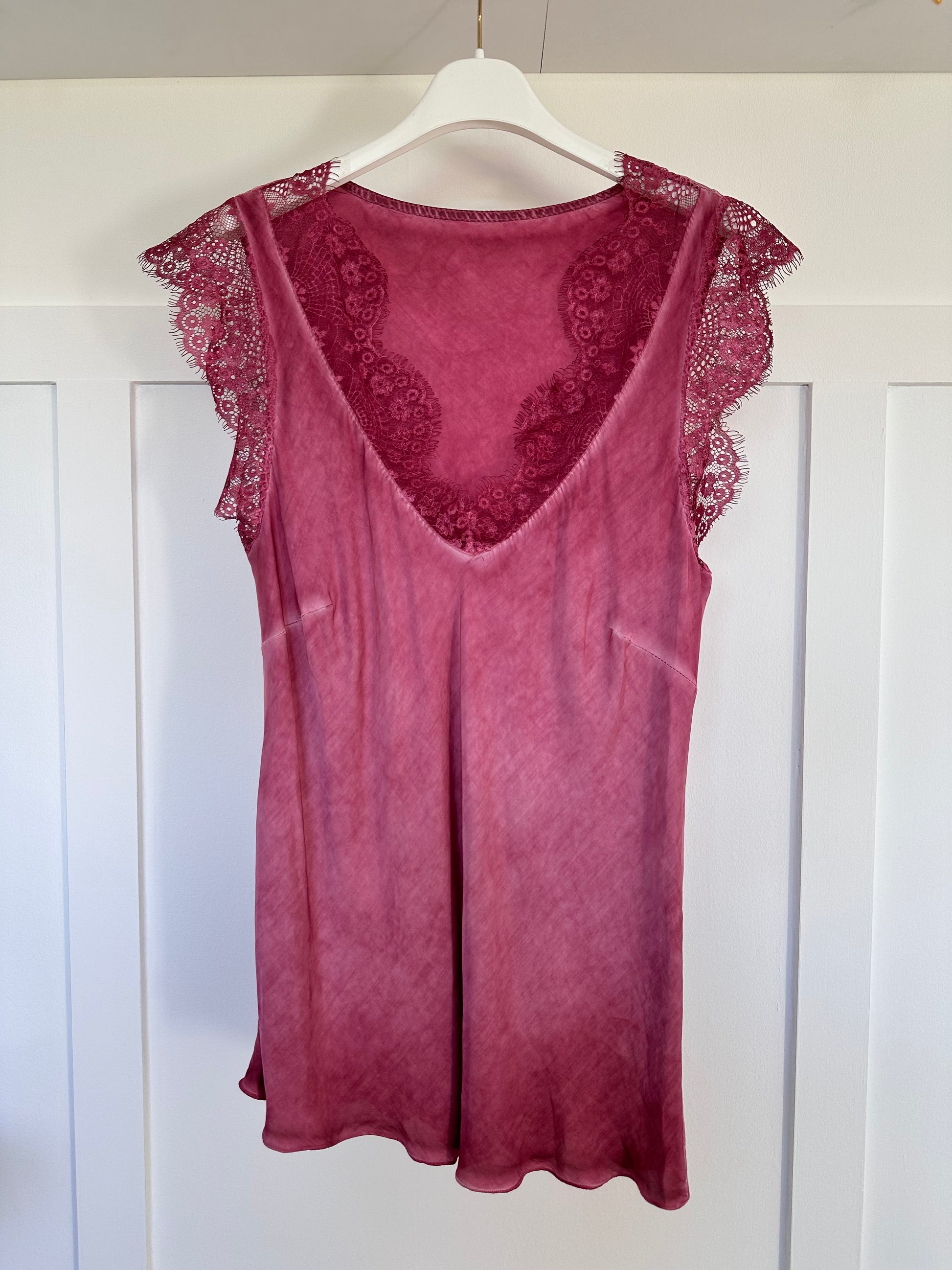 Beautiful satin feel lace v neck top. It’s so lovely the way it falls with a slight flare to it and super flattering skimming over the tummy area. Tuck in or out and mix and match with the silkie slip skirts or with jeans, heels and a blazer for an evening out or dress down with jeans, trainers and a cardigan.