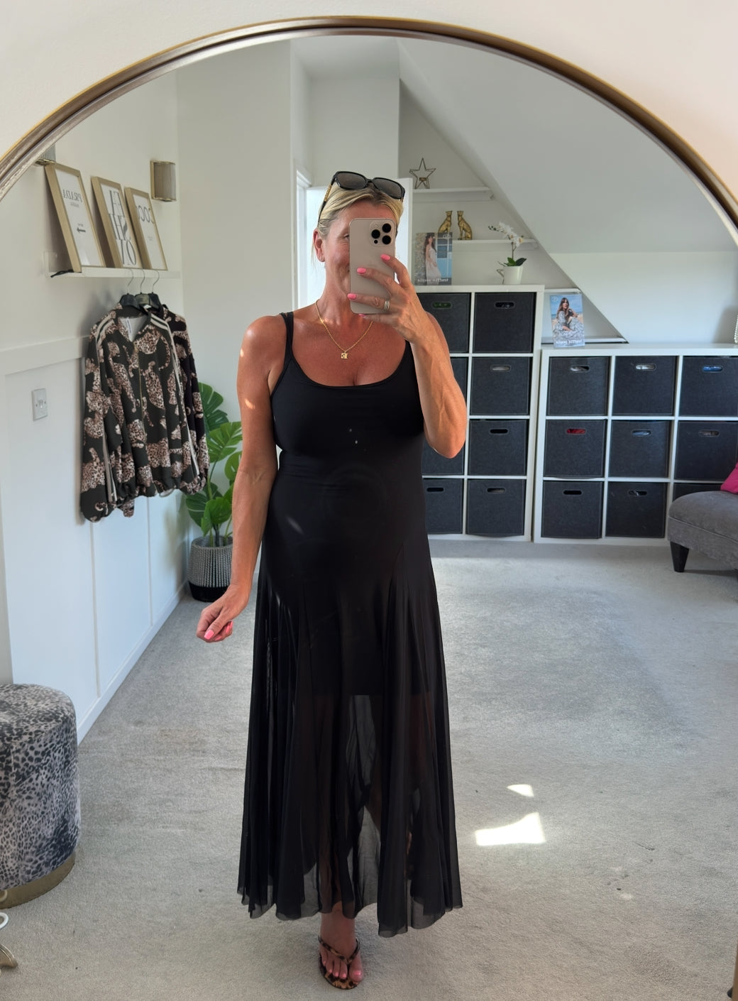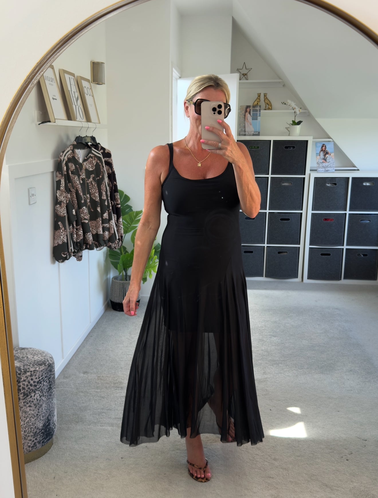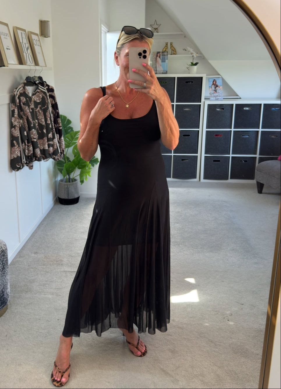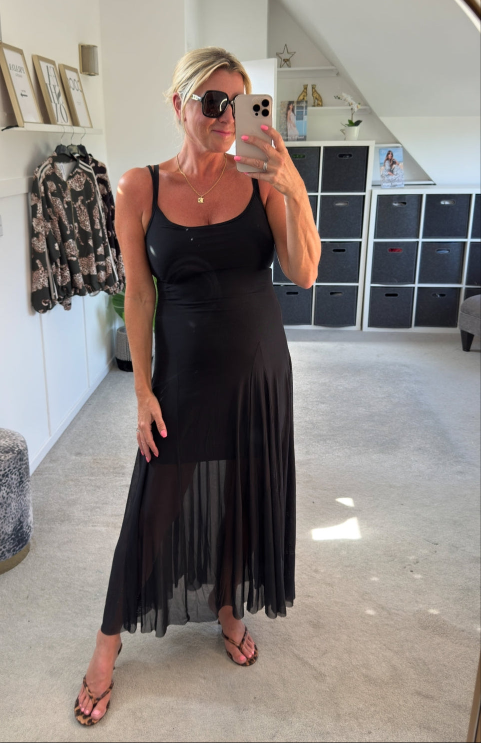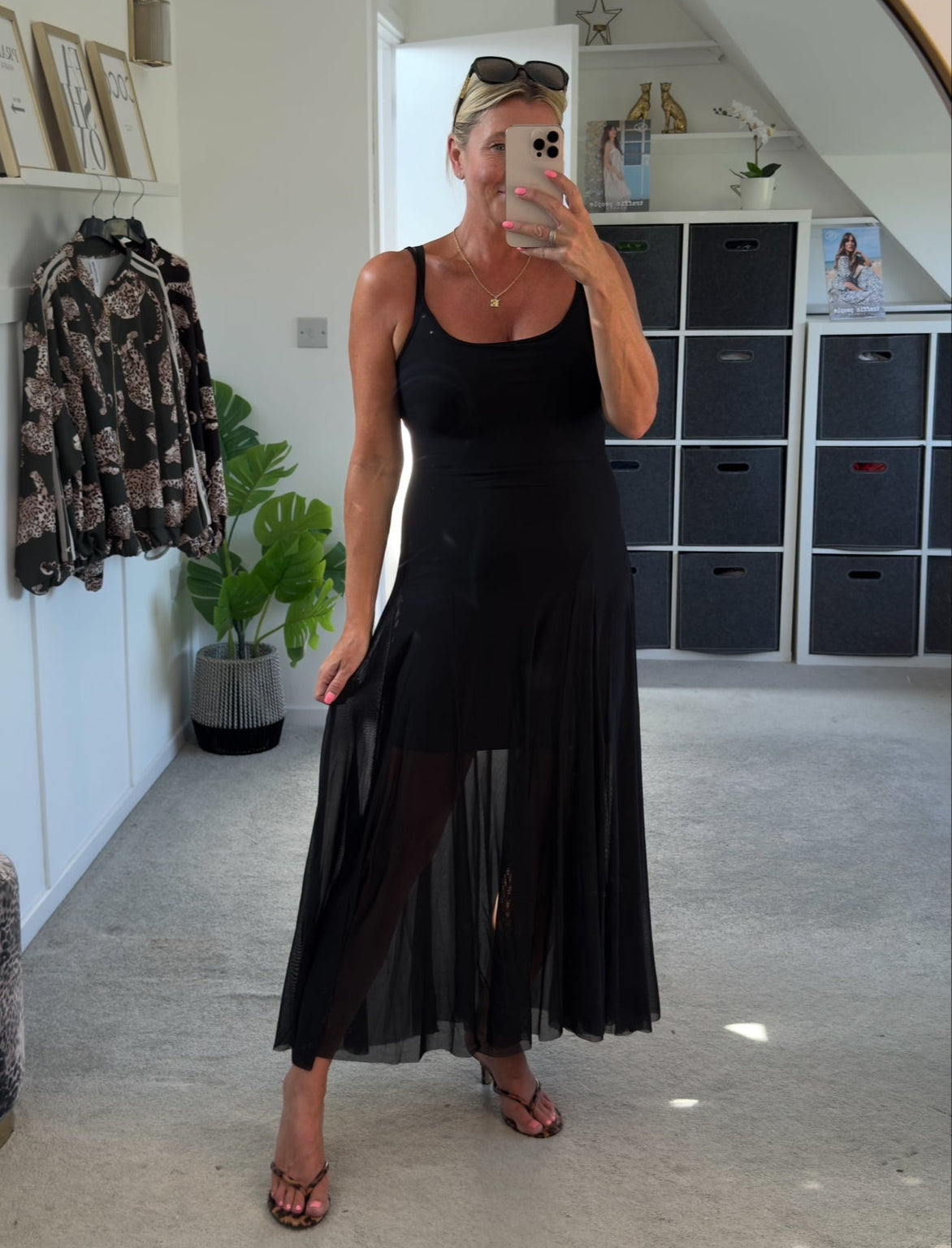 Effortless and edgy, this stretchy mesh maxi dress features a fitted dress underneath and has a gorgeous swishy skirt. It also has adjustable straps. Perfect solo with heals or sandals, or dressed down with an oversized jumper, cardigan or denim/leather jacket and trainers/boots....more pics to follow styling with knitwear
