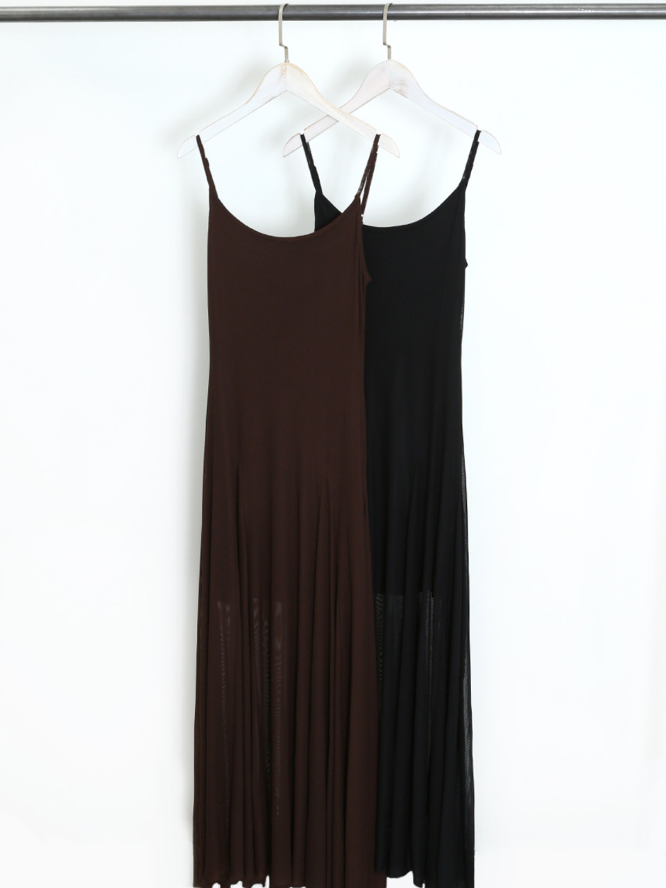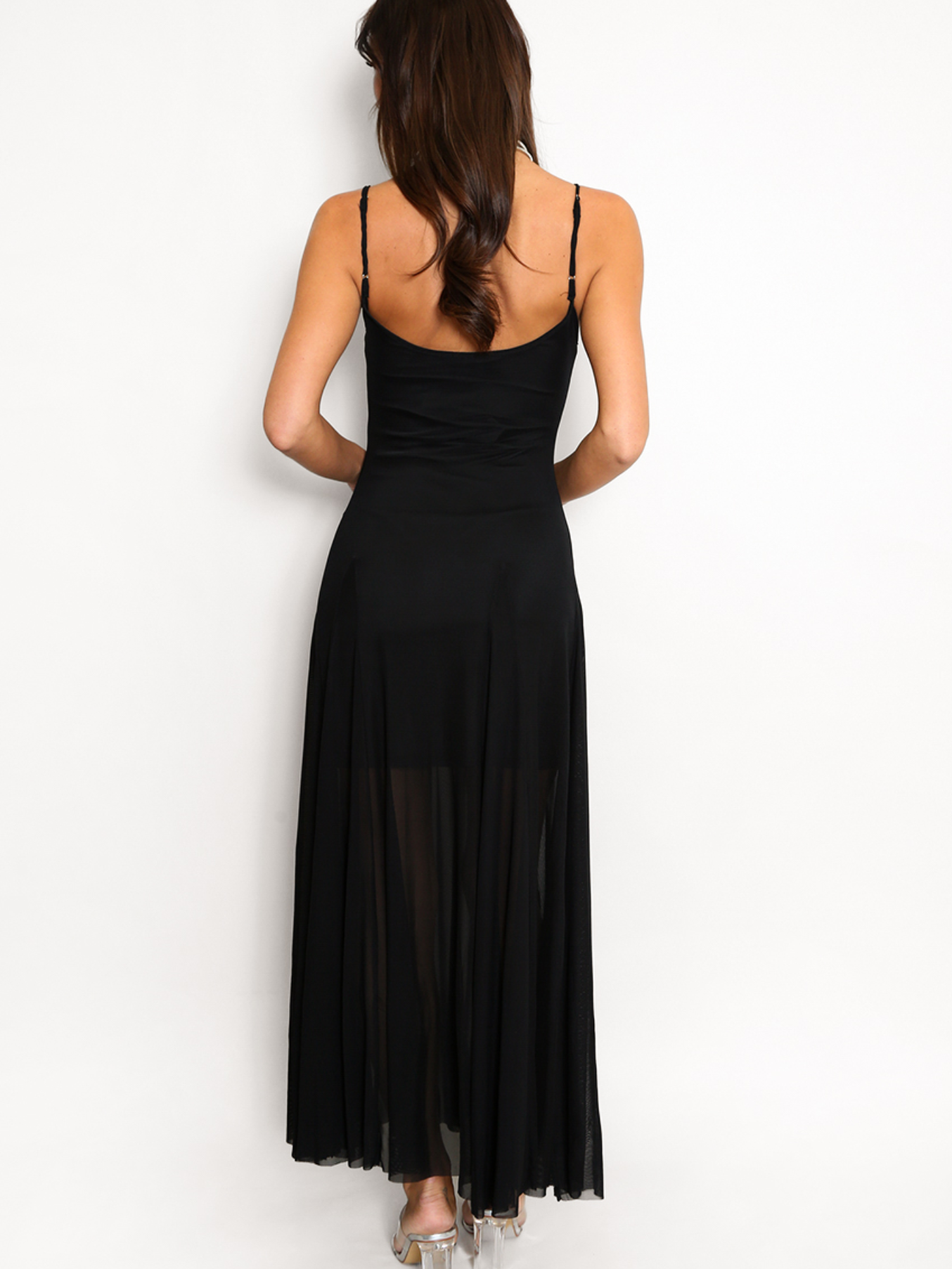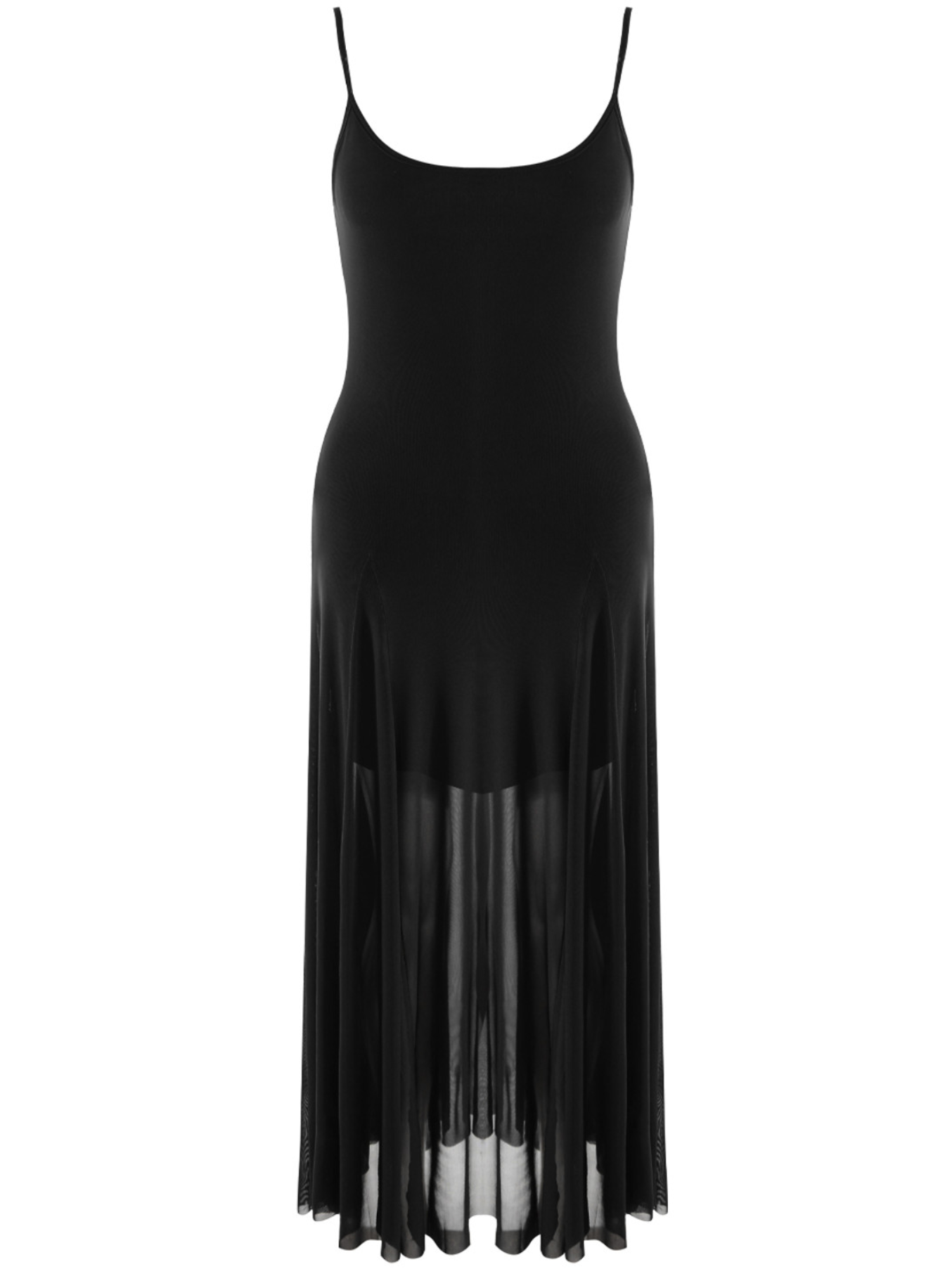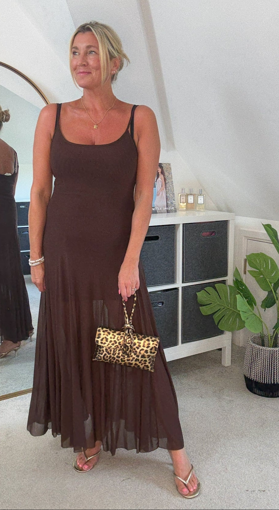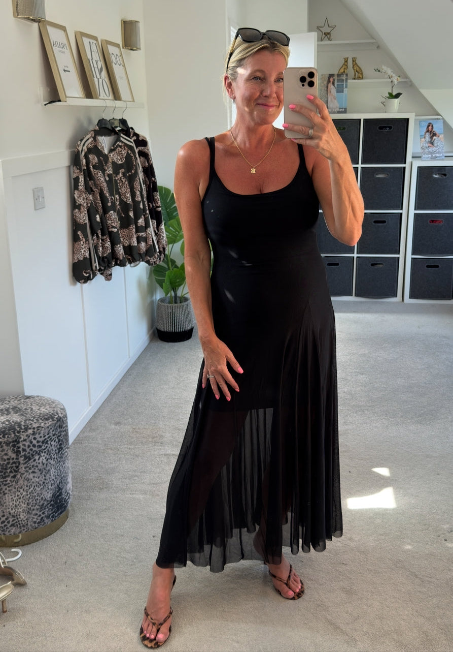 Effortless and edgy, this stretchy mesh maxi dress features a fitted dress underneath and has a gorgeous swishy skirt. It also has adjustable straps. Perfect solo with heals or sandals, or dressed down with an oversized jumper, cardigan or denim/leather jacket and trainers/boots....more pics to follow styling with knitwear