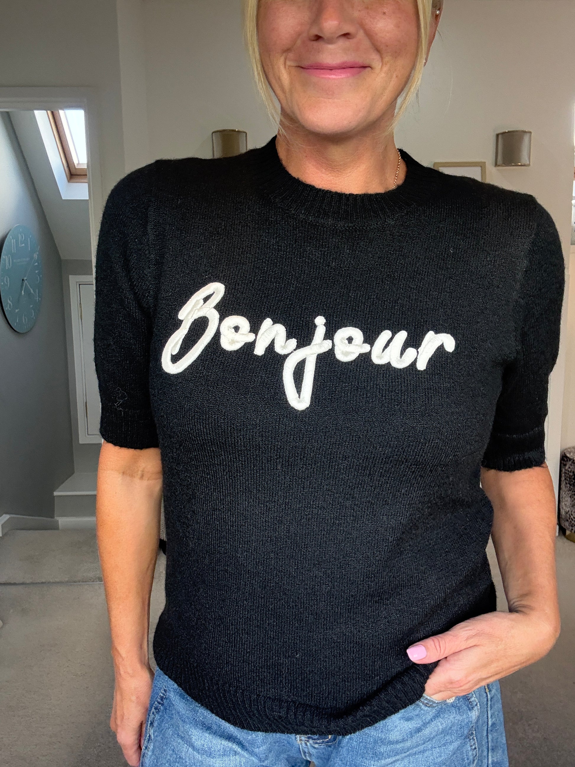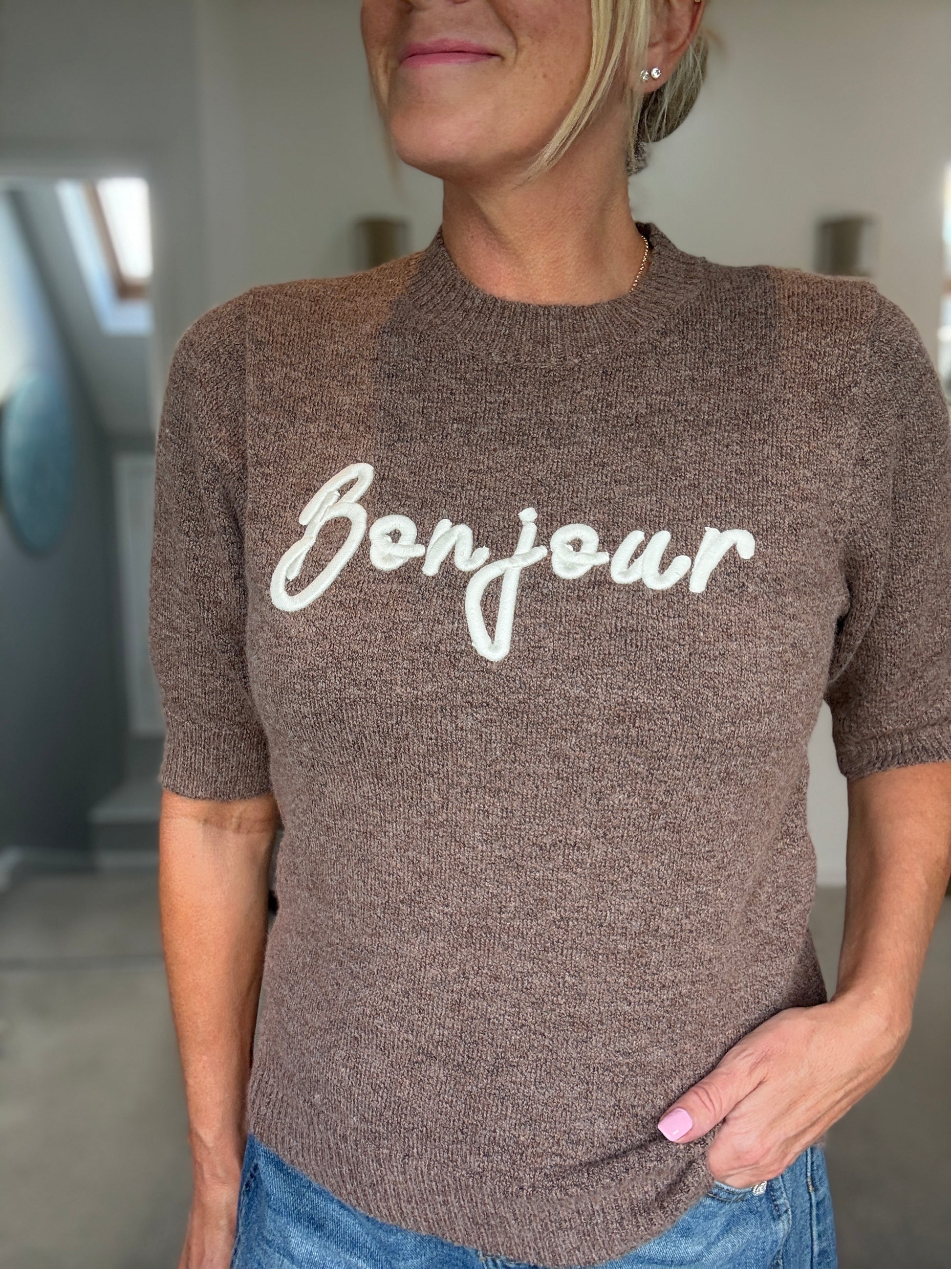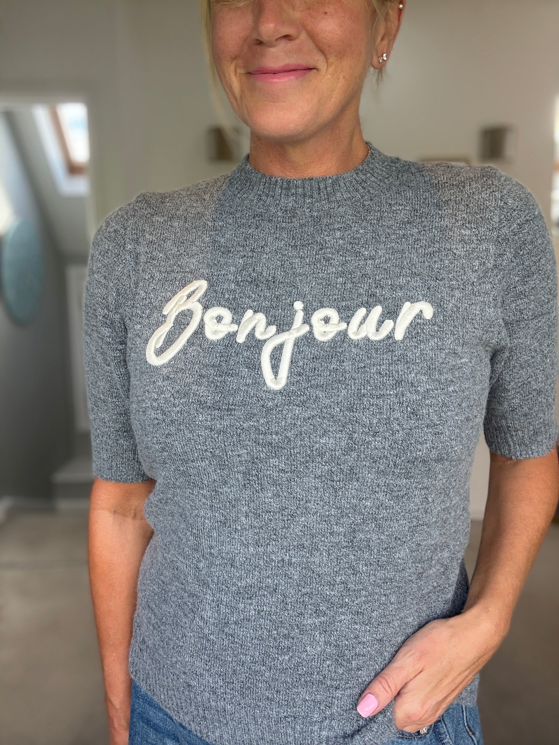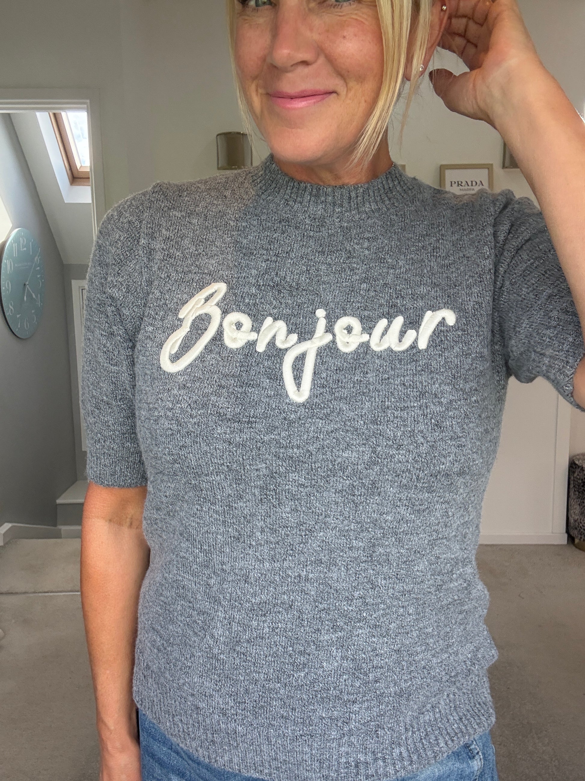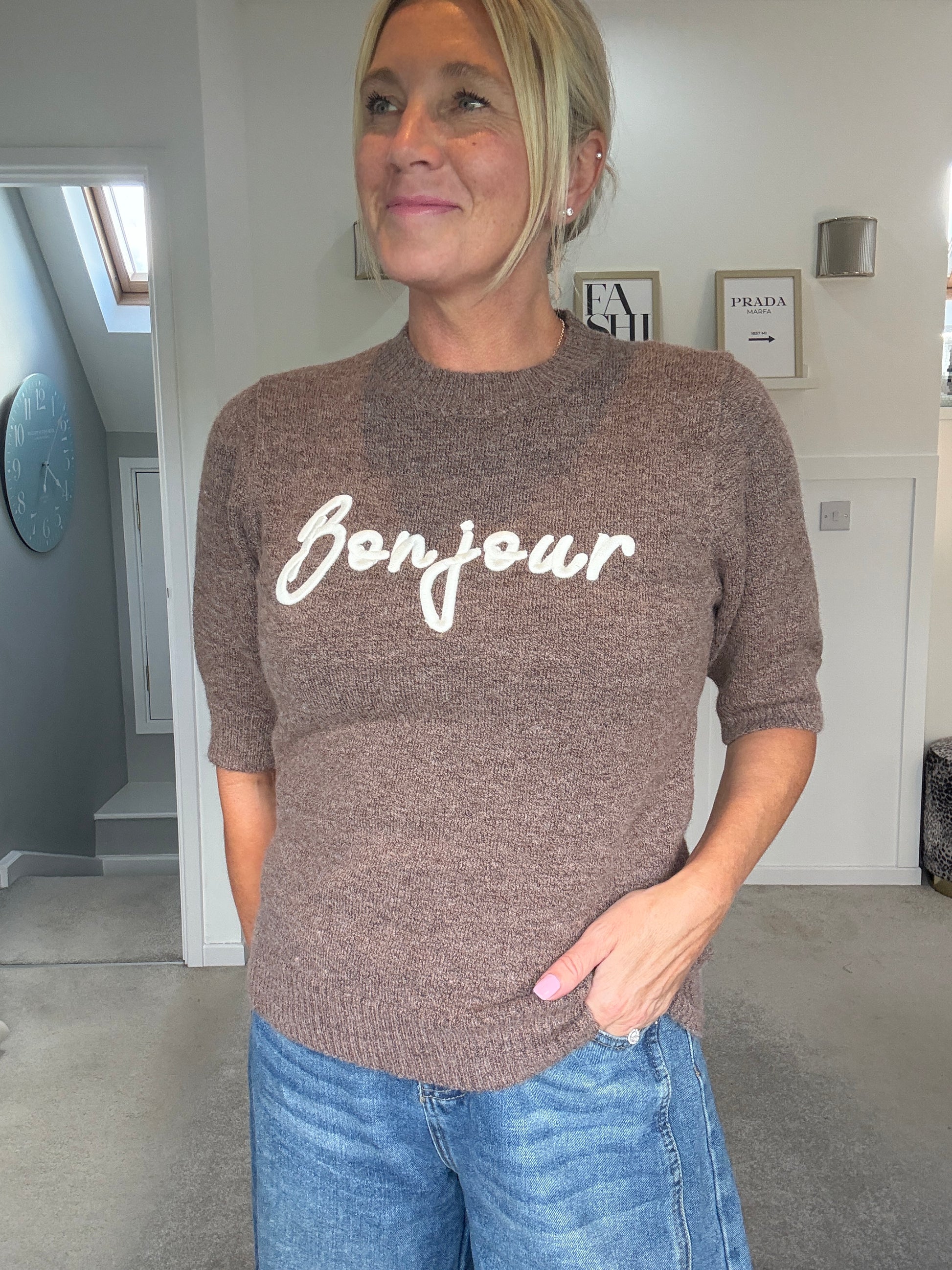 Cute short sleeve "Bonjour" jumper available in black, grey and mocha. Fab teamed witgh jeans and trainers, layer up with the Manny bomber jacket!