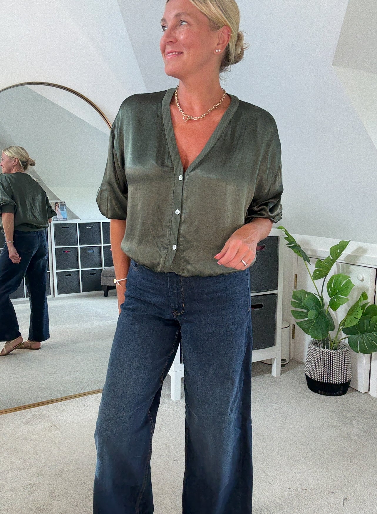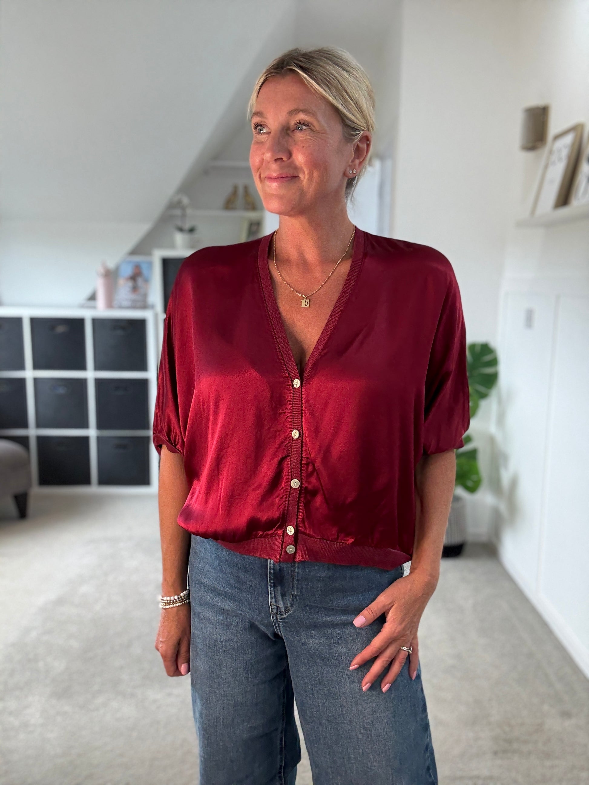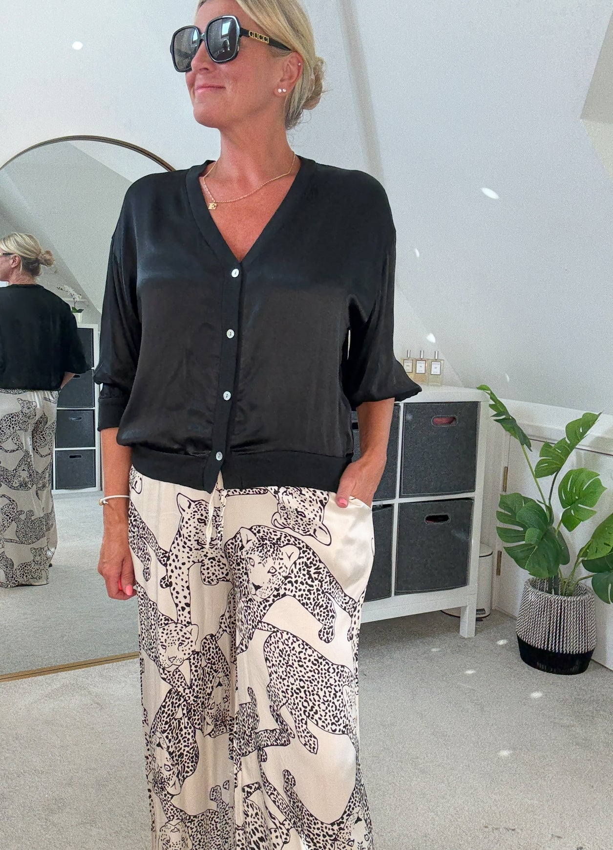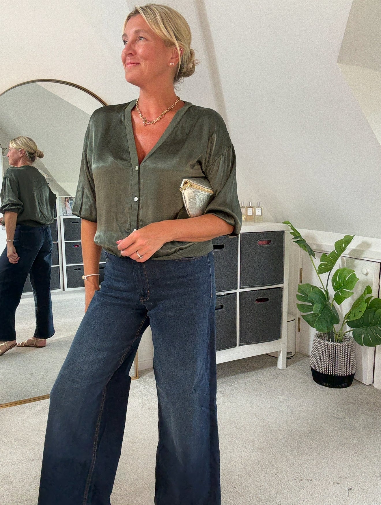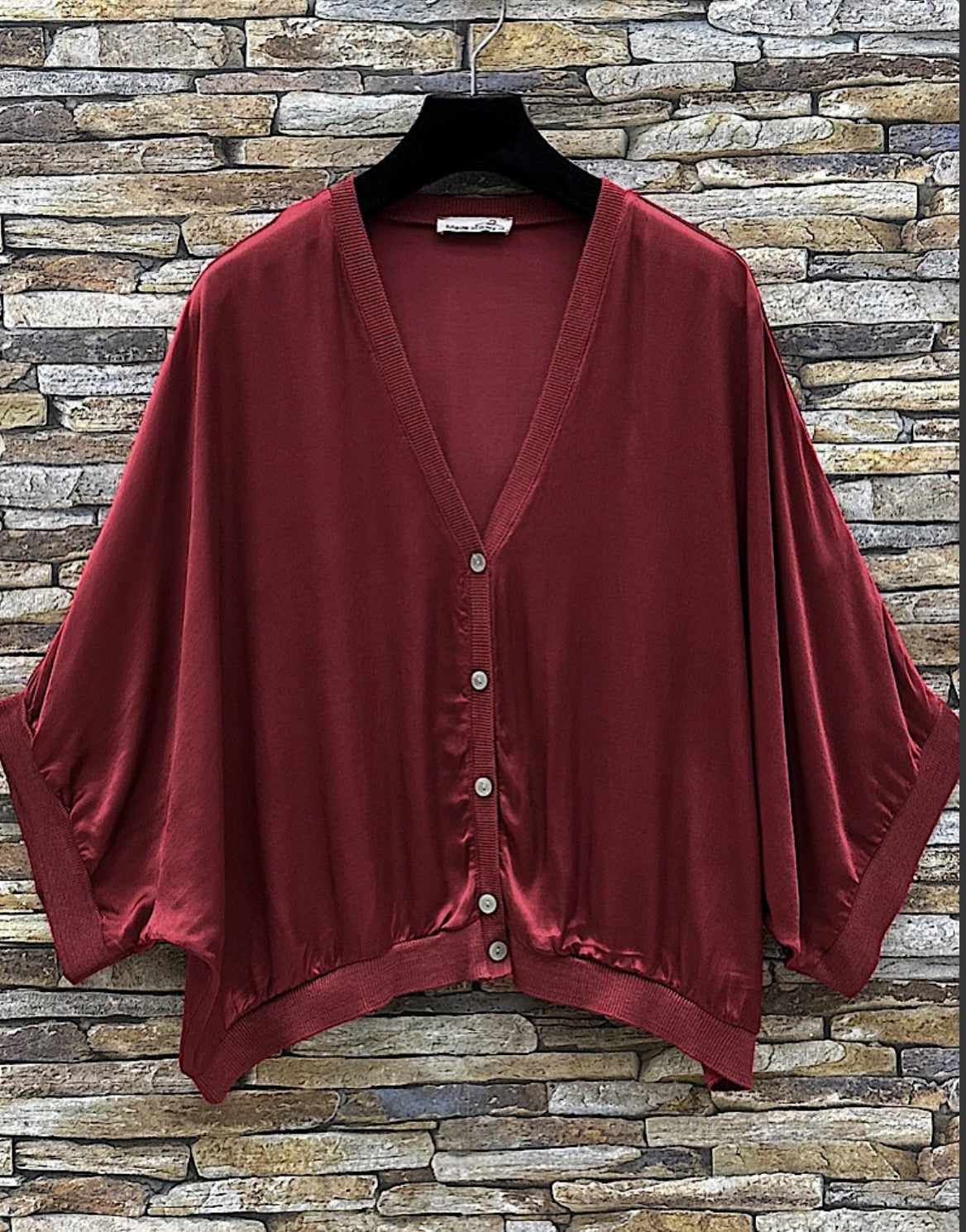 Super stylish cardi/jacket. Made from soft, silky/satin viscose, it drapes beautifully with a relaxed fit that layers effortlessly. Button it up and wear as a standout top over a cami, or leave it open over a Tee or for an easy, laid-back vibe.