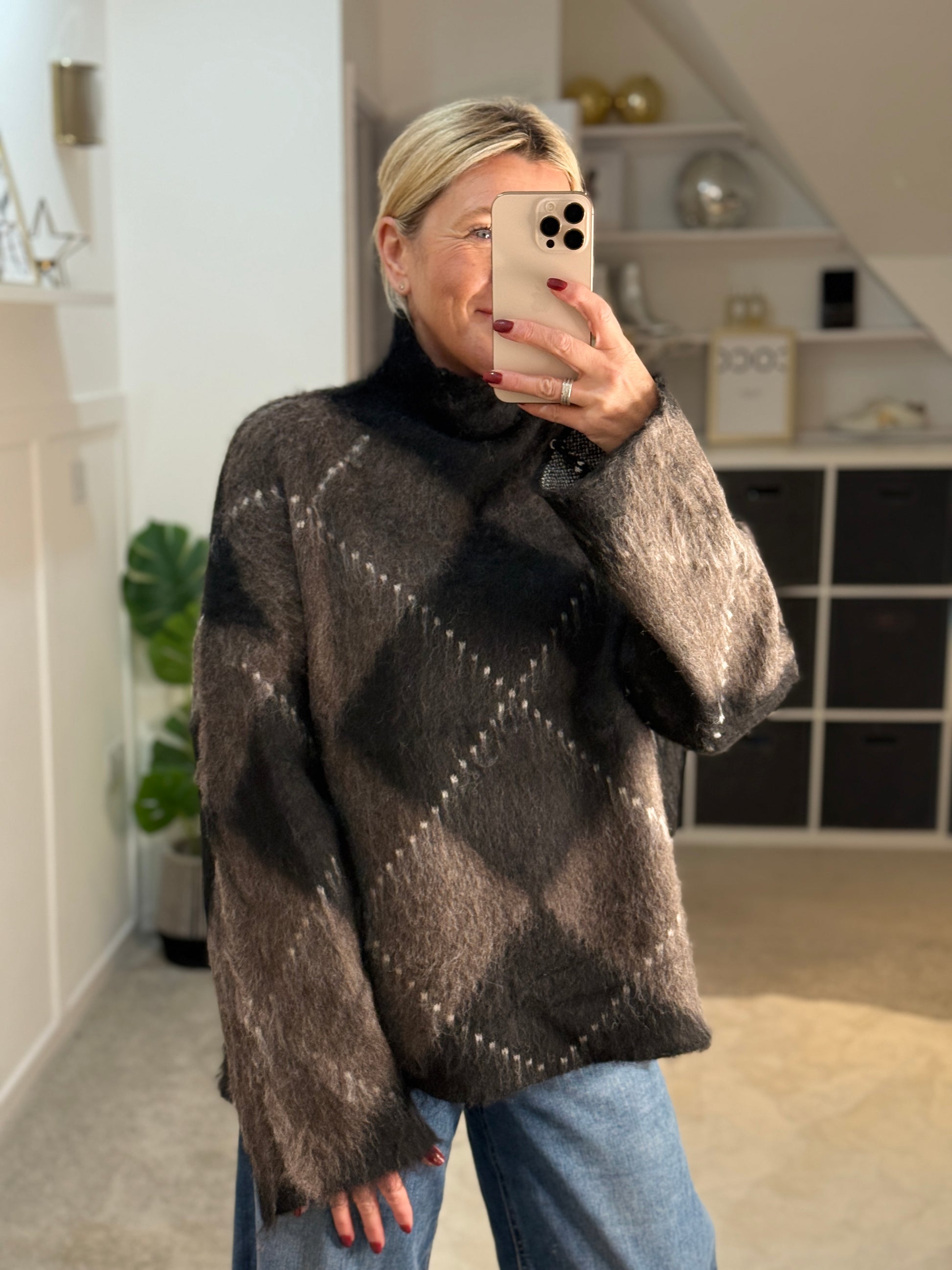 Made from a super soft fluffy knit, it features a modern take on the classic Argyle pattern, with funnel neck, slightly flared sleeves and longer length.