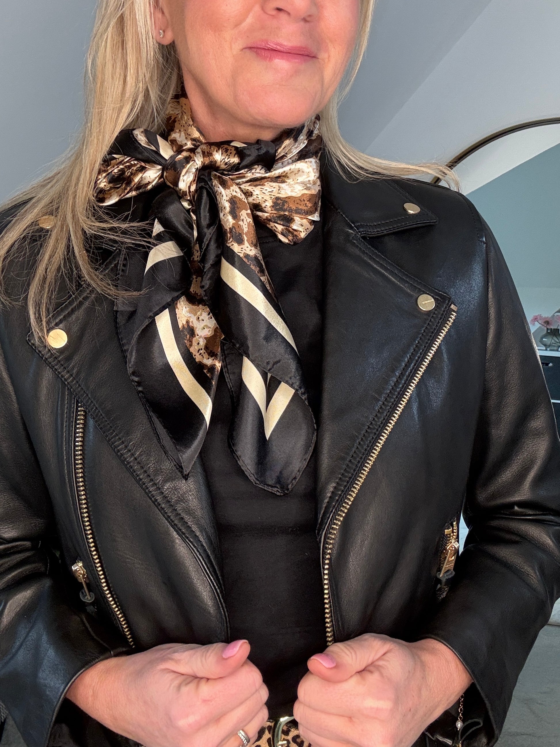 The scarf can be worn around the neck, in your ponytail, as a headband or tie to your bag or wrist for a very fashion forward look.