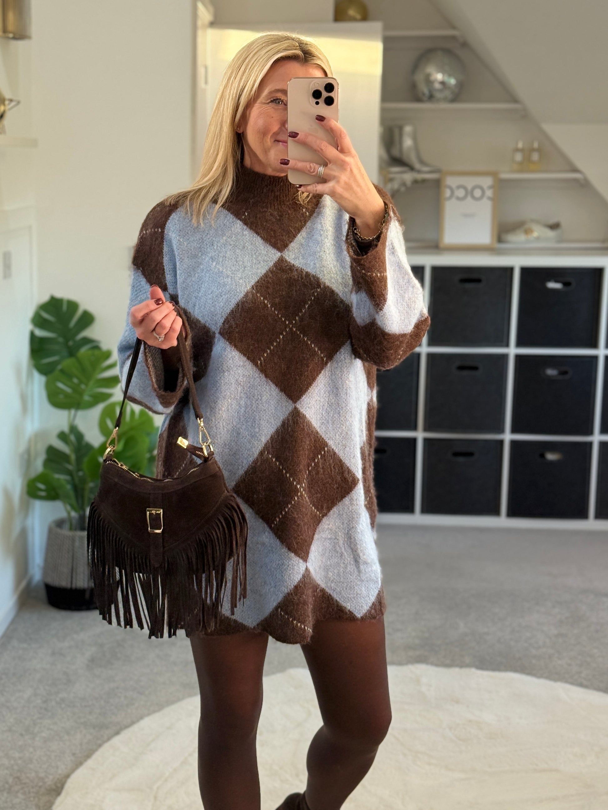 Brown/Blue Argyle Funnel Neck Jumper Dress