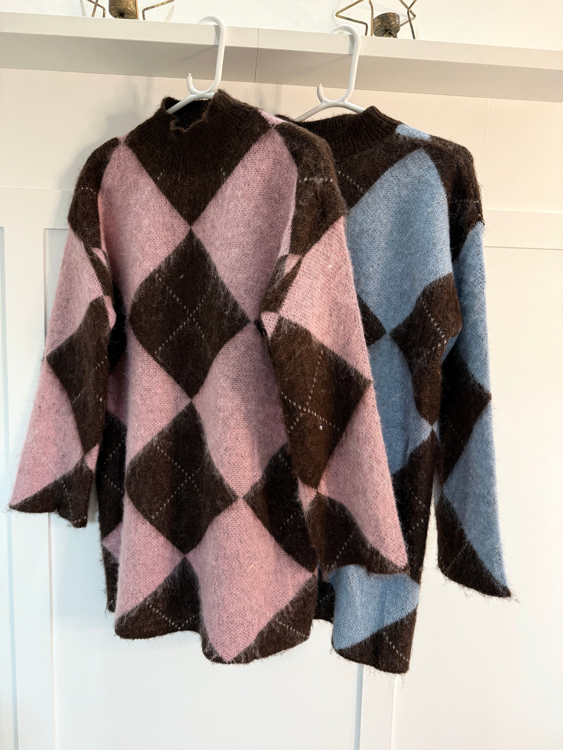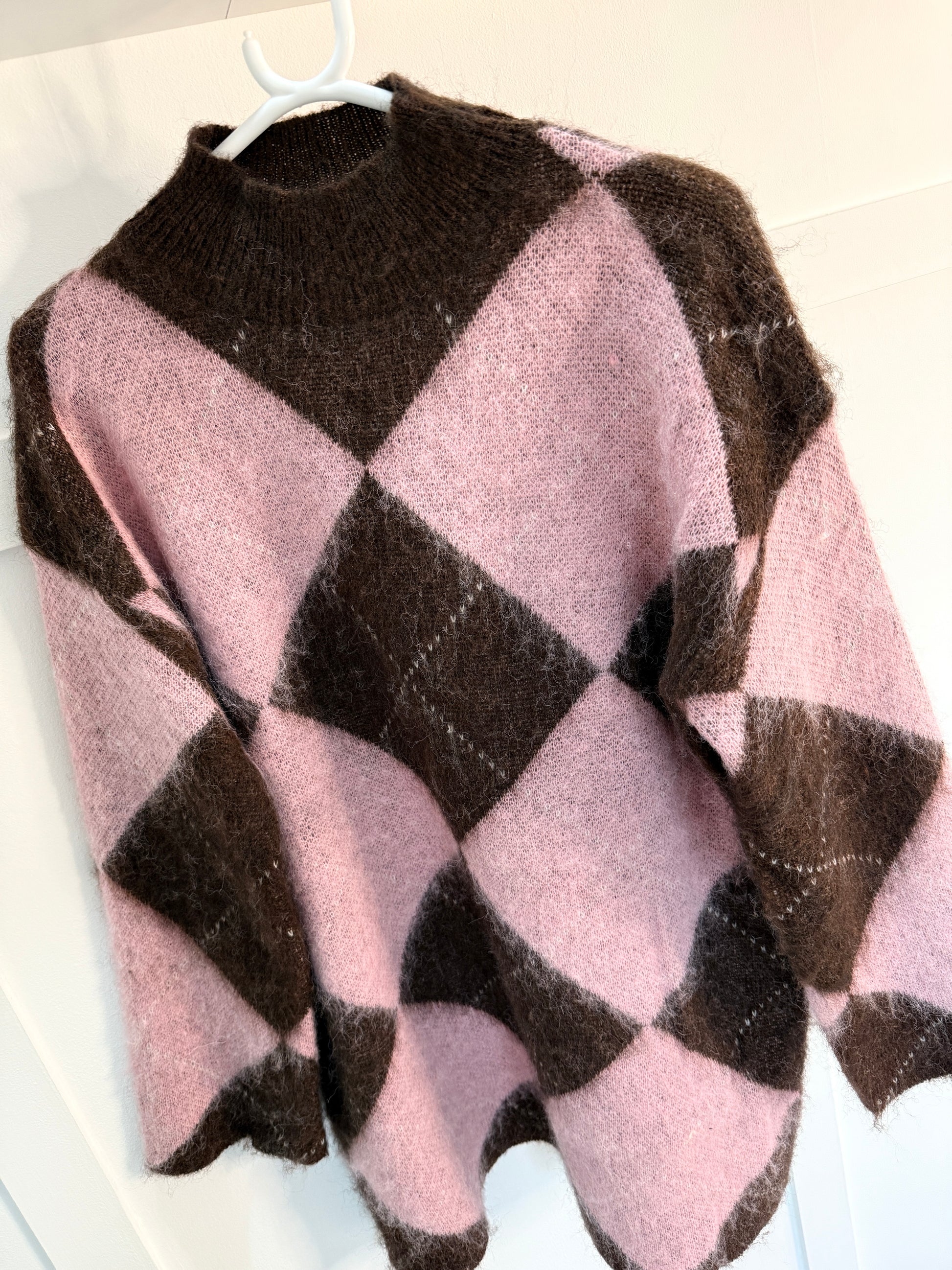 Made from a super soft fluffy knit, it features a modern take on the classic Argyle pattern, with funnel neck, slightly flared sleeves and mini length.