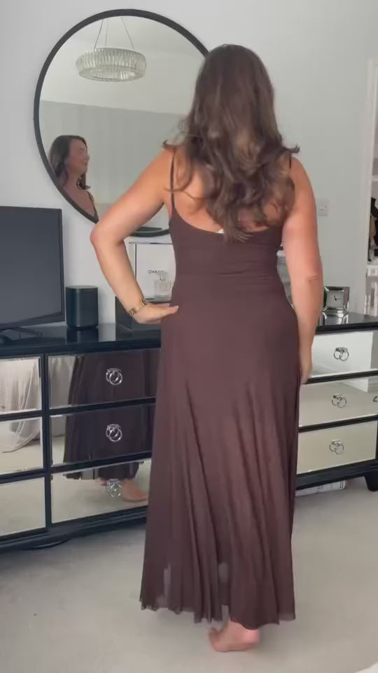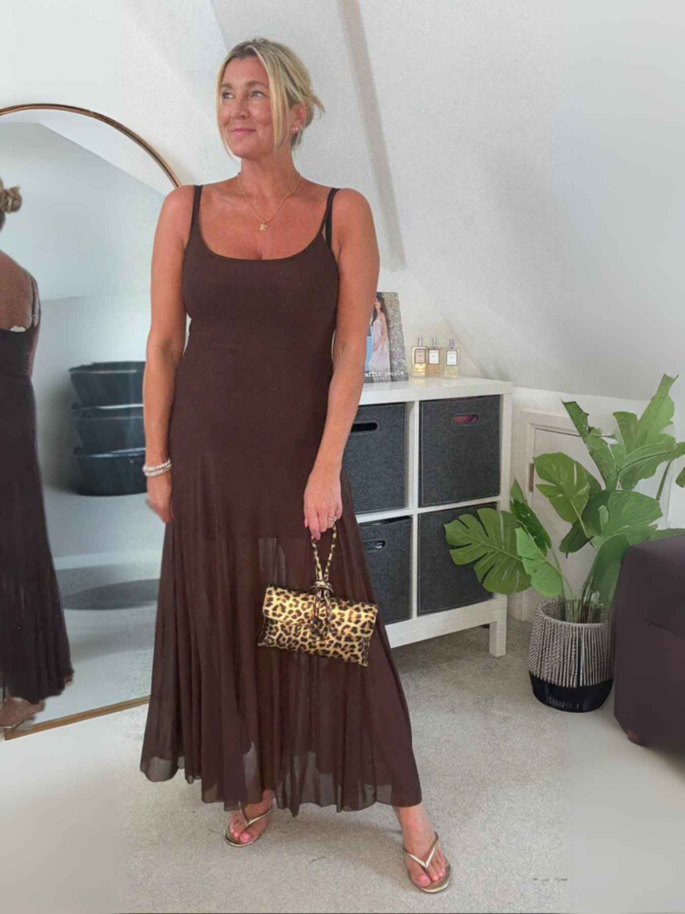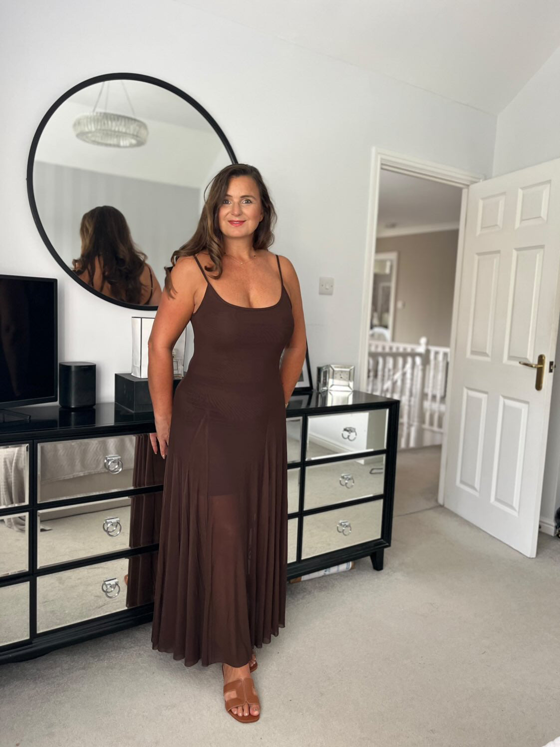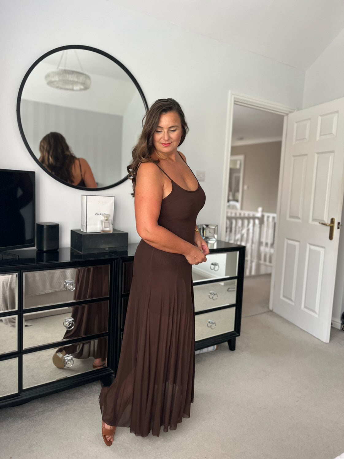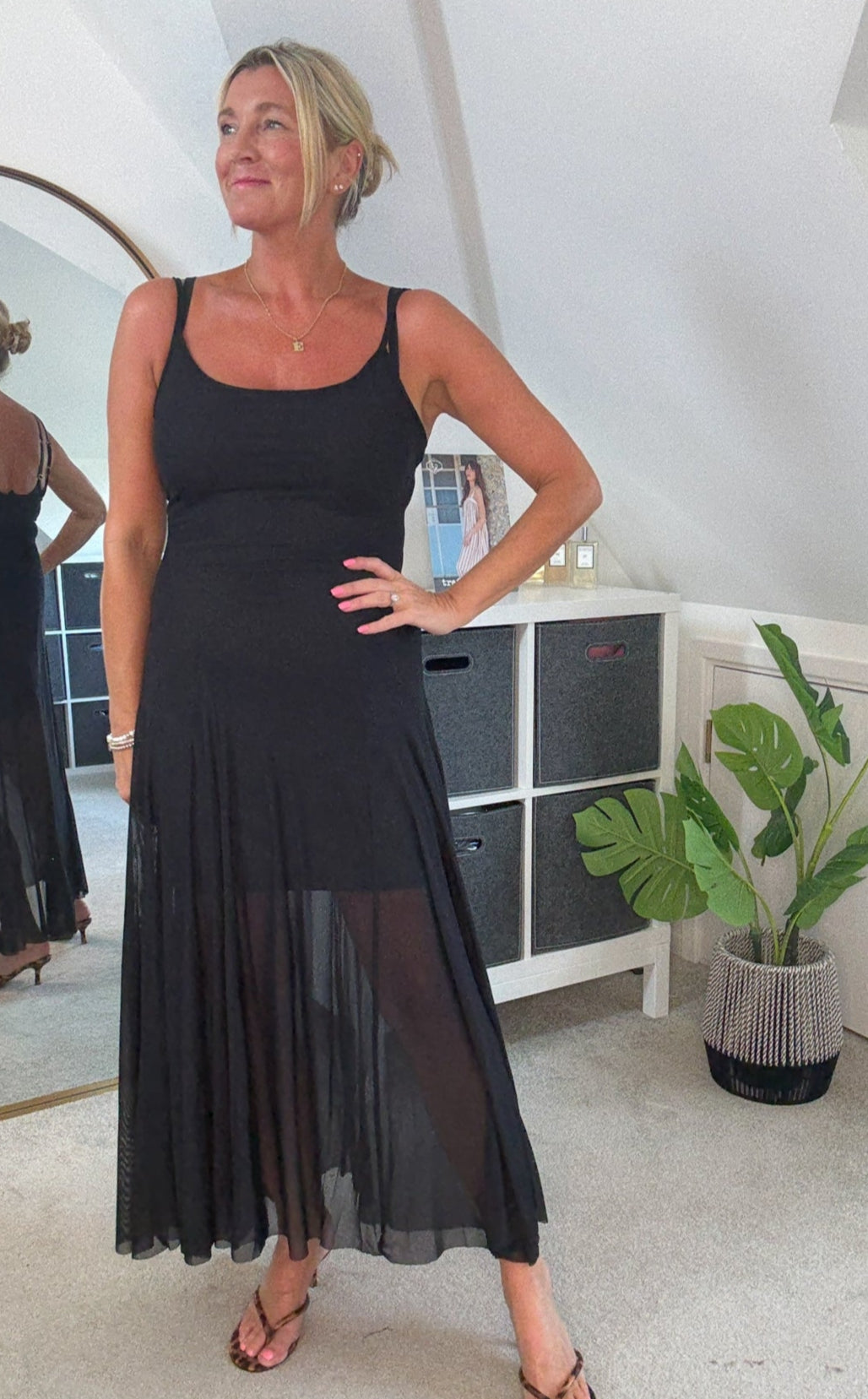 Effortless and edgy, this stretchy mesh maxi dress features a fitted dress underneath and has a gorgeous swishy skirt. It also has adjustable straps. Perfect solo with heals or sandals, or dressed down with an oversized jumper, cardigan or denim/leather jacket and trainers/boots....more pics to follow styling with knitwear aswell