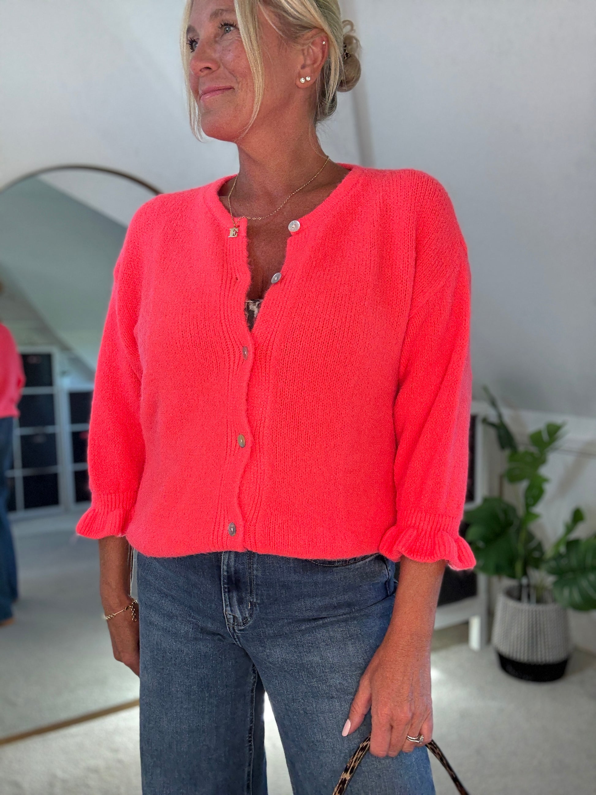Super lovely alpaca mix fluffy frill sleeve cardigan. So cute with the frill sleeve detail on the sleeves. A nice one size fit and looks great style with the new barrel leg jeans. Such a gorgeous colour.