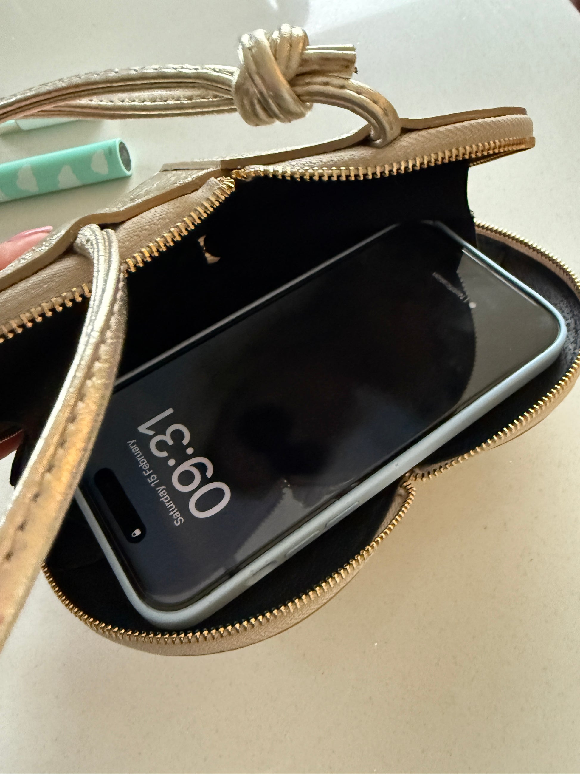 Showing that an Iphone max fits neatly across the top with lippy and keys at the bottom!