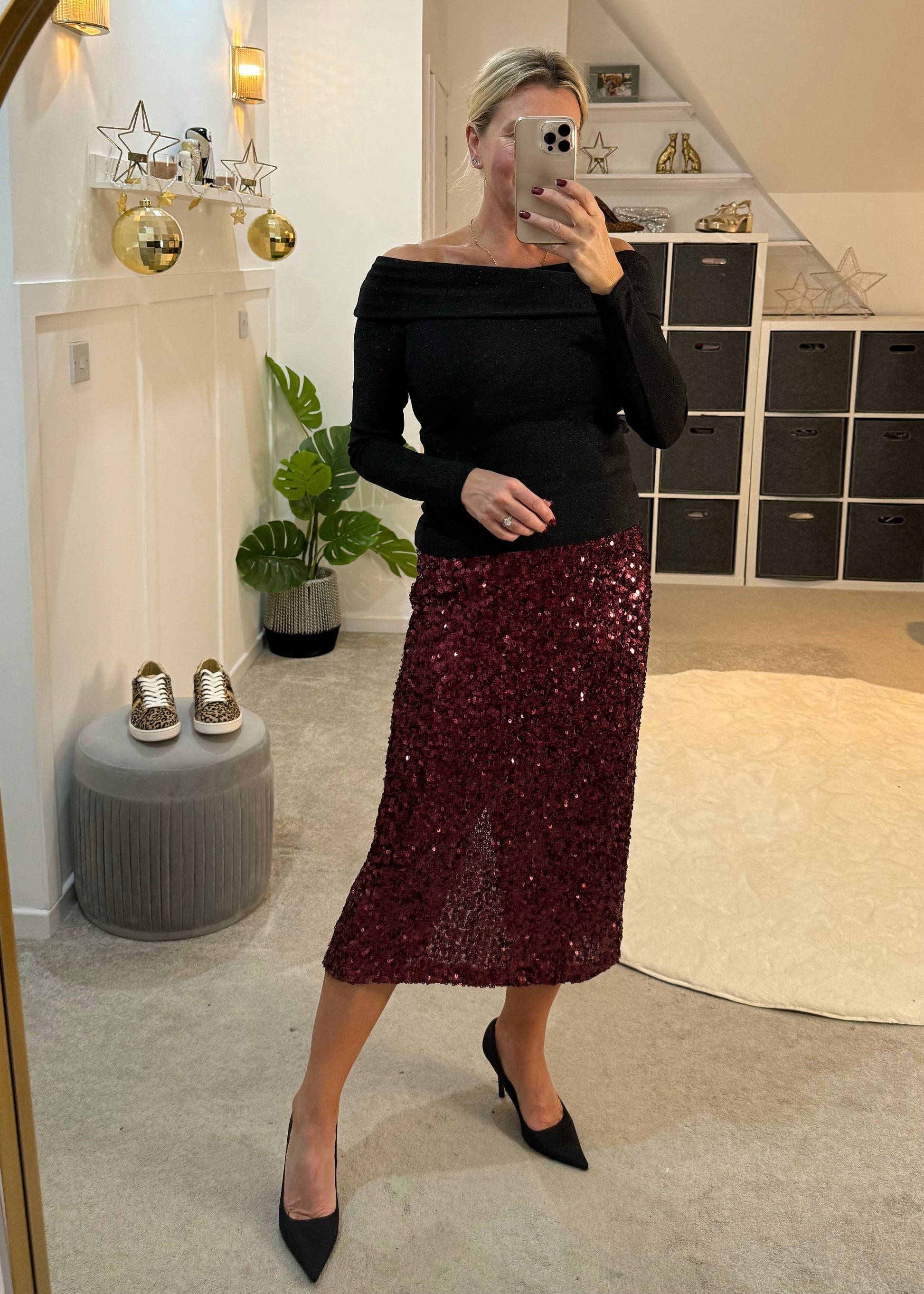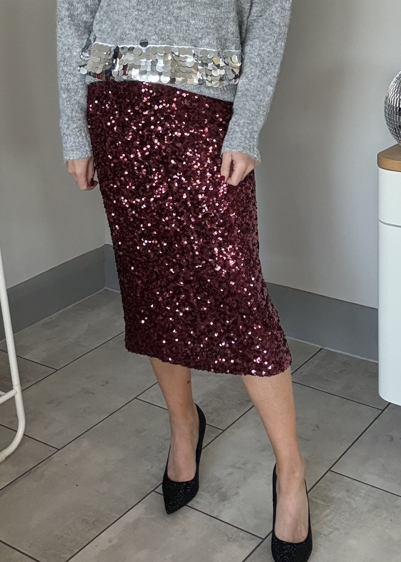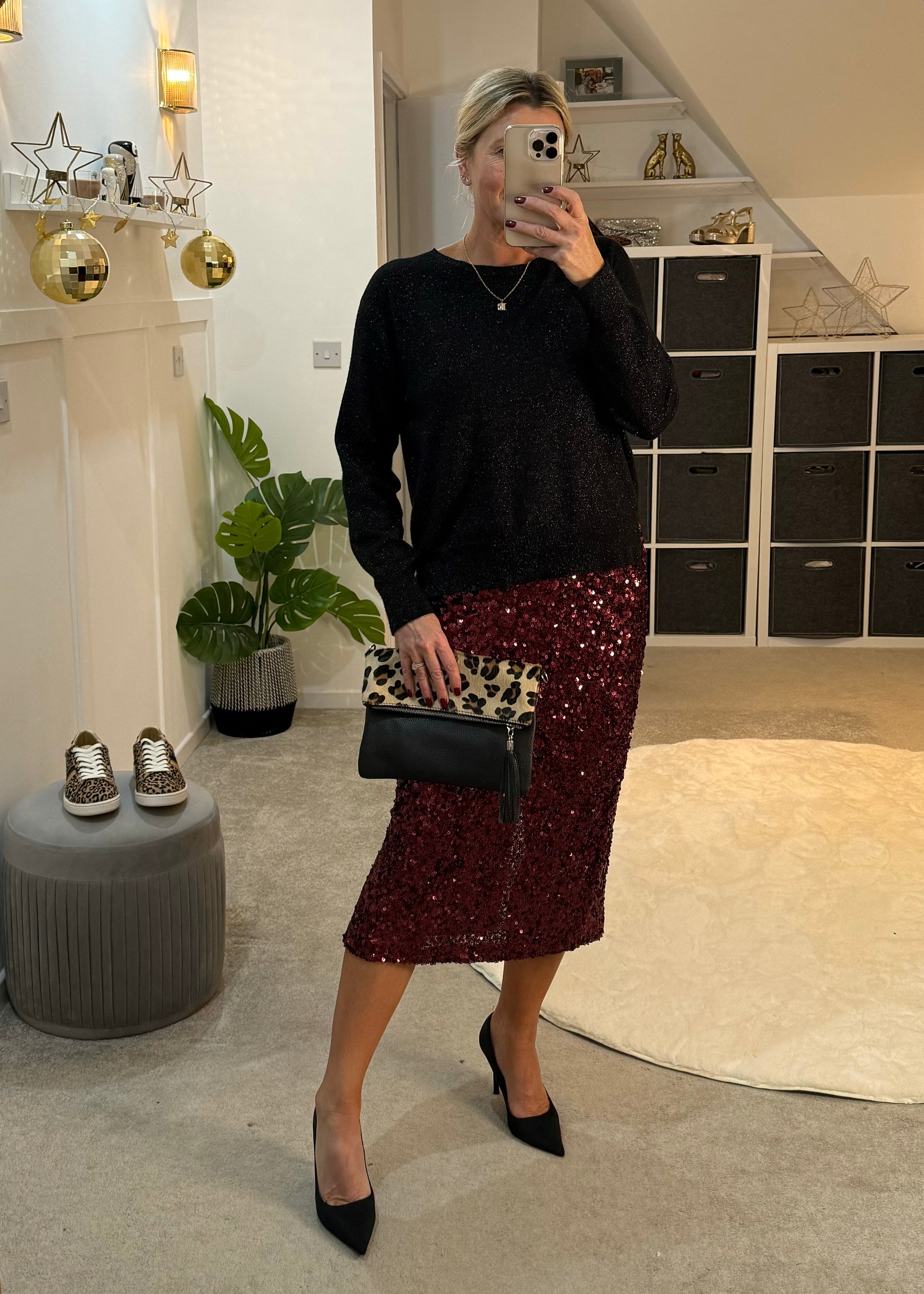Stunning sequin pencil midi skirt with back split. Super quality and it's fully lined. Wear with a sparkly knit for truly show stopping evening look. Or, team with T shirt or fine knit and heels for a more laid back party look.