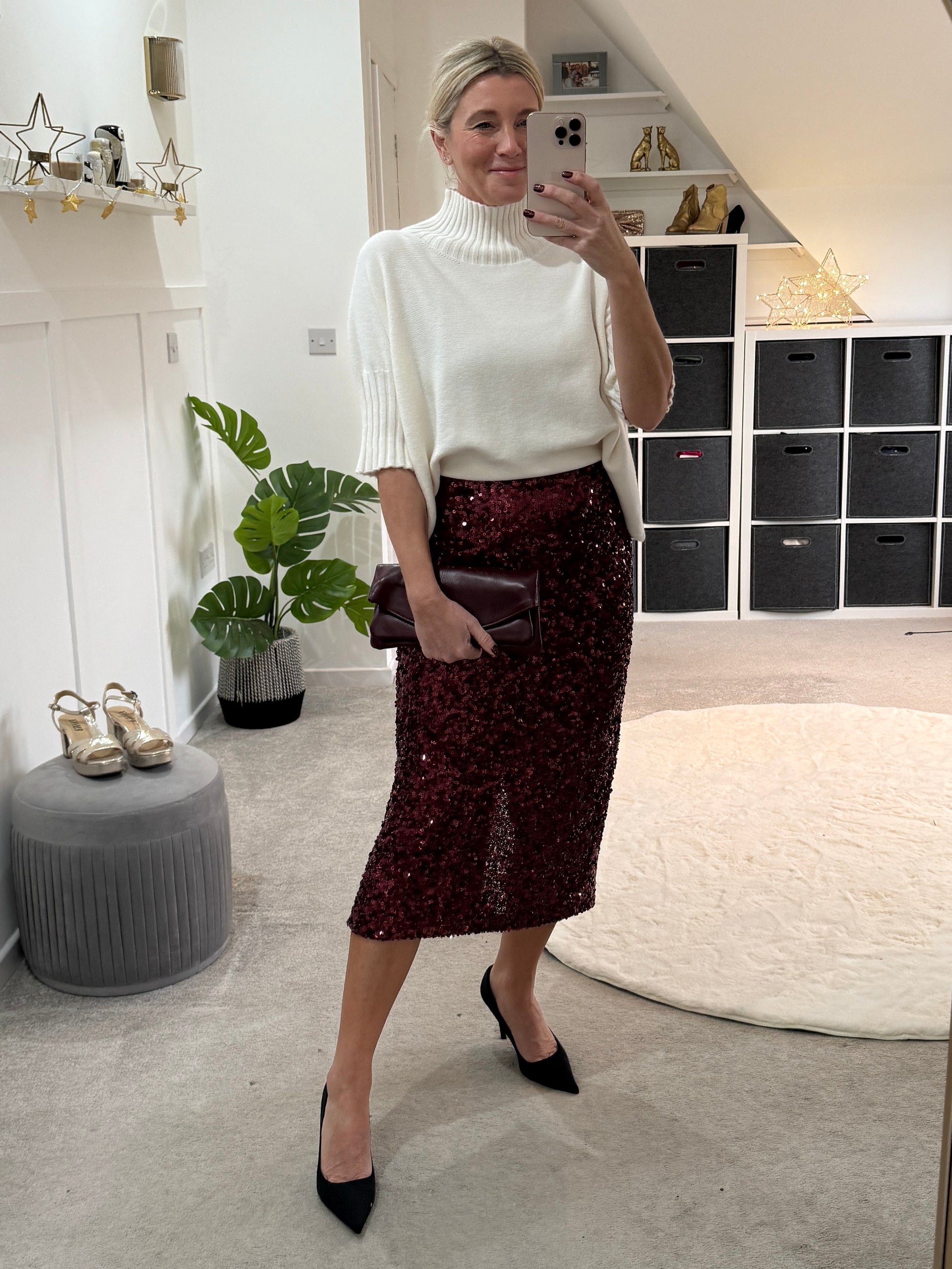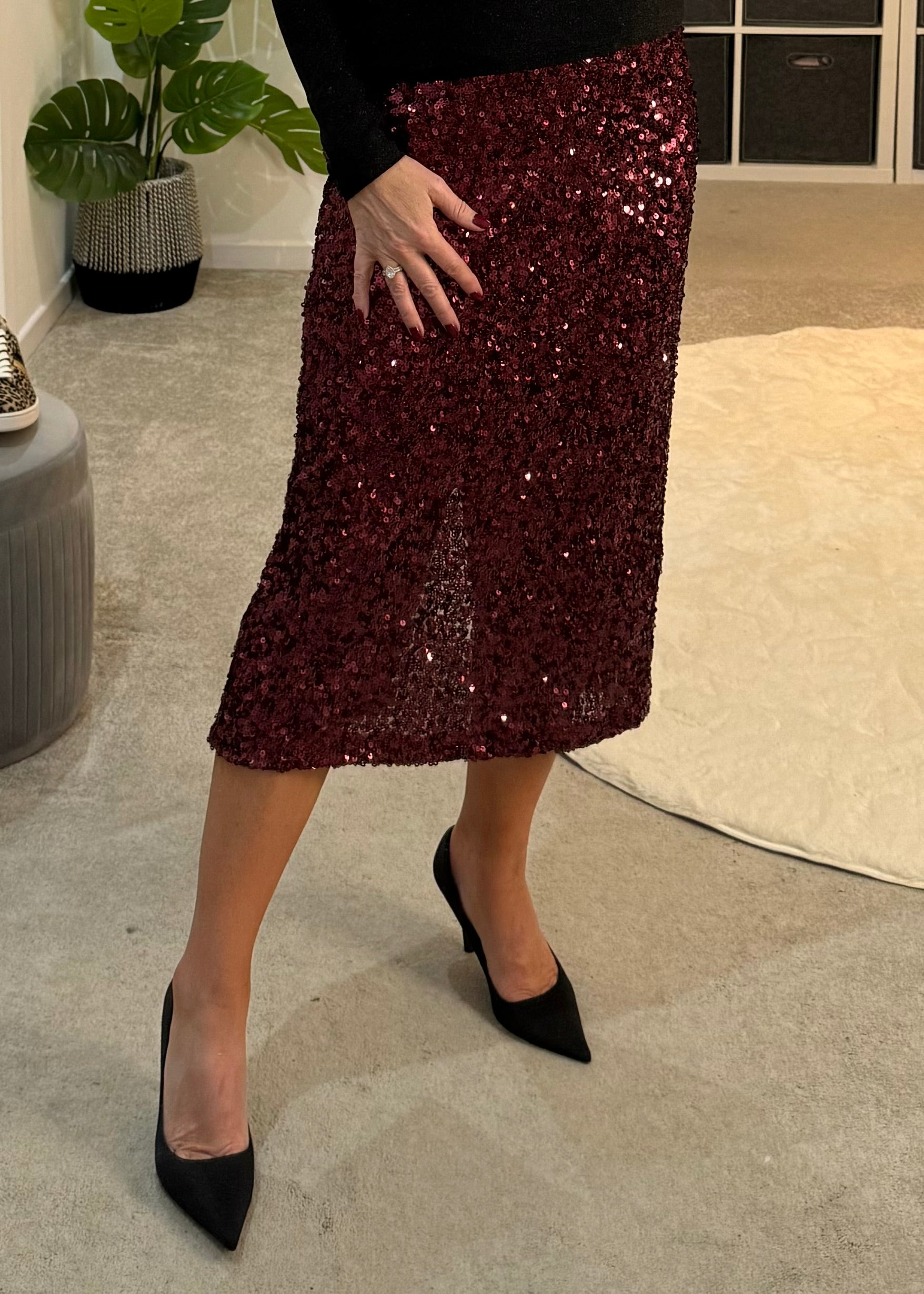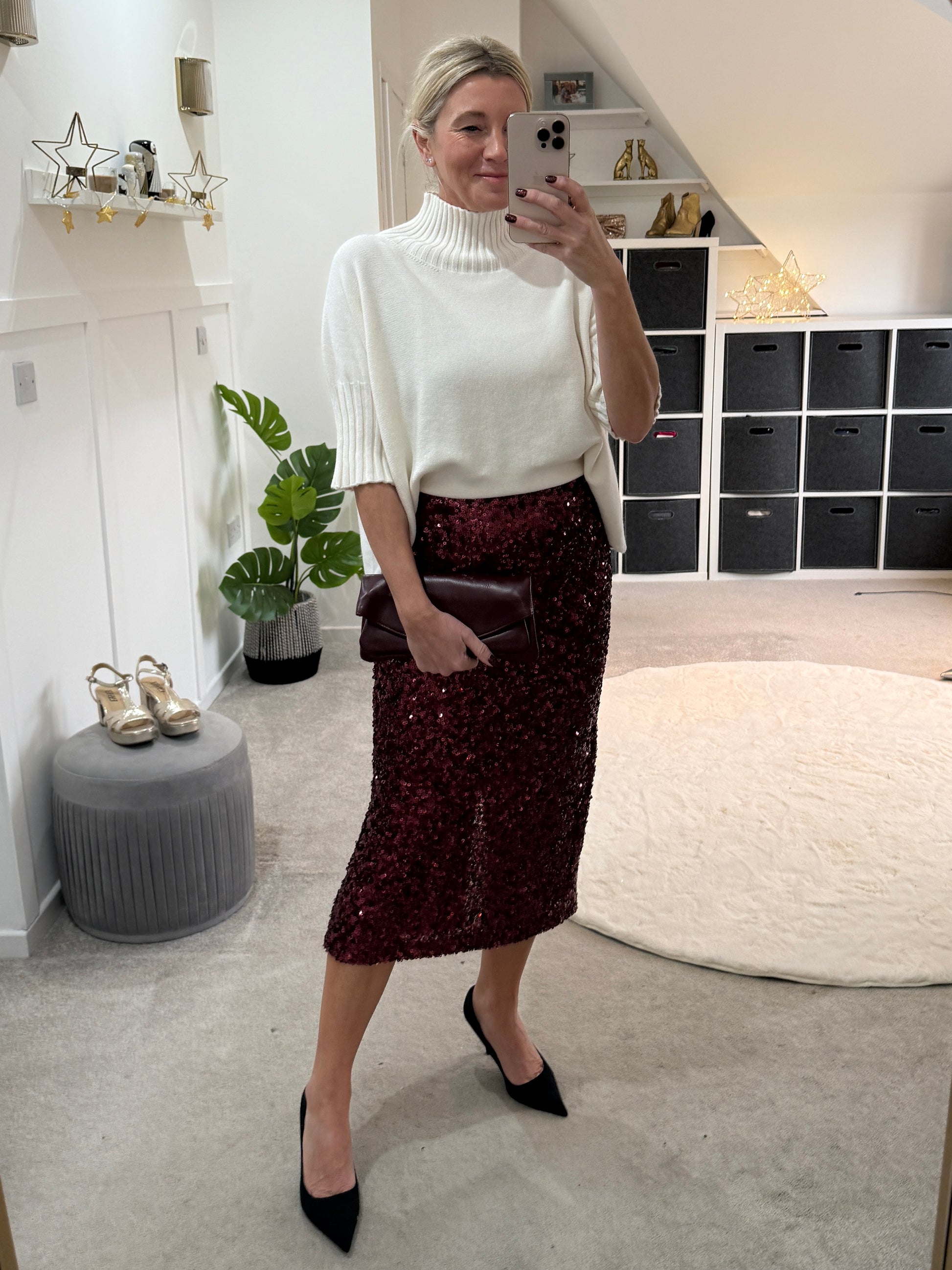 Stunning sequin pencil midi skirt with back split. Super quality and it's fully lined. Wear with a sparkly knit for truly show stopping evening look. Or, team with T shirt or fine knit and heels for a more laid back party look.