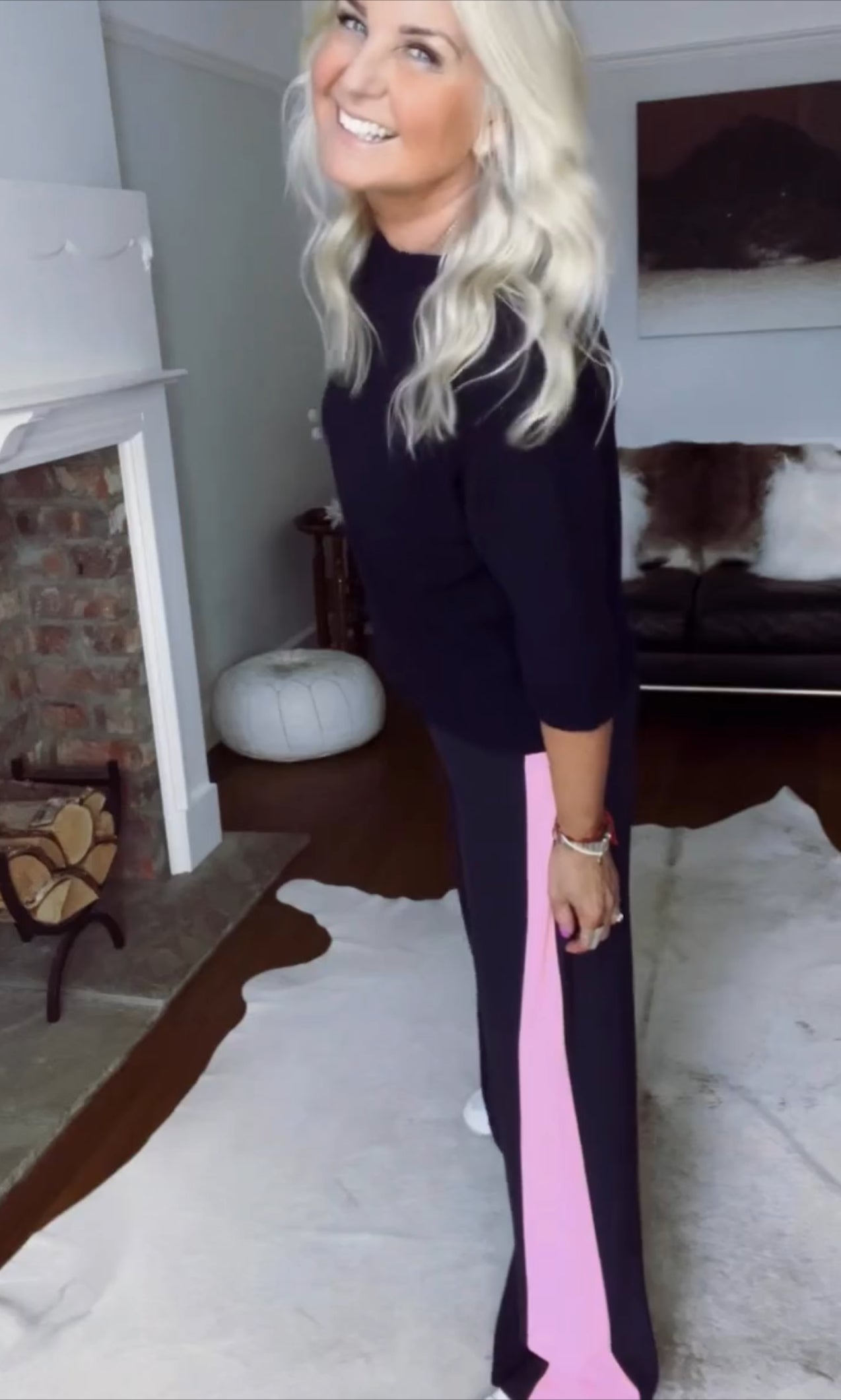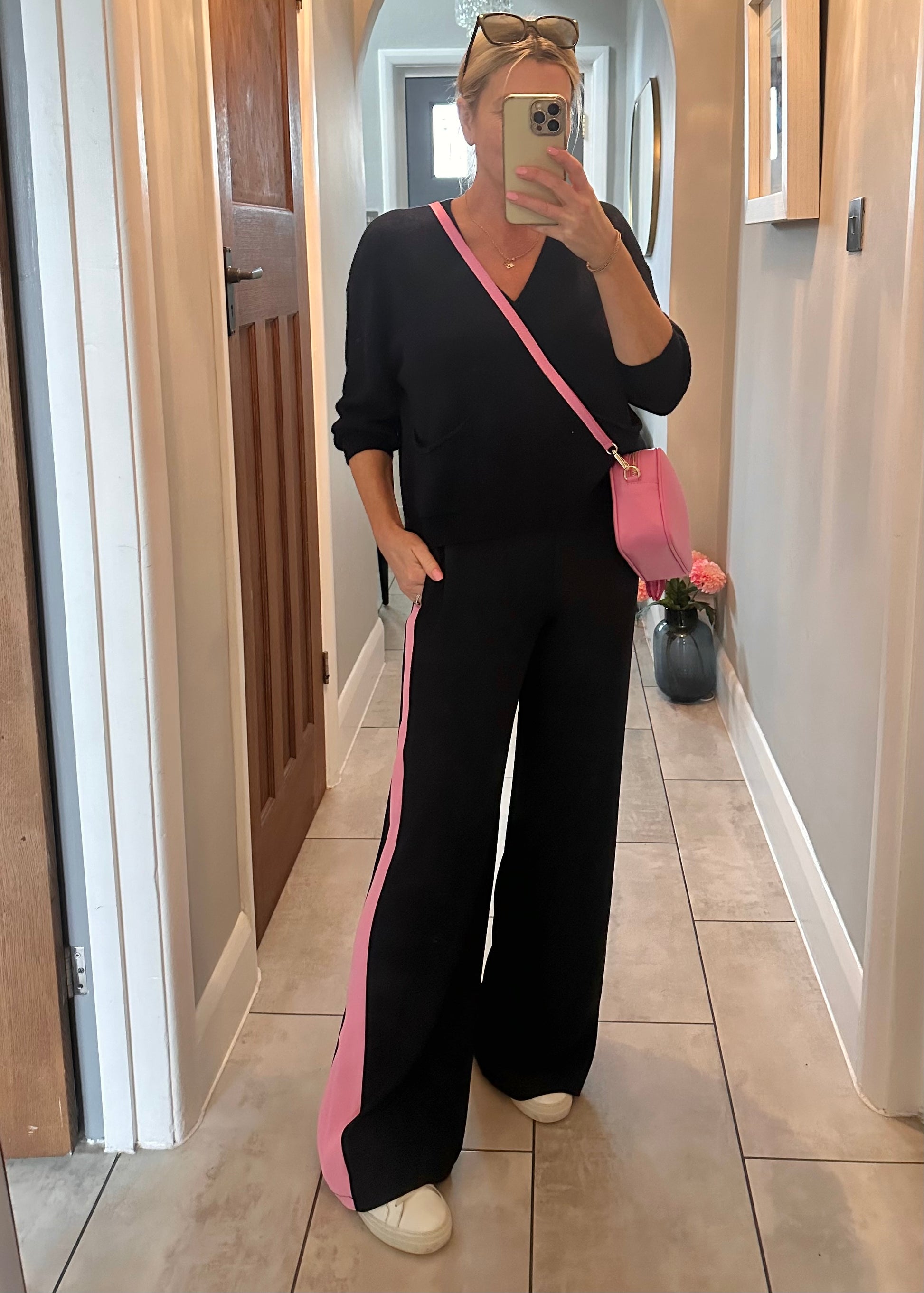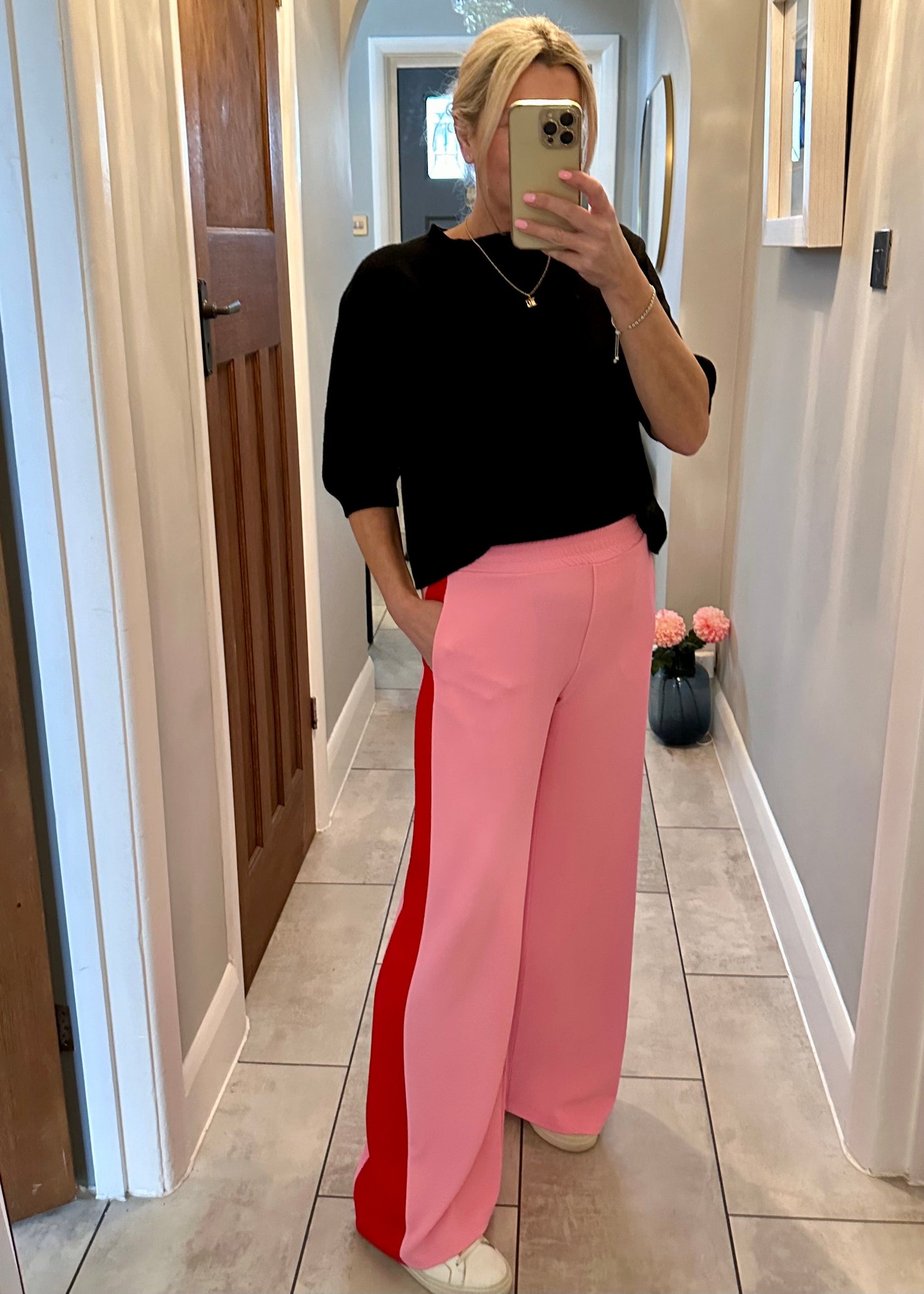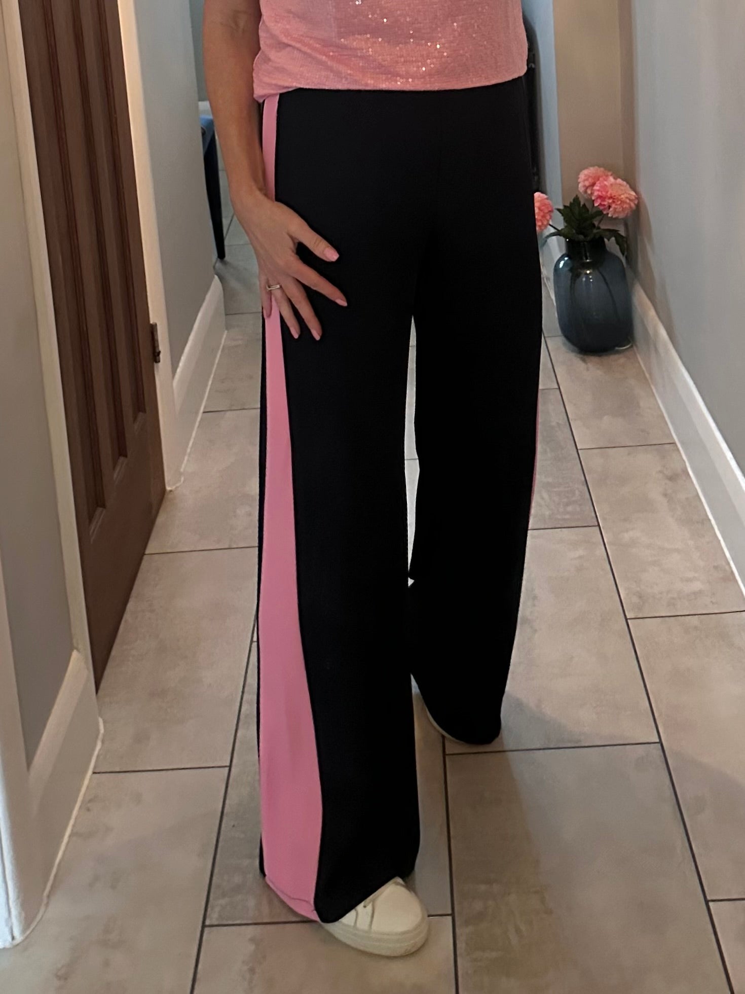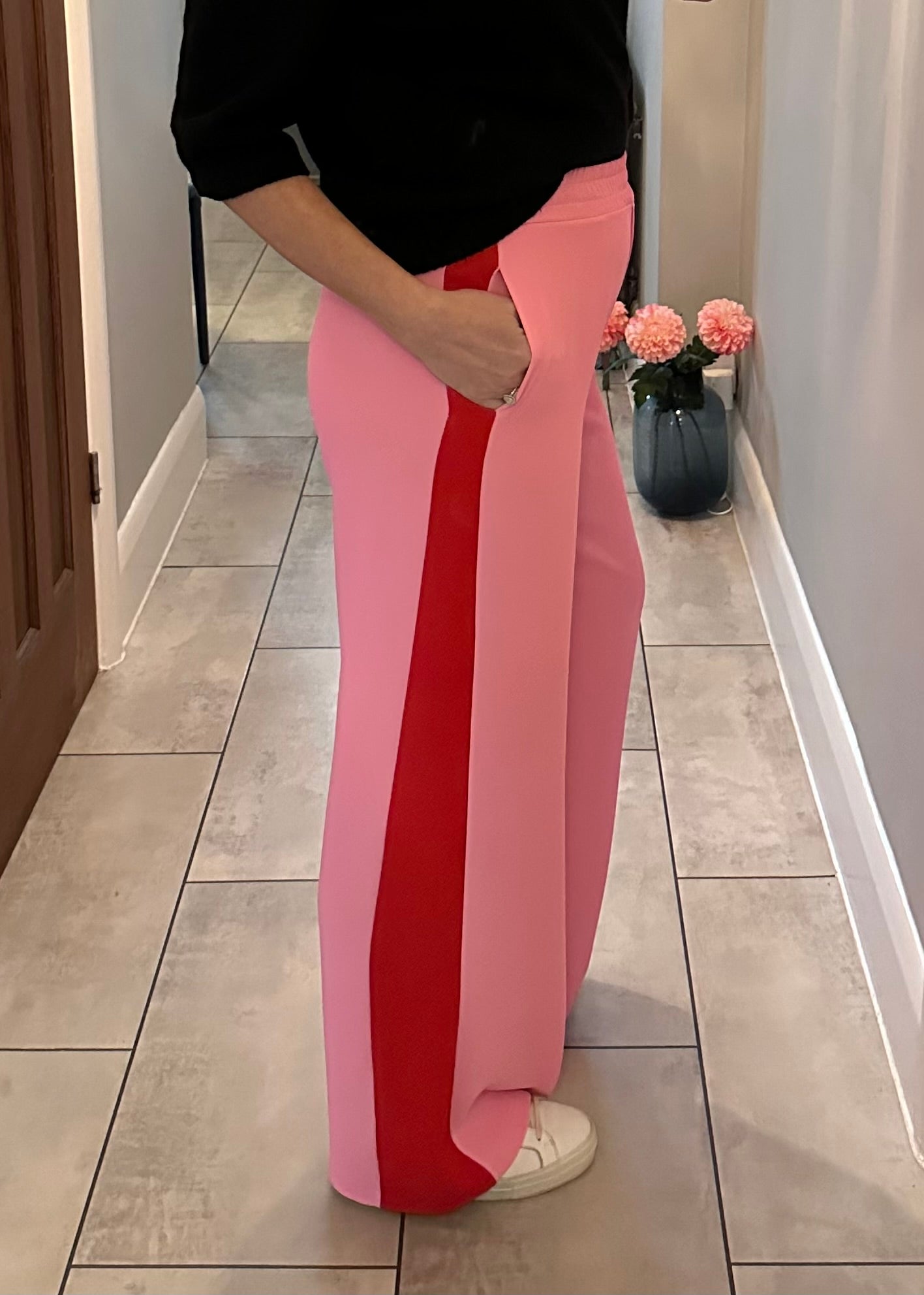 Stunning loose fit wide leg trousers, with comfy pull on elasticated waist, faux fly front and side pockets. The graduated side stripe creates a flattering elongated silhouette and they hang beautifully. They are such a great cut and amazing quality....As worn by Gaby Roslin! š