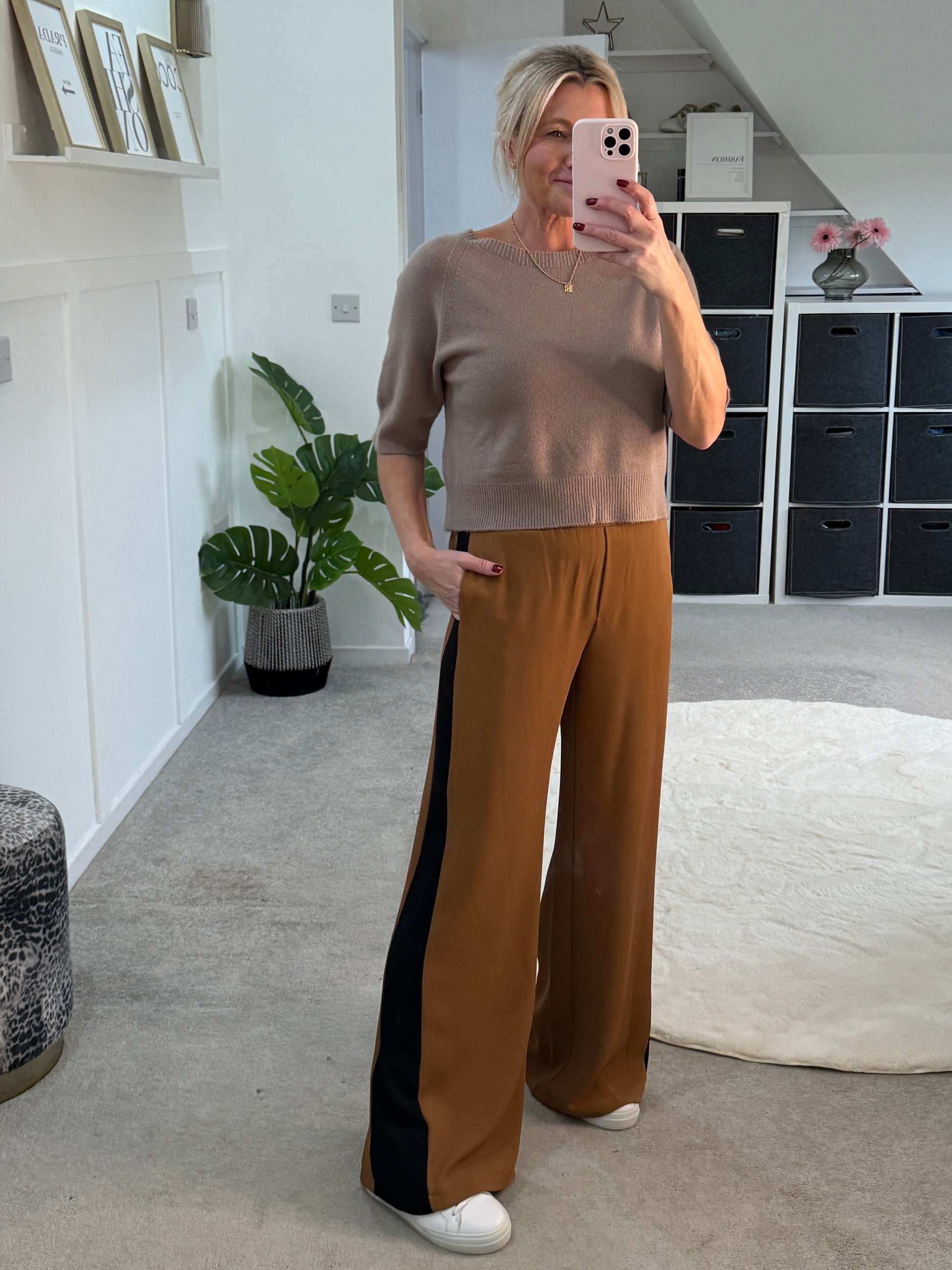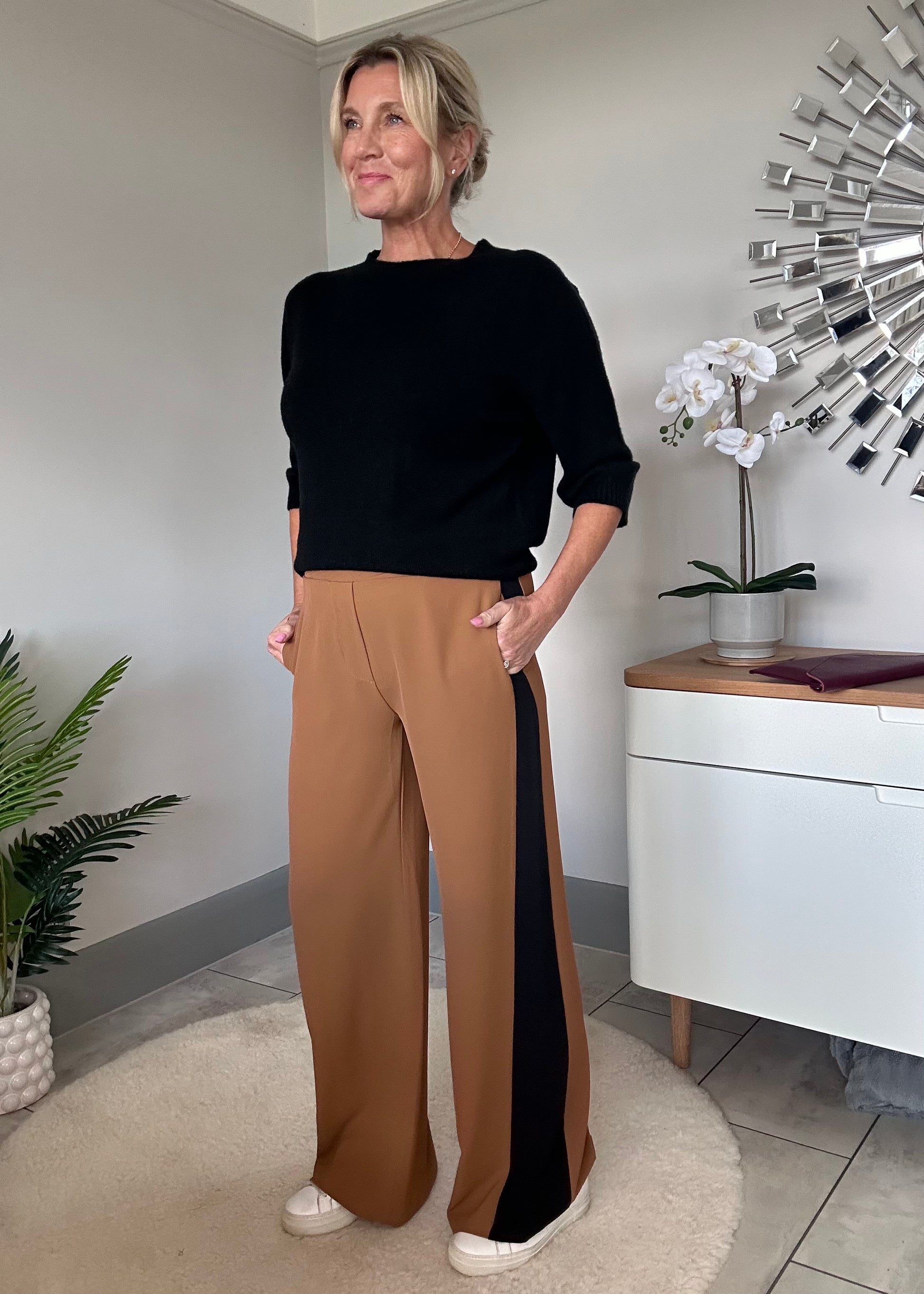 Camel/Black Stripe Wide Leg Trousers