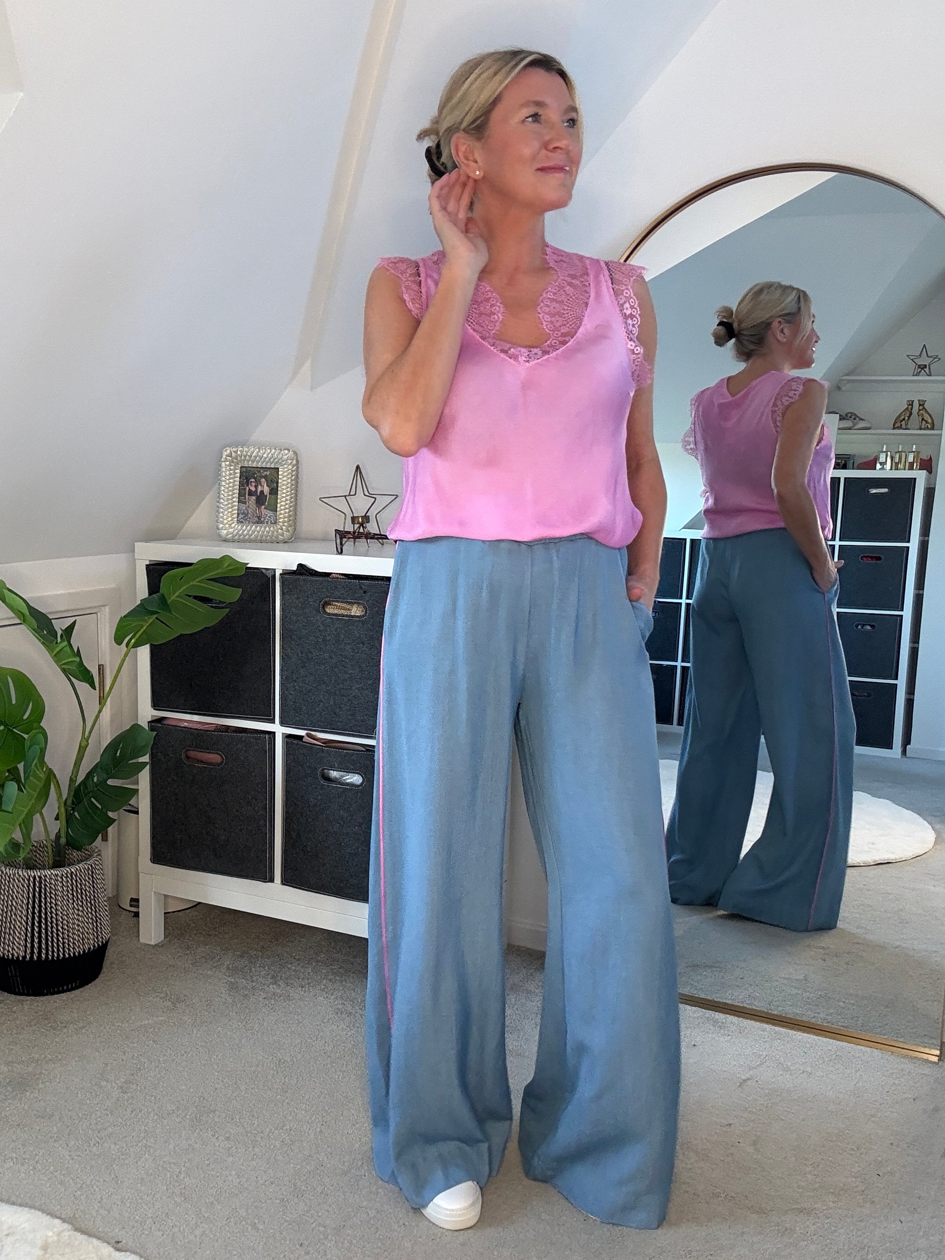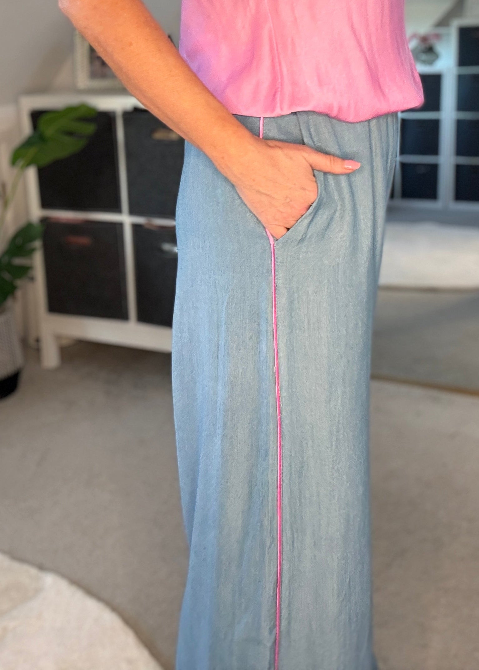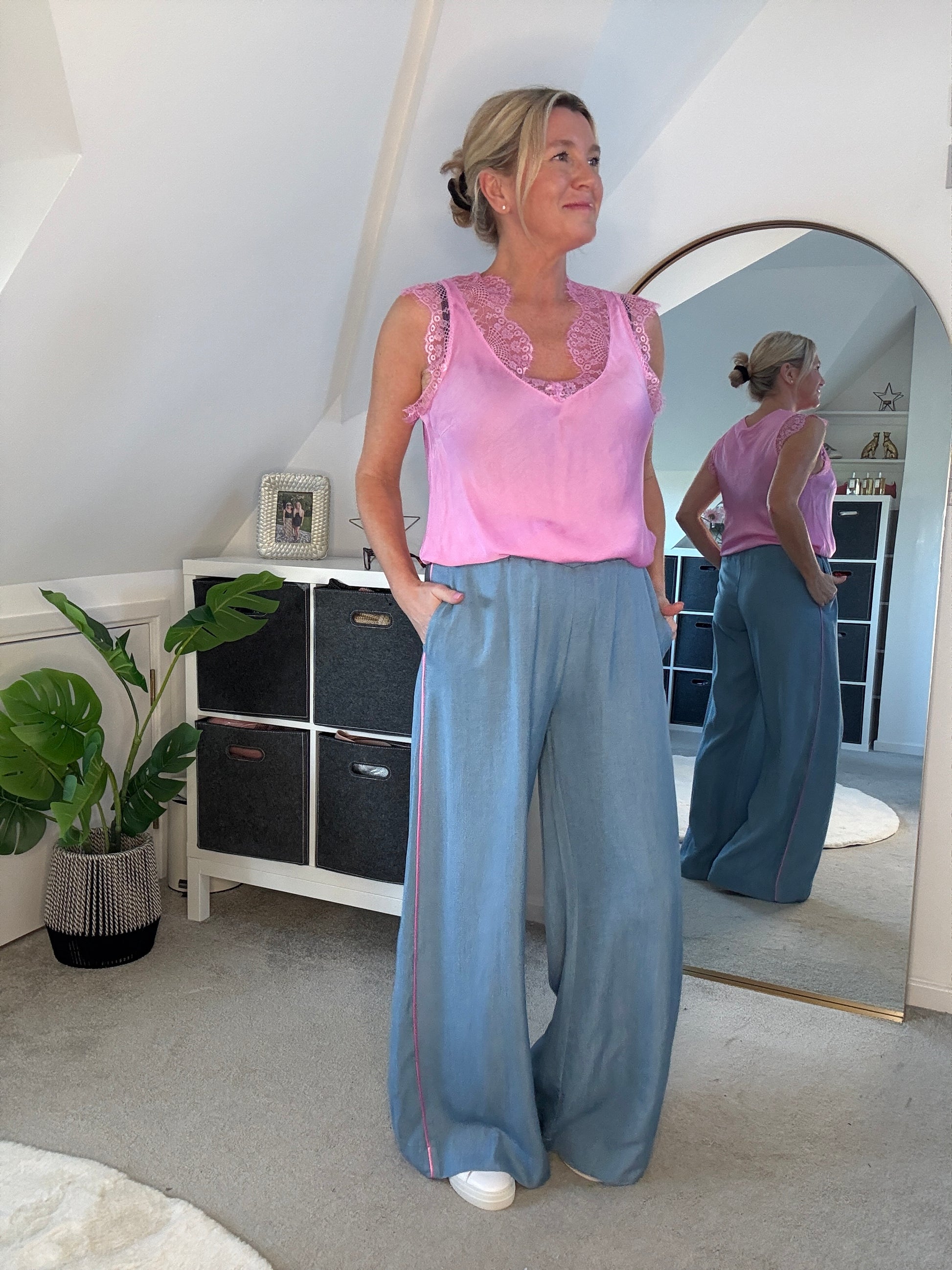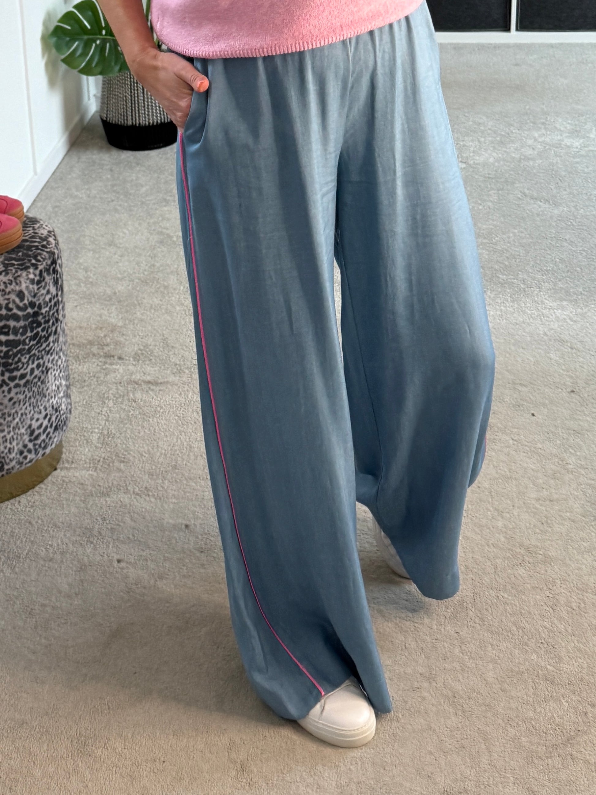 Stunning light chambray floaty trousers with bubblegum pink satin stripe down the sides. With comfortable, elasticated waist and pockets. A lovely lightweight for S/S and a gorgeous wide leg. They hang beautifully when on. Style with matching bubblegum pink satin lace top or the bon bon t shirt or the 2/4 sleeve jumper.