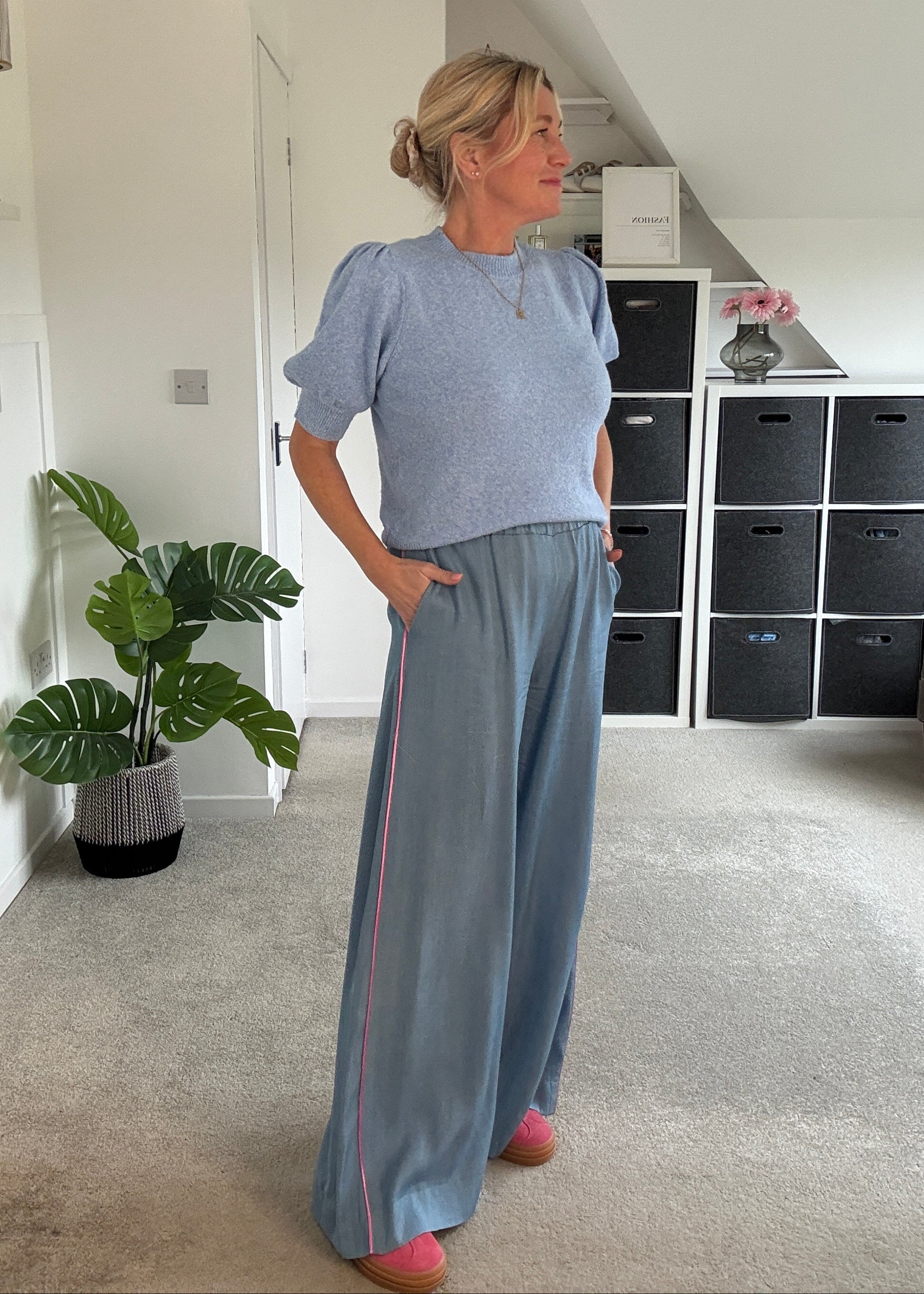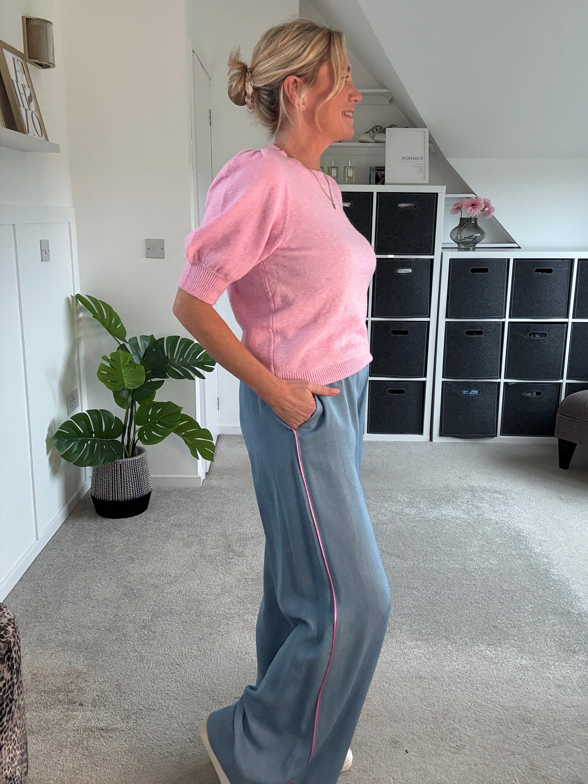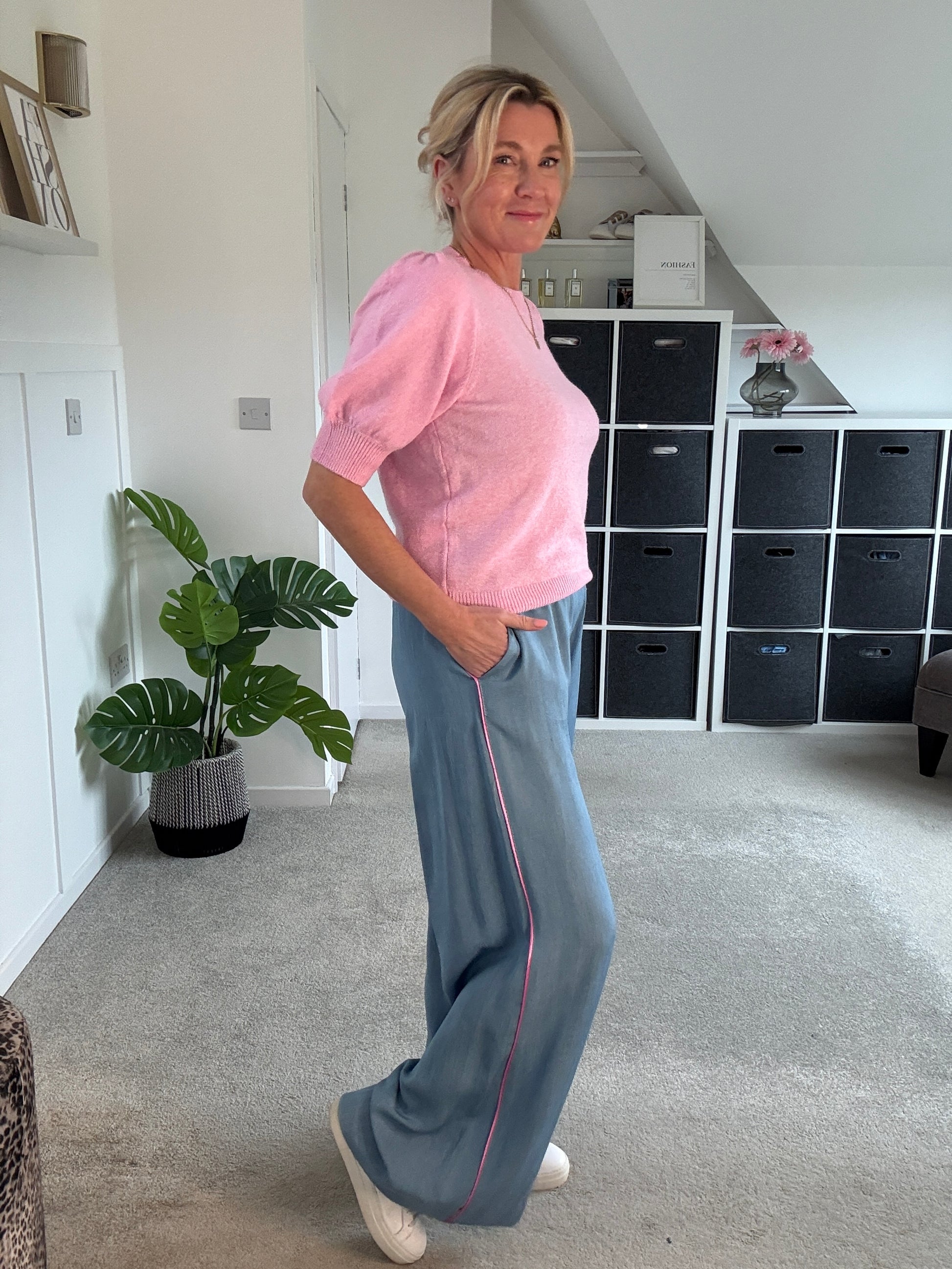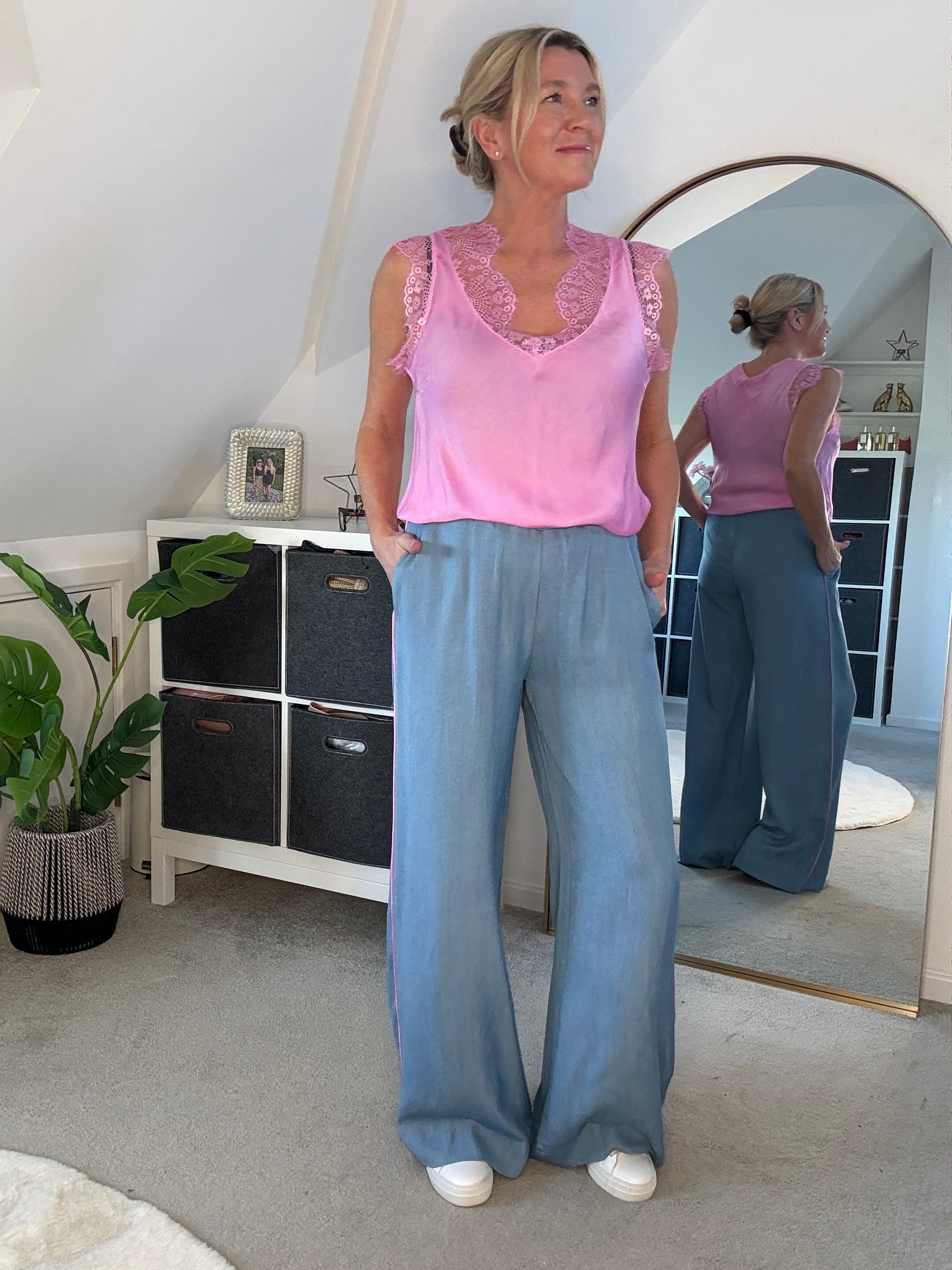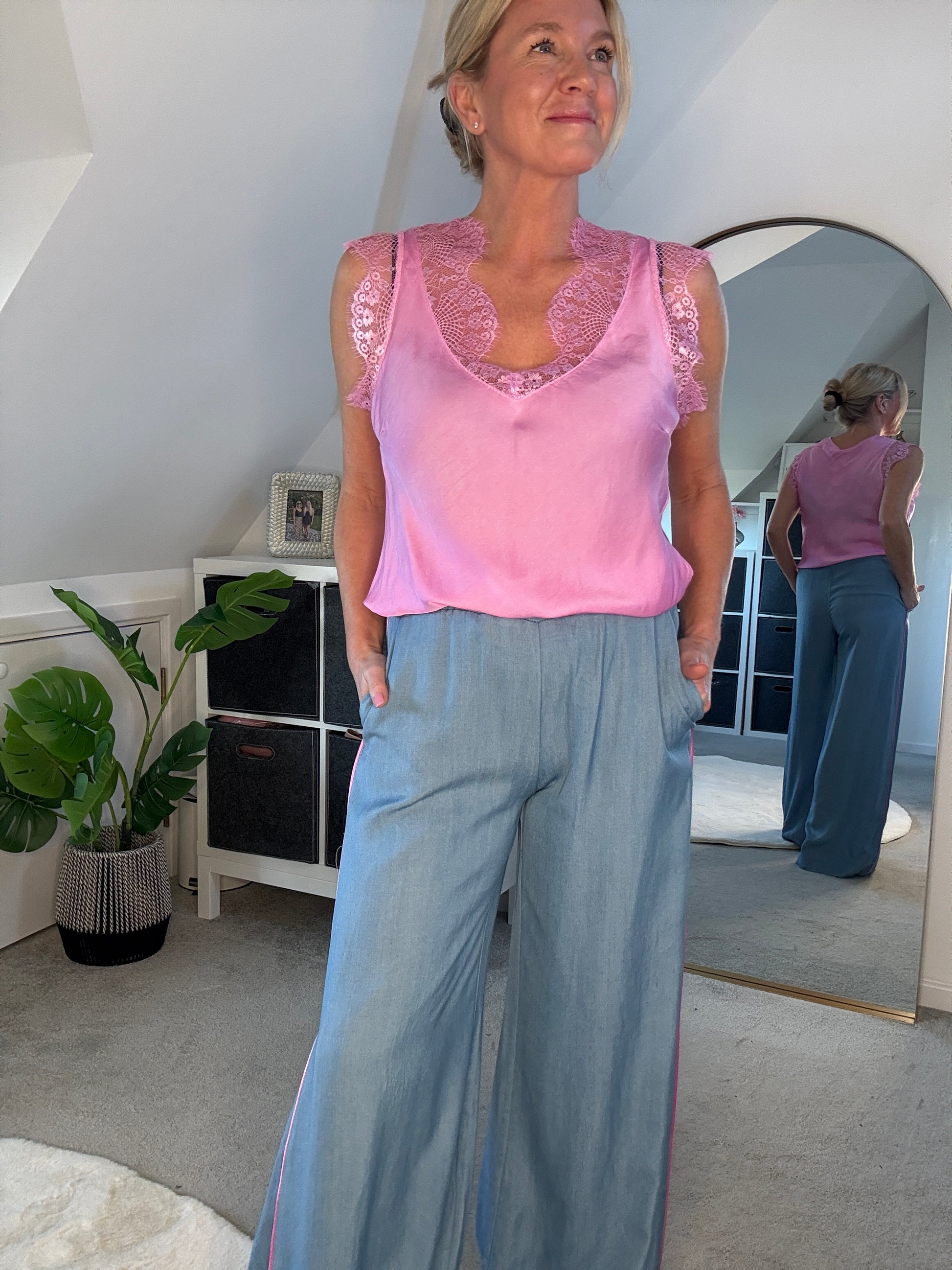 Stunning light chambray floaty trousers with bubblegum pink satin stripe down the sides. With comfortable, elasticated waist and pockets. A lovely lightweight for S/S and a gorgeous wide leg. They hang beautifully when on. Style with matching bubblegum pink satin lace top or the bon bon t shirt or the 2/4 sleeve jumper.