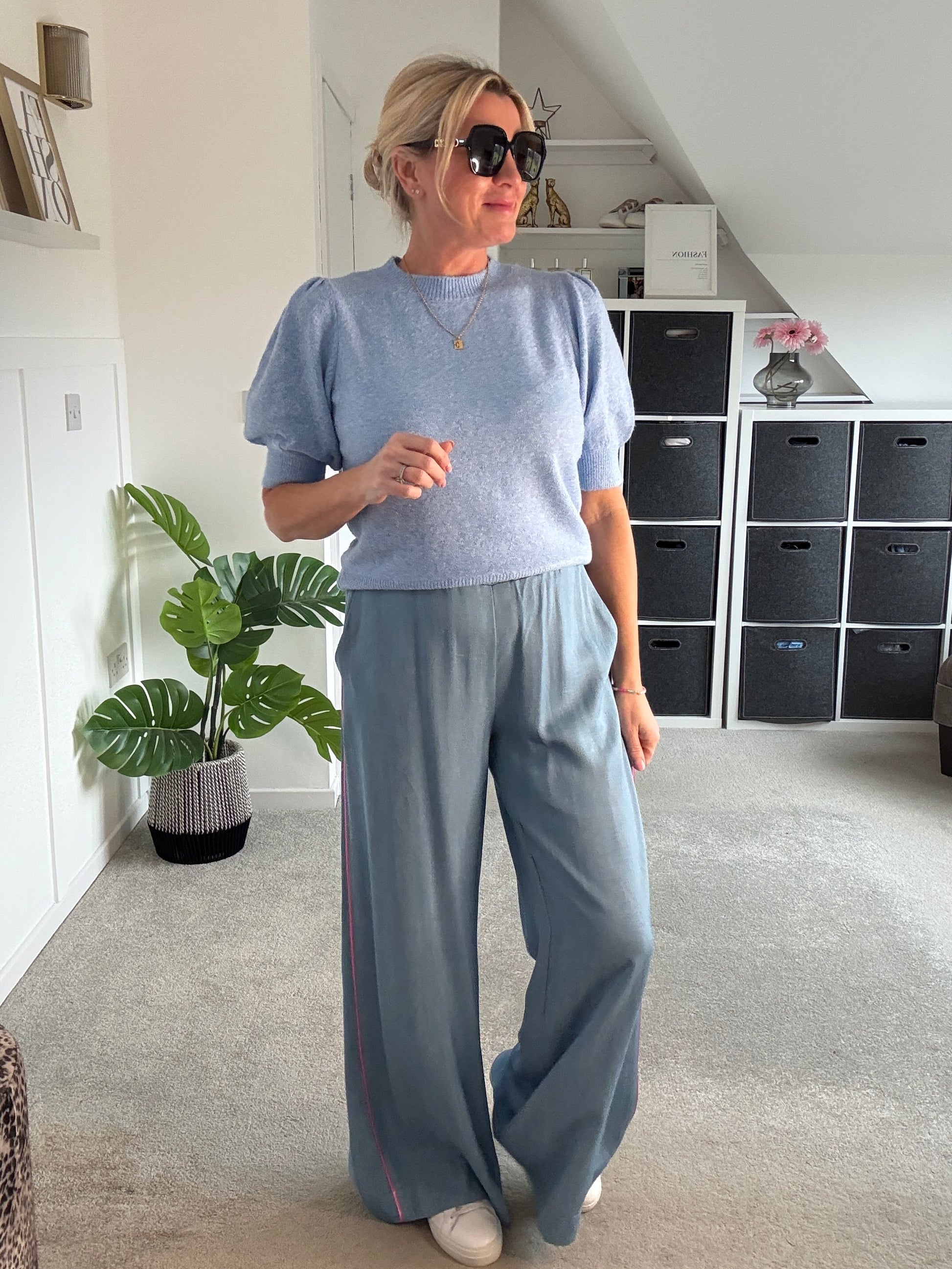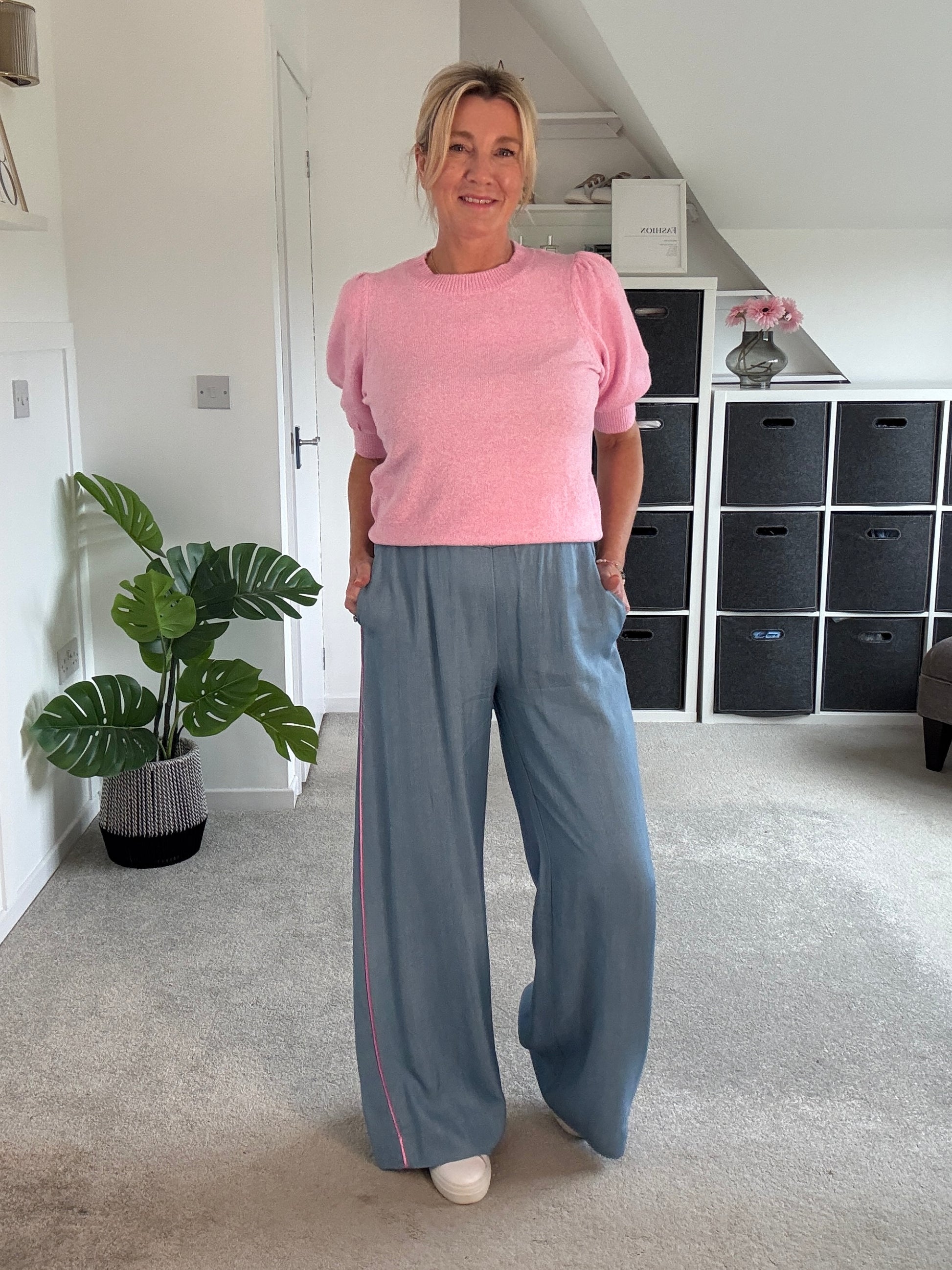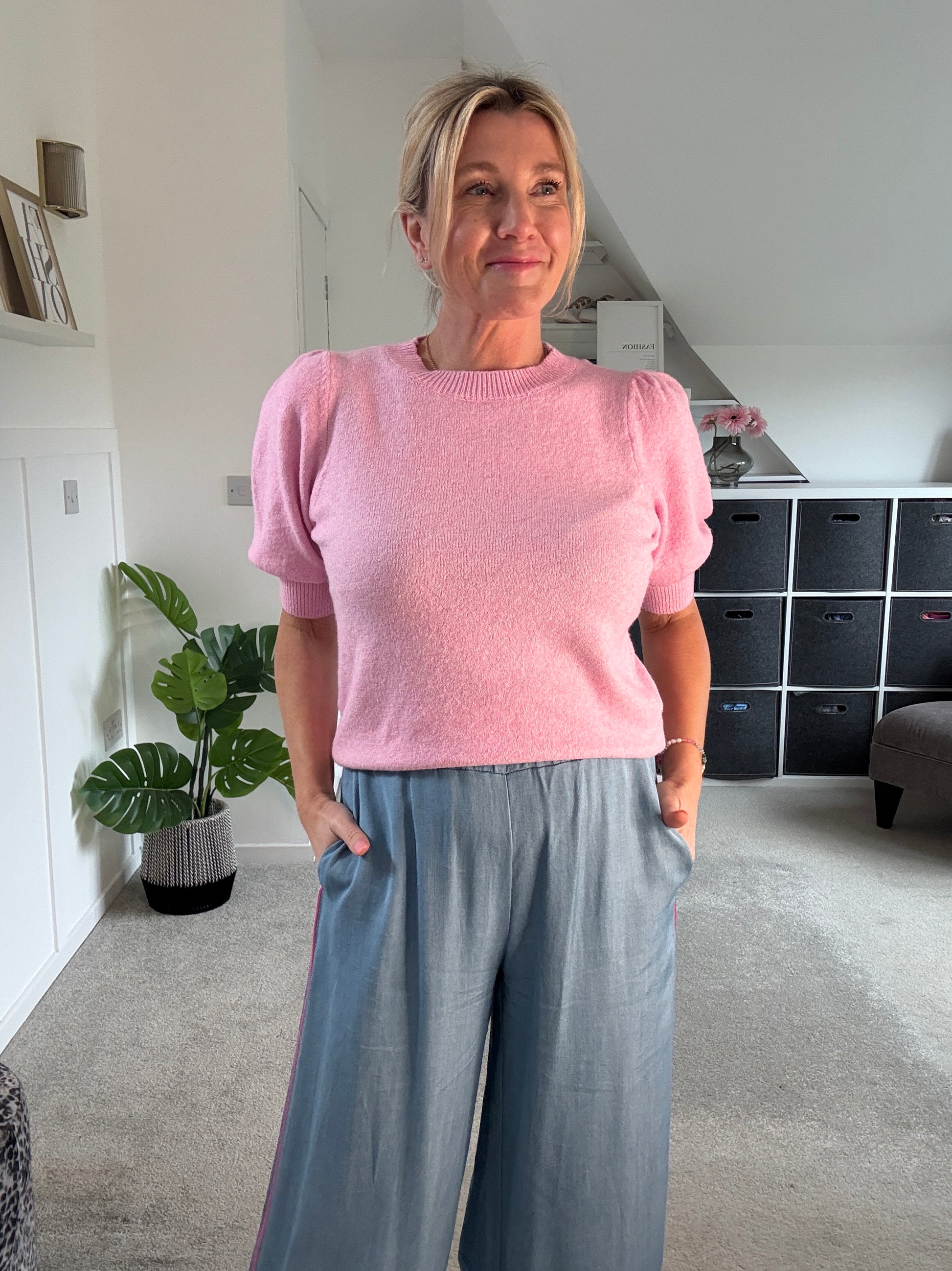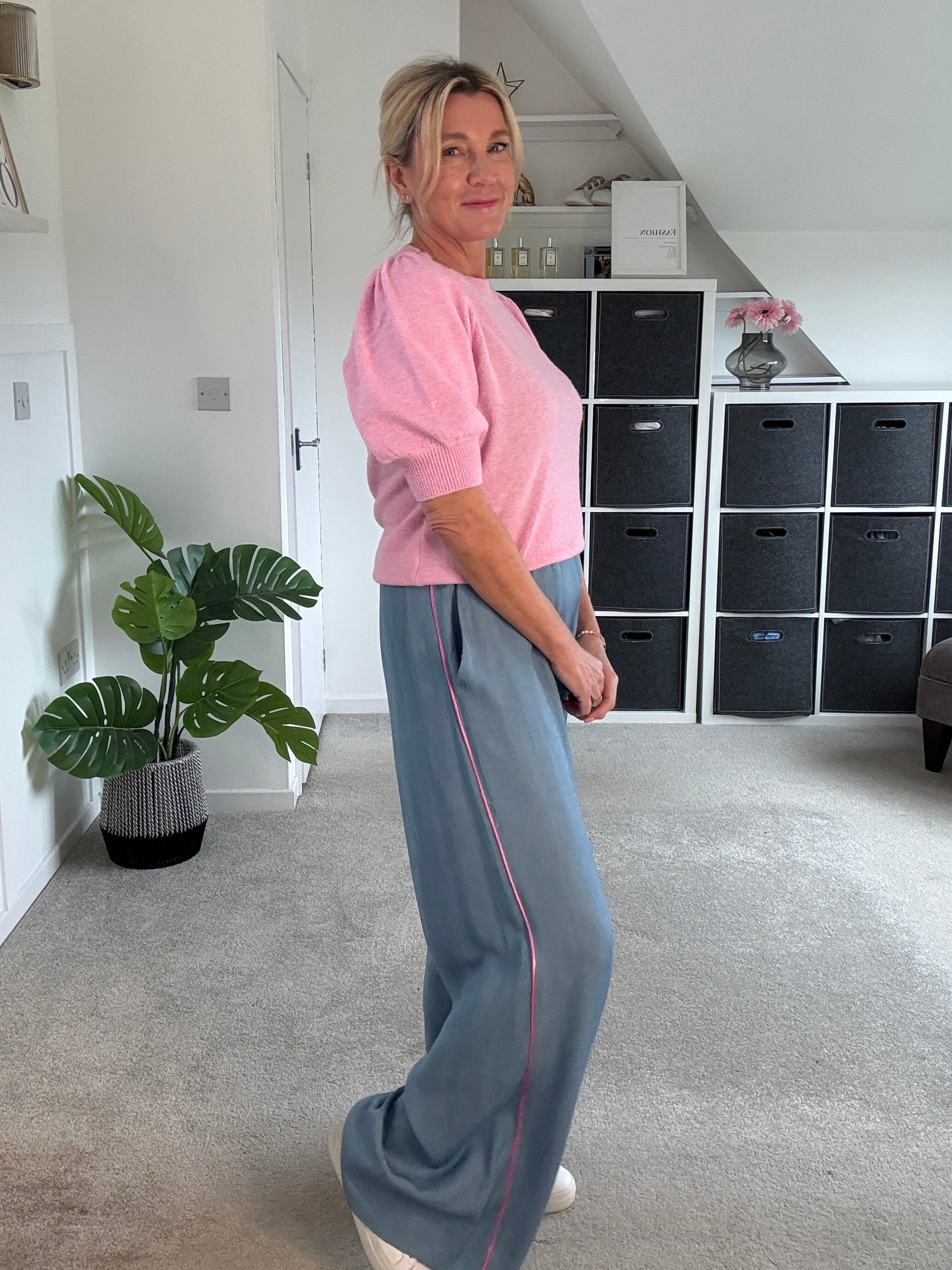 Stunning light chambray floaty trousers with bubblegum pink satin stripe down the sides. With comfortable, elasticated waist and pockets. A lovely lightweight for S/S and a gorgeous wide leg. They hang beautifully when on. Style with matching bubblegum pink satin lace top or the bon bon t shirt or the 2/4 sleeve jumper.
