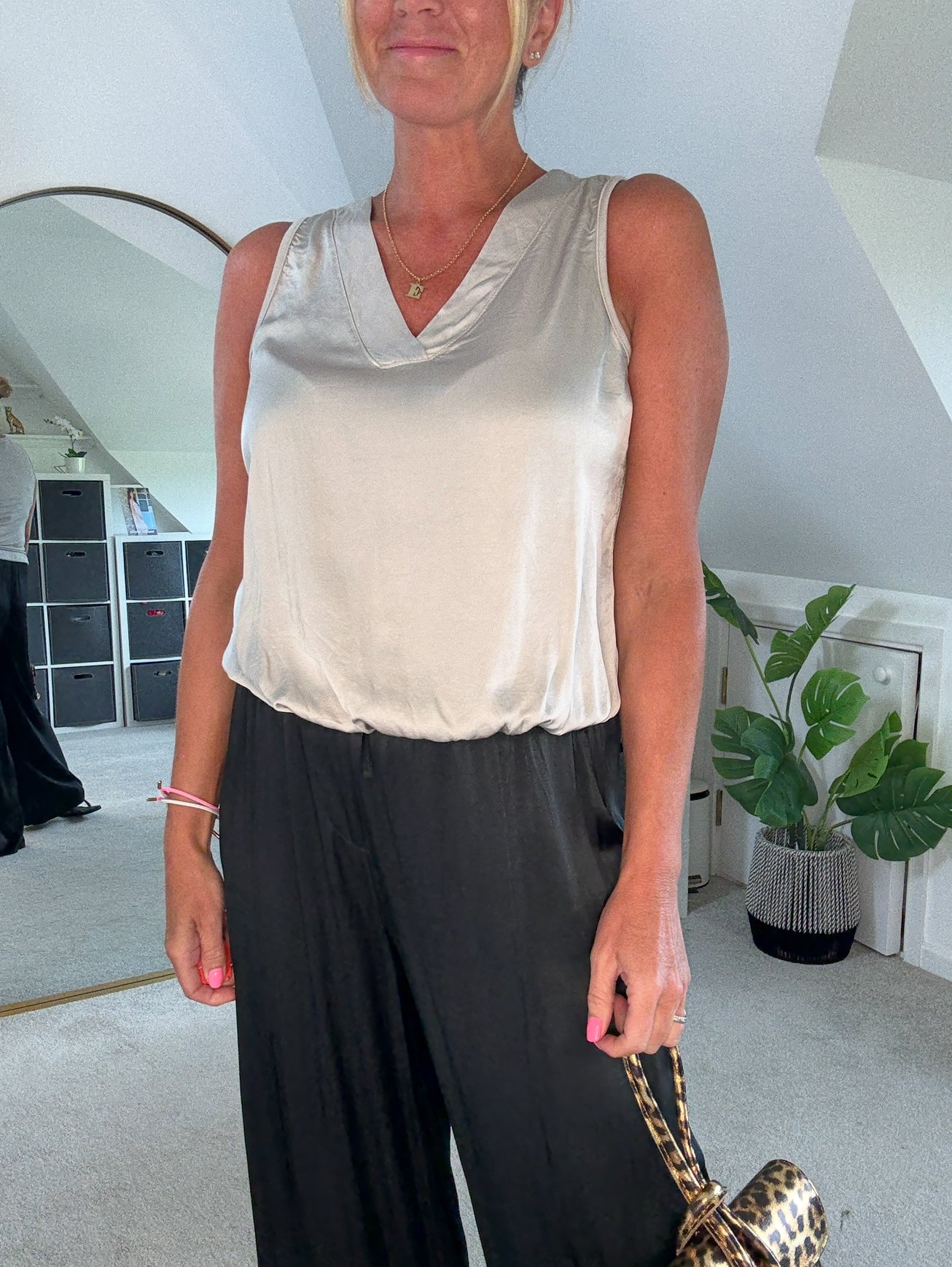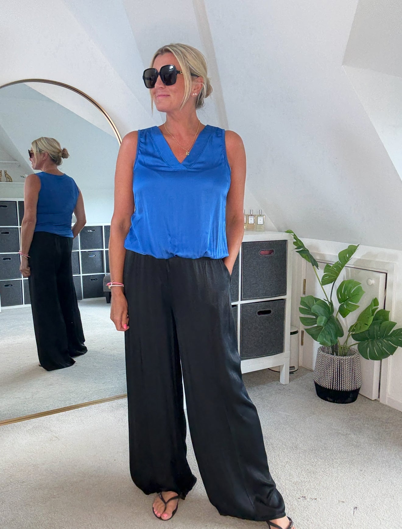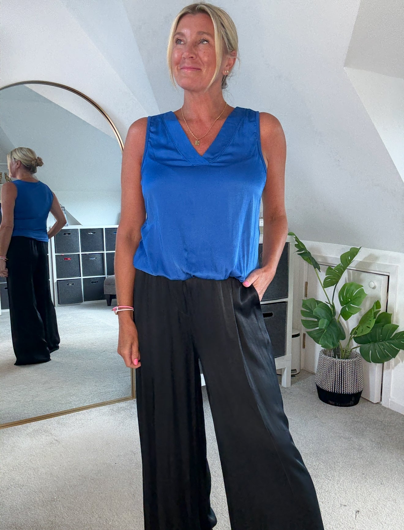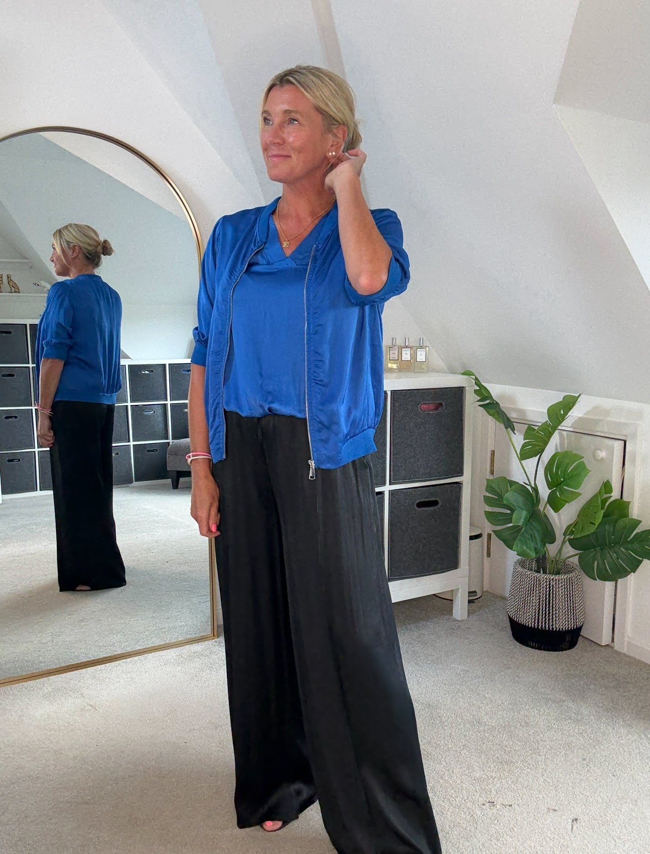 Beautiful silk mix v neck top with flattering bubble hem. A lovely silk mix fabric on the front and jersey on the back. Looks fab styled with the Emy satin wide leg trousers and matching silk mix bomber jacket or style with jeans for a jeans and a nice top look!