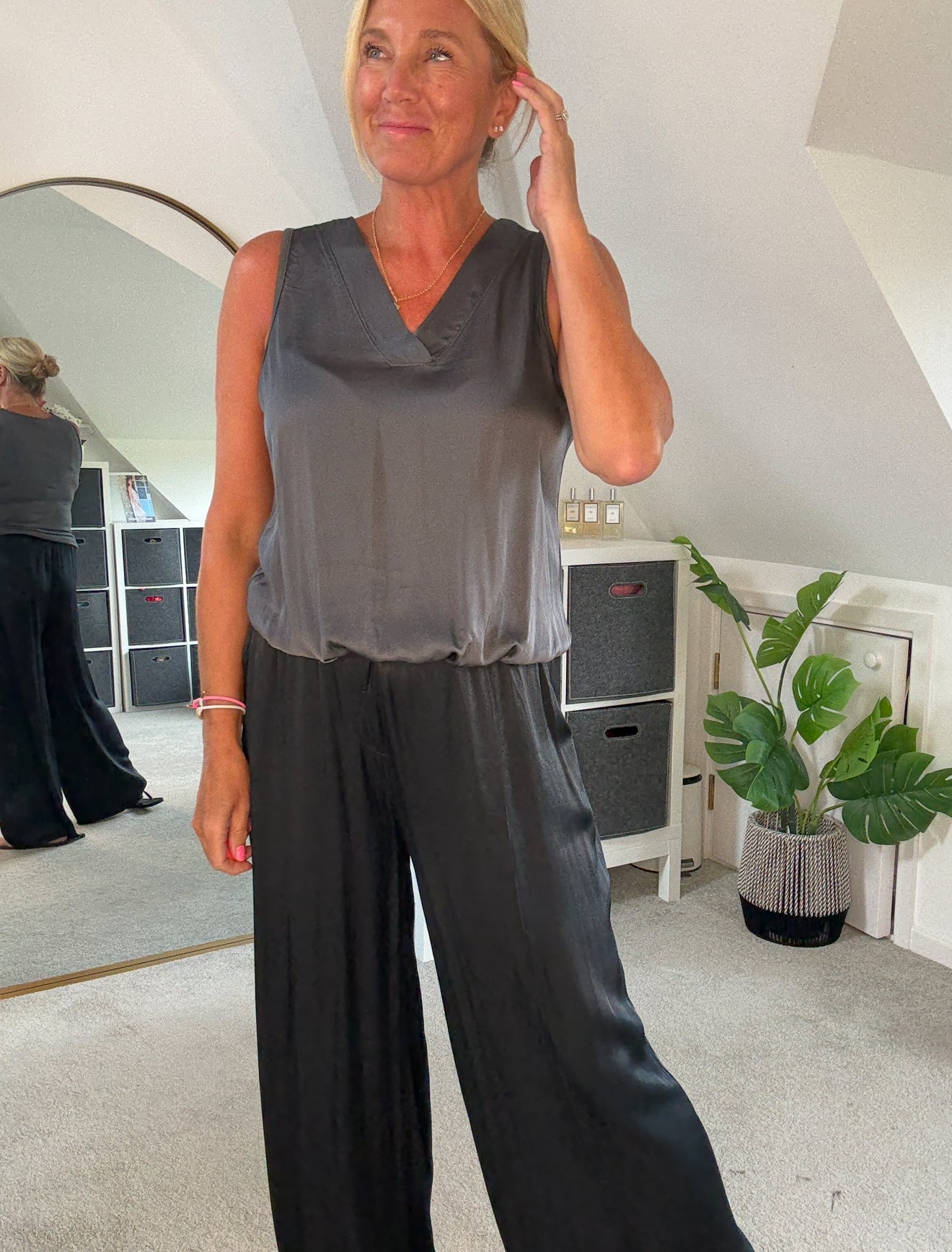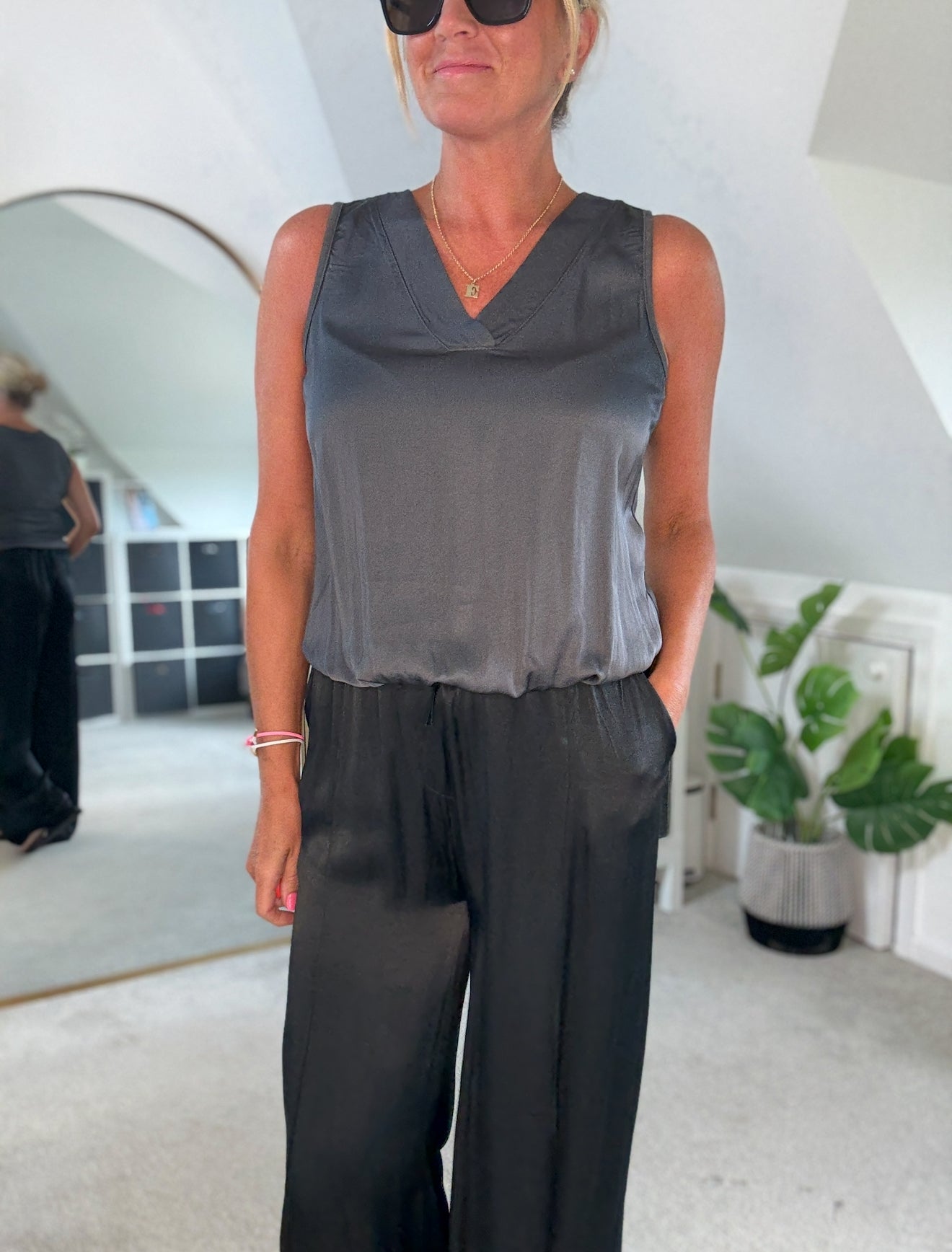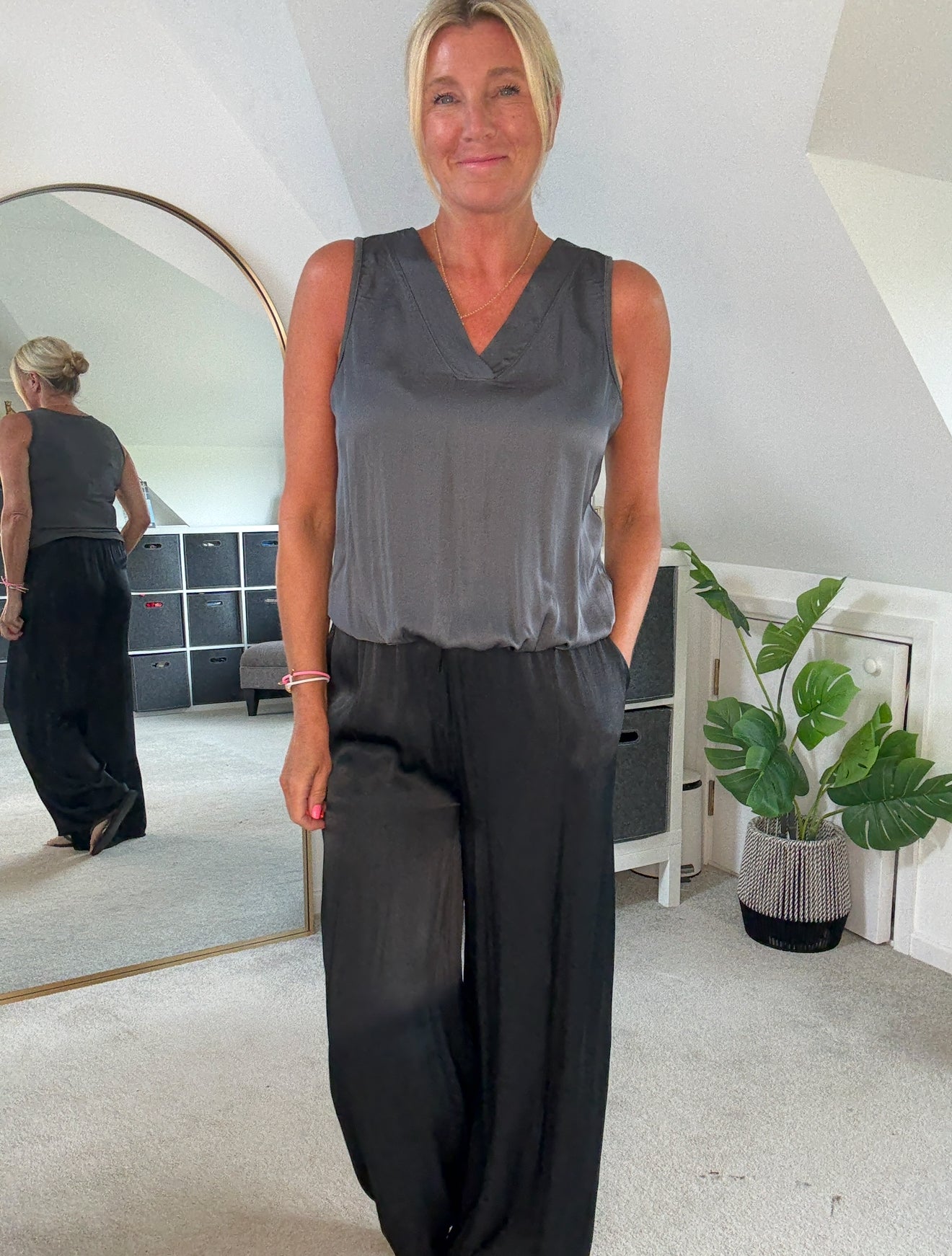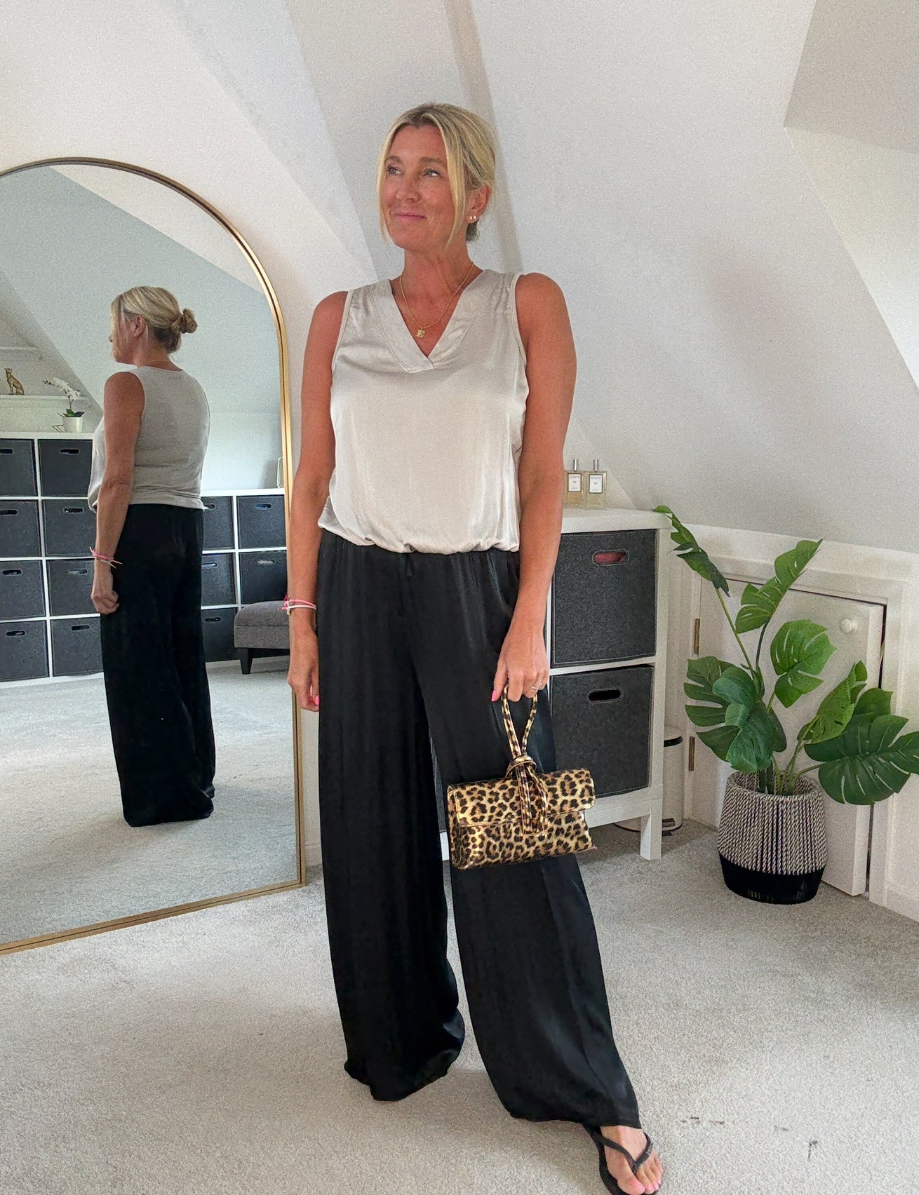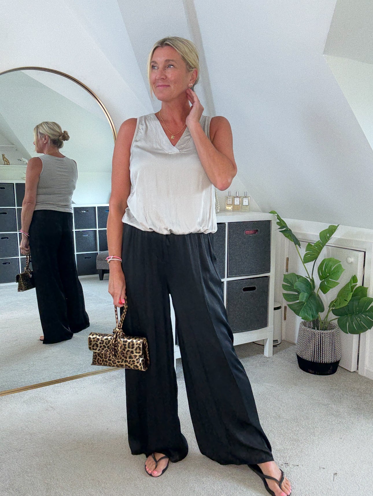 Beautiful silk mix v neck top with flattering bubble hem. A lovely silk mix fabric on the front and jersey on the back. Looks fab styled with the Emy satin wide leg trousers and matching silk mix bomber jacket or style with jeans for a jeans and a nice top look!