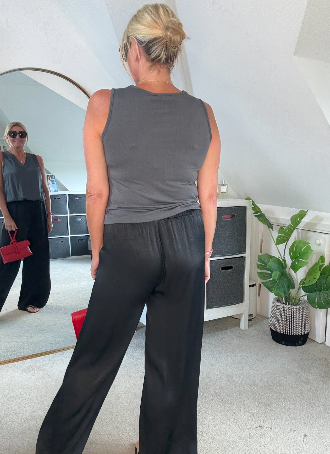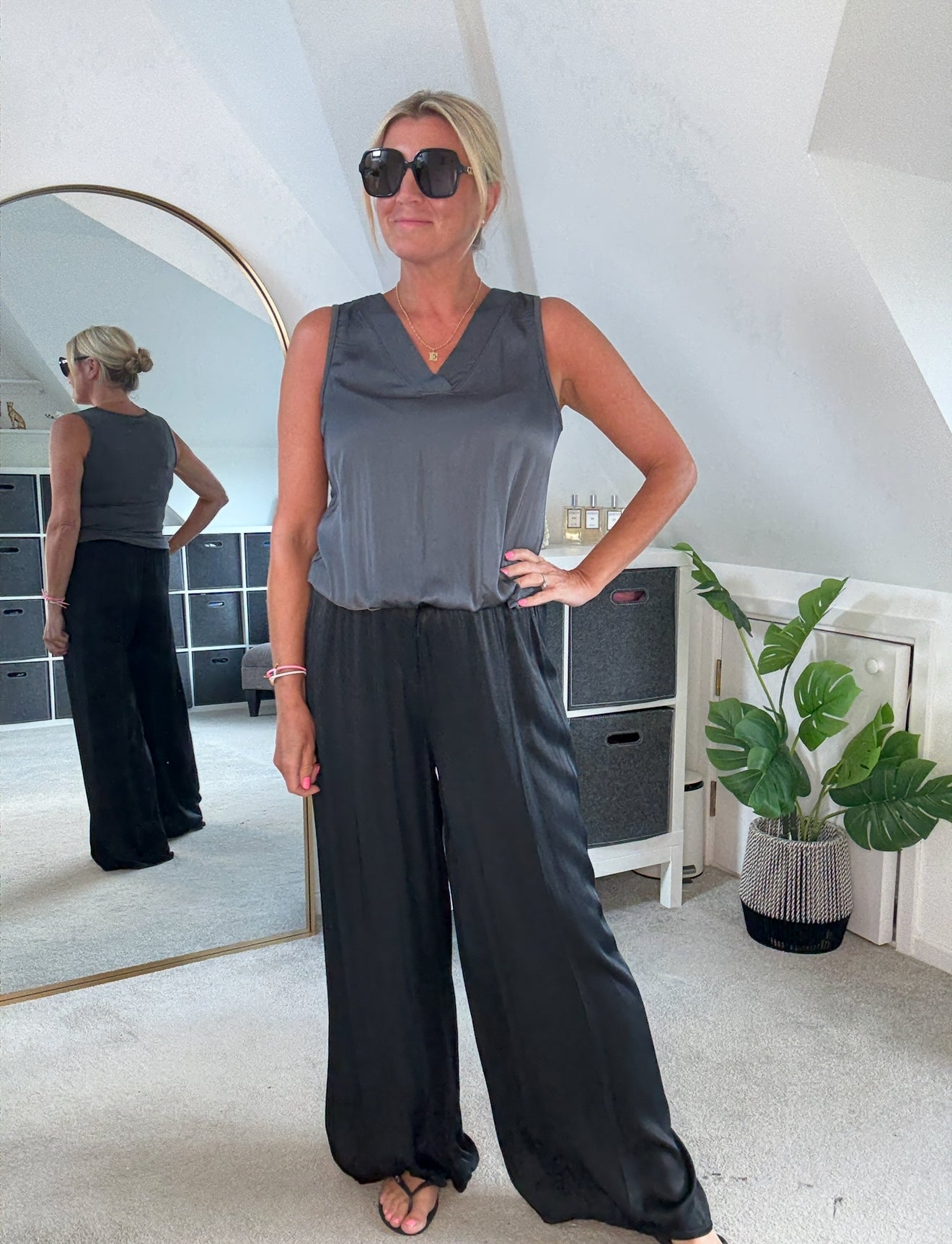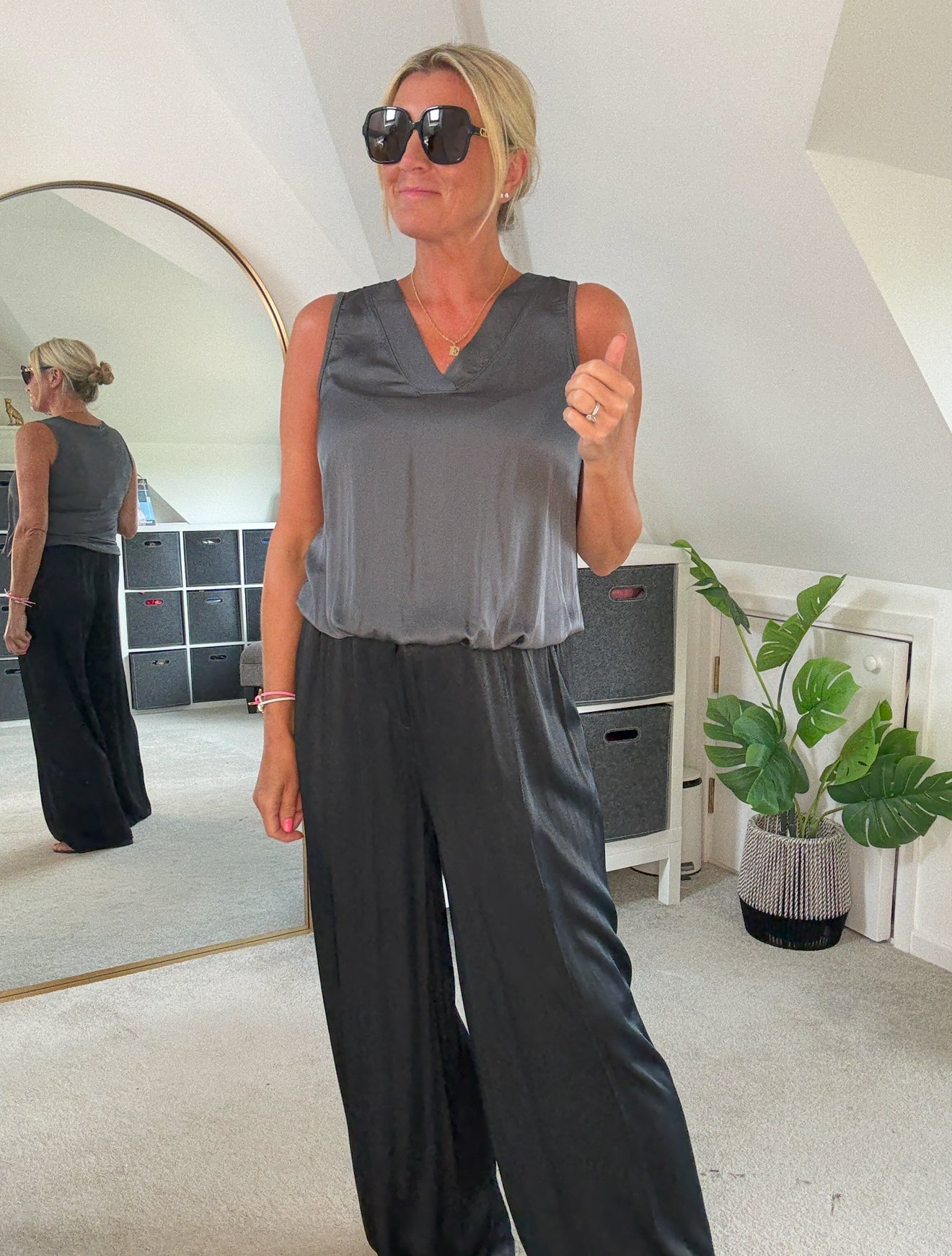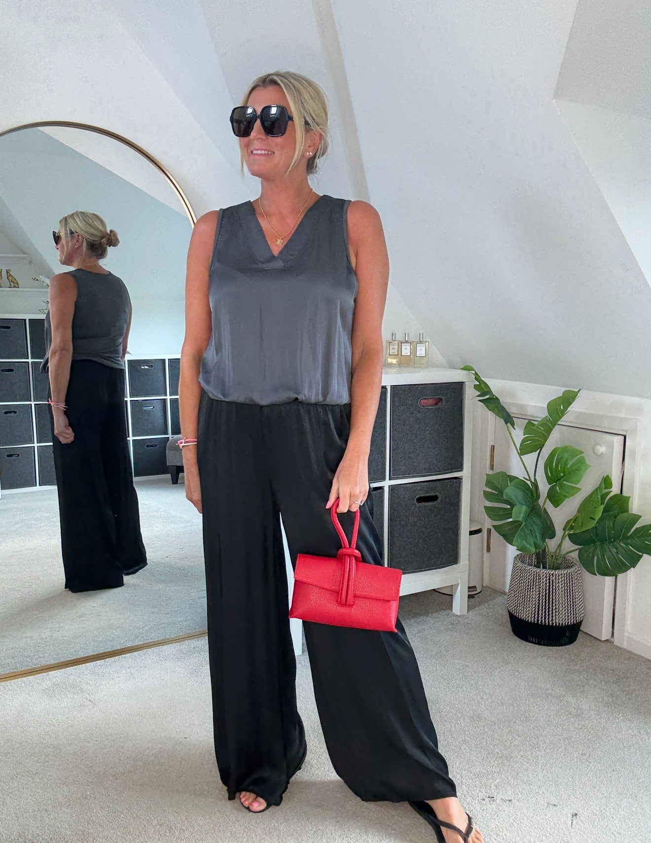 Beautiful silk mix v neck top with flattering bubble hem. A lovely silk mix fabric on the front and jersey on the back. Looks fab styled with the Emy satin wide leg trousers and matching silk mix bomber jacket or style with jeans for a jeans and a nice top look!