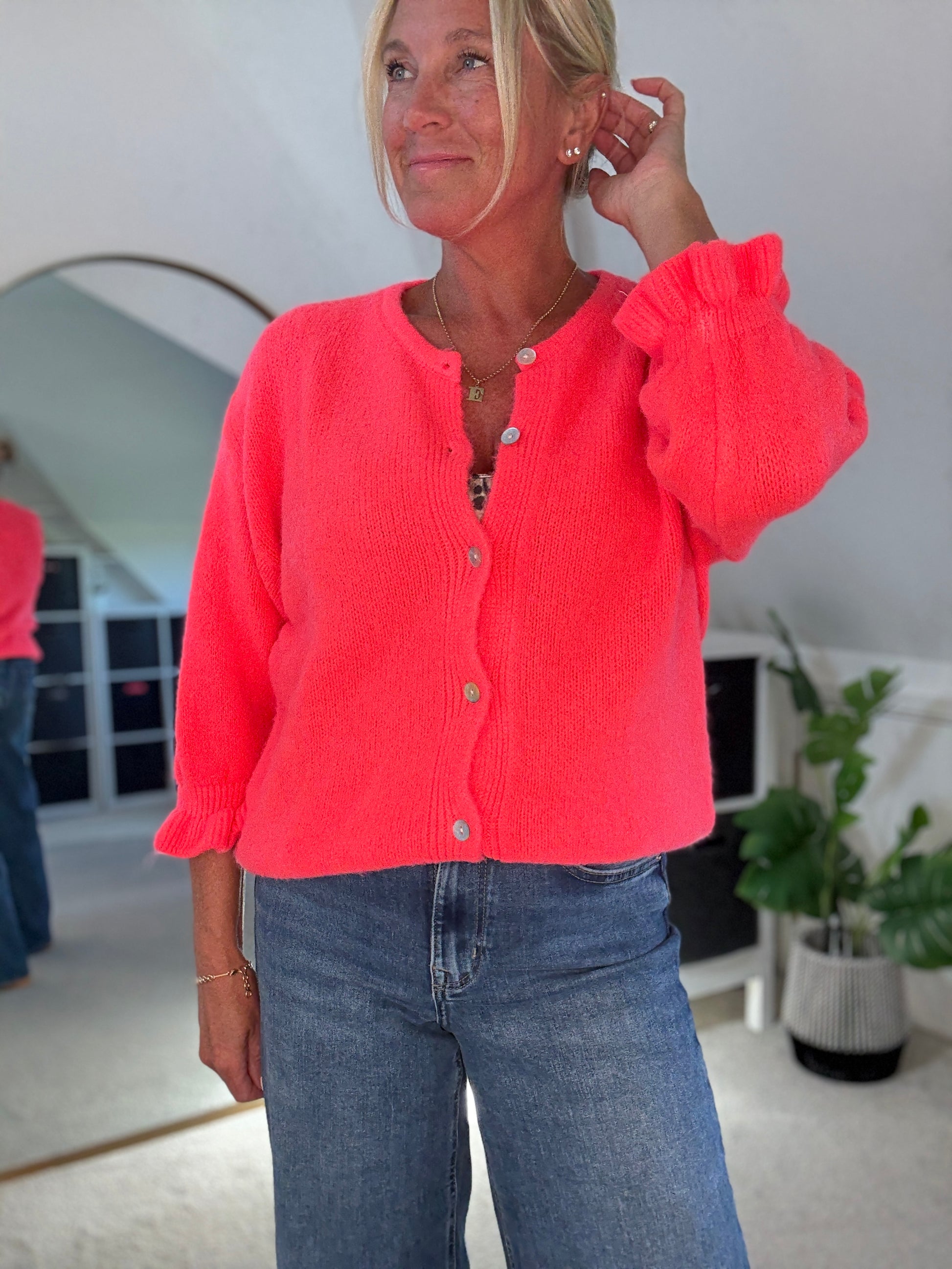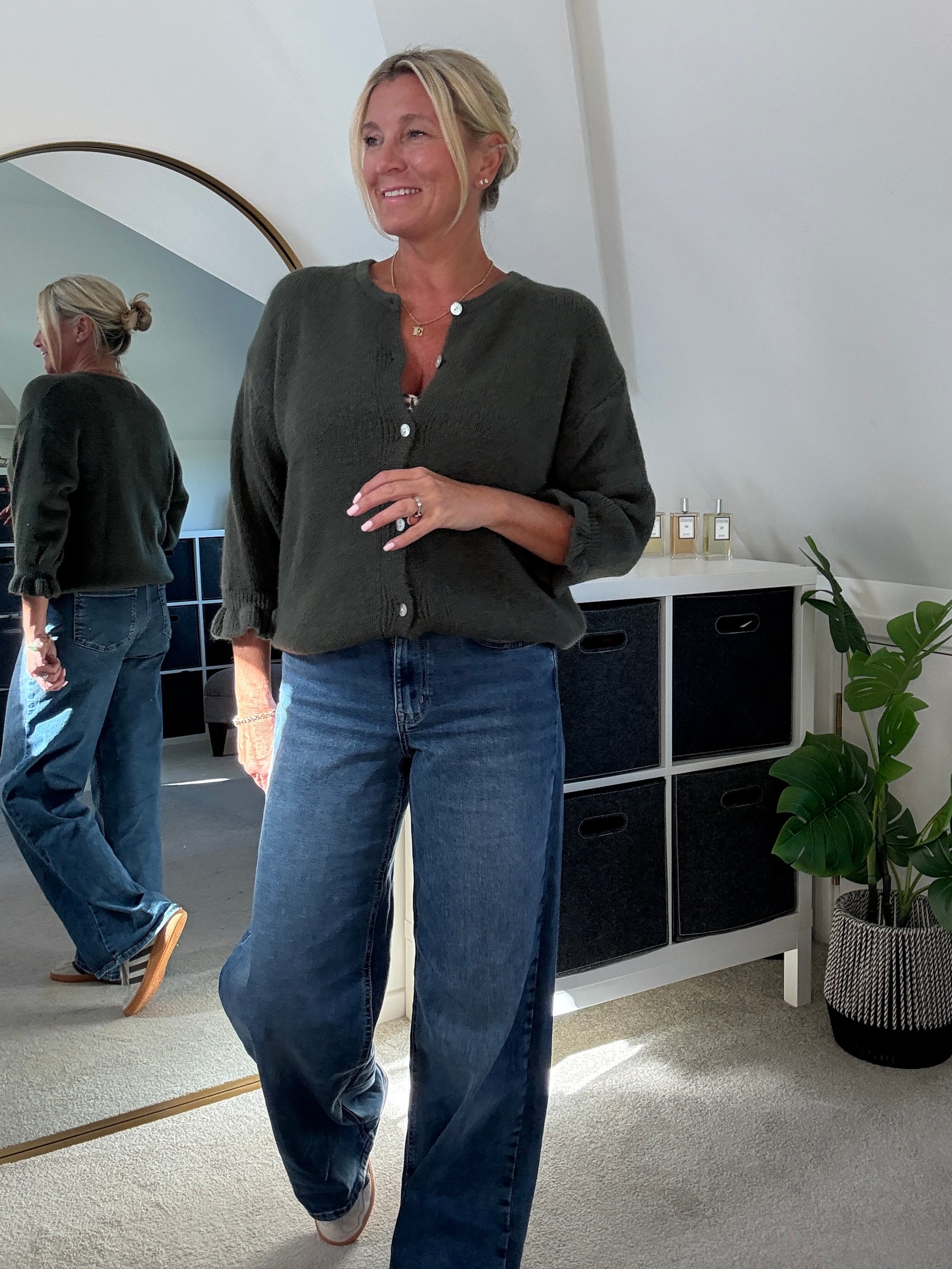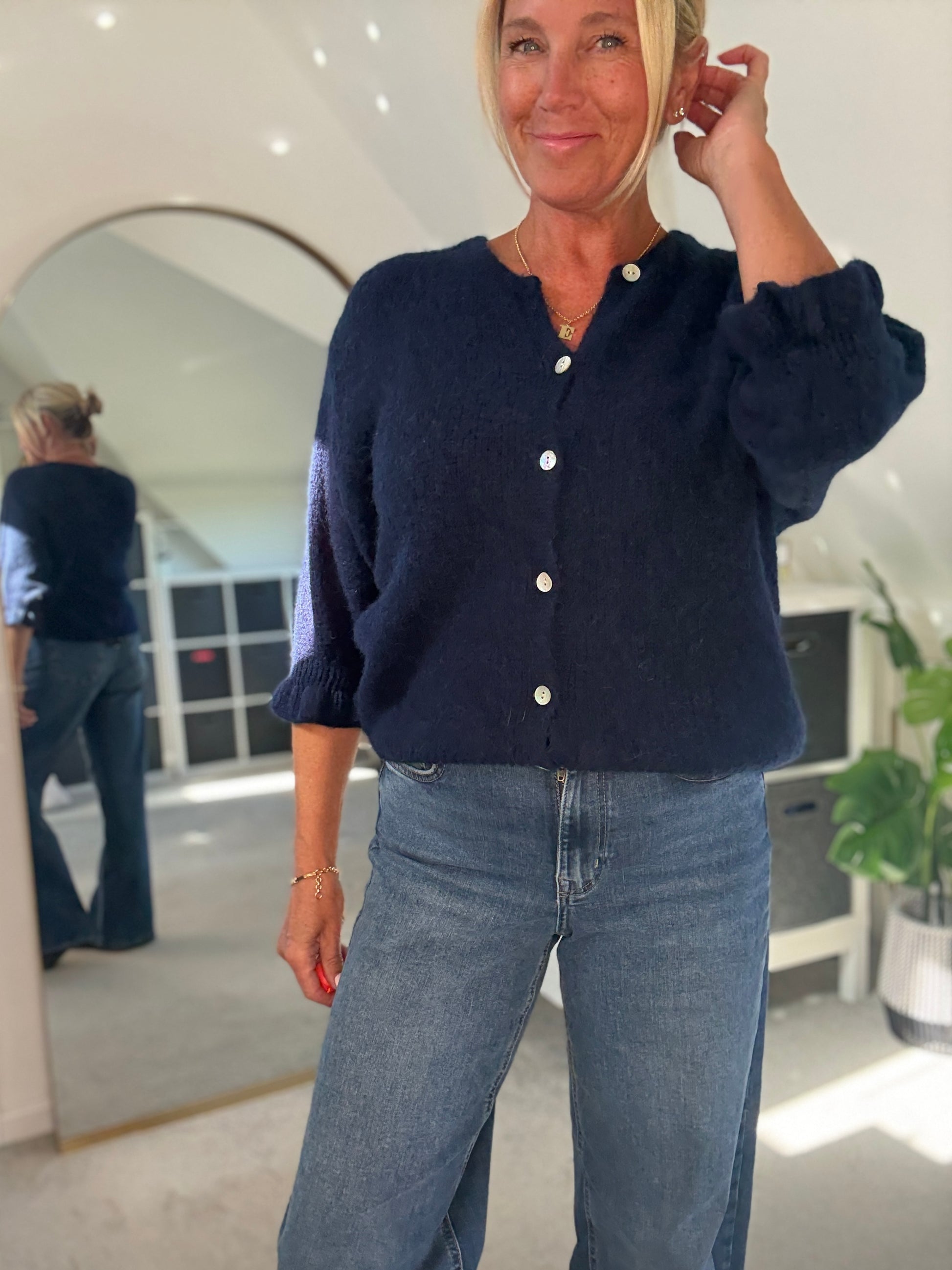 Super lovely alpaca mix fluffy frill sleeve cardigan. So cute with the frill sleeve detail on the sleeves. A nice one size fit and looks great style with the new barrel leg jeans. Such a gorgeous colour.