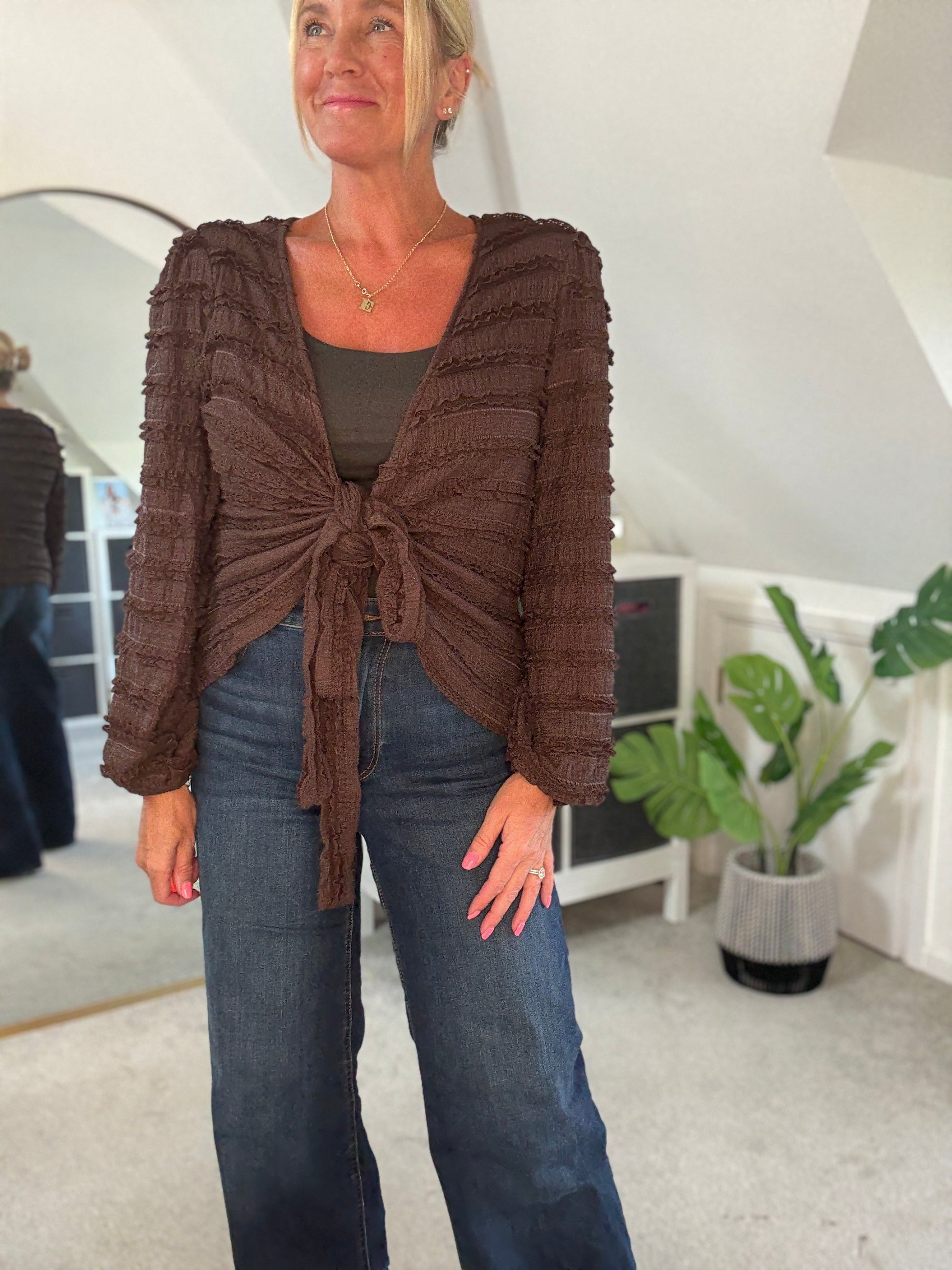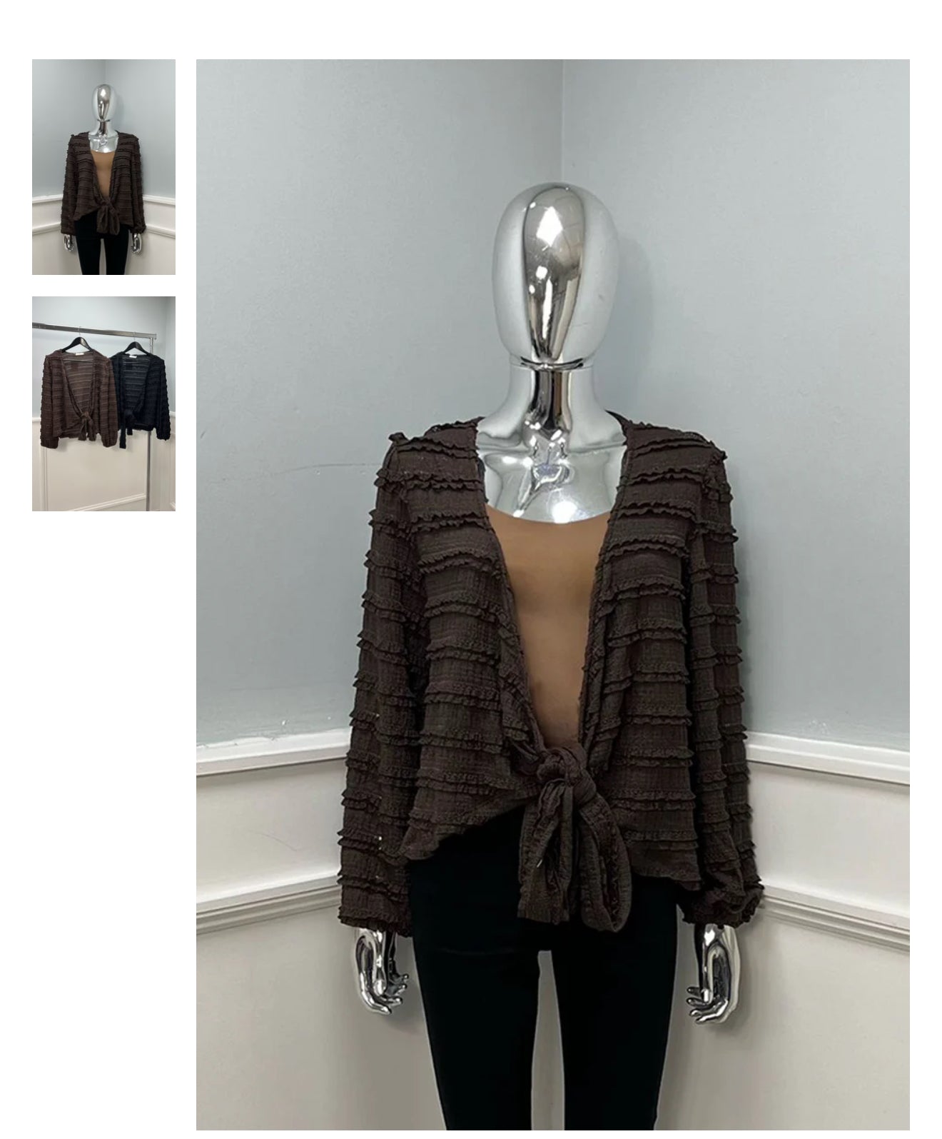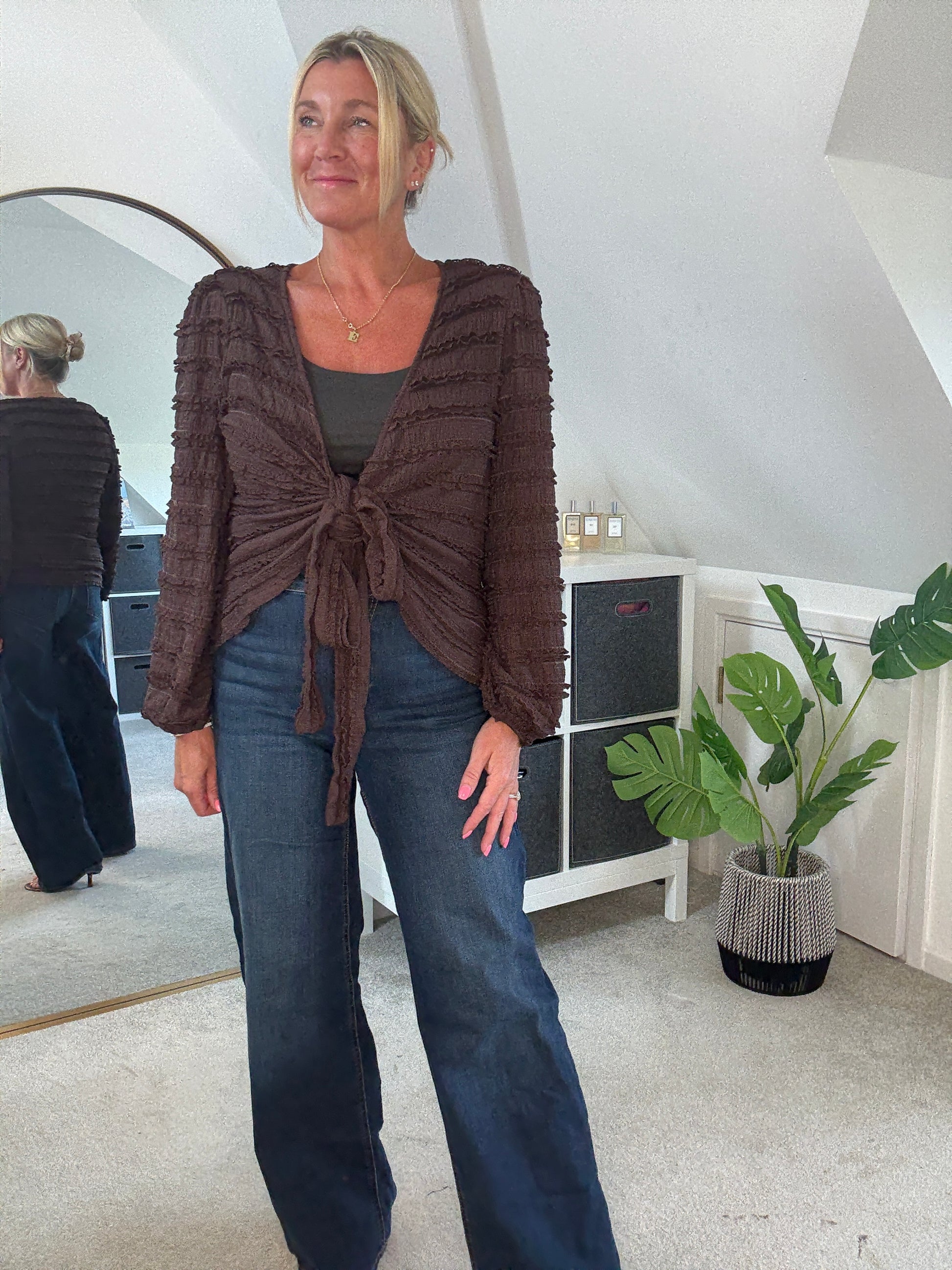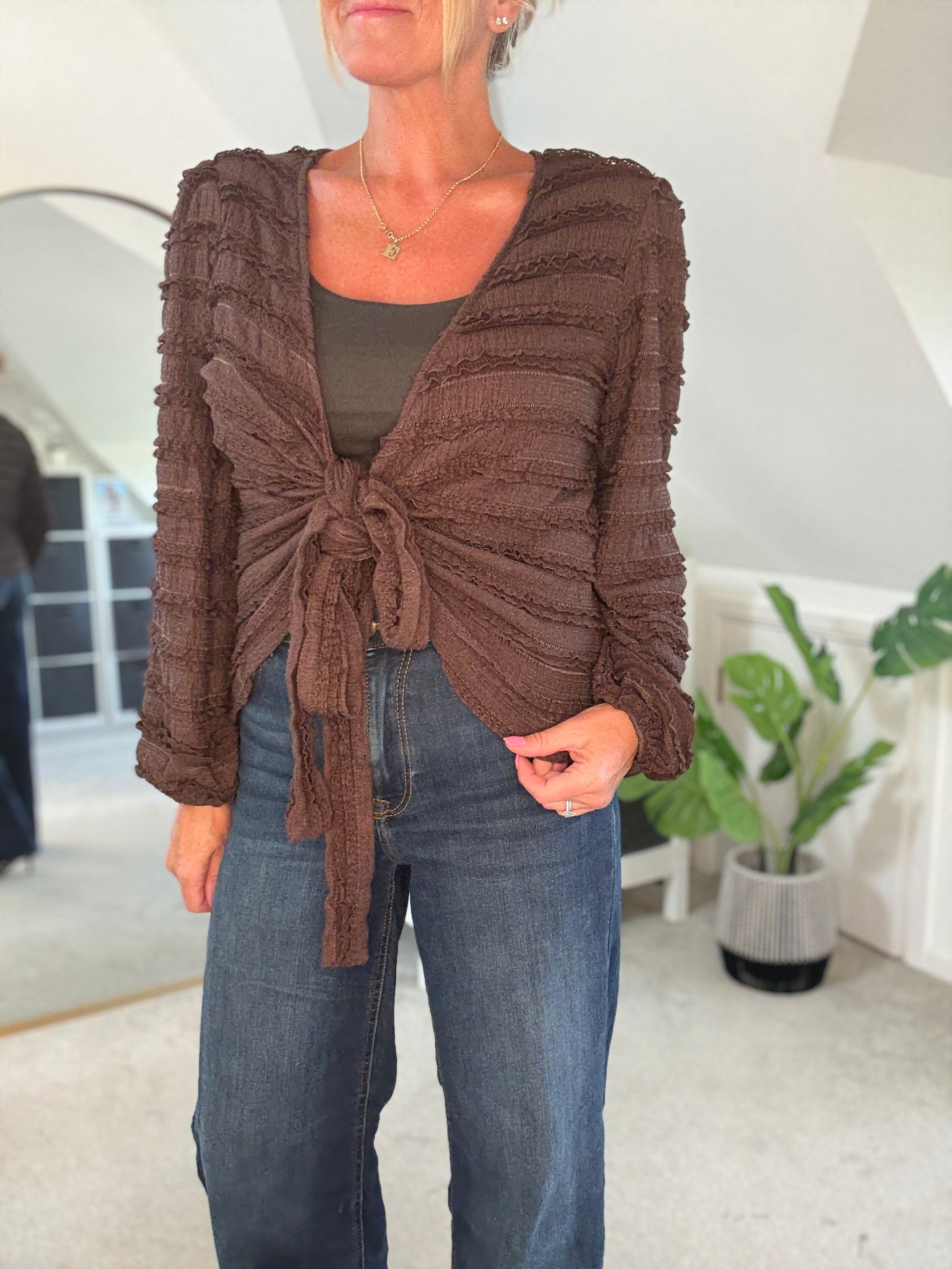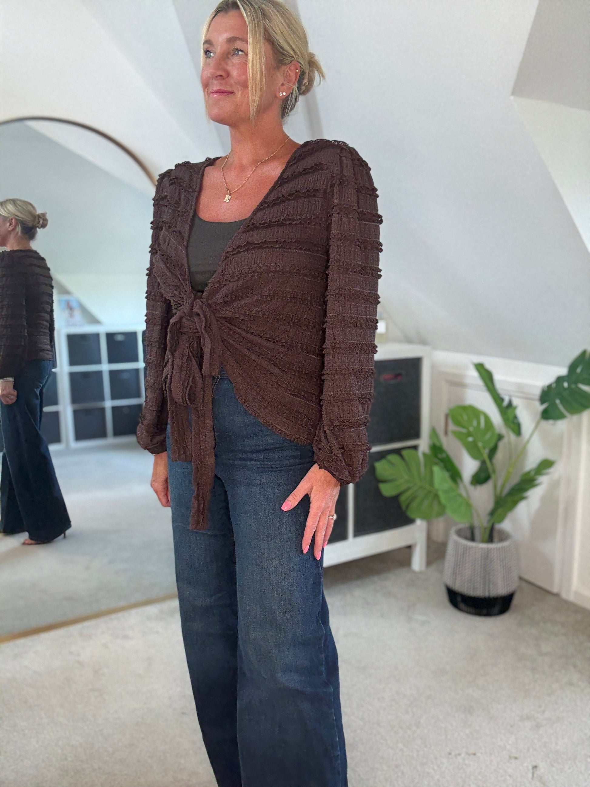 This so pretty! Long sleeve top with gorgeous all over ruffle detailing. Slight puff shoulders, balloon sleeves with elasticated cuffs and can be worn tied up at the front or lower with a cami underneath or threaded through the loop hole and wrapped around, tied to the side or back...lovely worn with jeans or trousers and heels for an evening out.