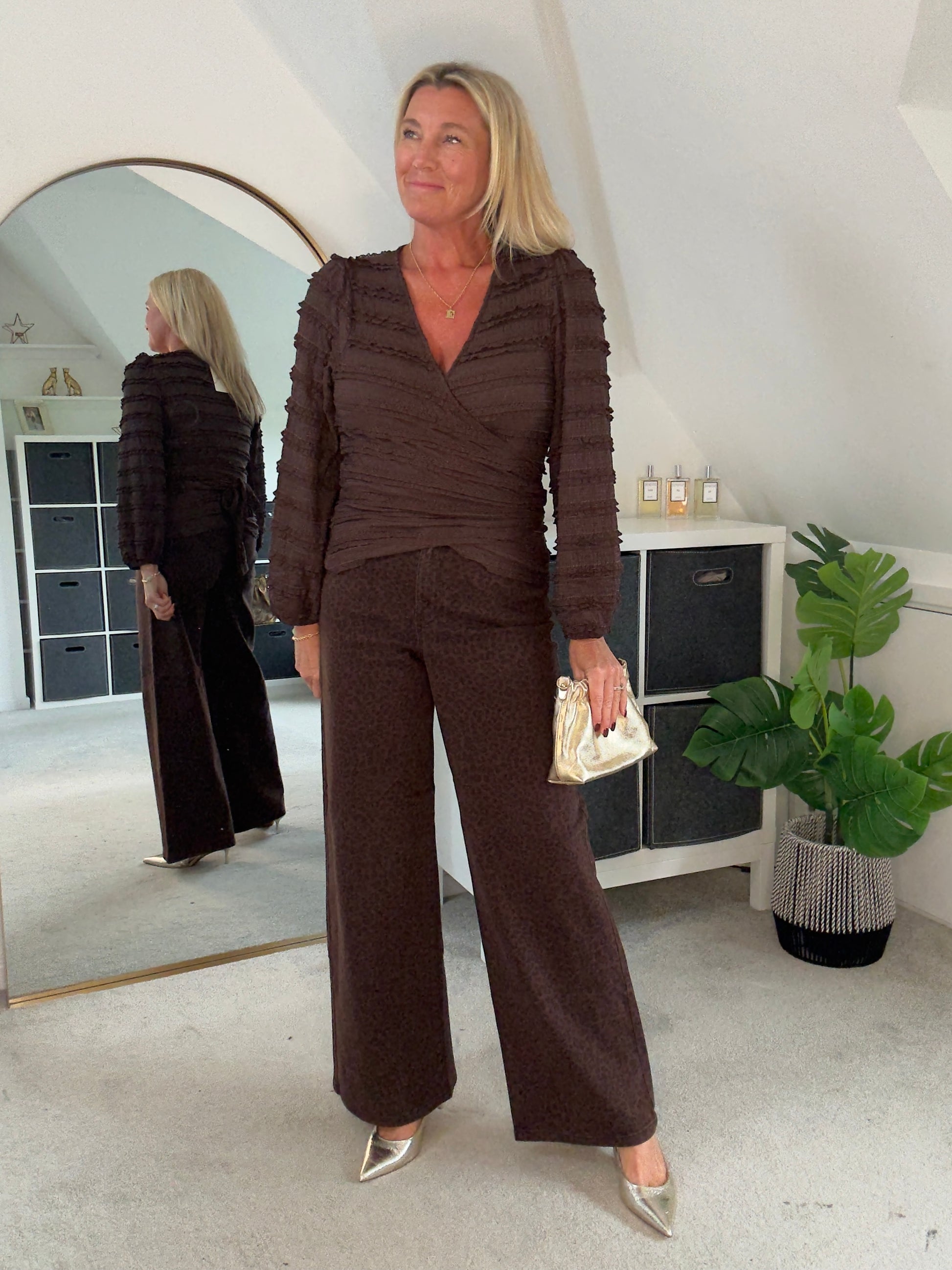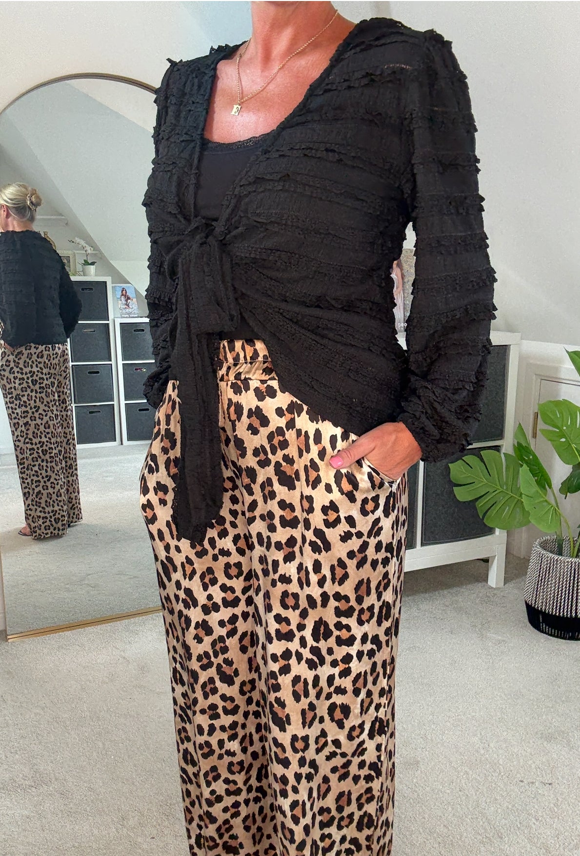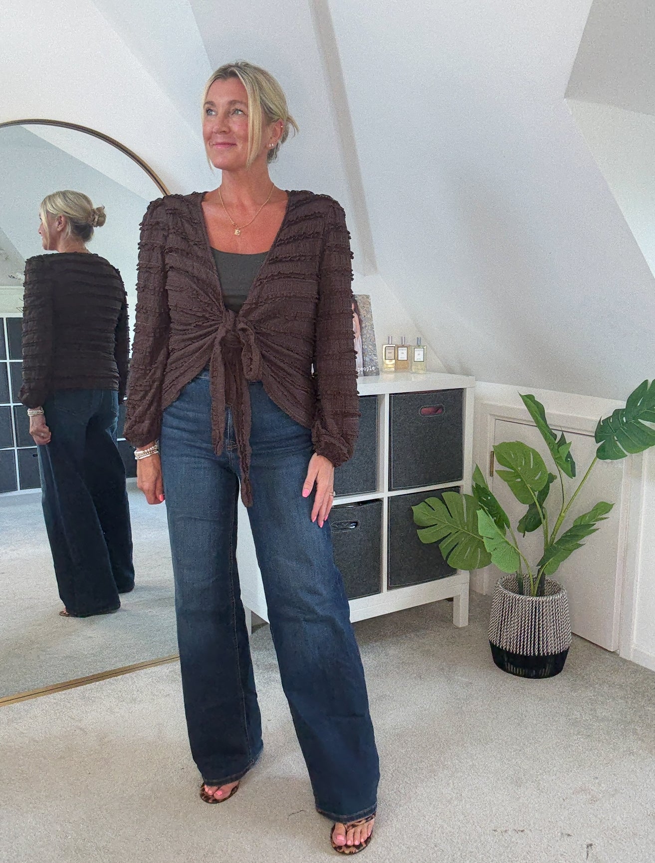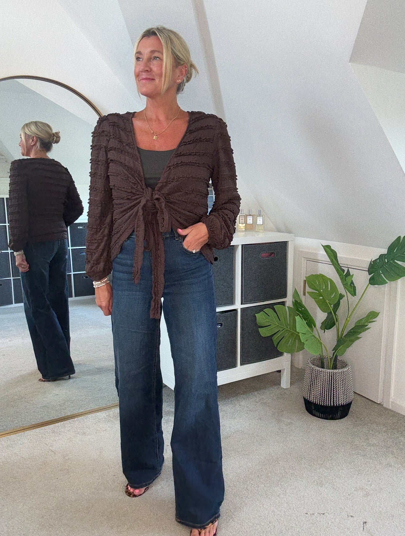 This so pretty! Long sleeve top with gorgeous all over ruffle detailing. Slight puff shoulders, balloon sleeves with elasticated cuffs and can be worn tied up at the front or lower with a cami underneath or threaded through the loop hole and wrapped around, tied to the side or back...lovely worn with jeans or trousers and heels for an evening out.