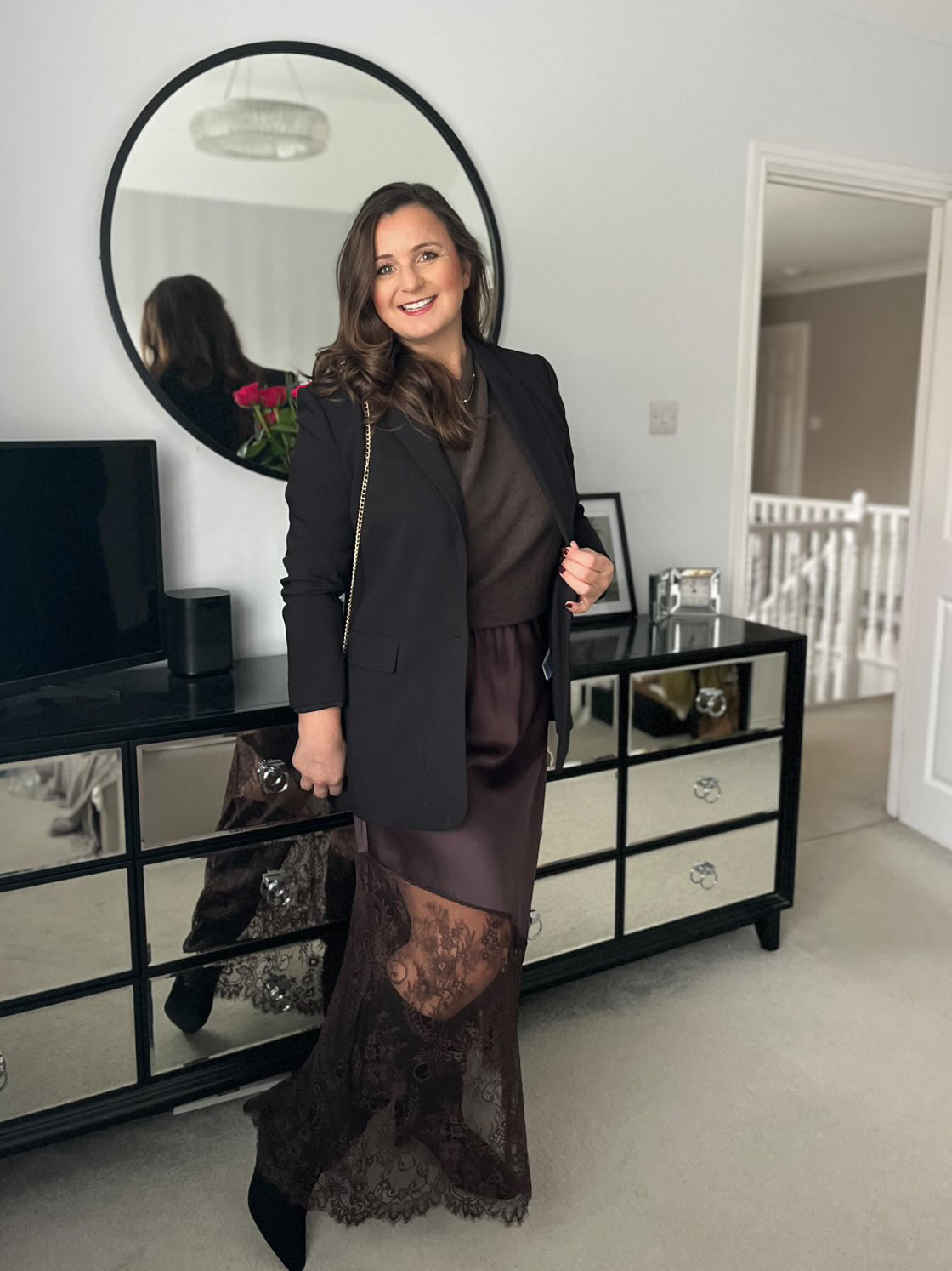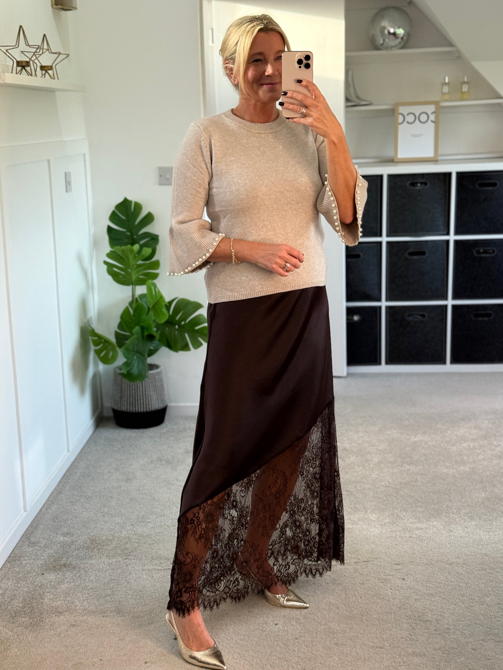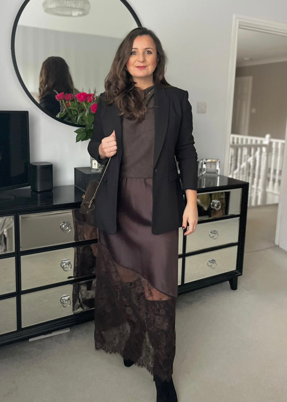 Chocolate Satin Asymmetric Lace Detail Maxi Slip Skirt