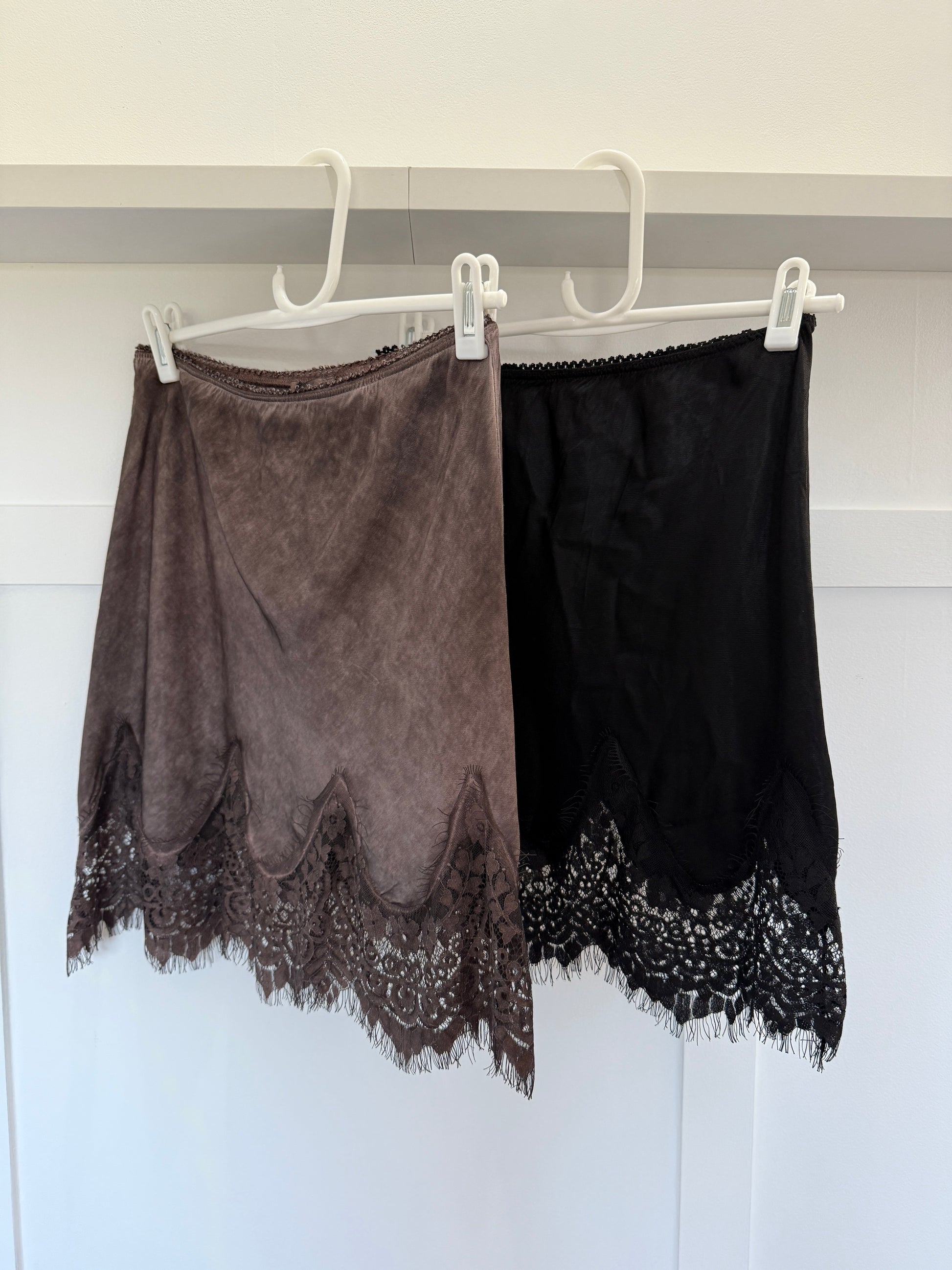 Beautifully feminine viscose mini skirt finished with a delicate lace–trimmed hem. Soft, lightweight, and very flattering, and drapes beautifully.