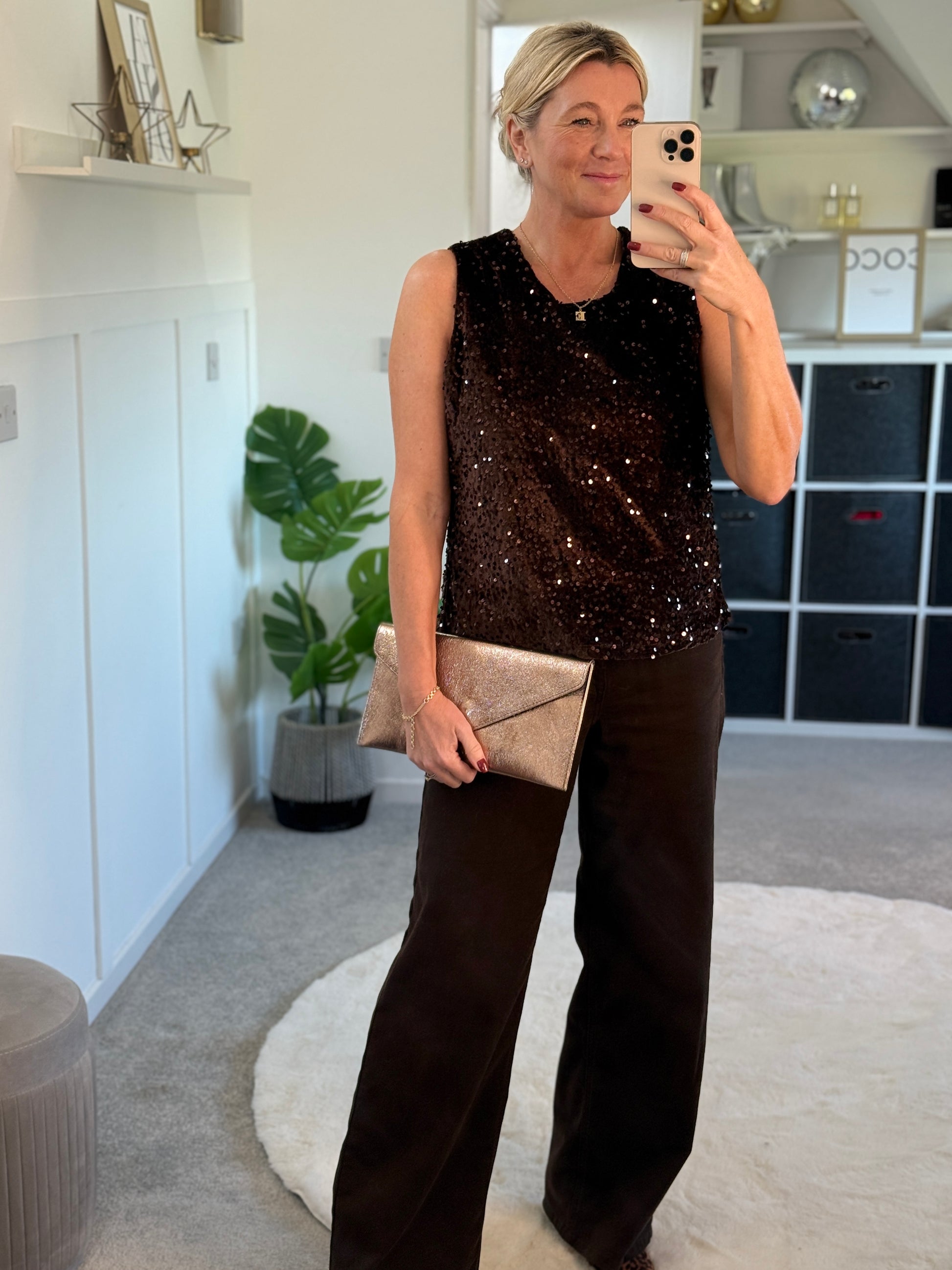 Beautiful sparkly sequin/velvet sleeveless top. Fully lined with a soft jersey material and a nice one size fit, not too fitted. Team with with skinnies, heels and a blazer for an evening out or dress down with jeans.