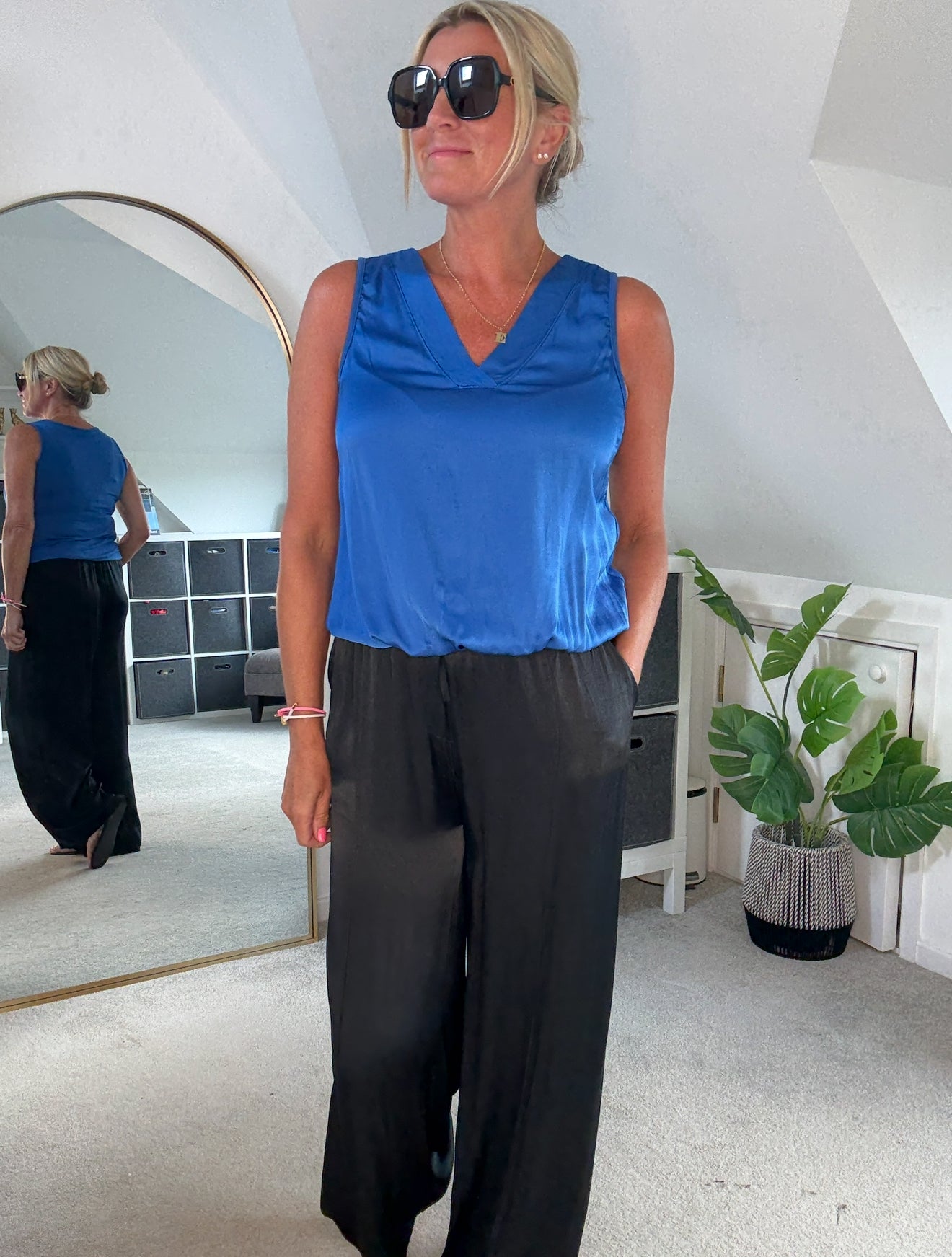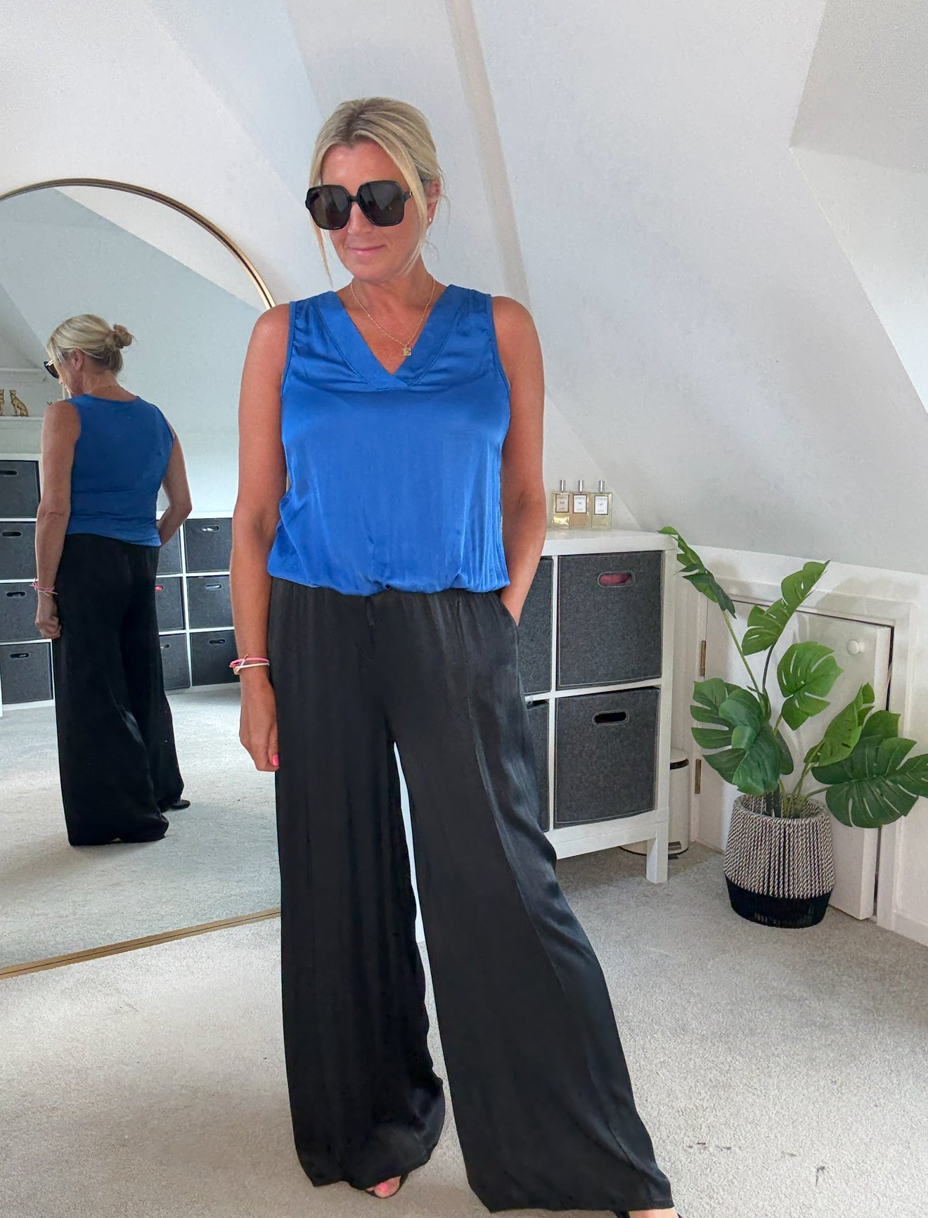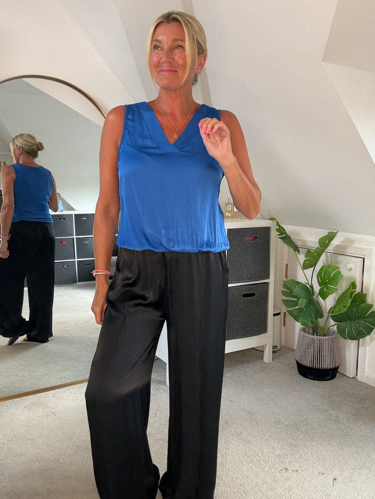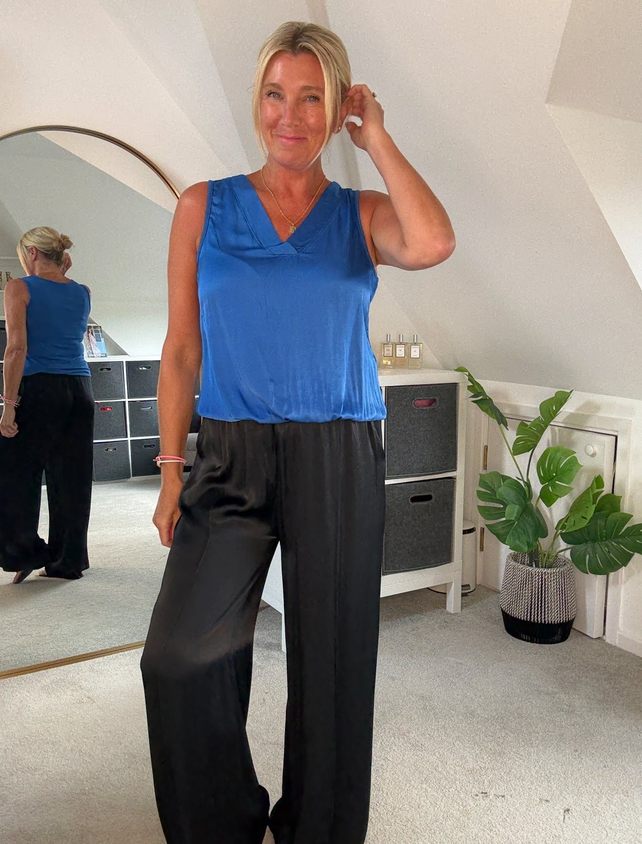 Beautiful silk mix v neck top with flattering bubble hem. A lovely silk mix fabric on the front and jersey on the back. Looks fab styled with the Emy satin wide leg trousers or style with jeans for a jeans and a nice top look!