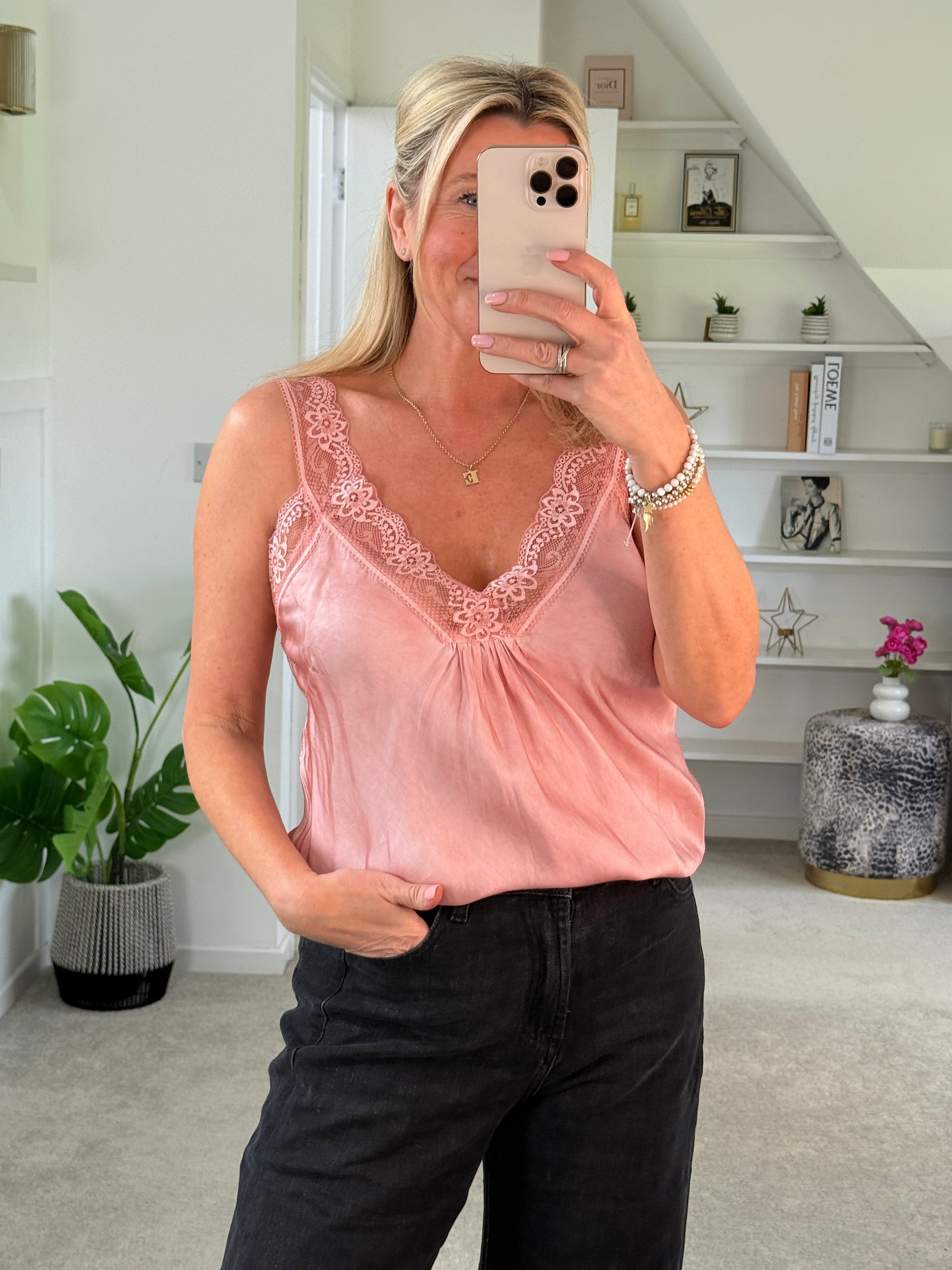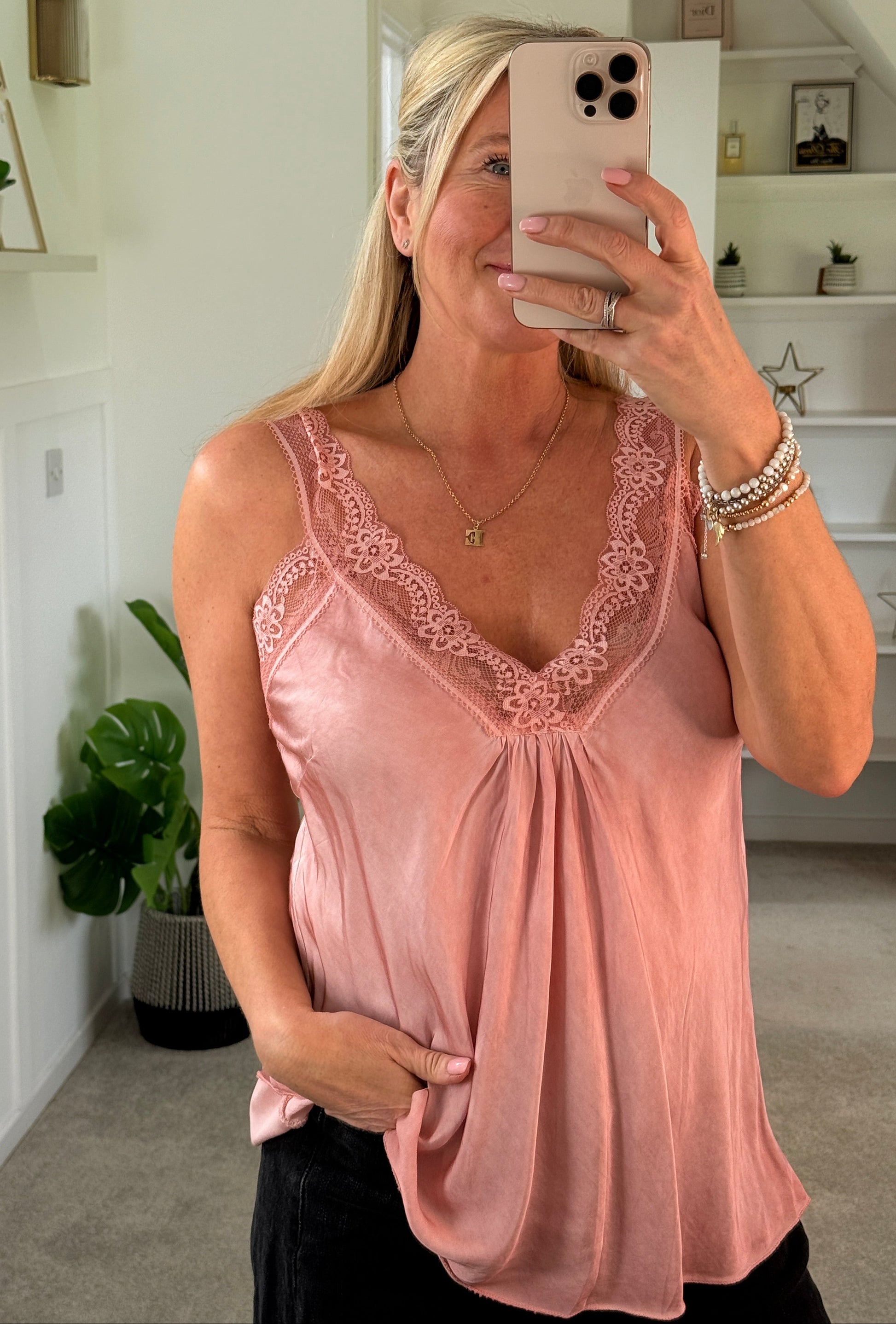 A beautifully soft, satin-feel lace top with a gently gathered V-neck and an elegant, easy drape. The subtle flare creates a flattering shape that skims the tummy beautifully.
