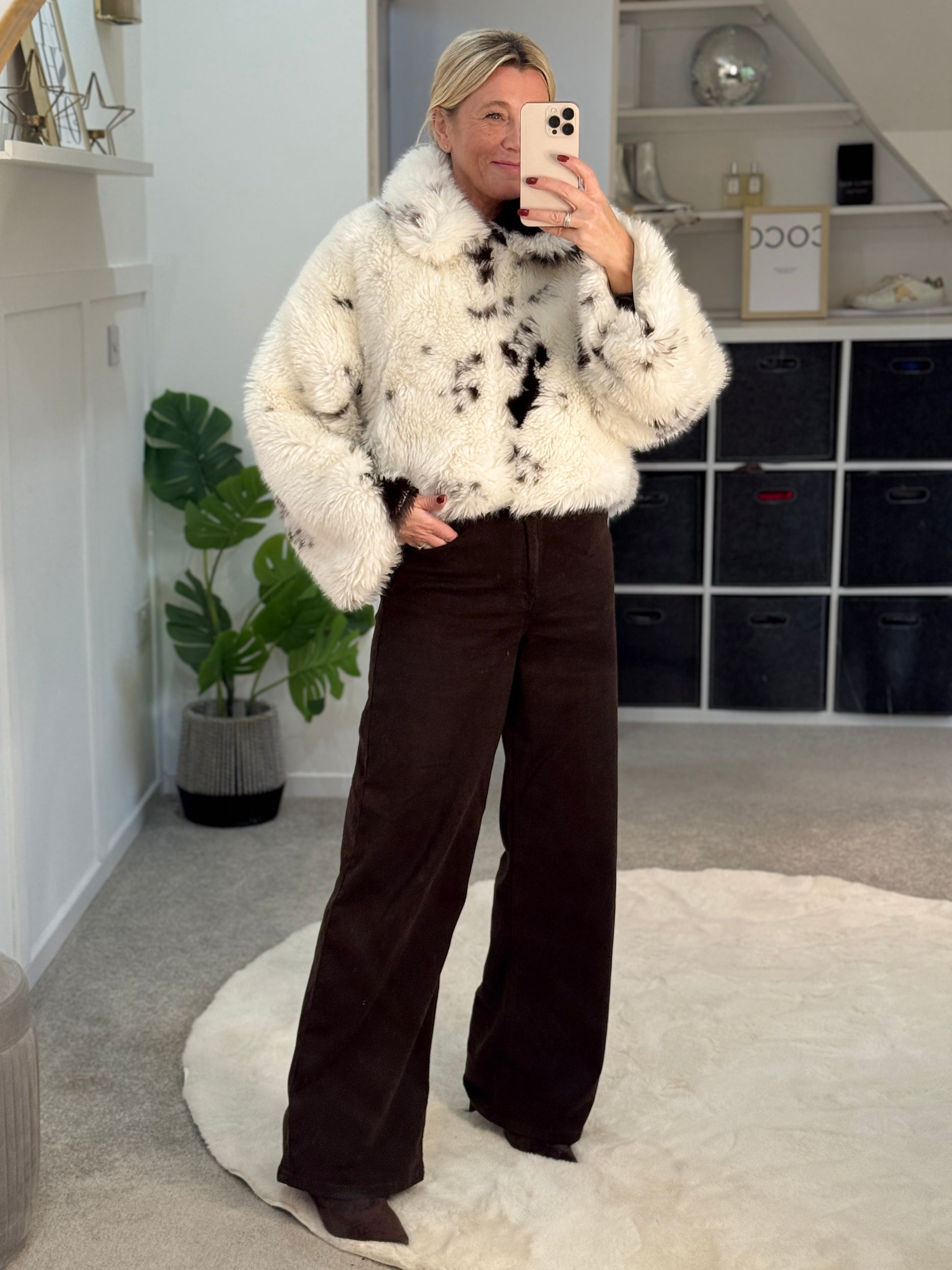 Make a bold, cosy statement with this stunning Cow Print Faux Fur Cropped Jacket.