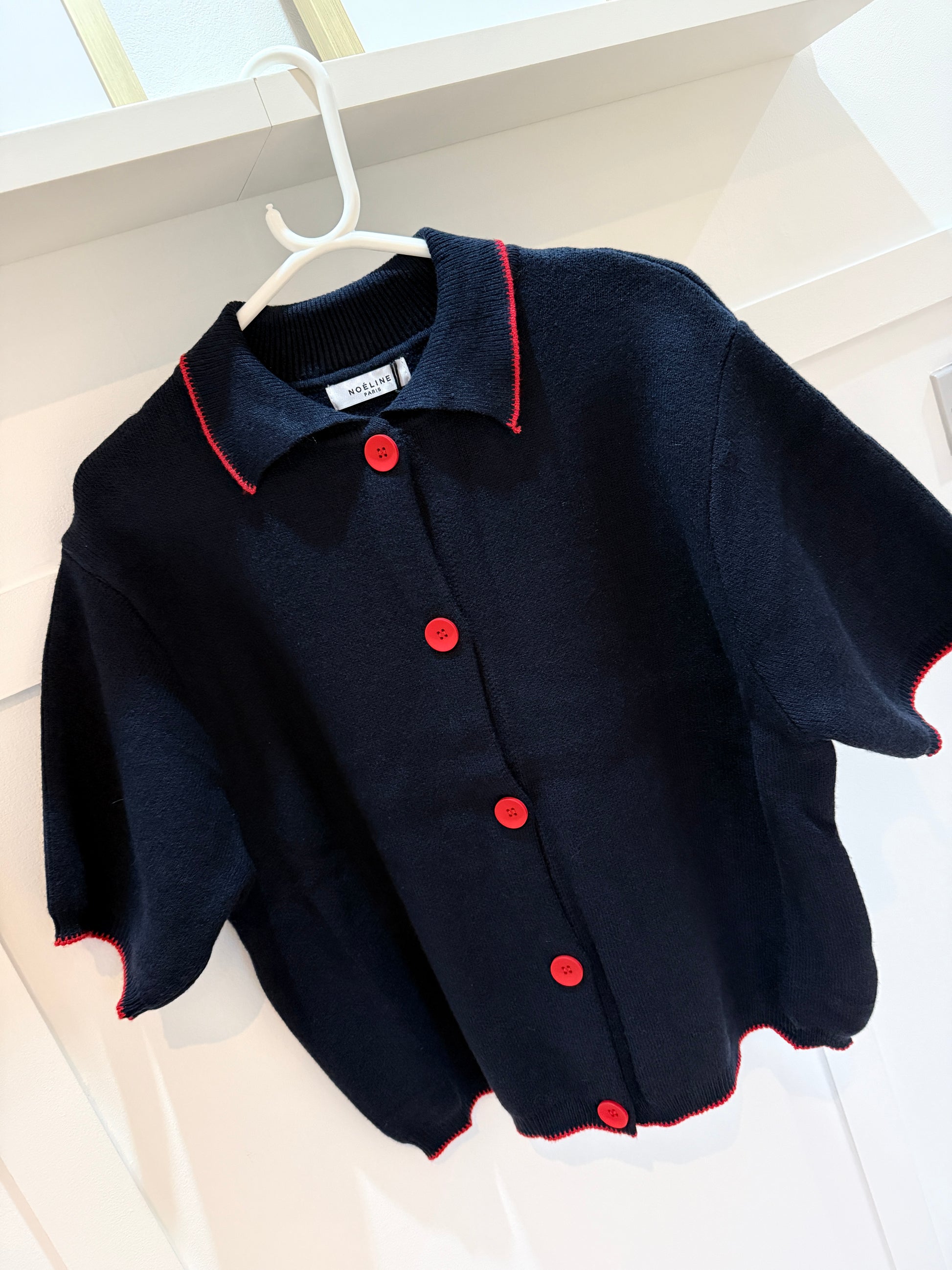 A relaxed short sleeve cardigan featuring a neat polo collar, smooth super soft knit and contrast buttons. Detailed with contrasting whip‑stitch trims.
