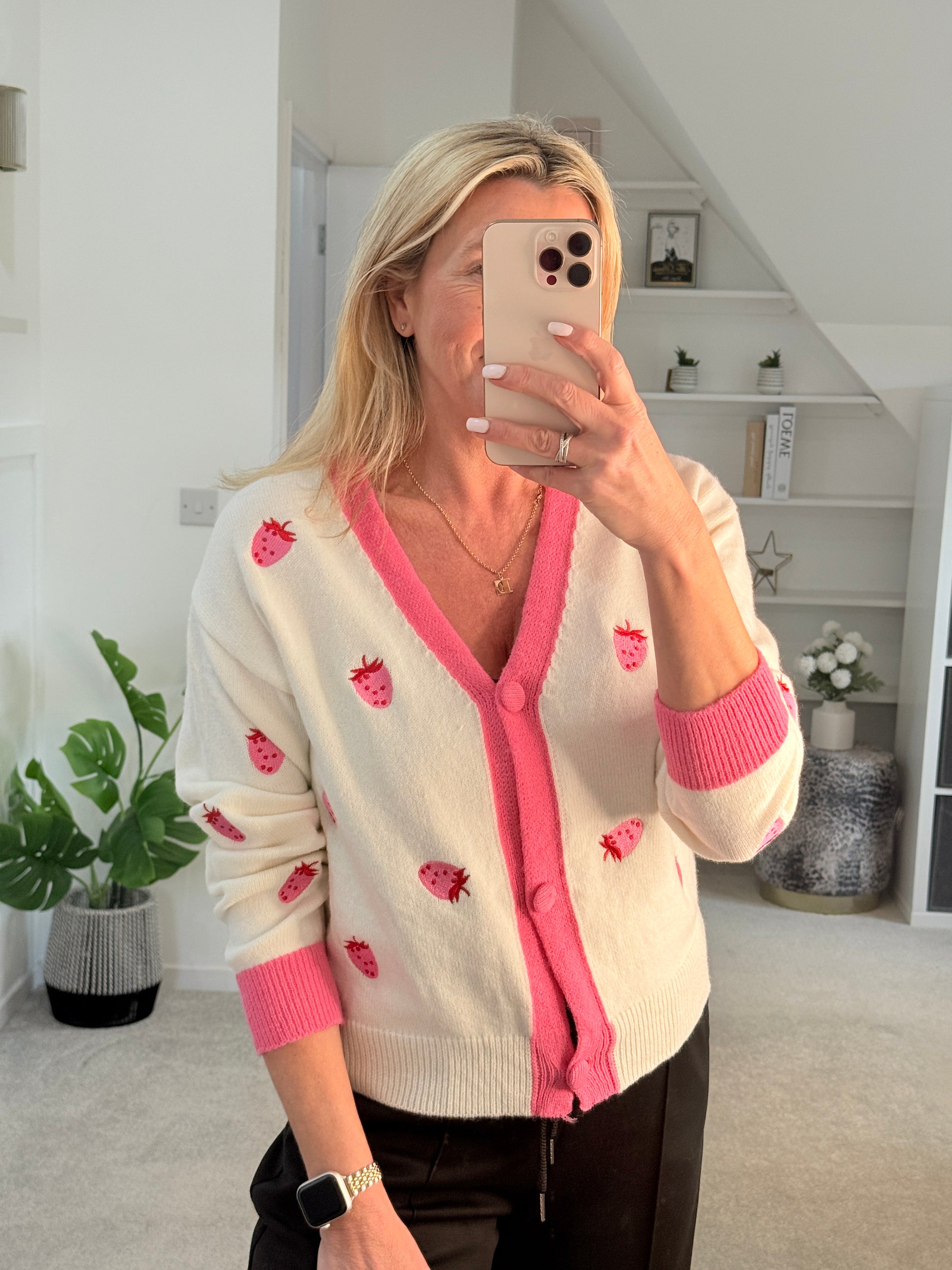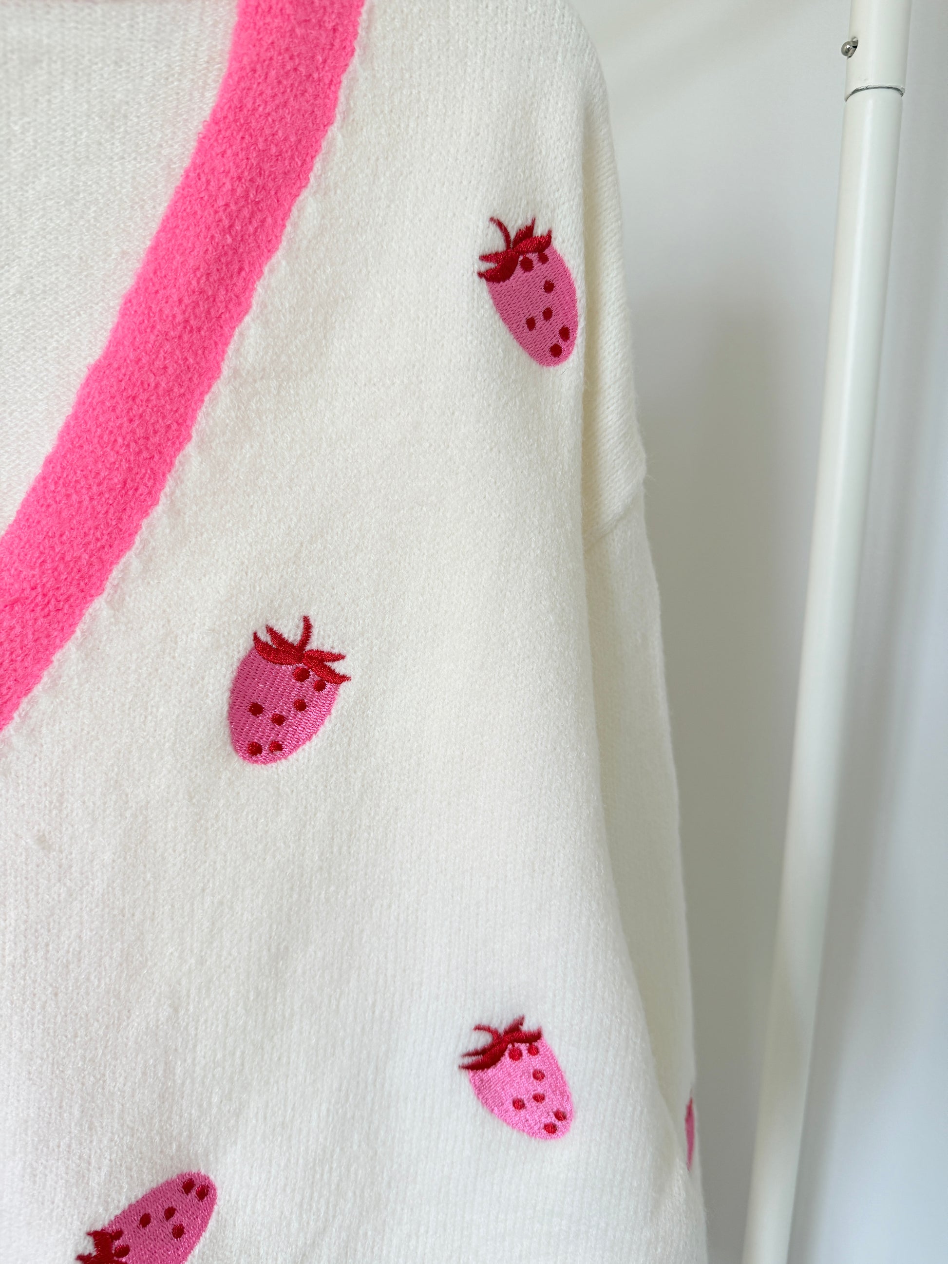 Adorable cream cardigan with embroidered Strawberry detailing on the front. With gorgeous contrasting pink cuffs, neckline and buttons. A fun, super cute cardigan to brighten up our outfit.