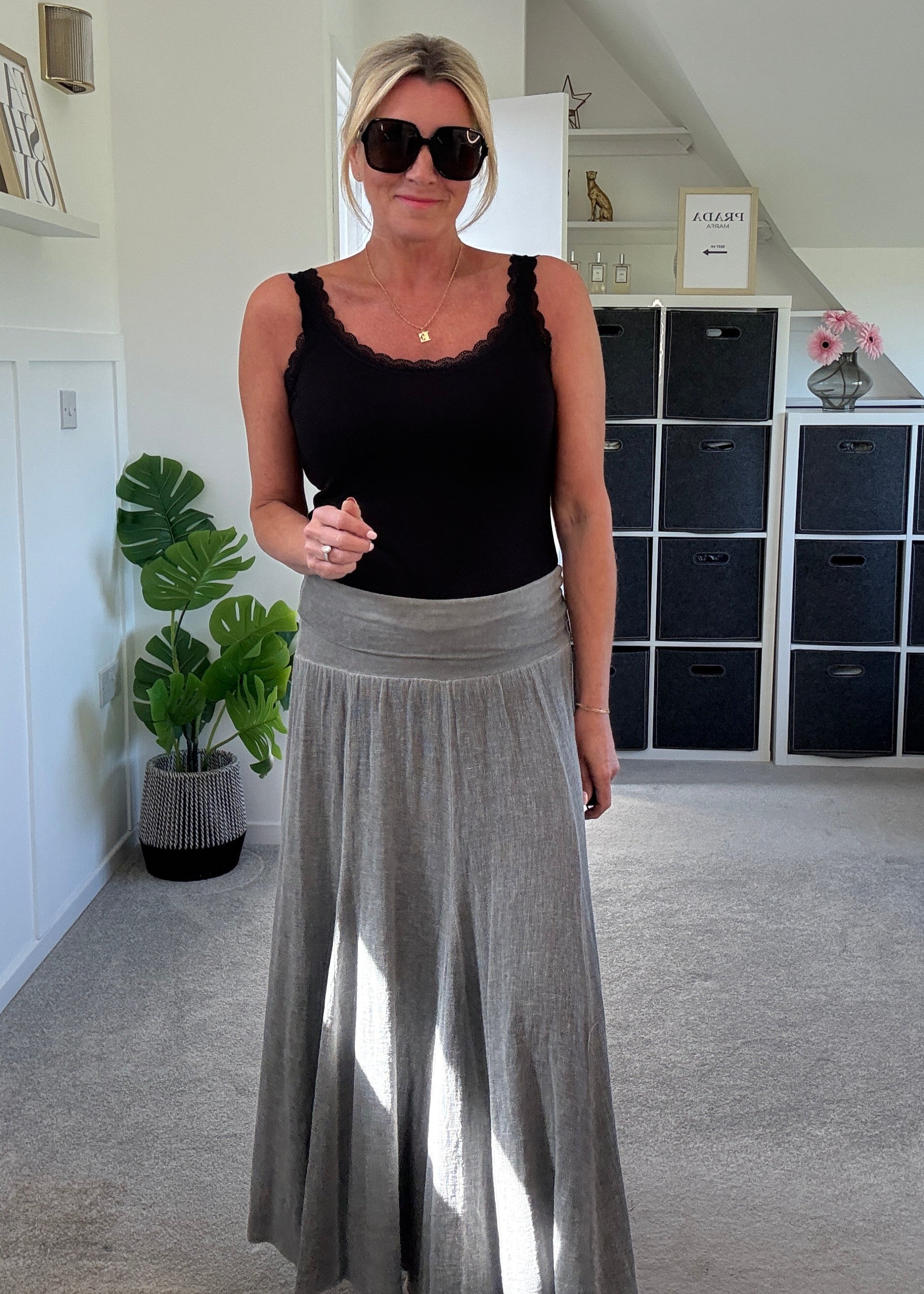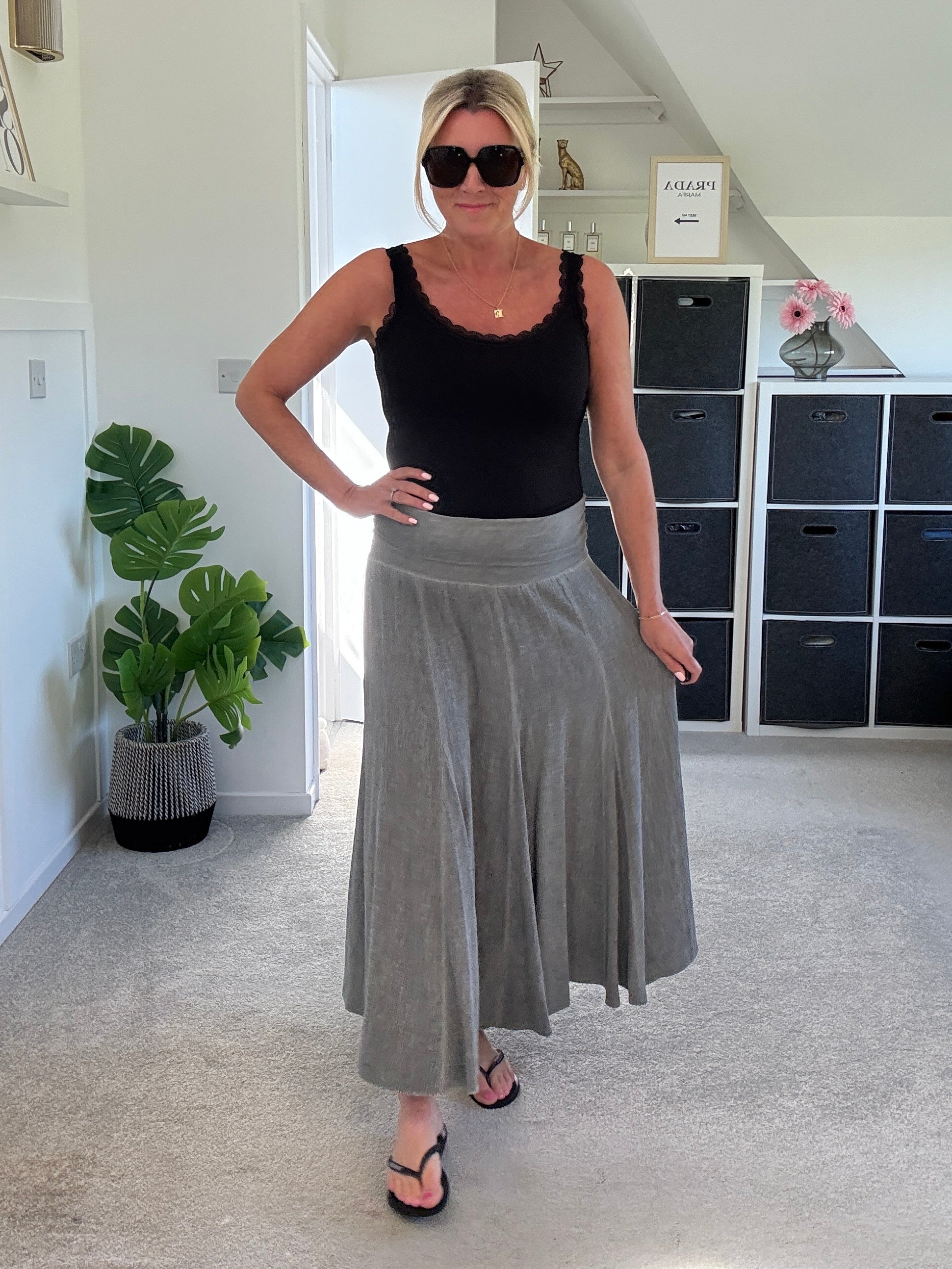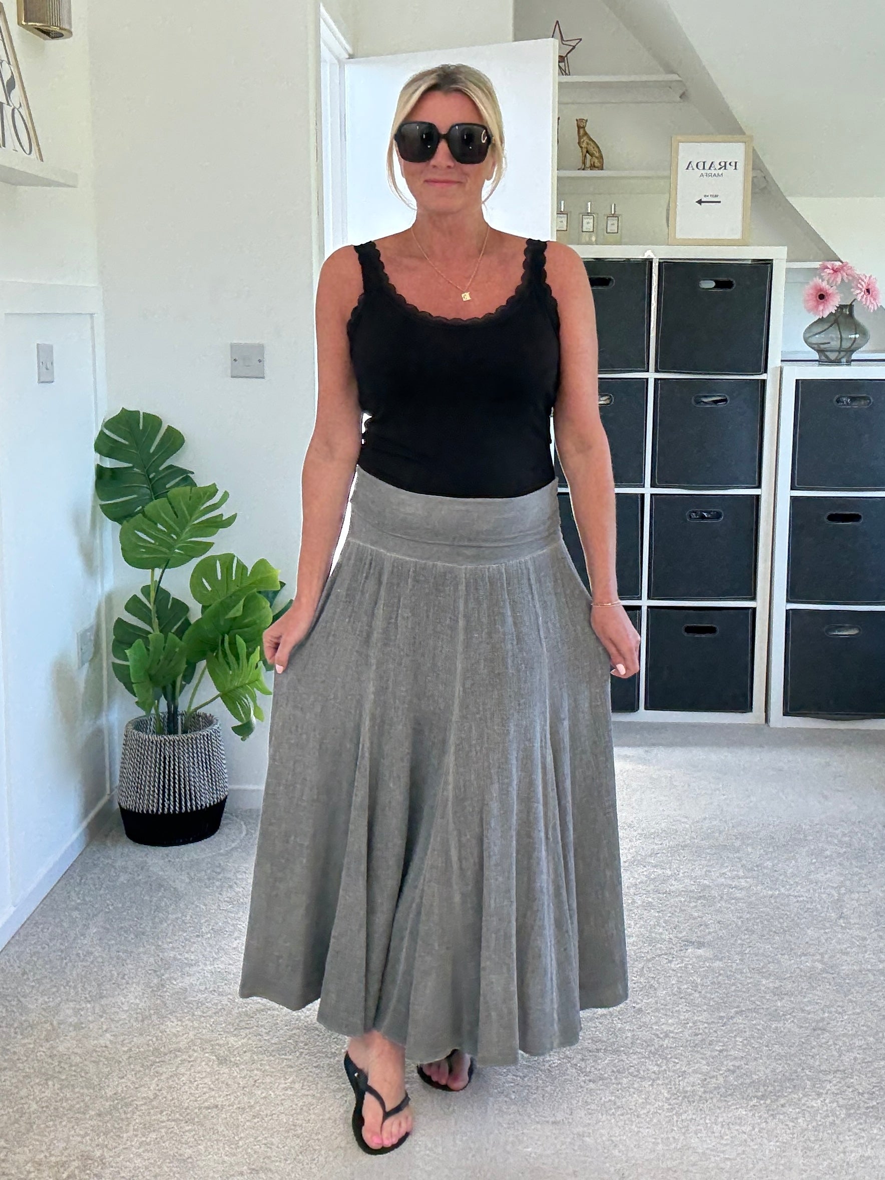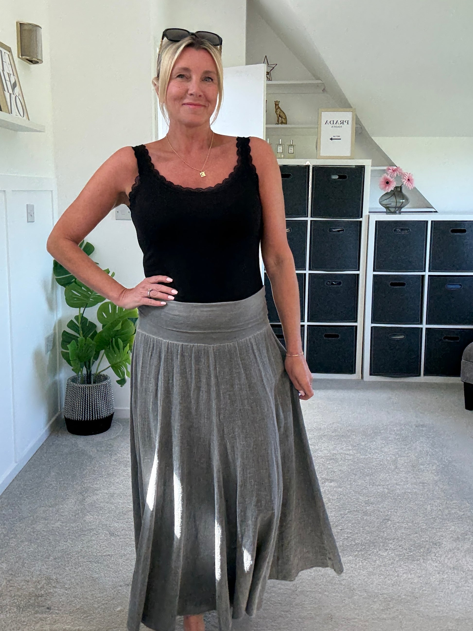 Gorgeous washed linen panelled waist skirt that can also be worn as a dress! Made from soft, breathable linen/cotton mix fabric with a relaxed washed finish, this skirt combines a laid-back Boho feel with flattering silhouette.