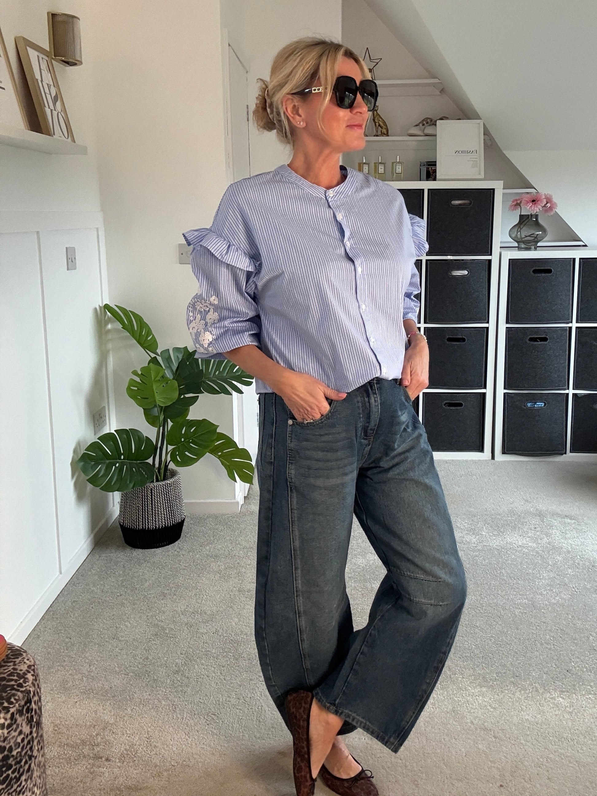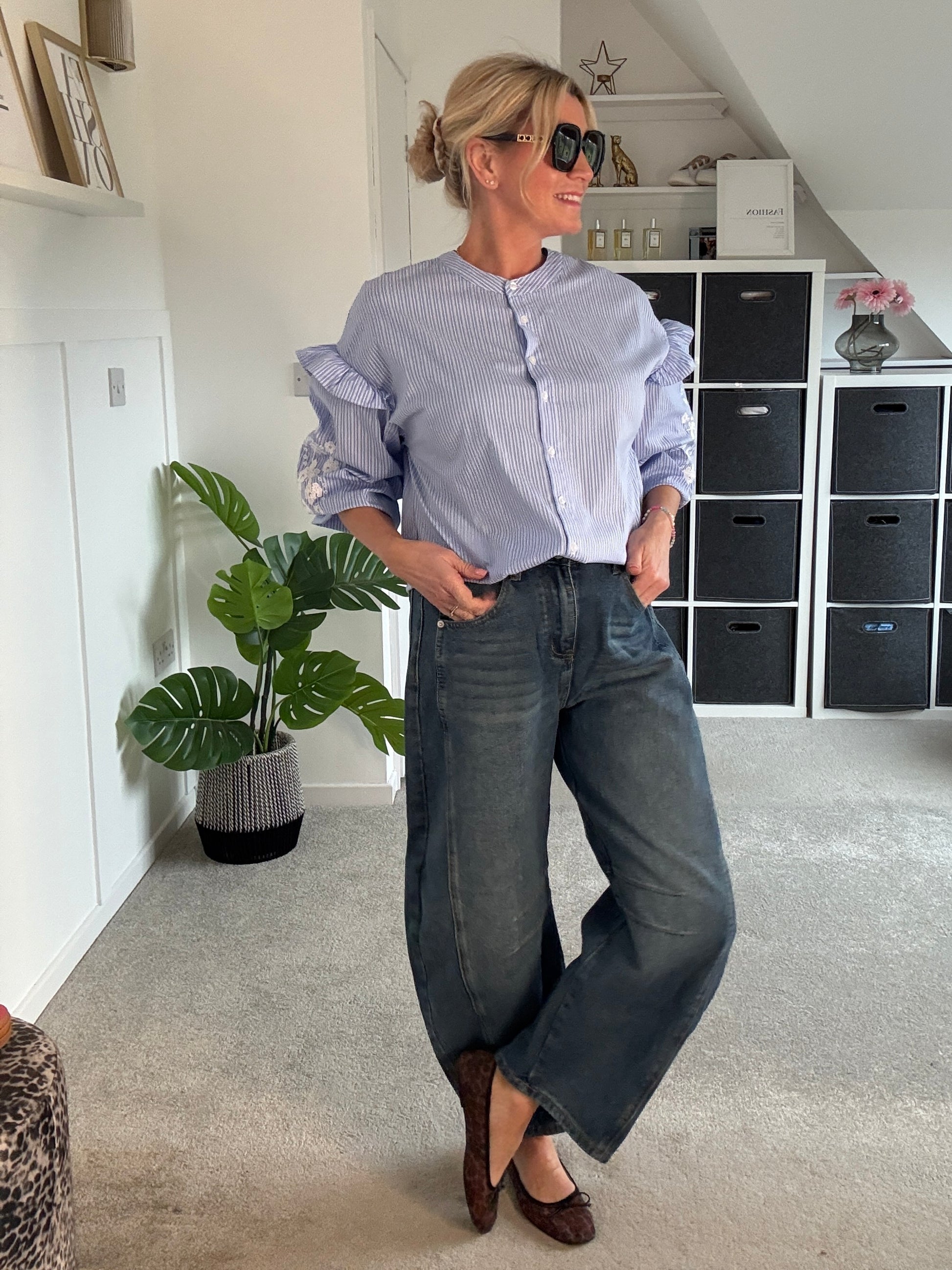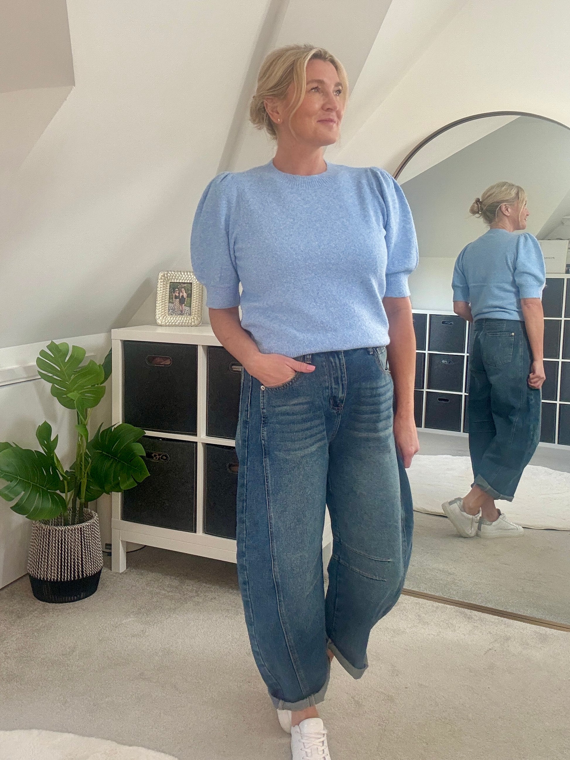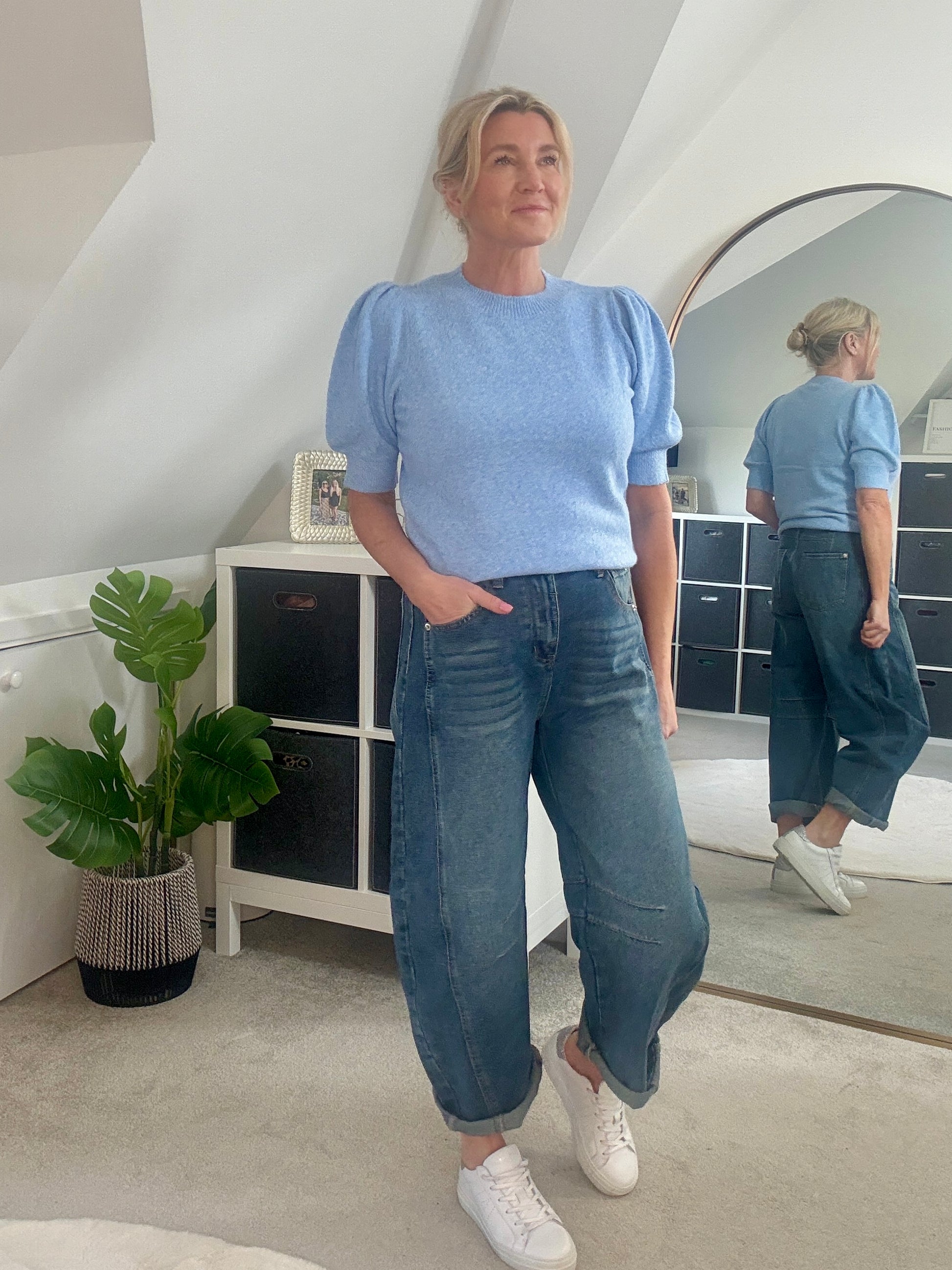 Super cool and trendy and extremely flattering barrel leg jeans. These mid rise slouchy